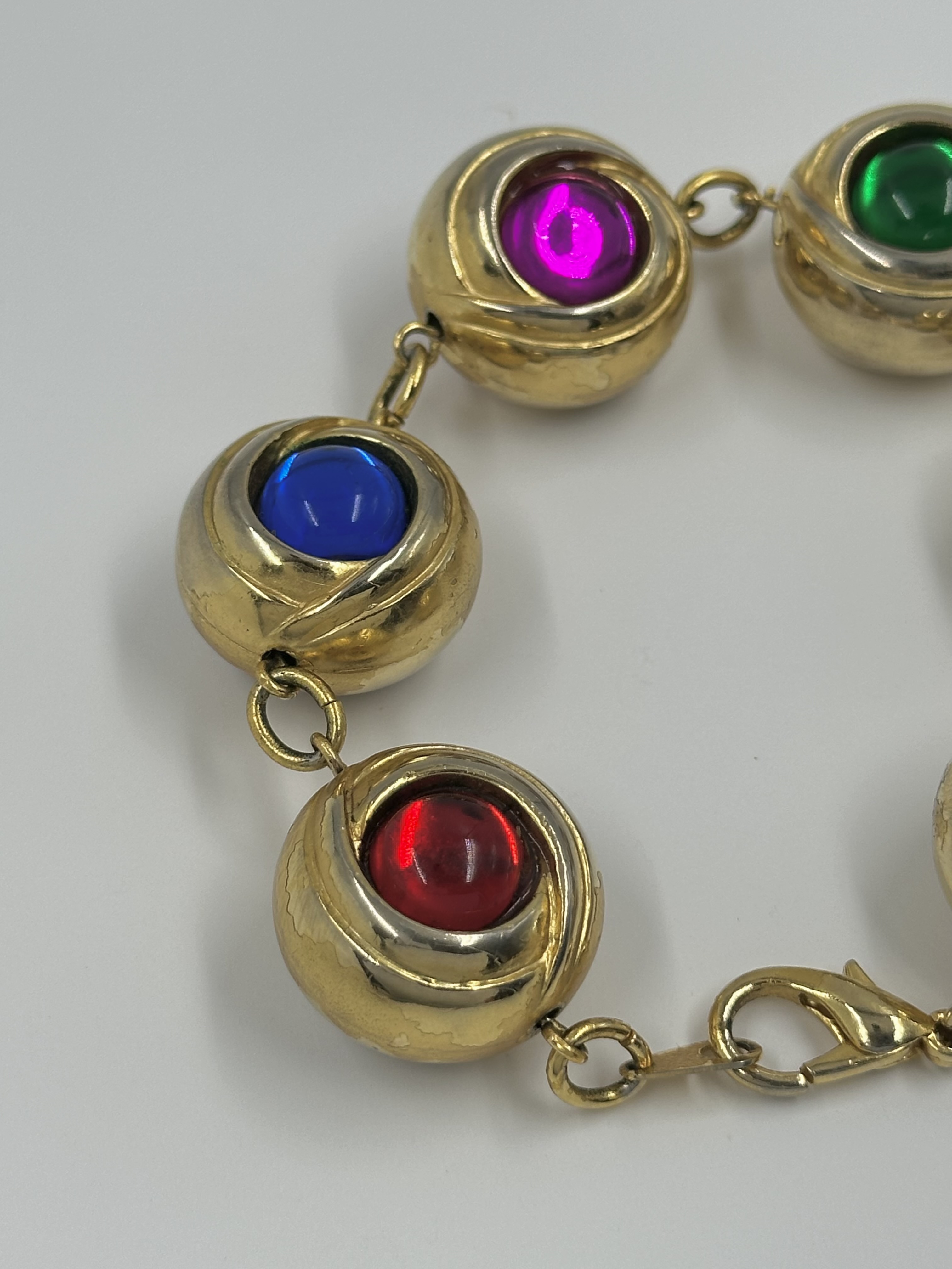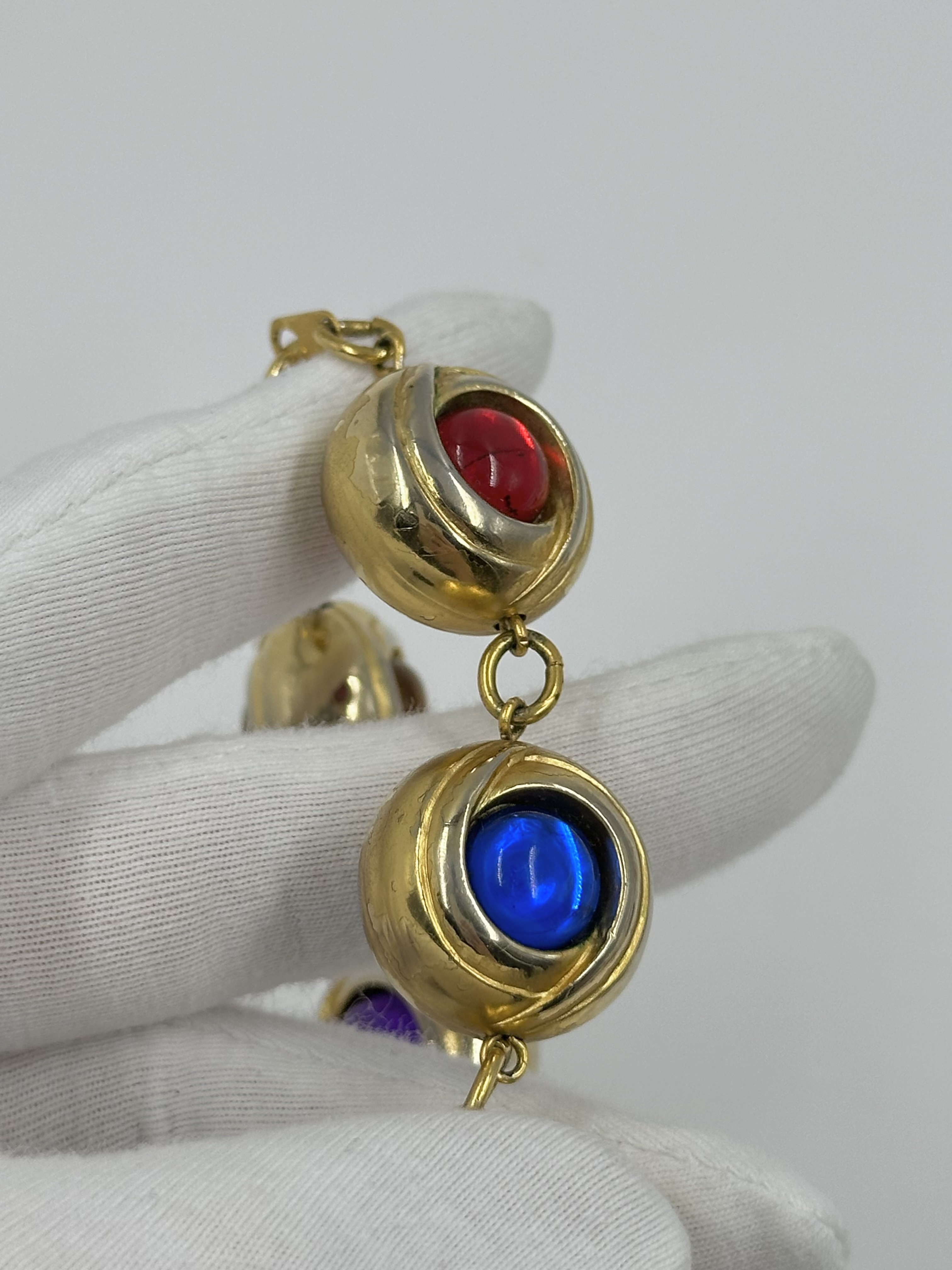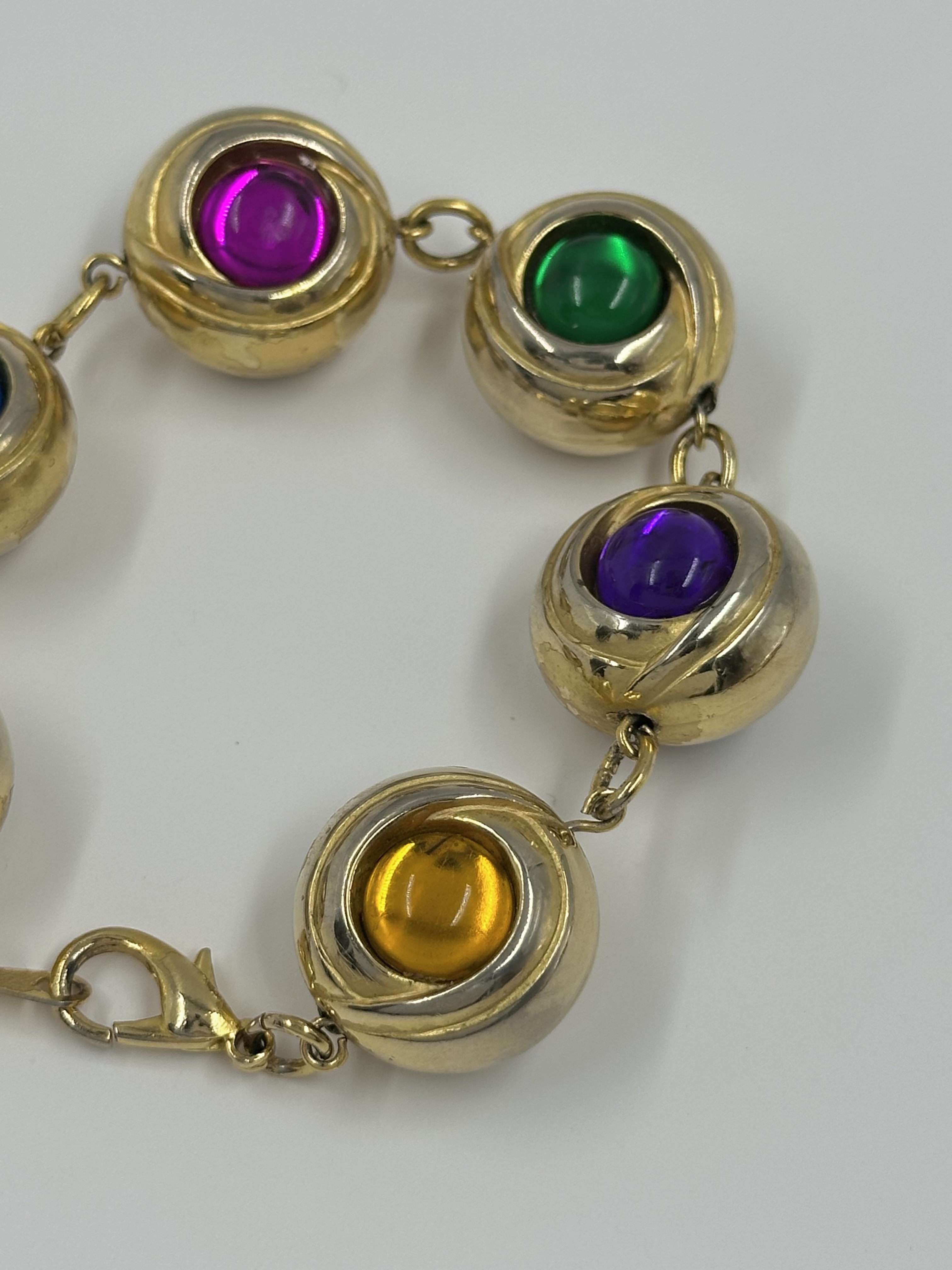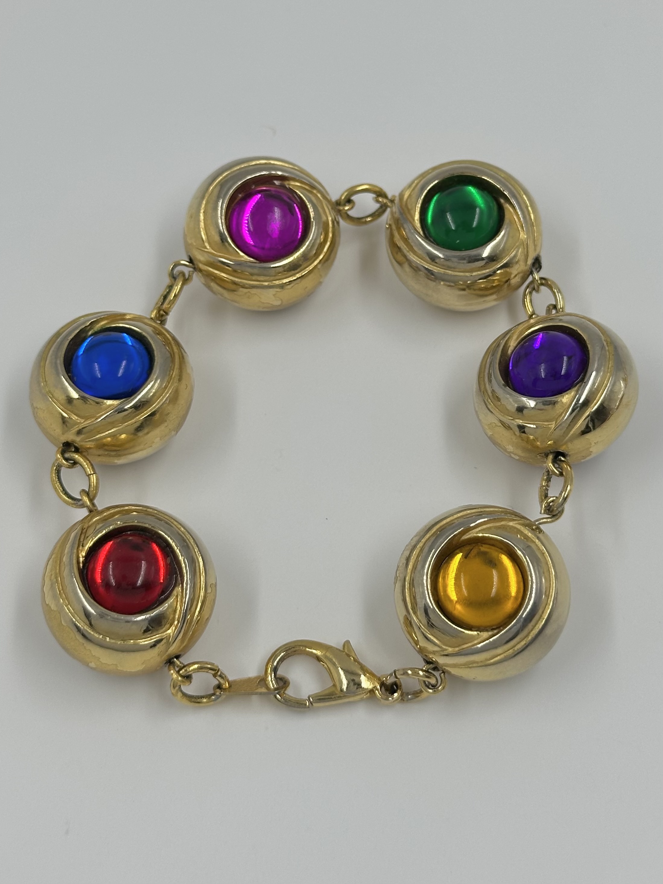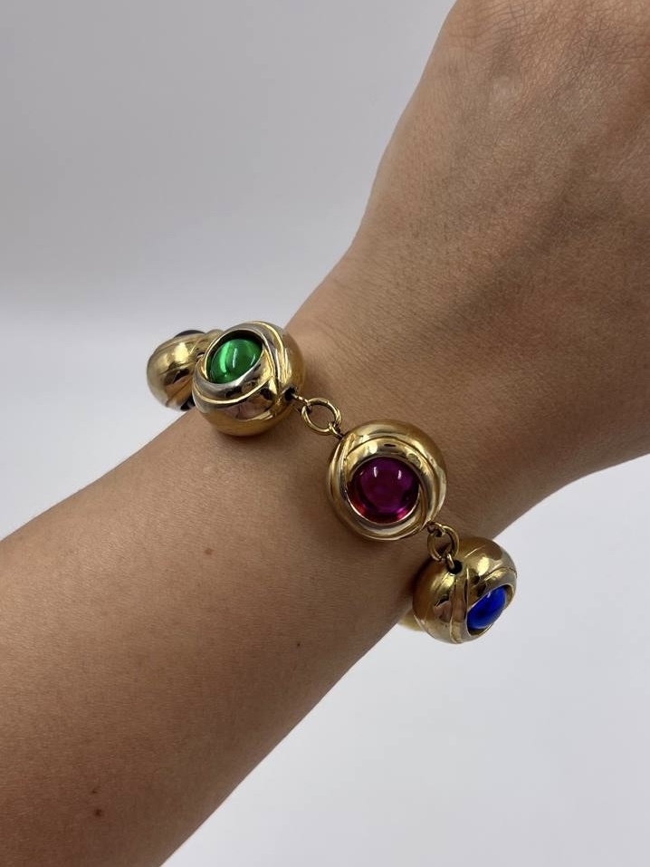 Бижутерный сплав, пластик. Присутствуют потертости, сходы покрытия. На запястье до 17,5см.