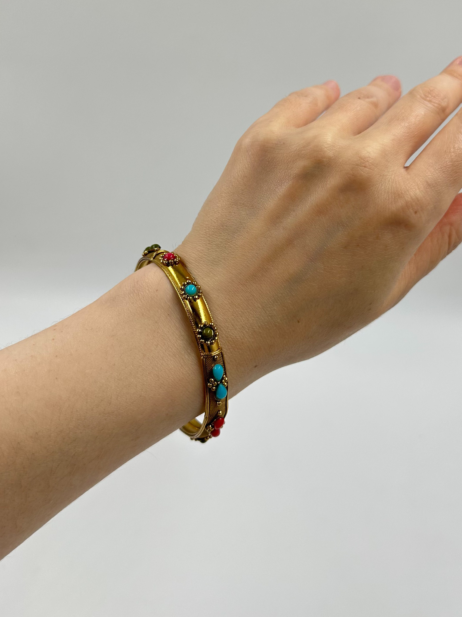 Бижутерный сплав, пластик. Присутствует нюанс - капля клея. Размер по внутренней стороне 21,2см.