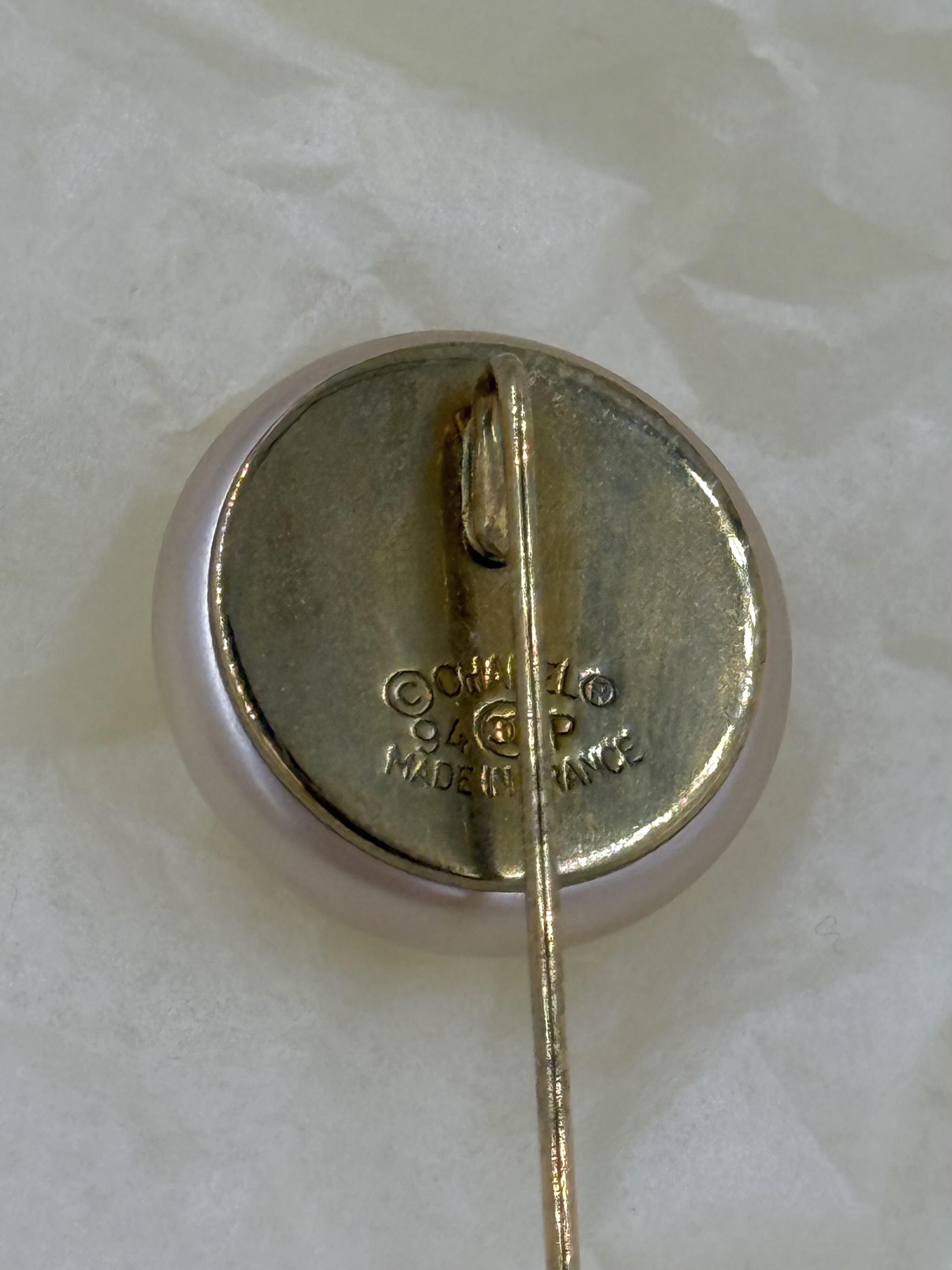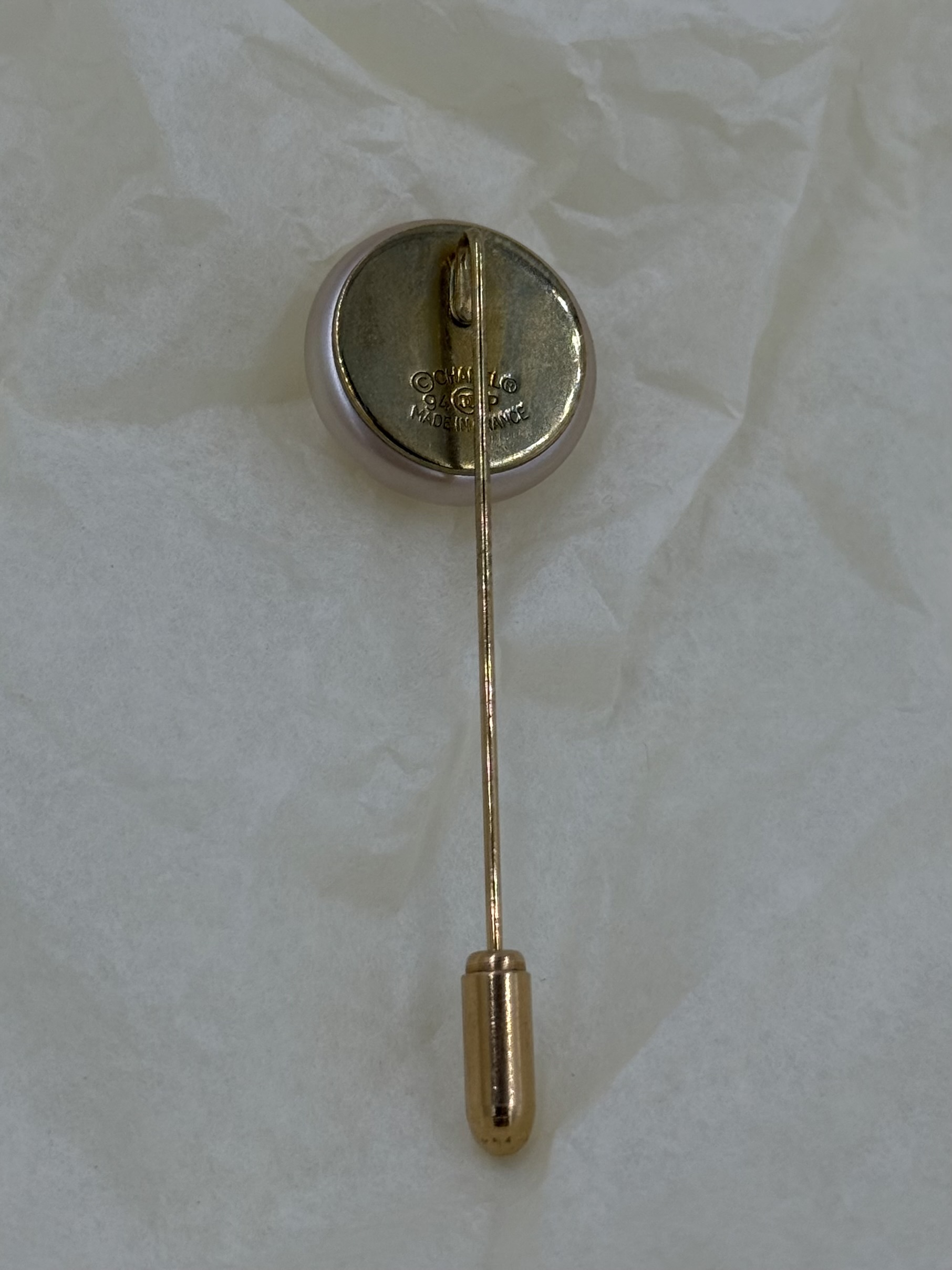 Бижутерный сплав, позолота, имитация жемчуга. Размер 1,7 х 5см. Коллекция Весна 1994 года.