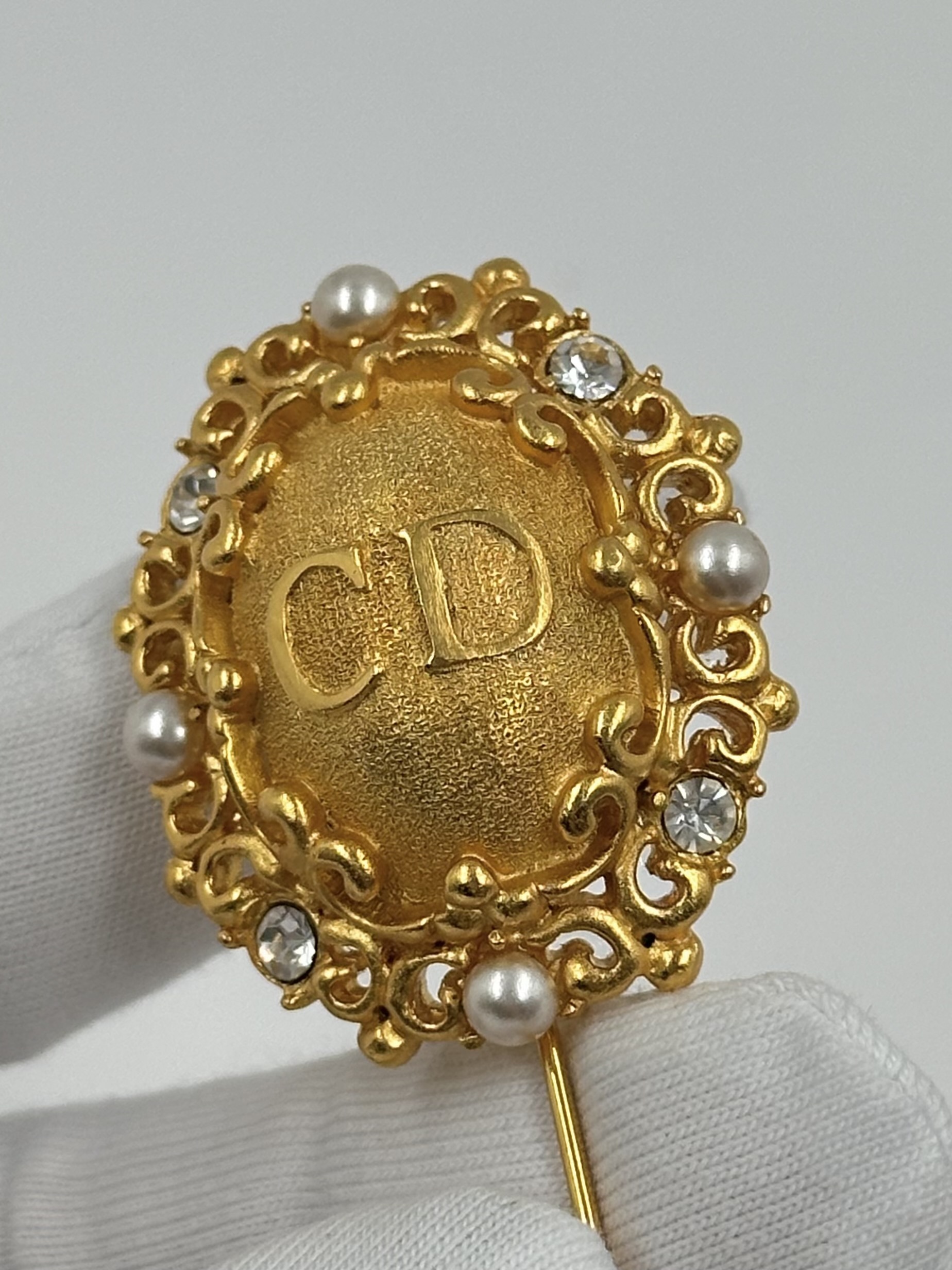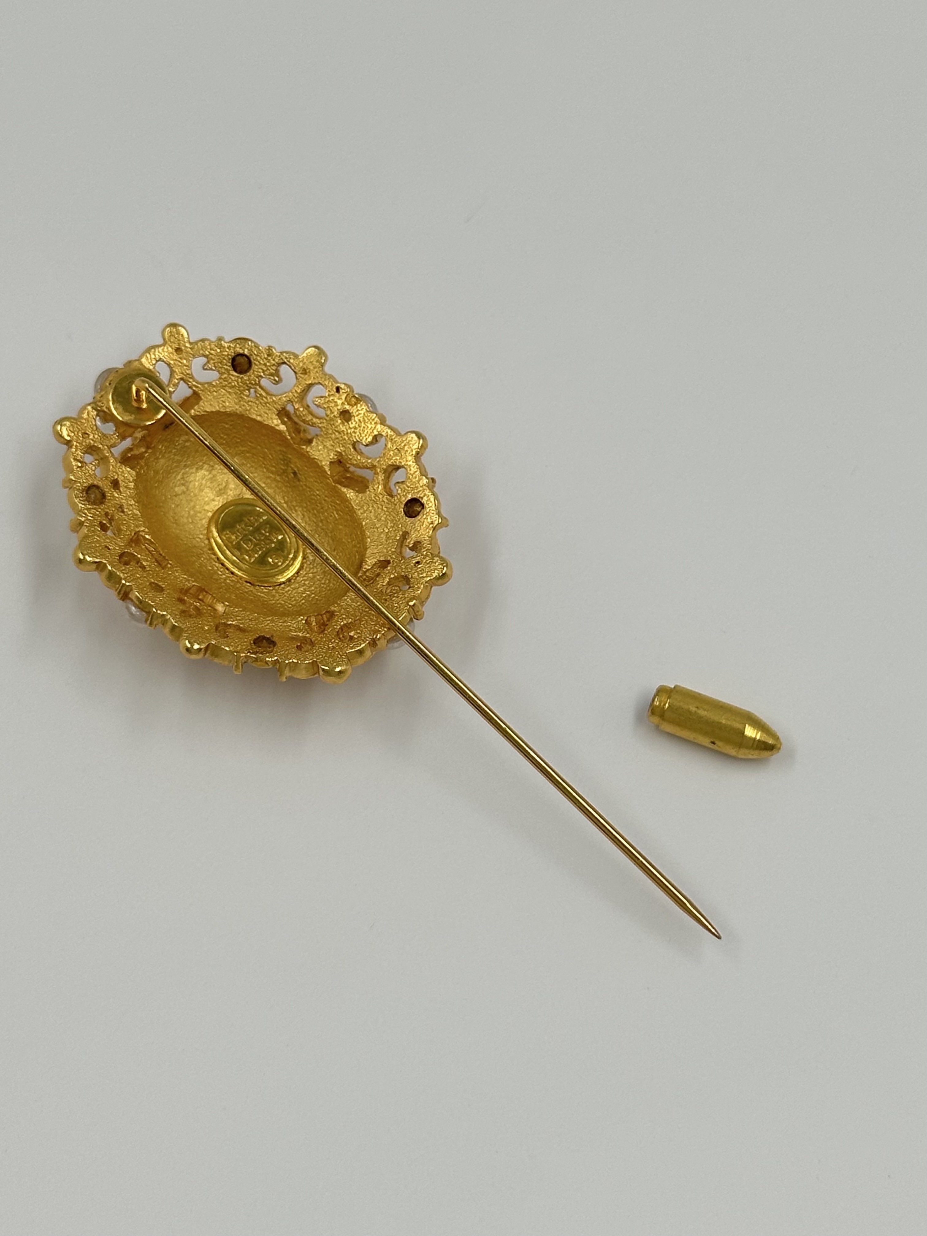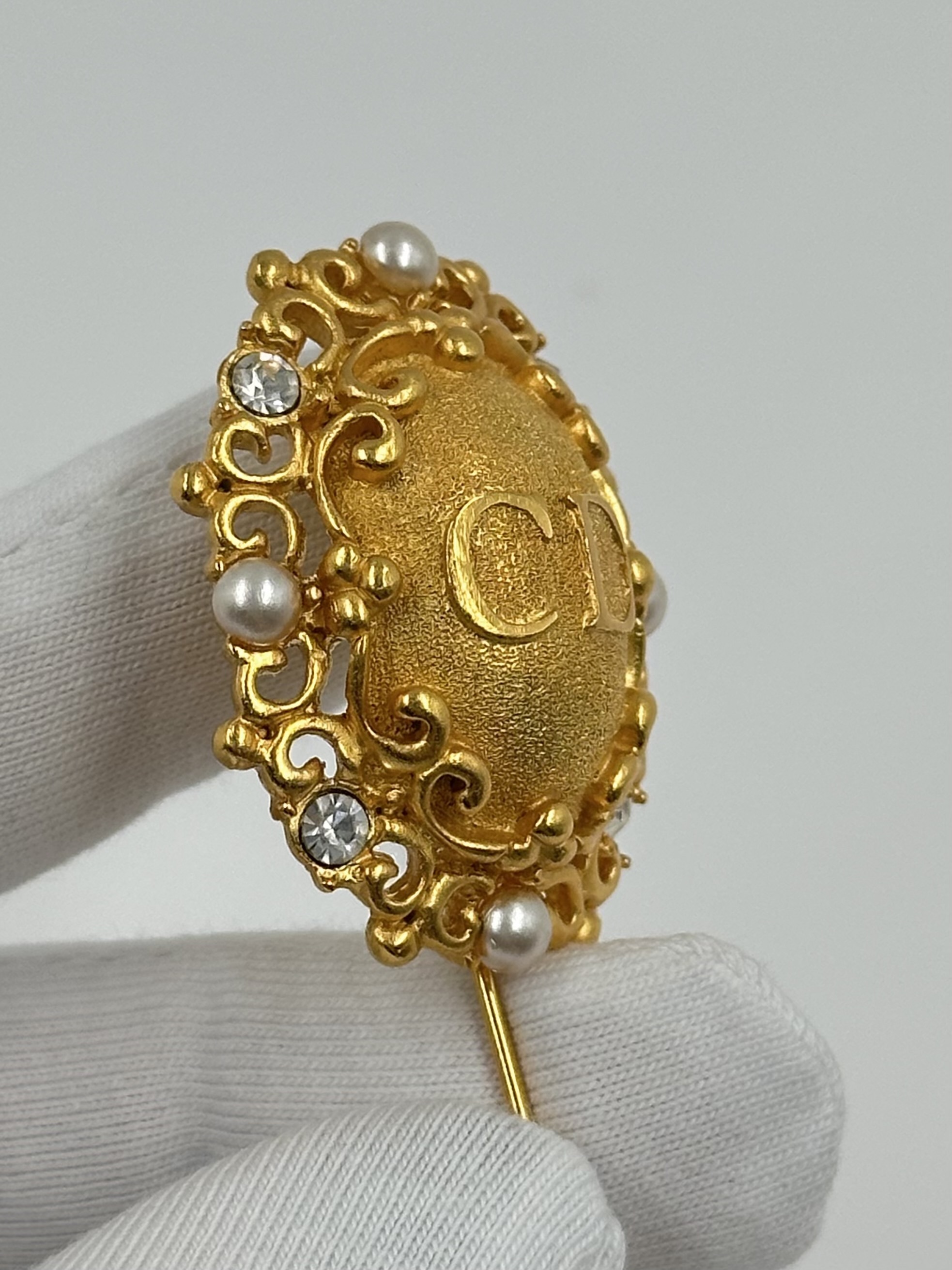 Бижутерный сплав, позолота, имитация жемчуга, кристаллы. Размер 2,8 х 7,1см.