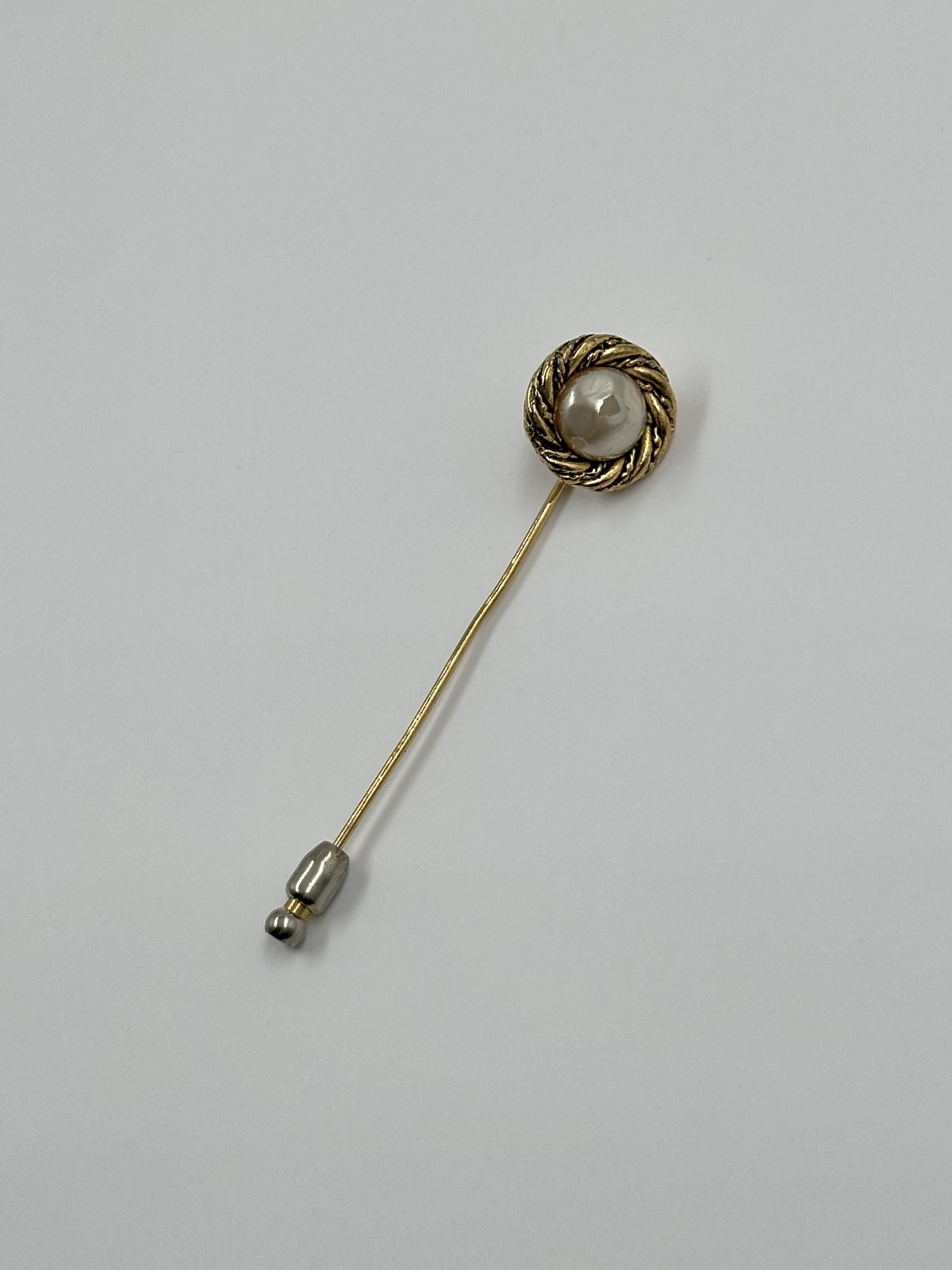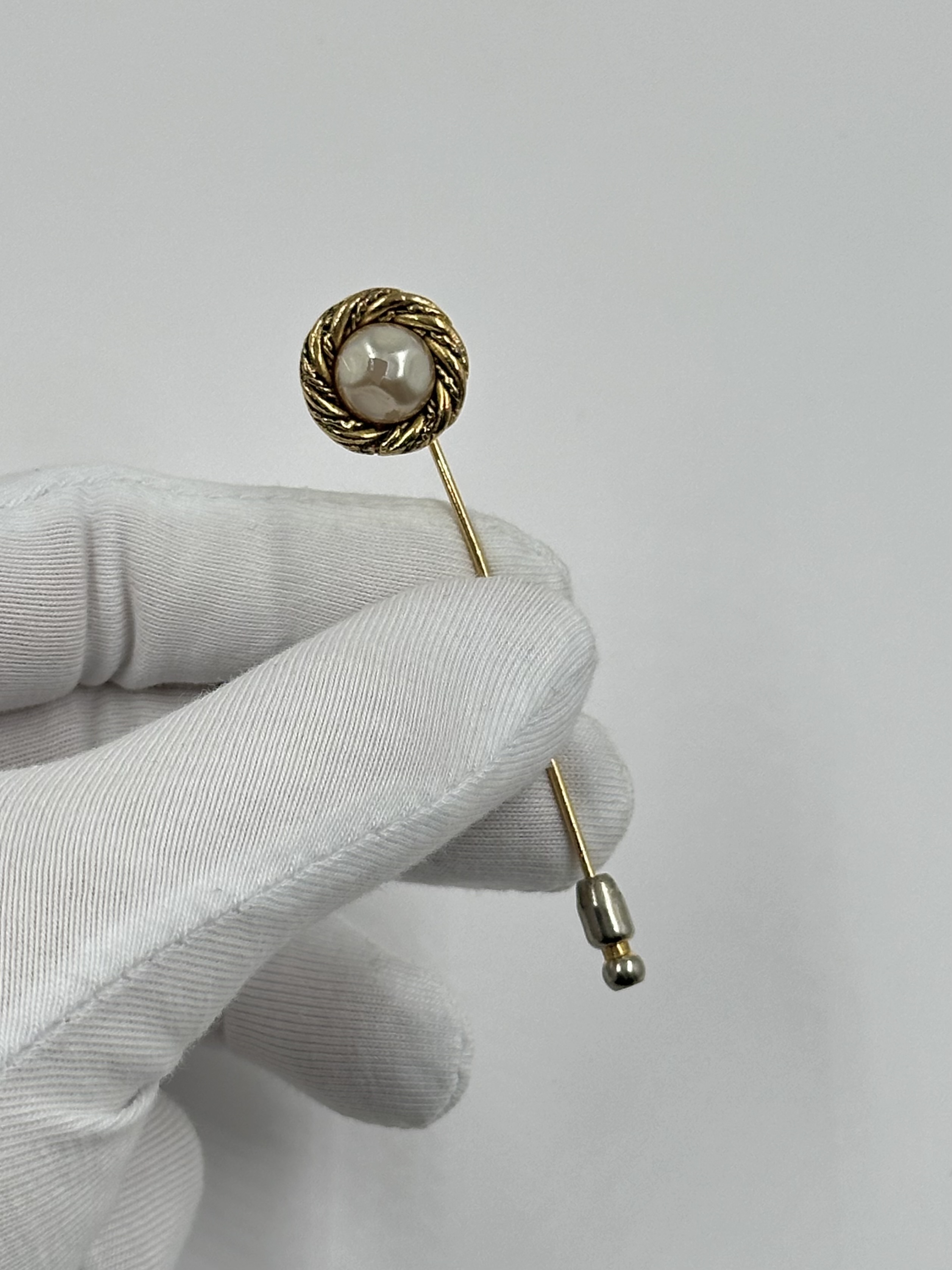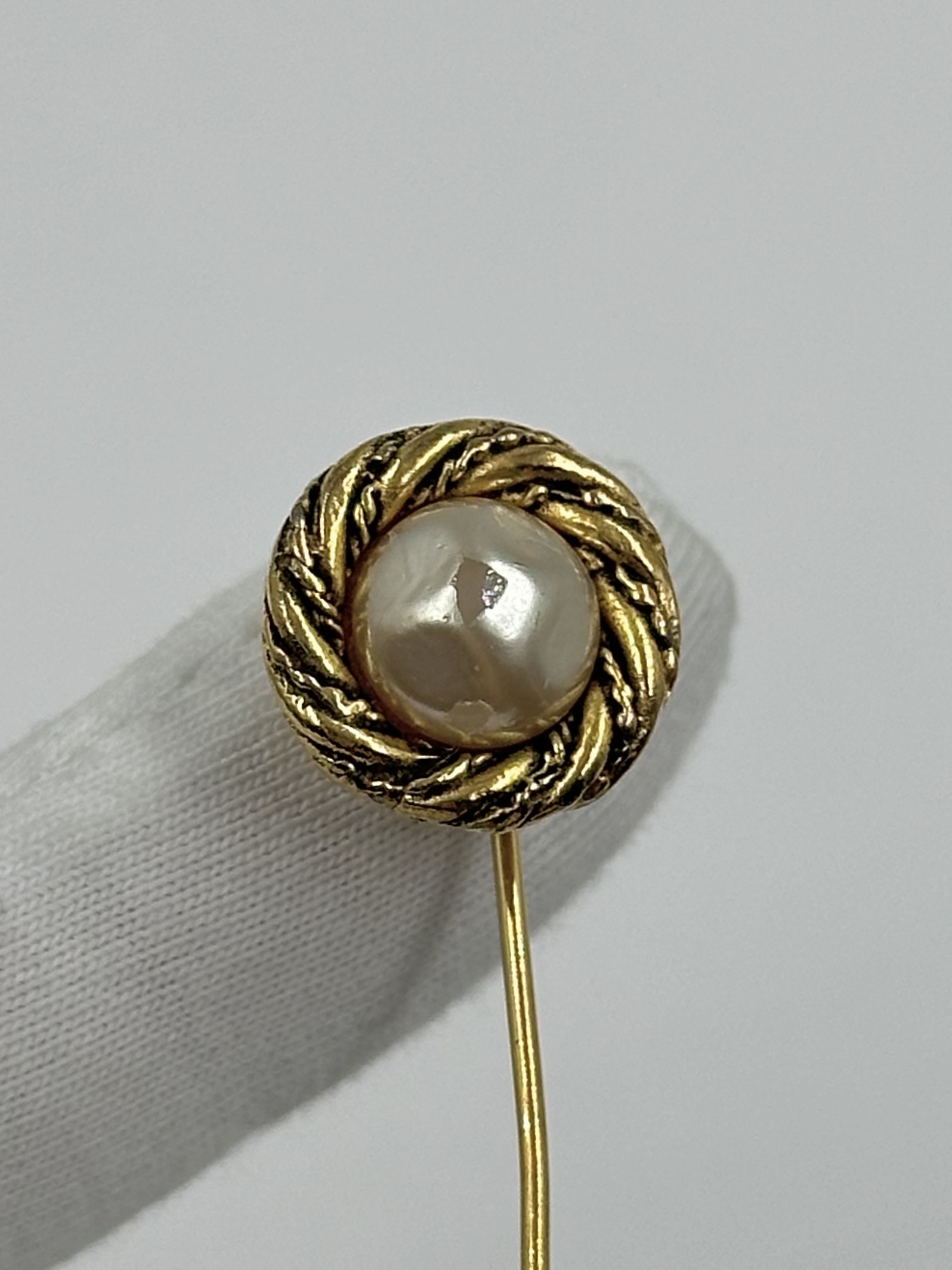 Бижутерный сплав, позолота, имитация жемчуга. Присутствуют сходы покрытия на вставке, потертость позолоты на замке, искривление иглы.