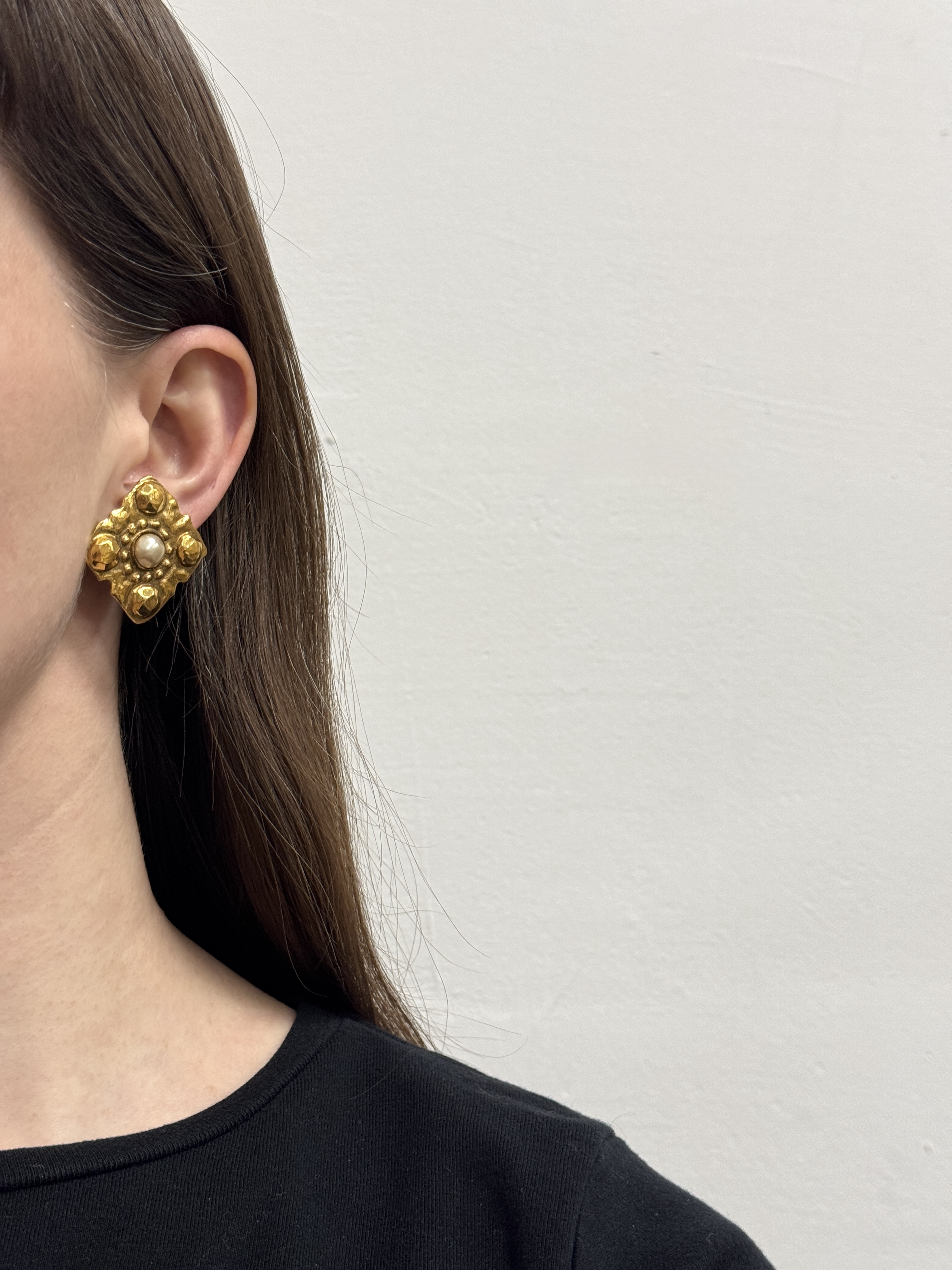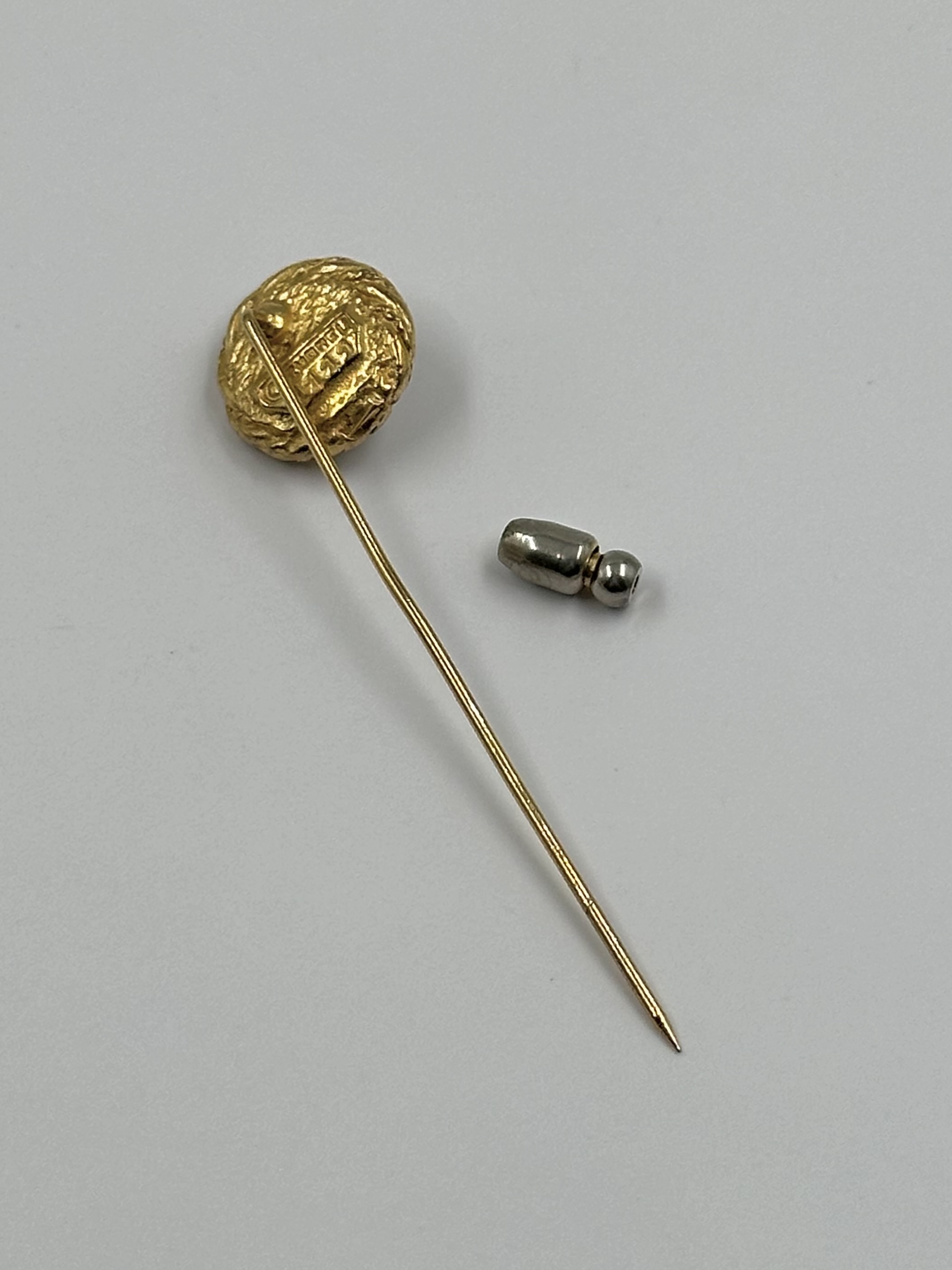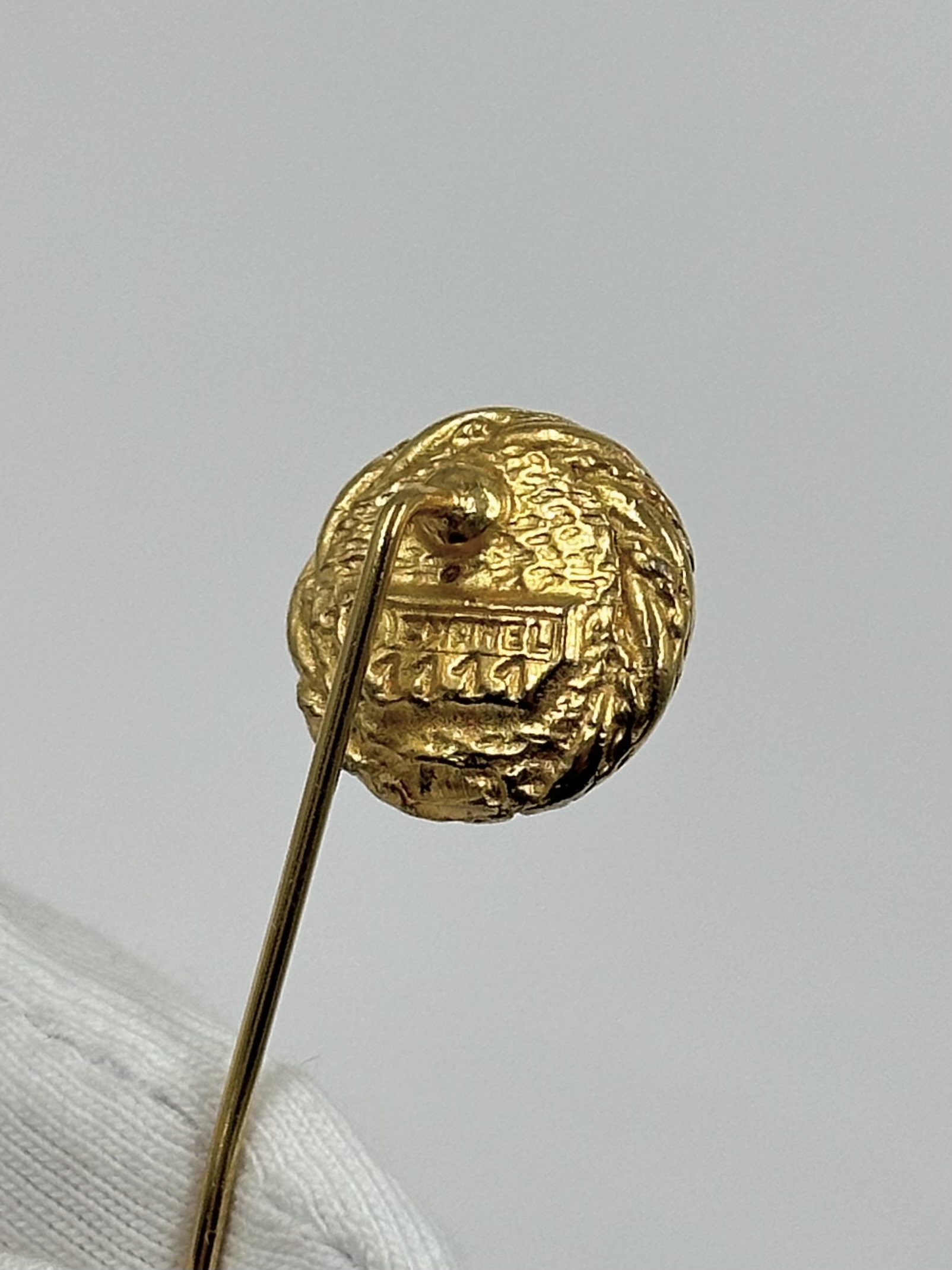 Бижутерный сплав, позолота, имитация жемчуга. Присутствуют сходы покрытия на вставке, потертость позолоты на замке, искривление иглы.