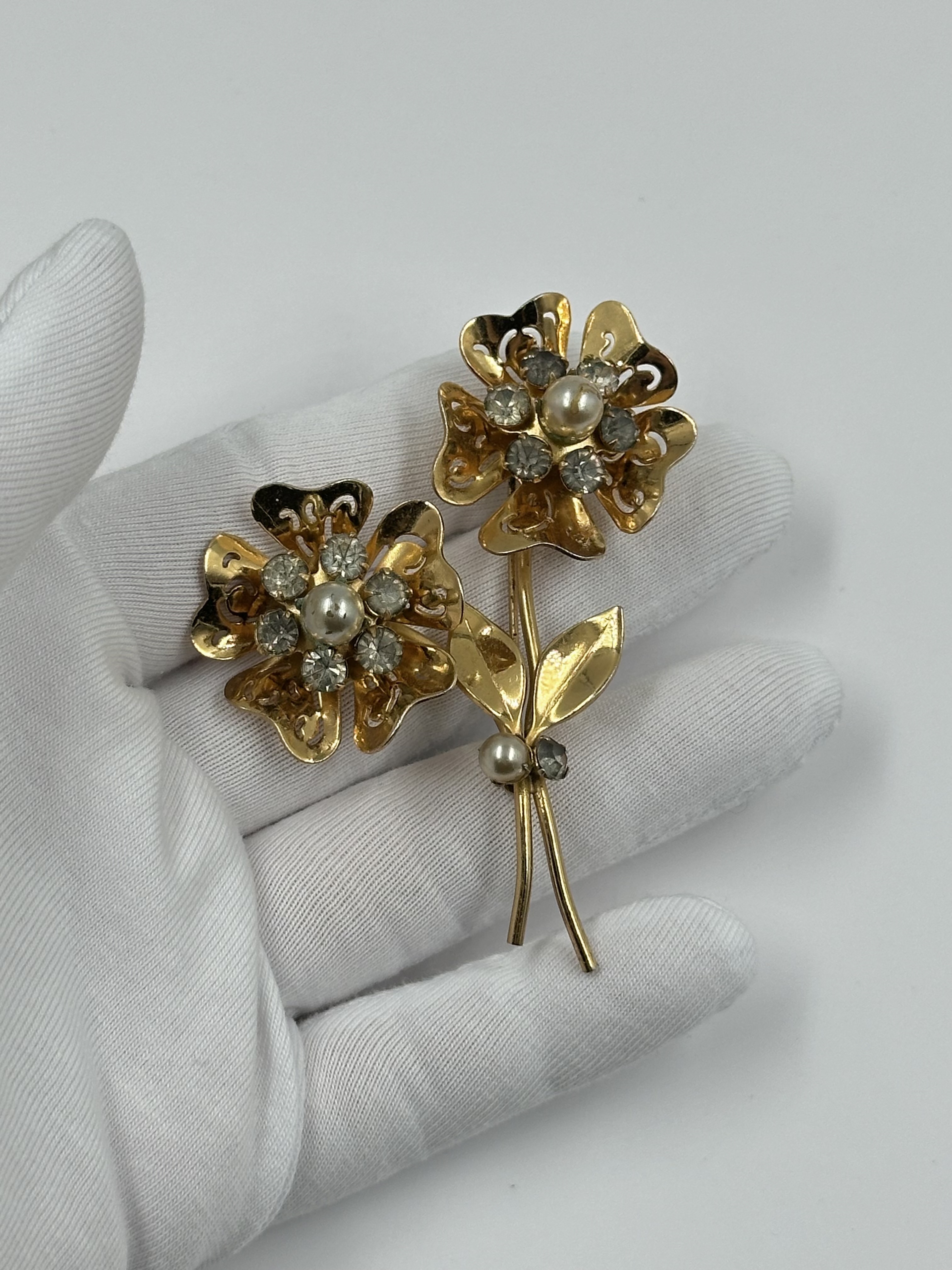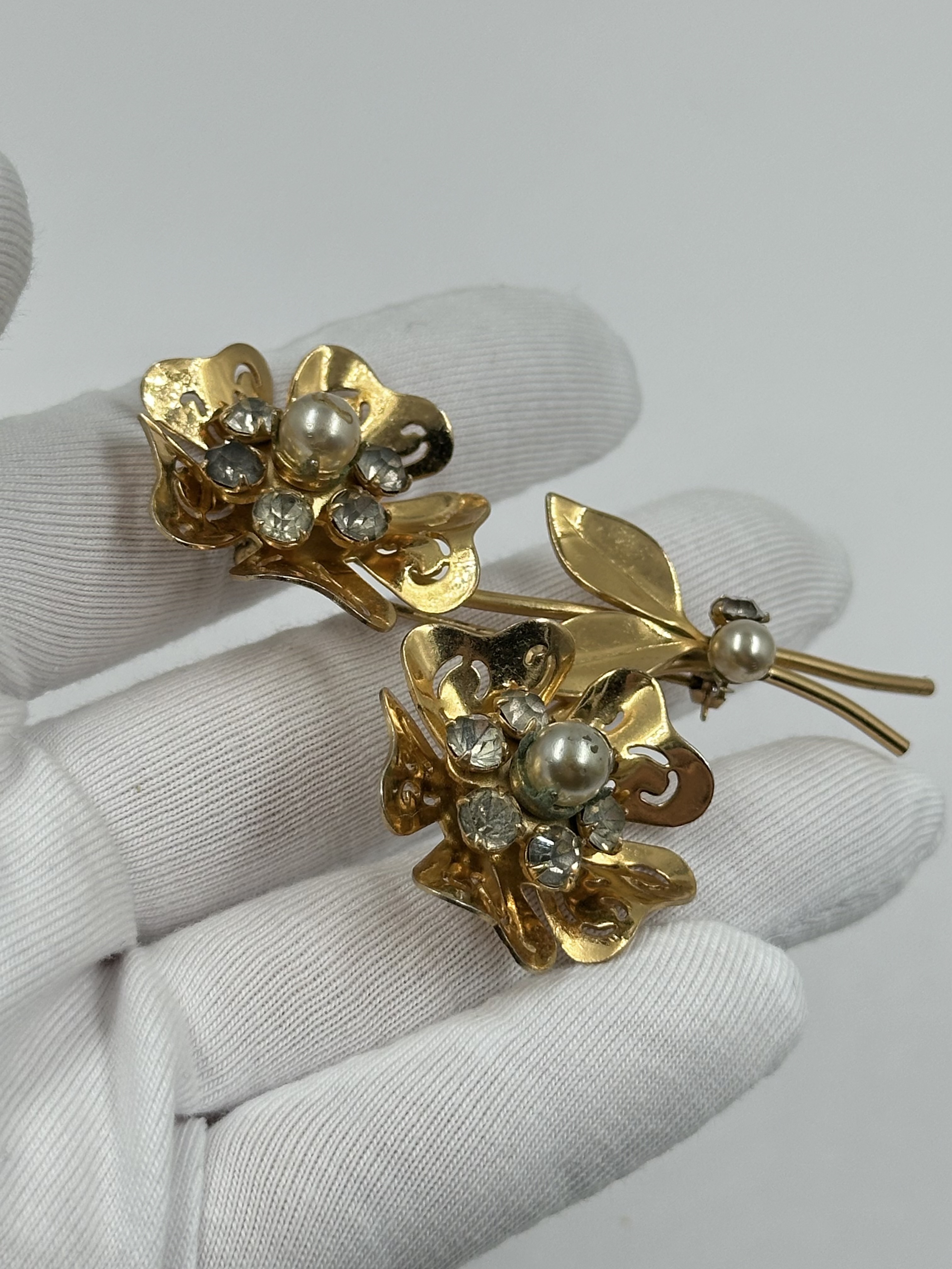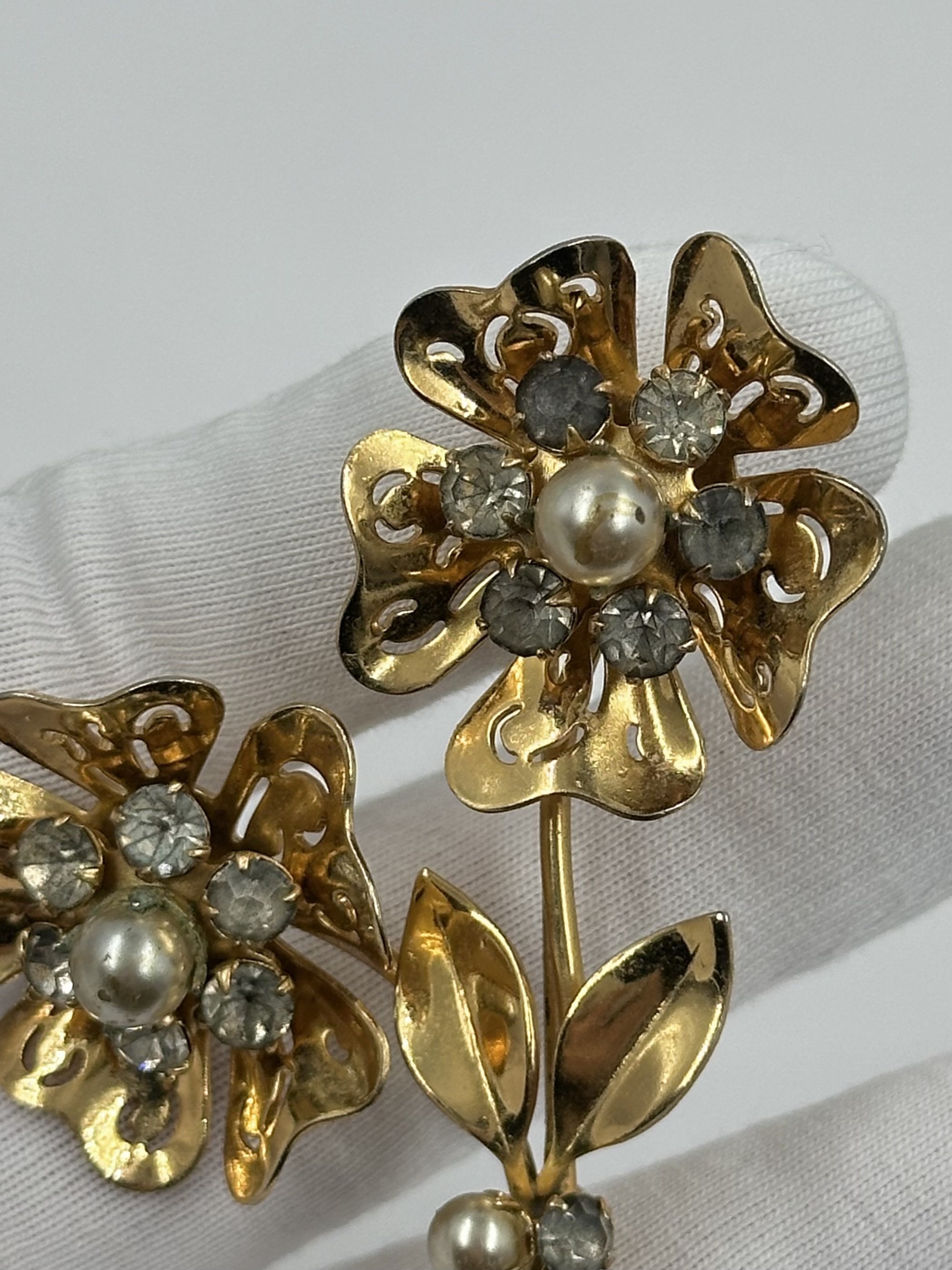 Бижутерный сплав, кристаллы, имитация жемчуга. Местами присутствует патина, сходы покрытия на бусинах. Размер 4,7 x 6,8см.