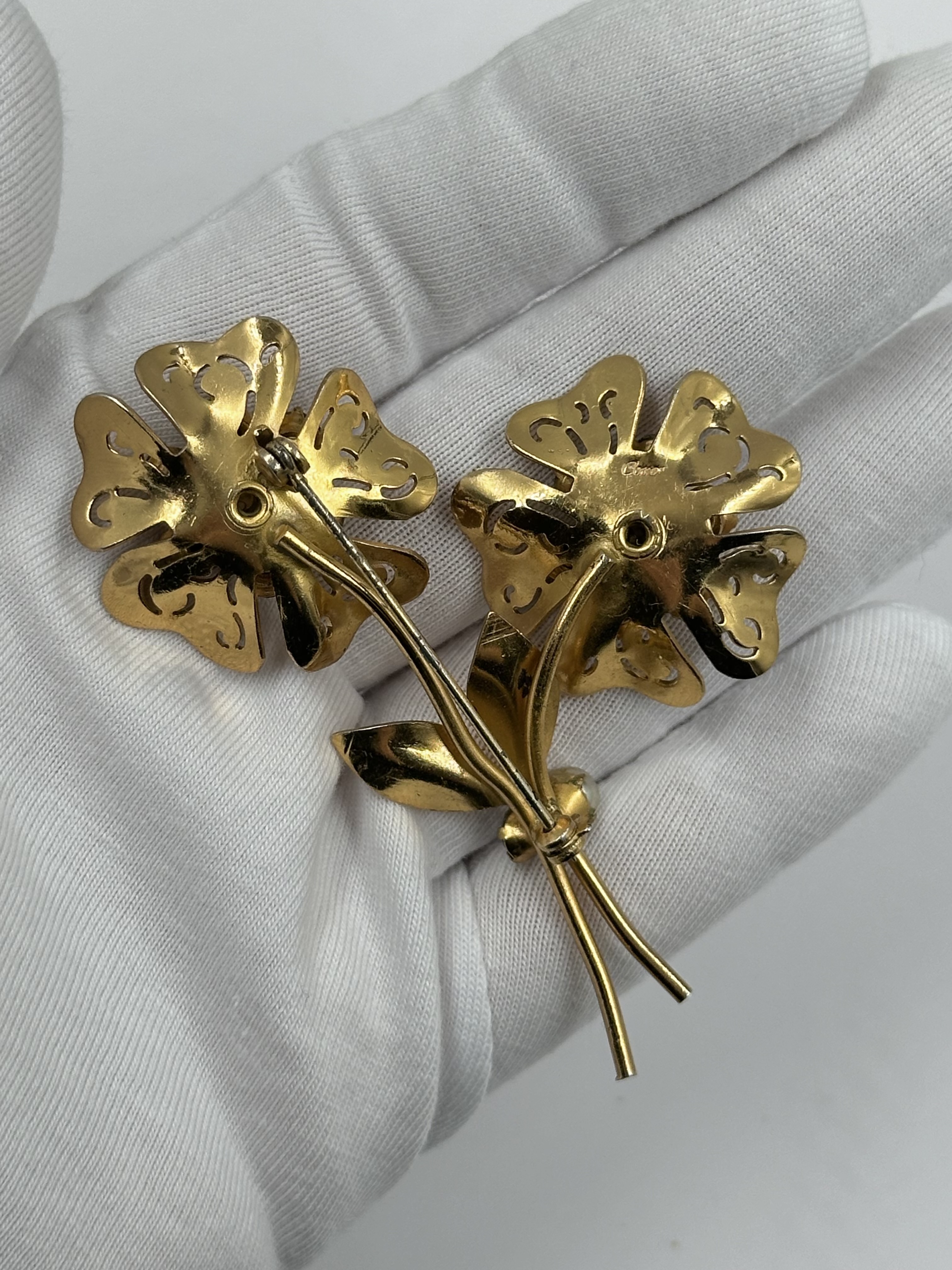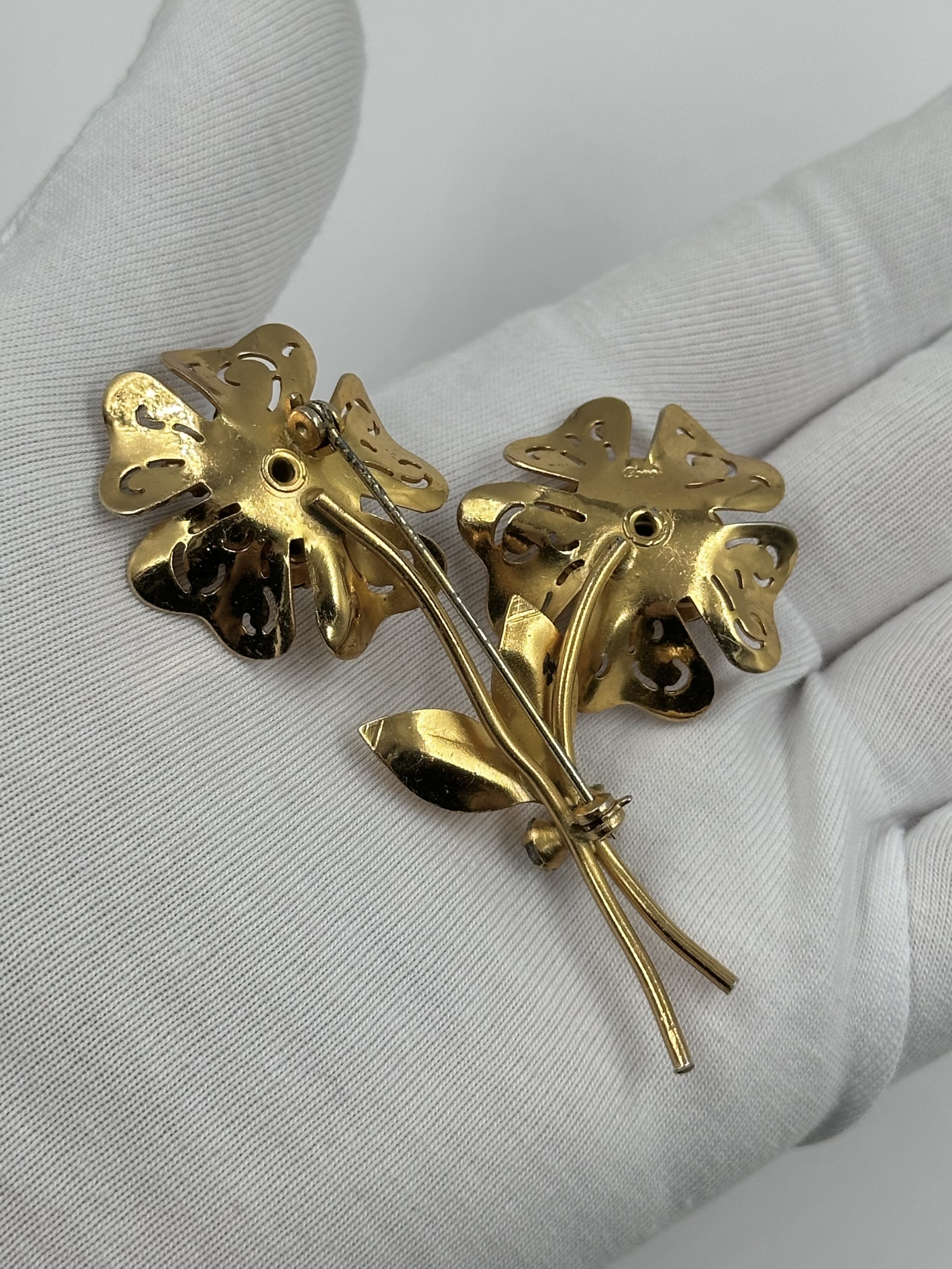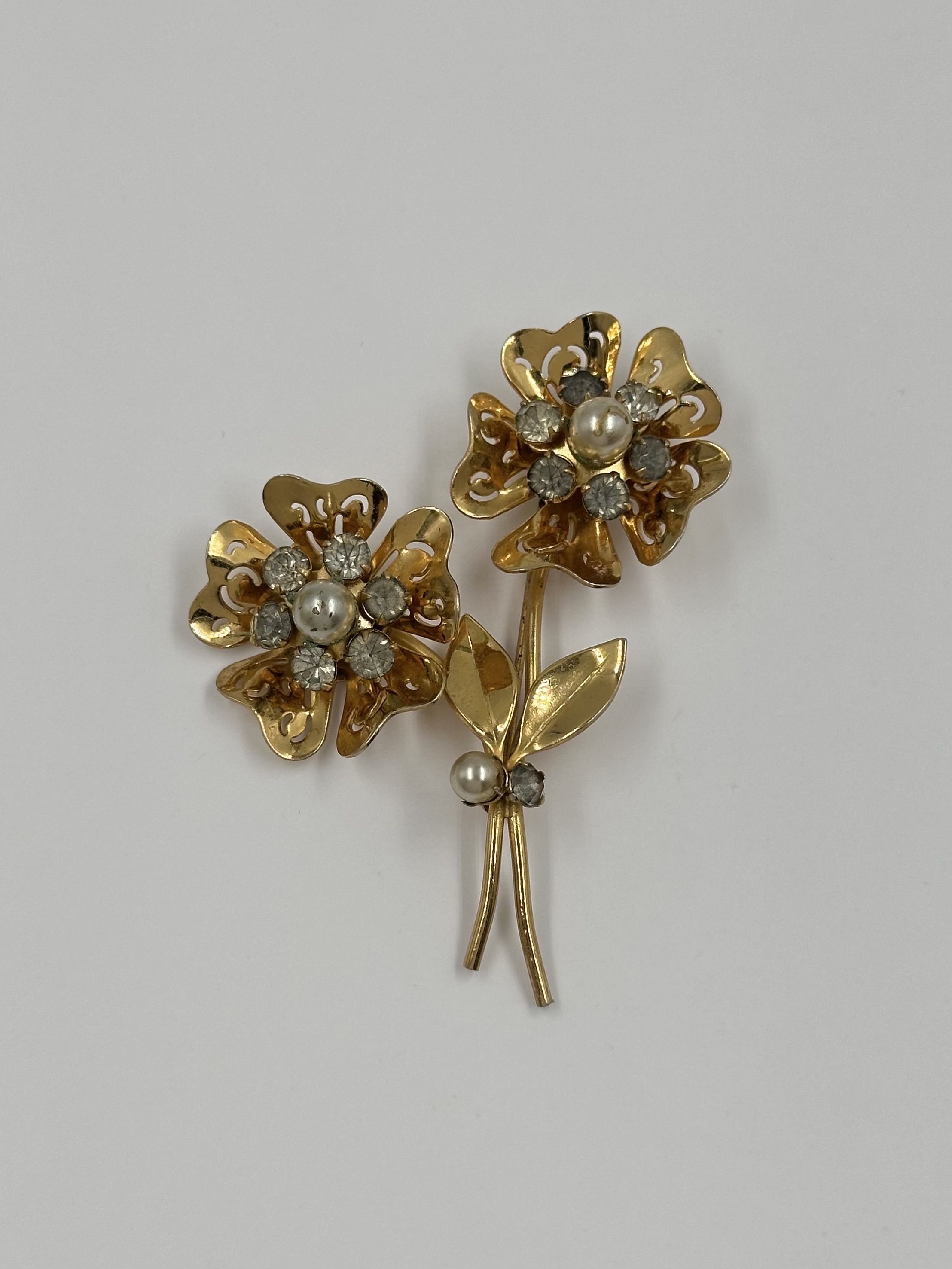 Бижутерный сплав, кристаллы, имитация жемчуга. Местами присутствует патина, сходы покрытия на бусинах. Размер 4,7 x 6,8см.