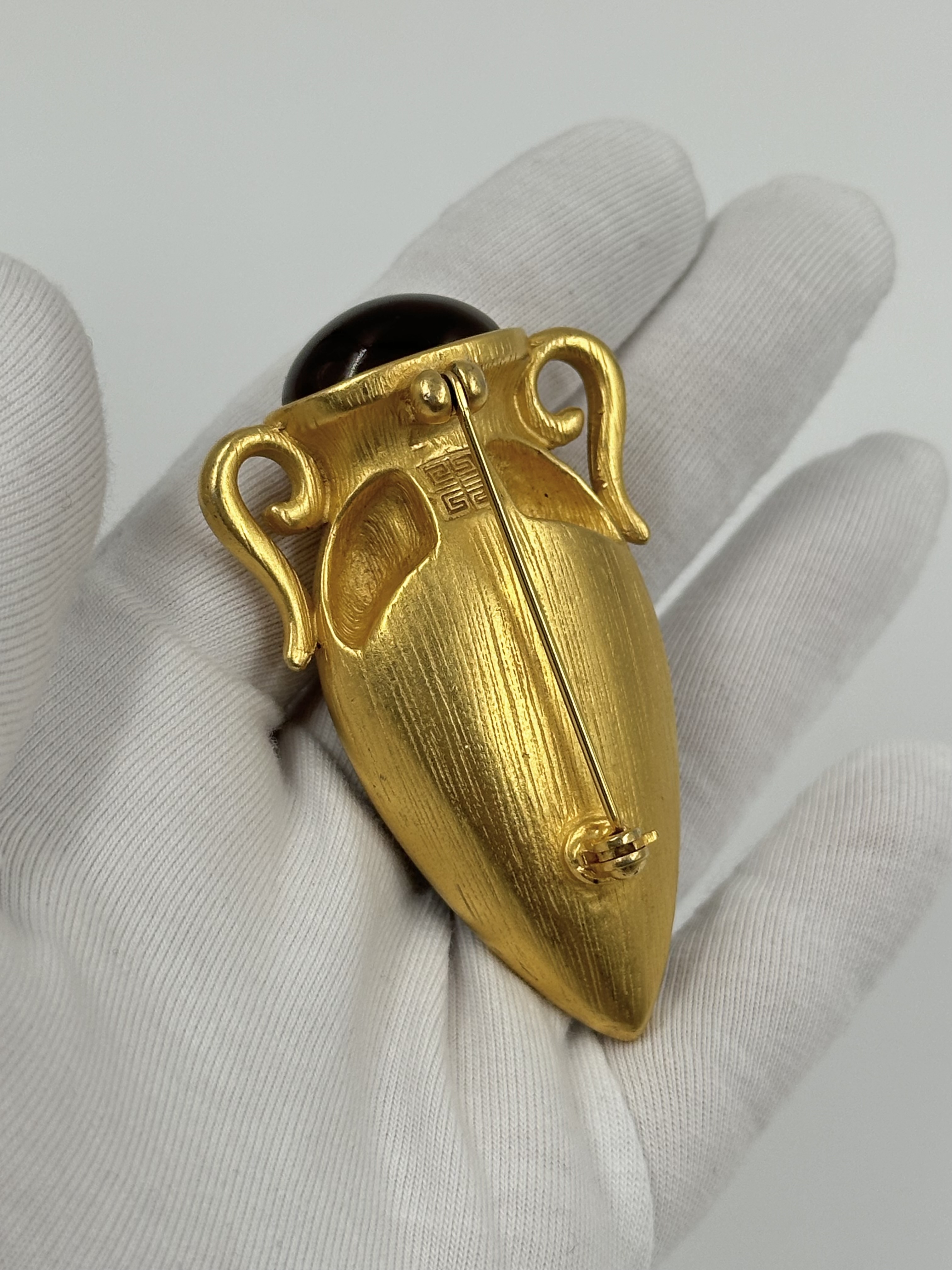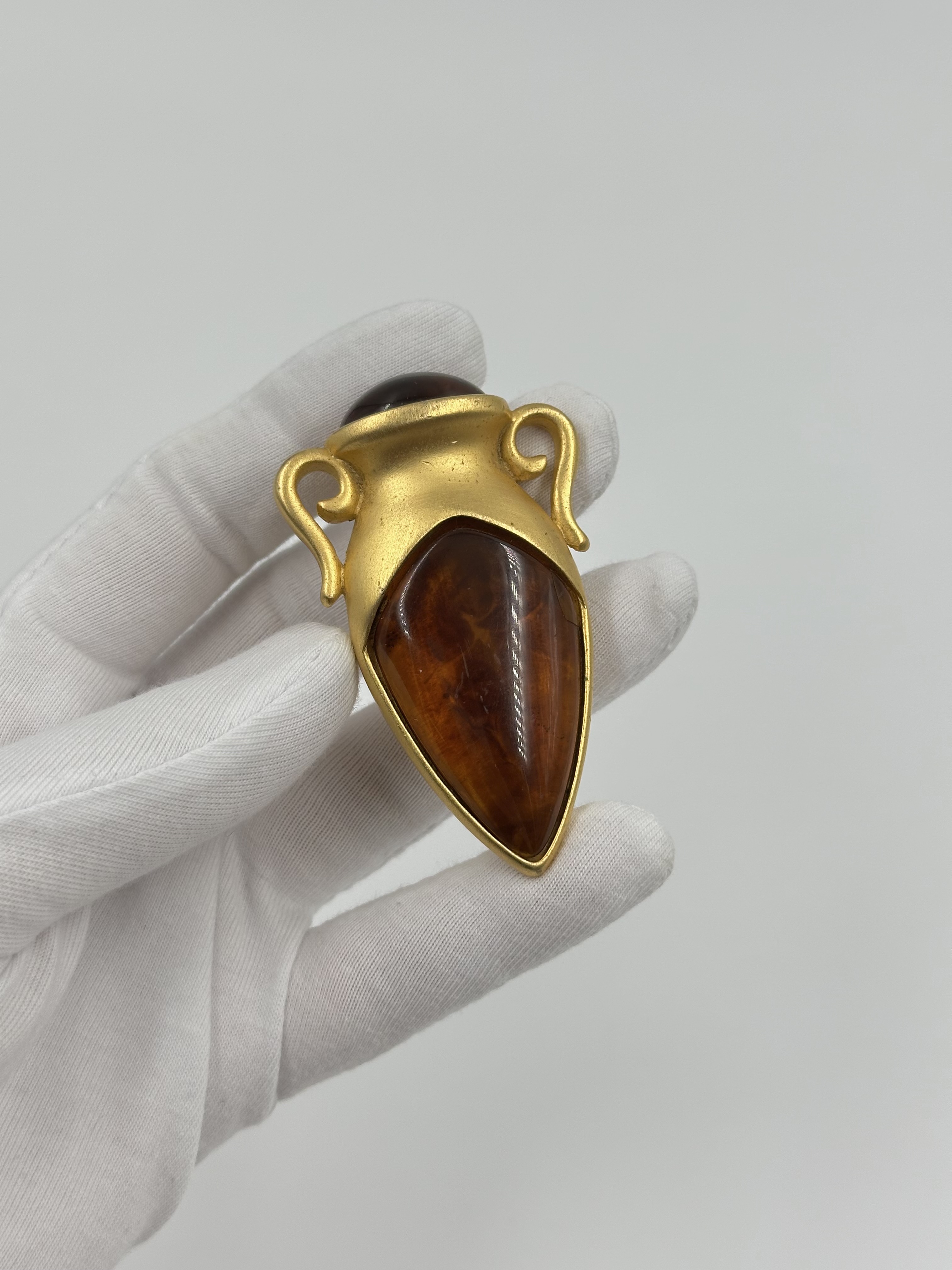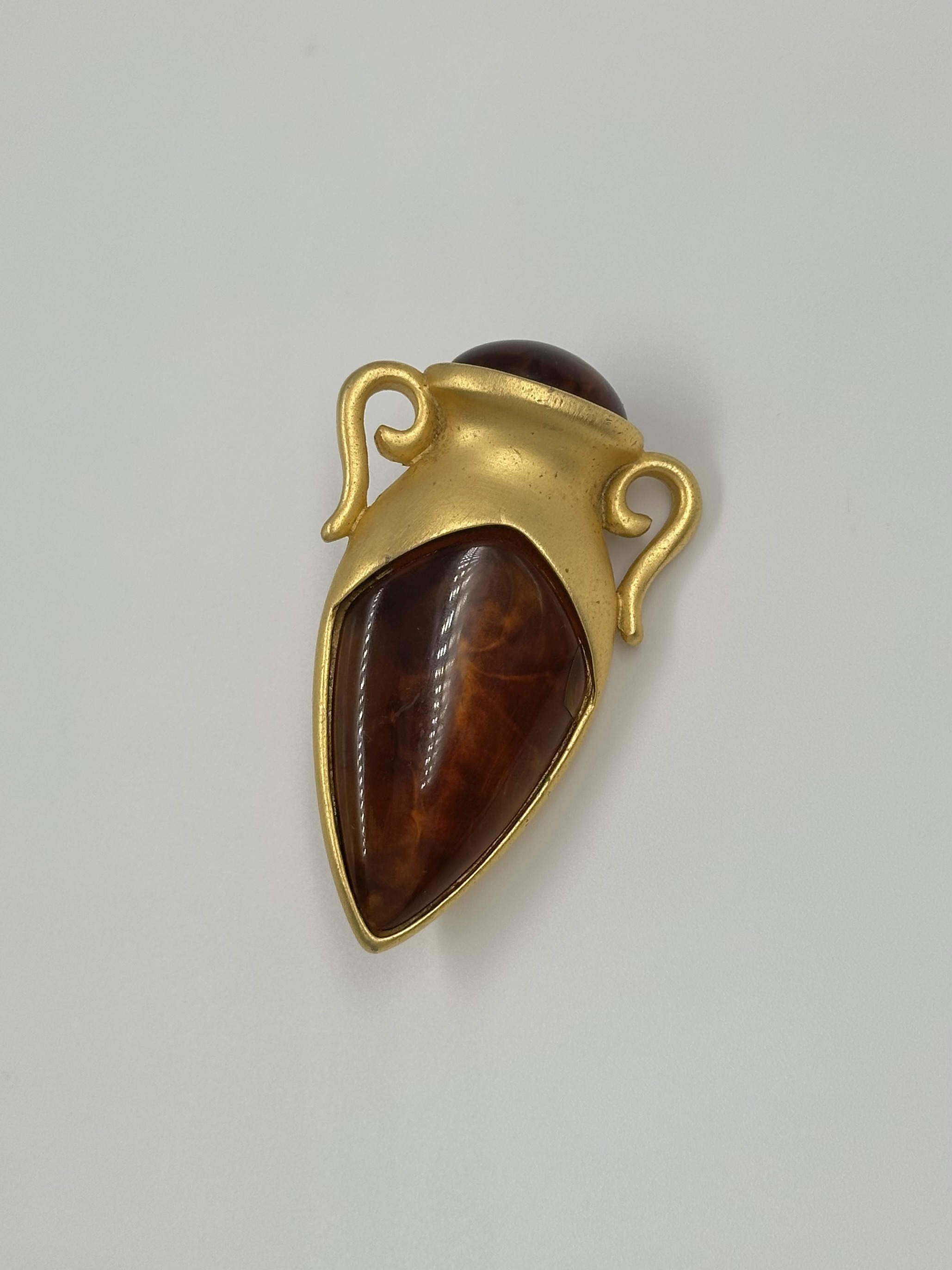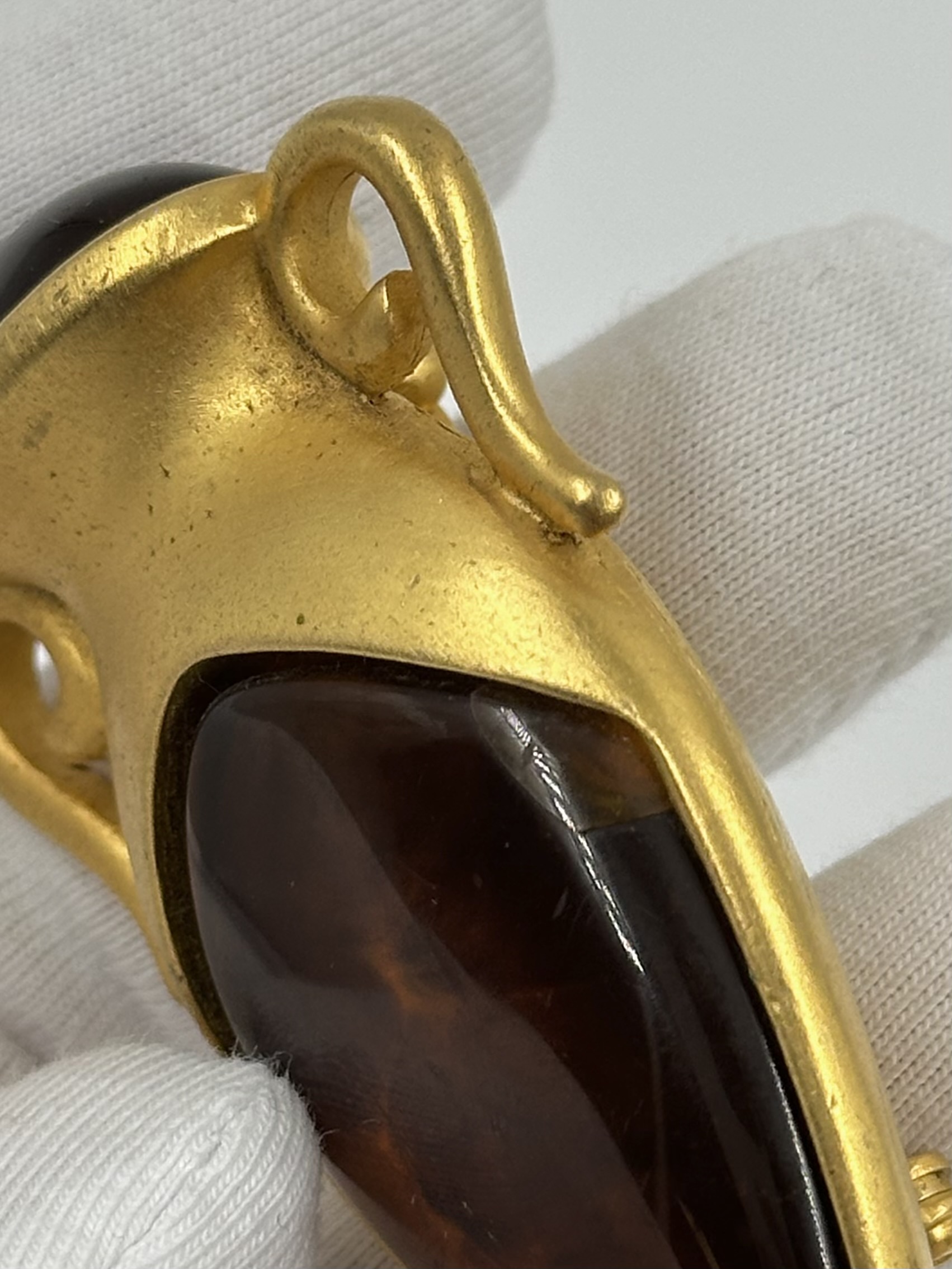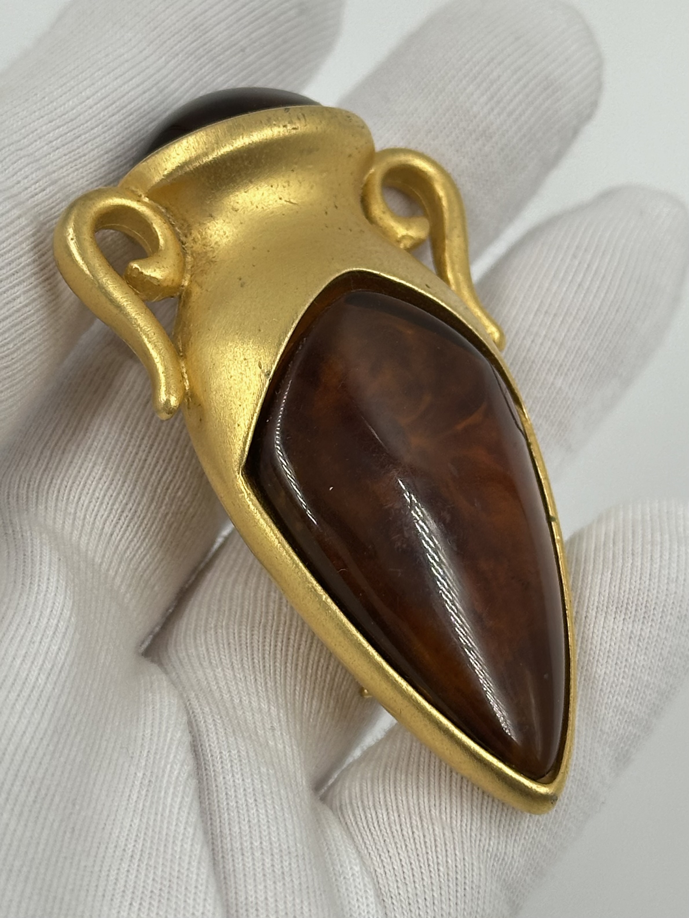Бижутерный сплав, позолота, пластик. На вставке присутствует трещина и царапины, патина на позолоте.