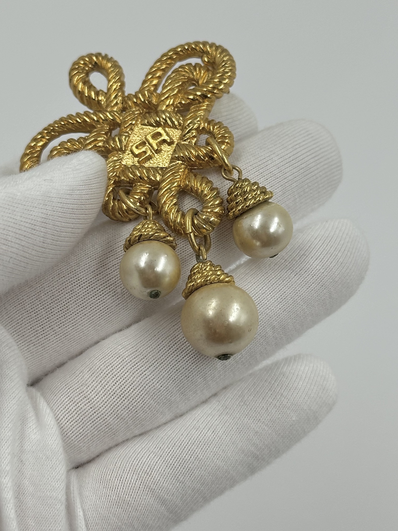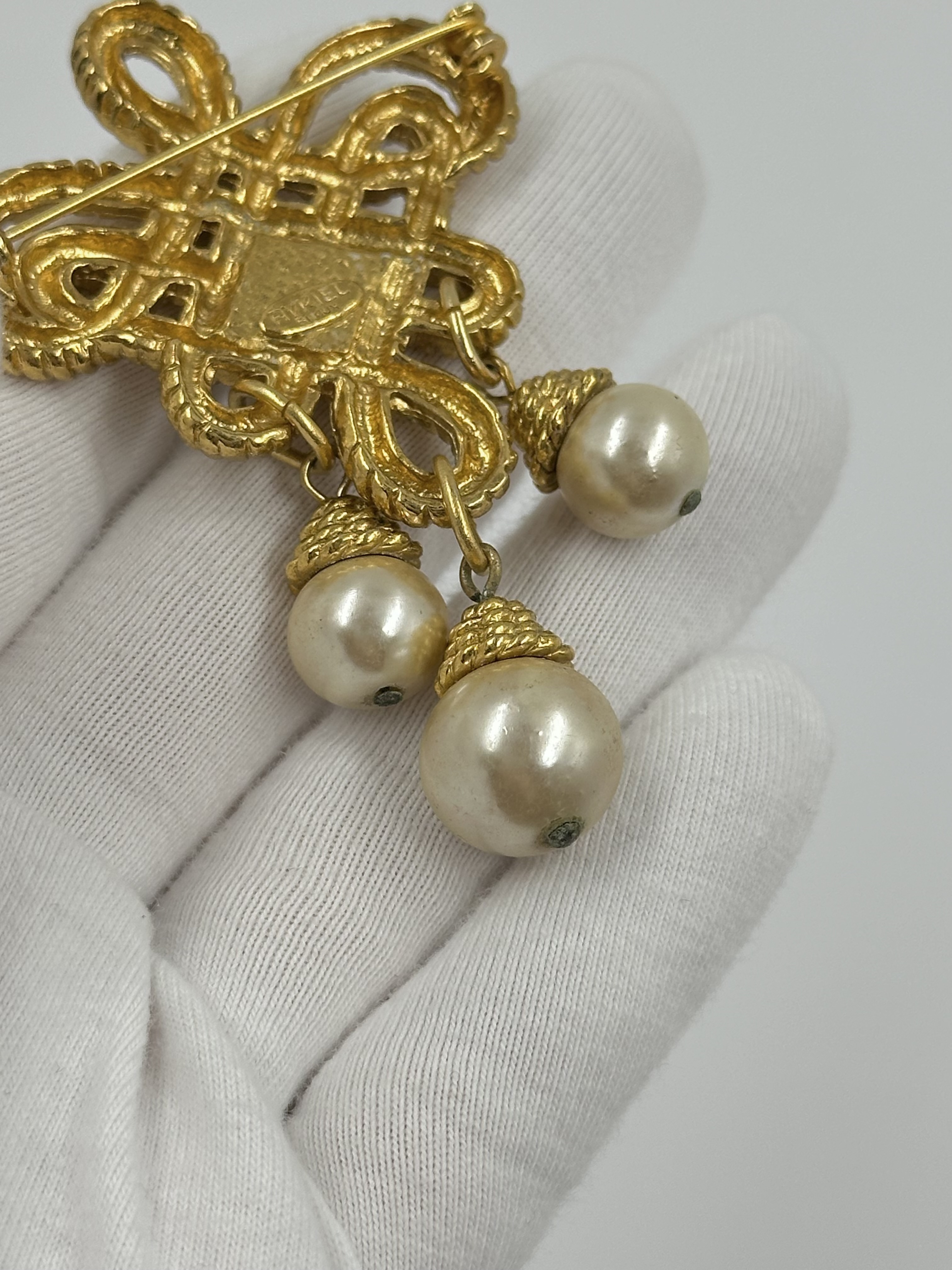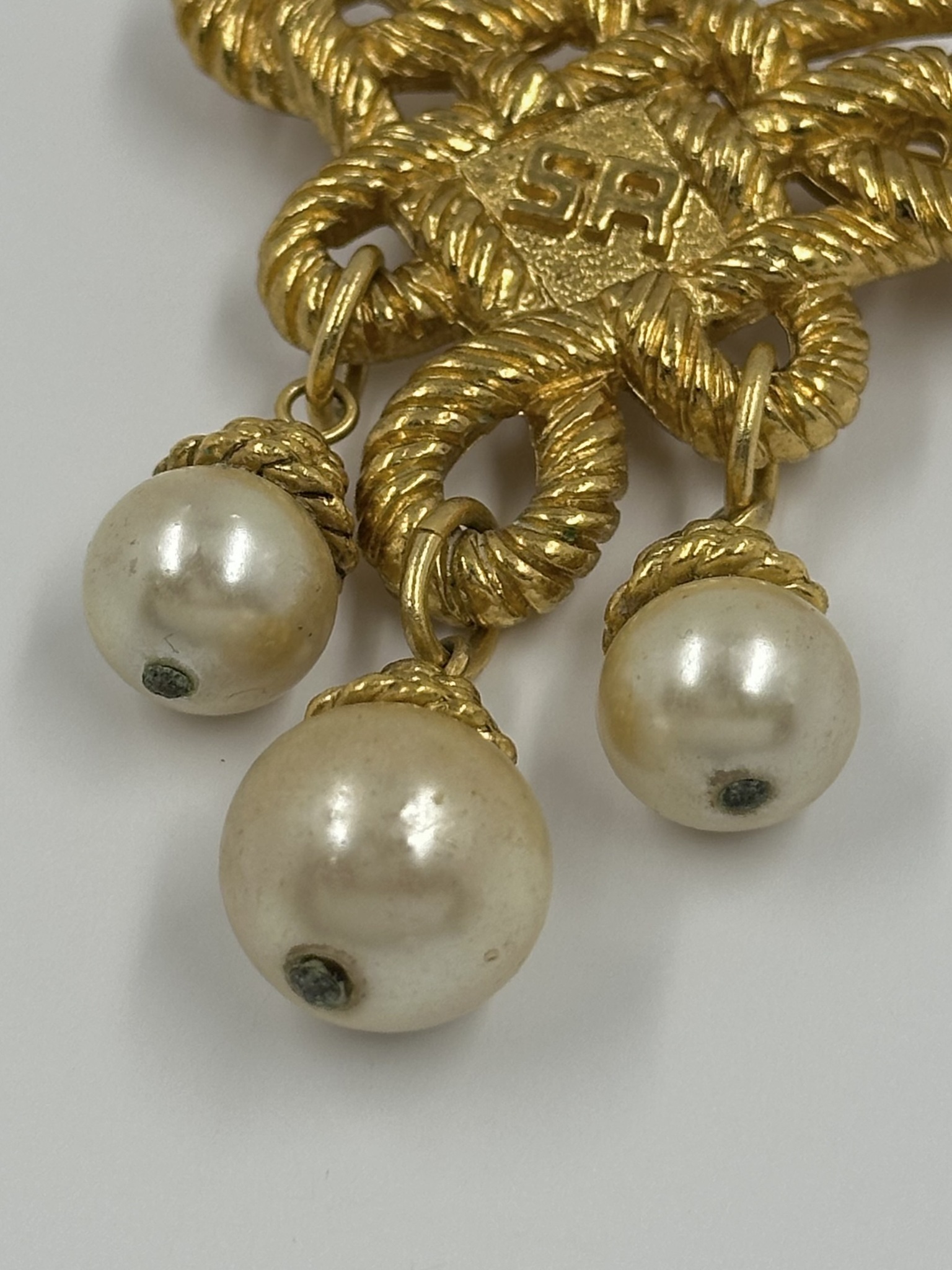 Бижутерный сплав, позолота, имитация жемчуга. На бусинах присутствуют следы времени, патина. Размер 4,4 х 6,8см.