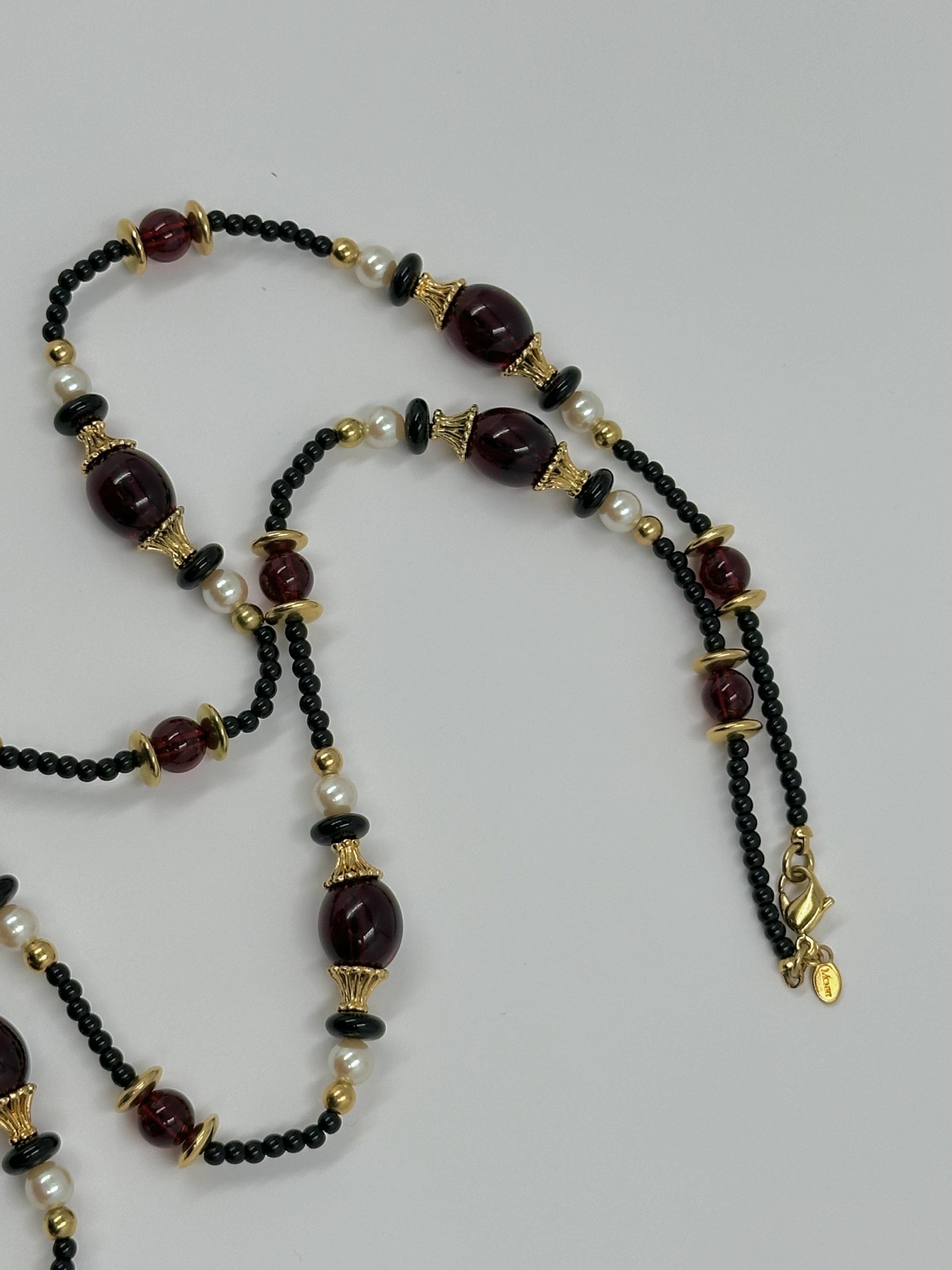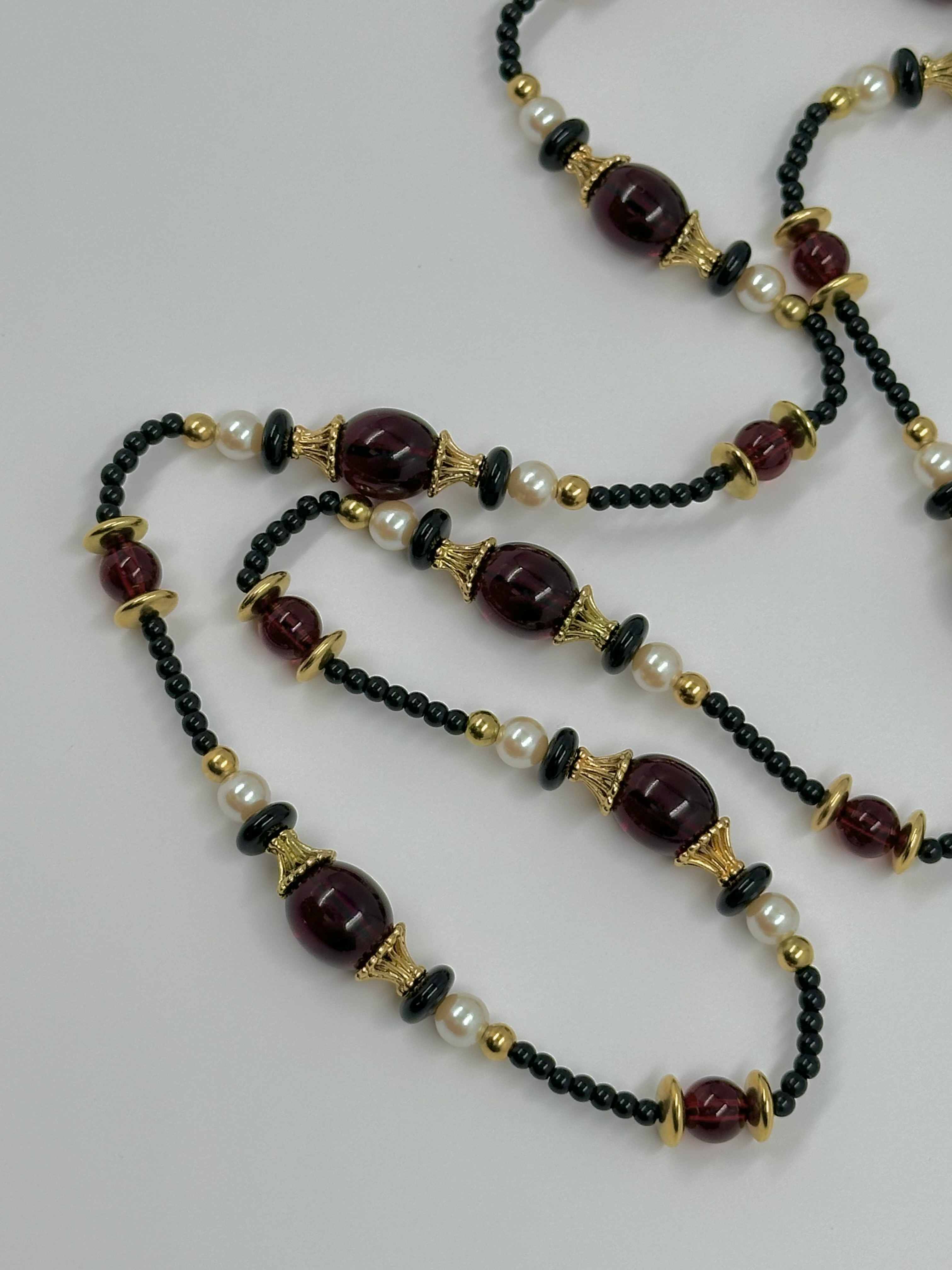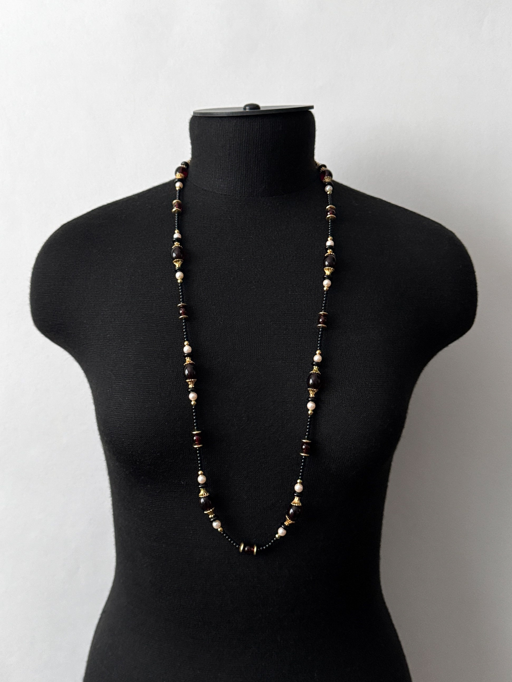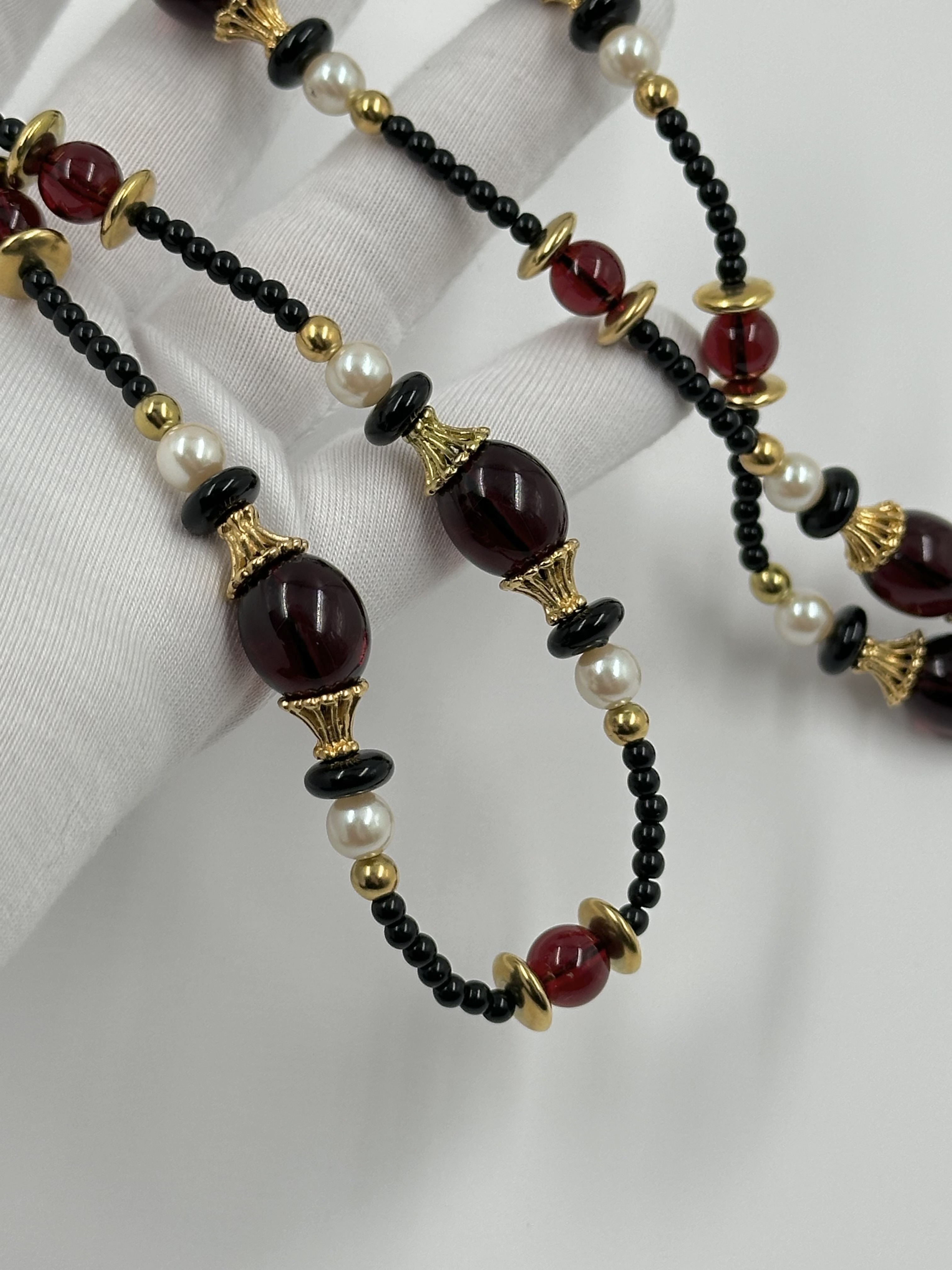 Бижутерный сплав, пластик, имитация жемчуга. Длина 88см.