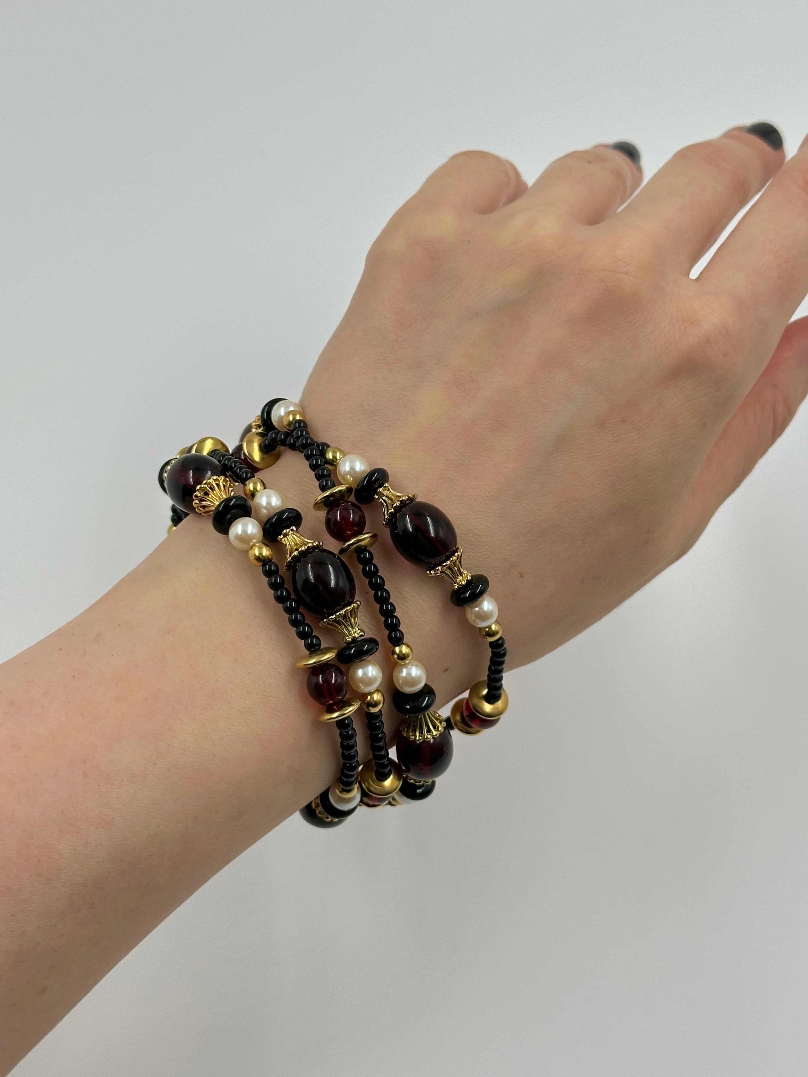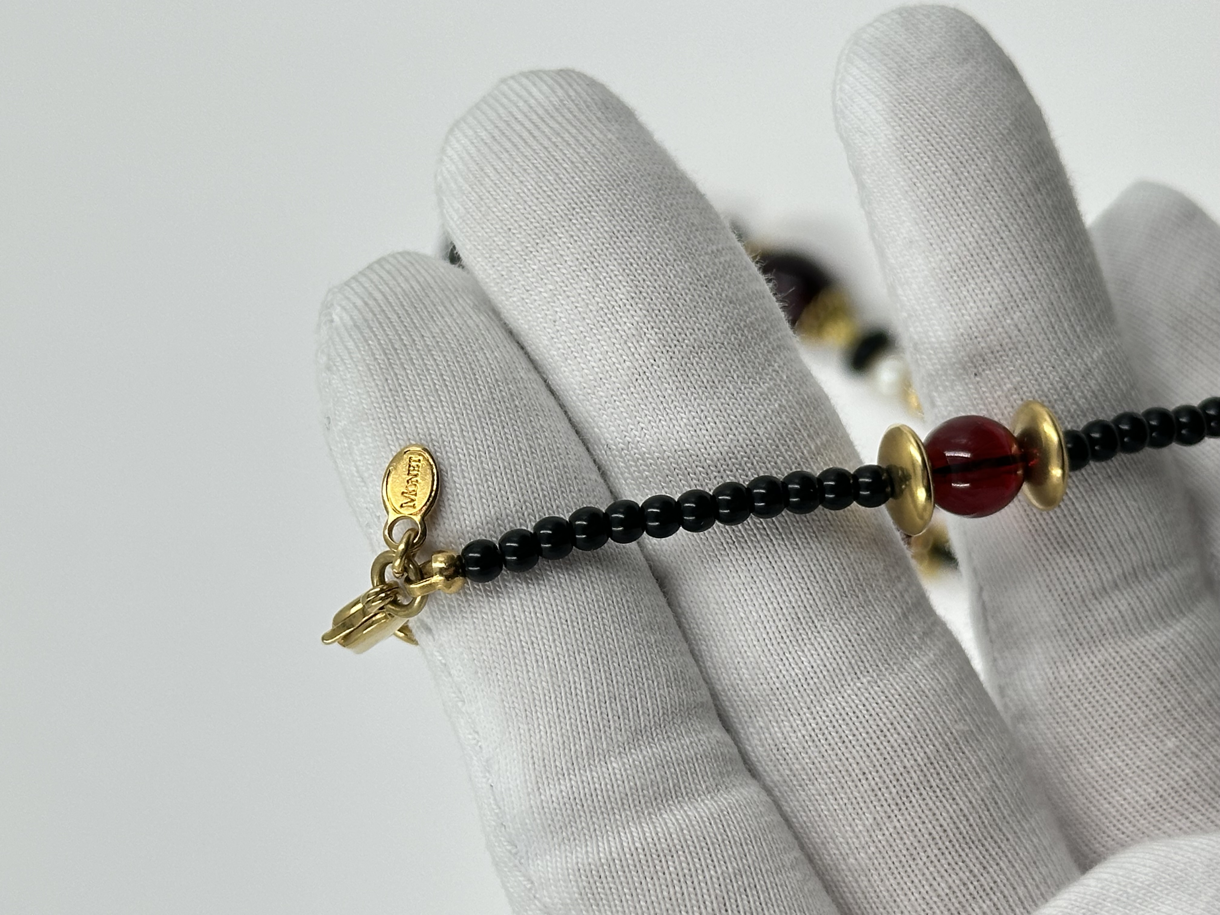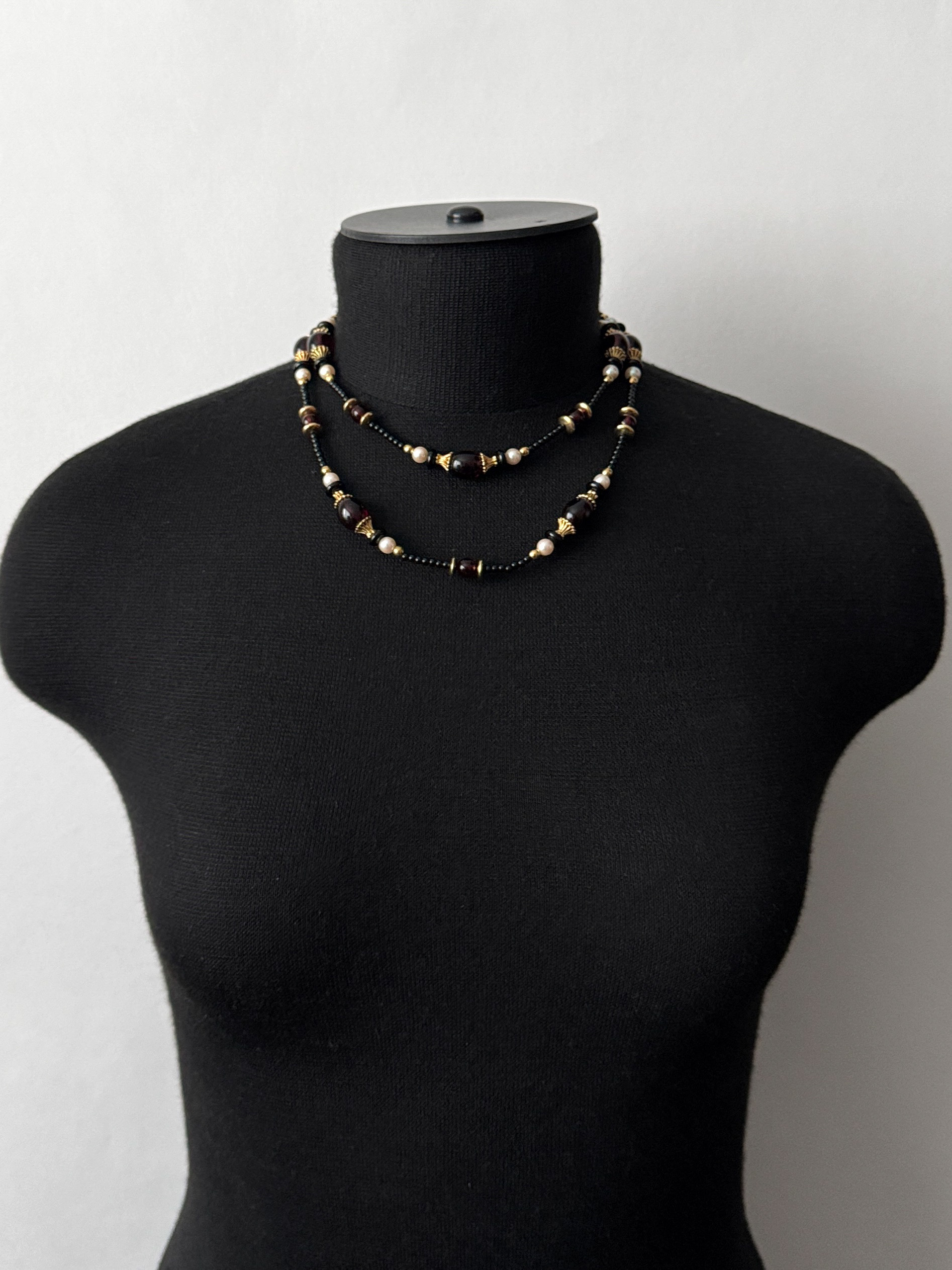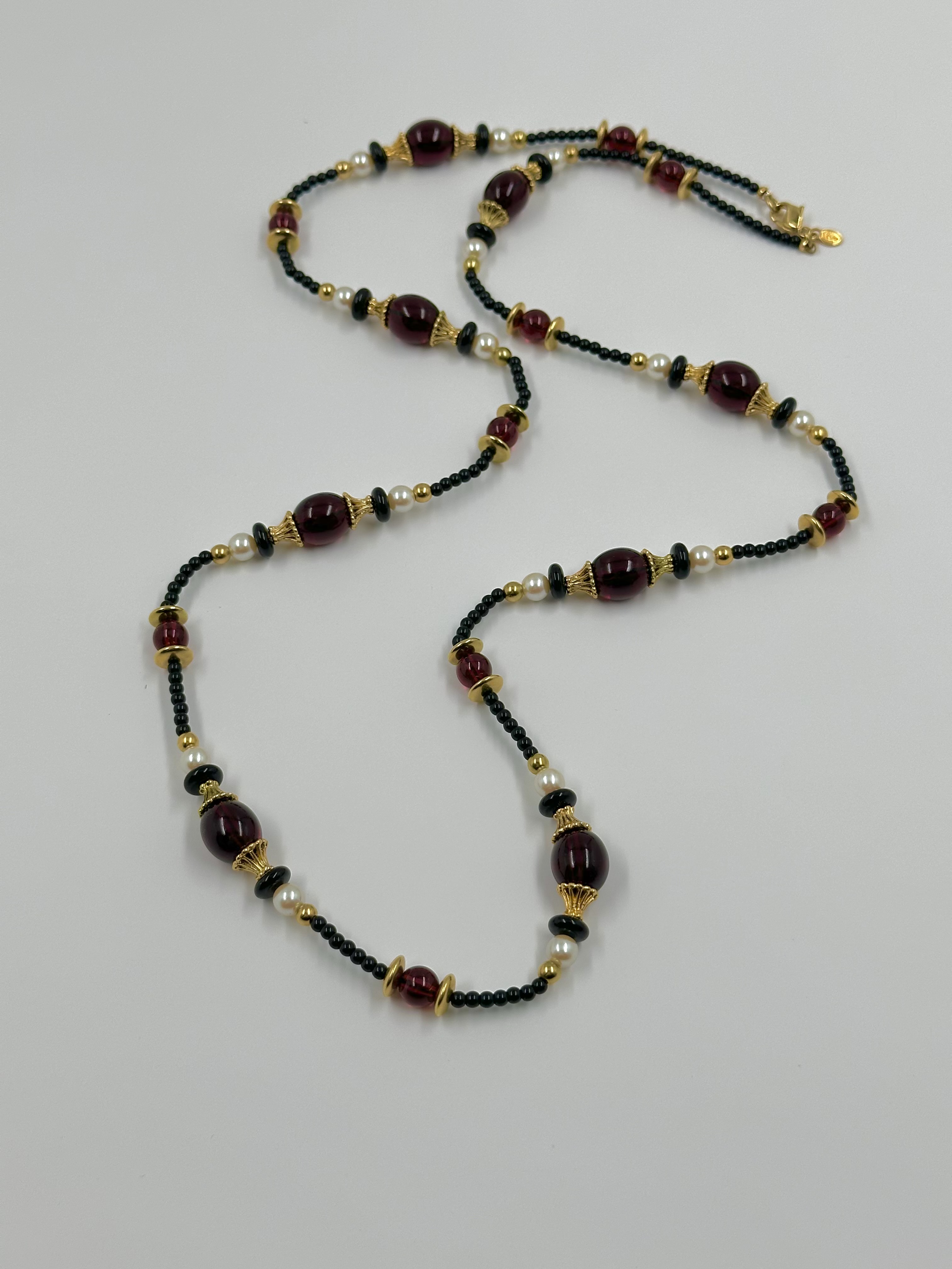 Бижутерный сплав, пластик, имитация жемчуга. Длина 88см.