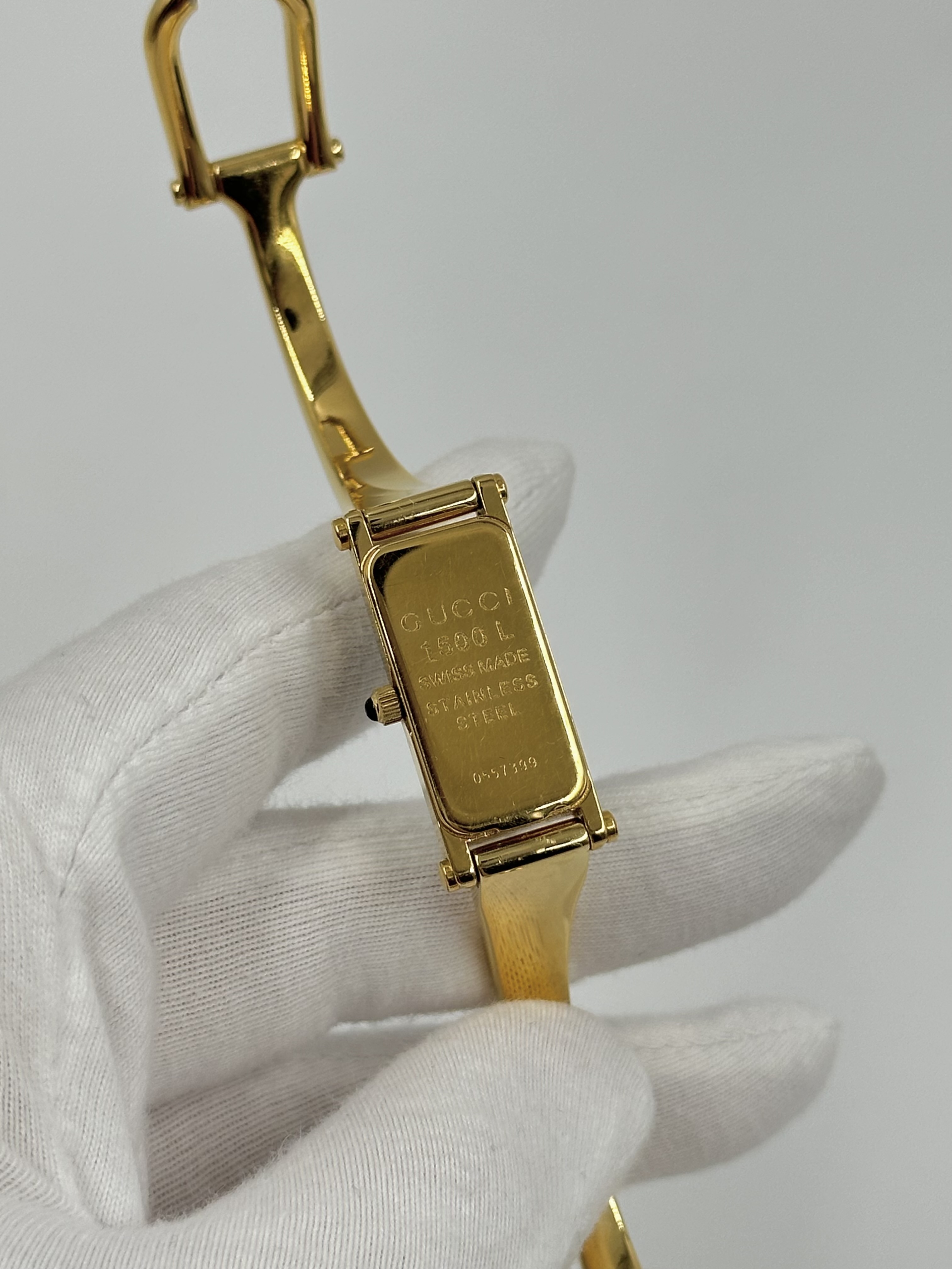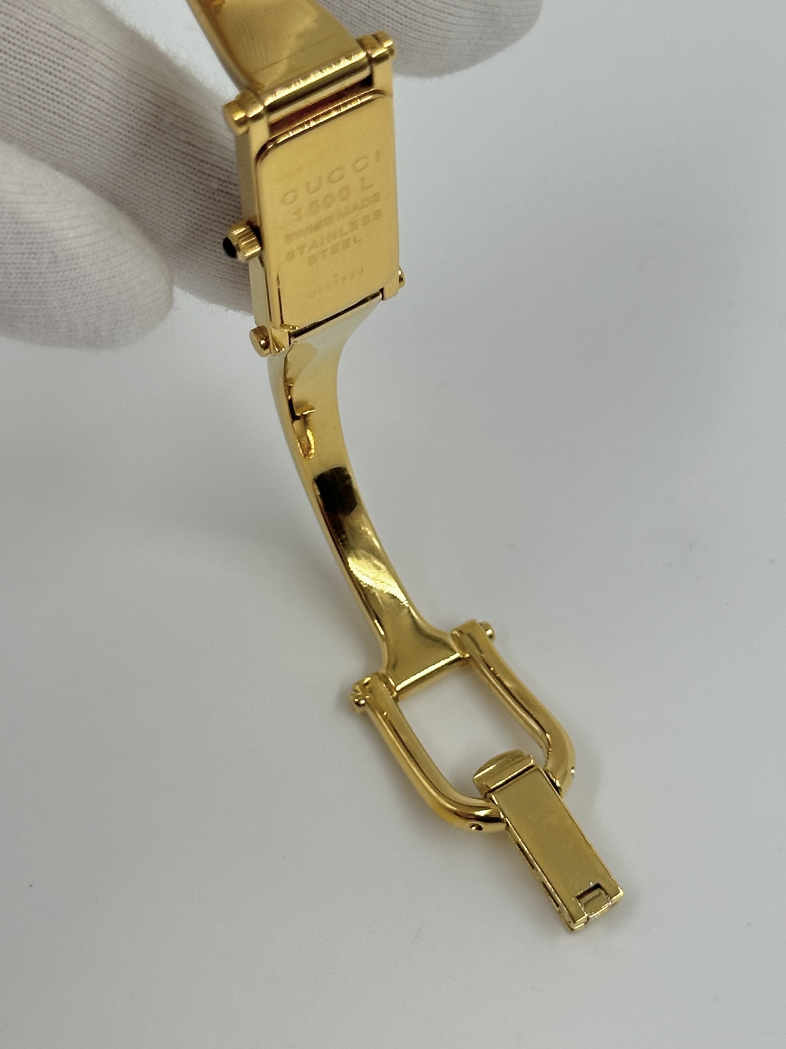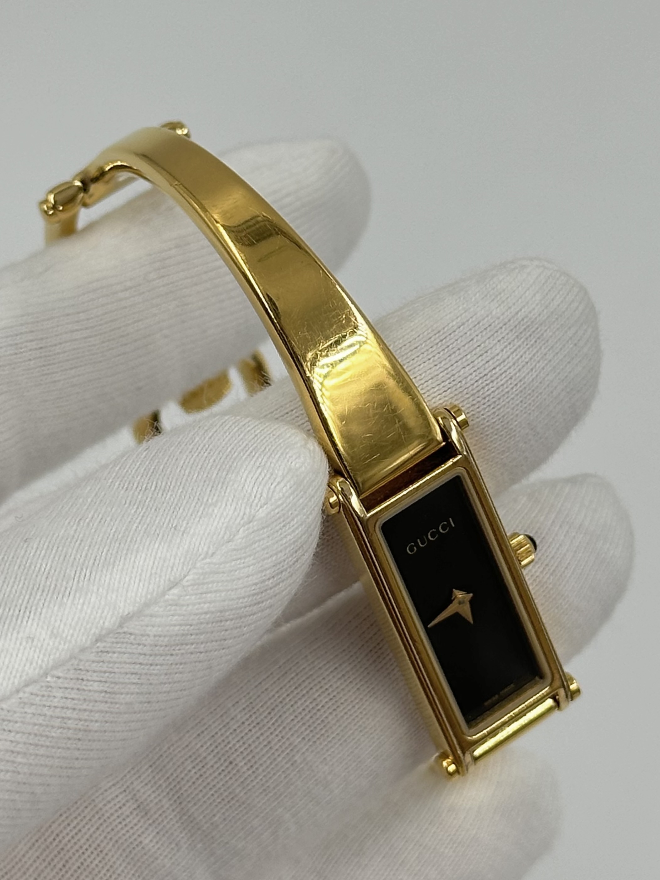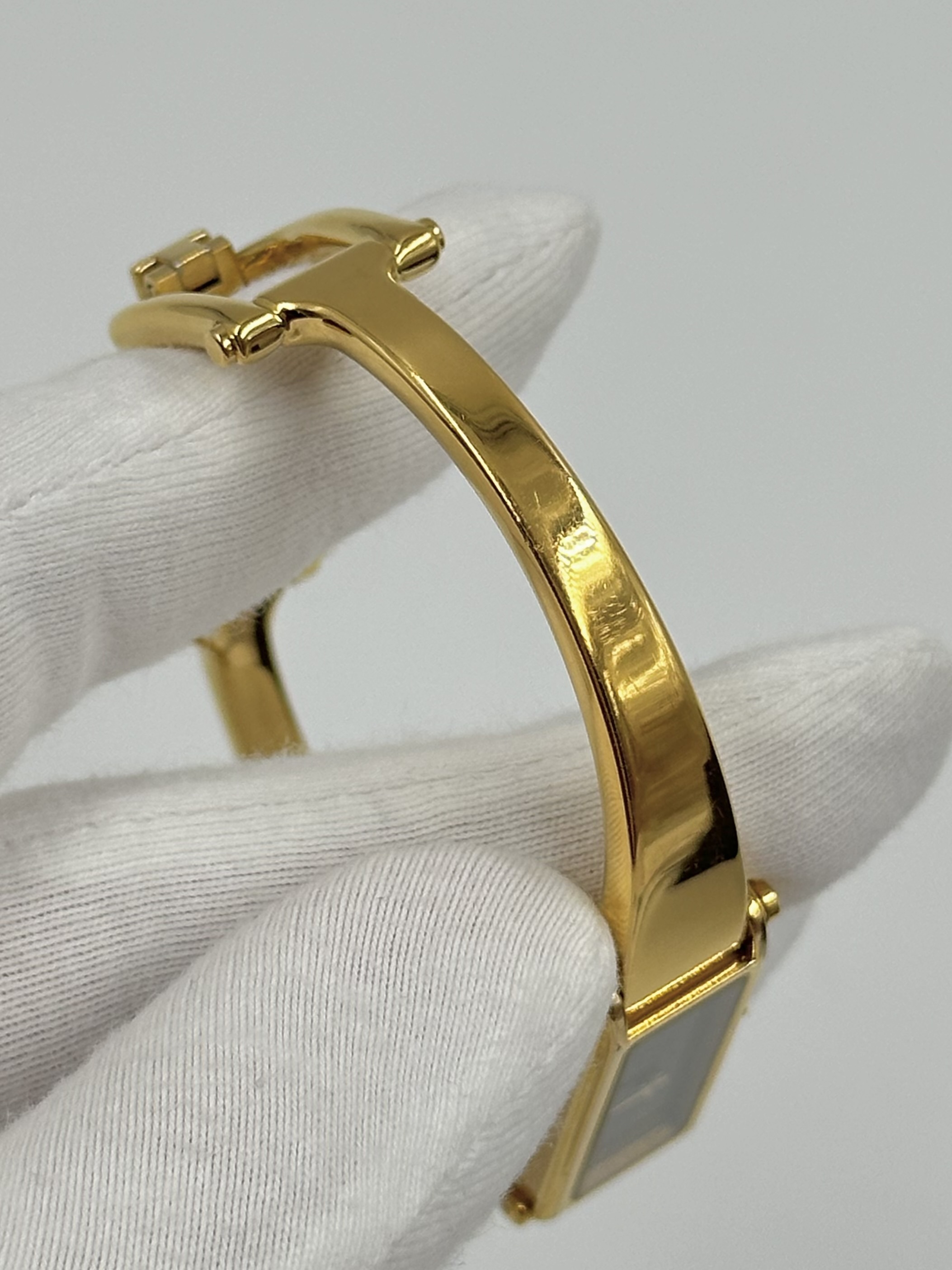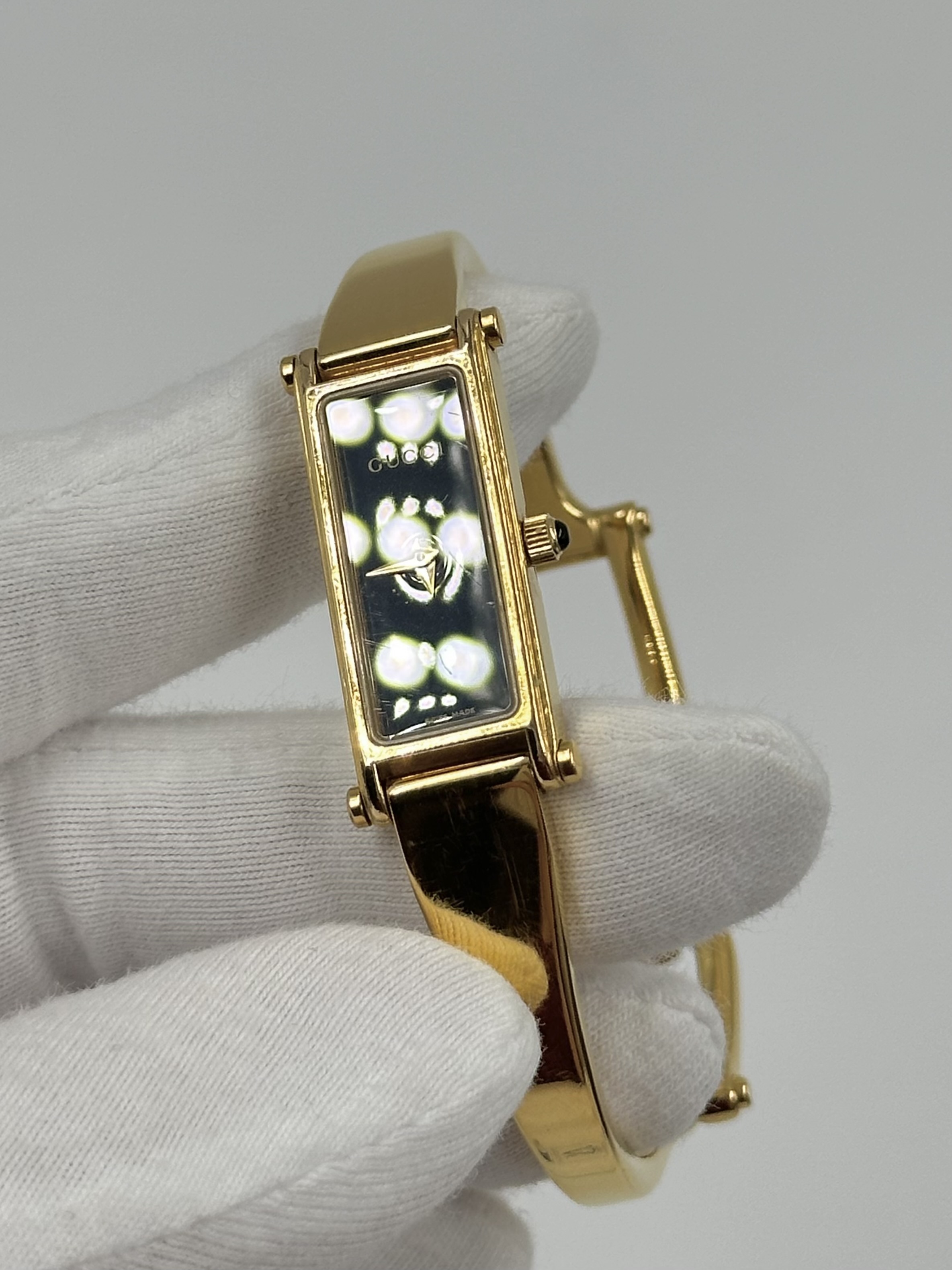 Стальной браслет с позолотой застегивается на 16 и 16,5см. На браслете и стекле присутствуют царапины.