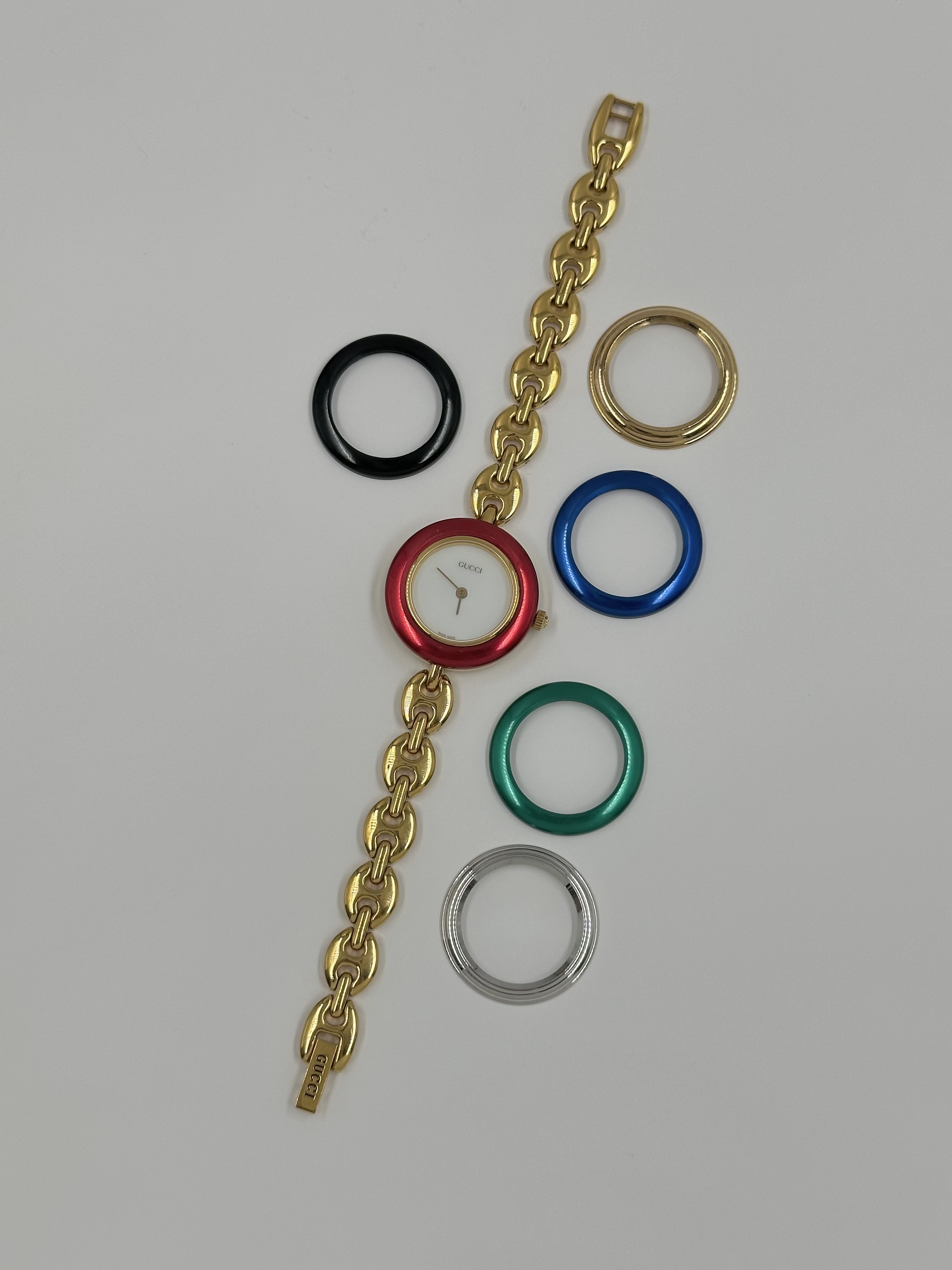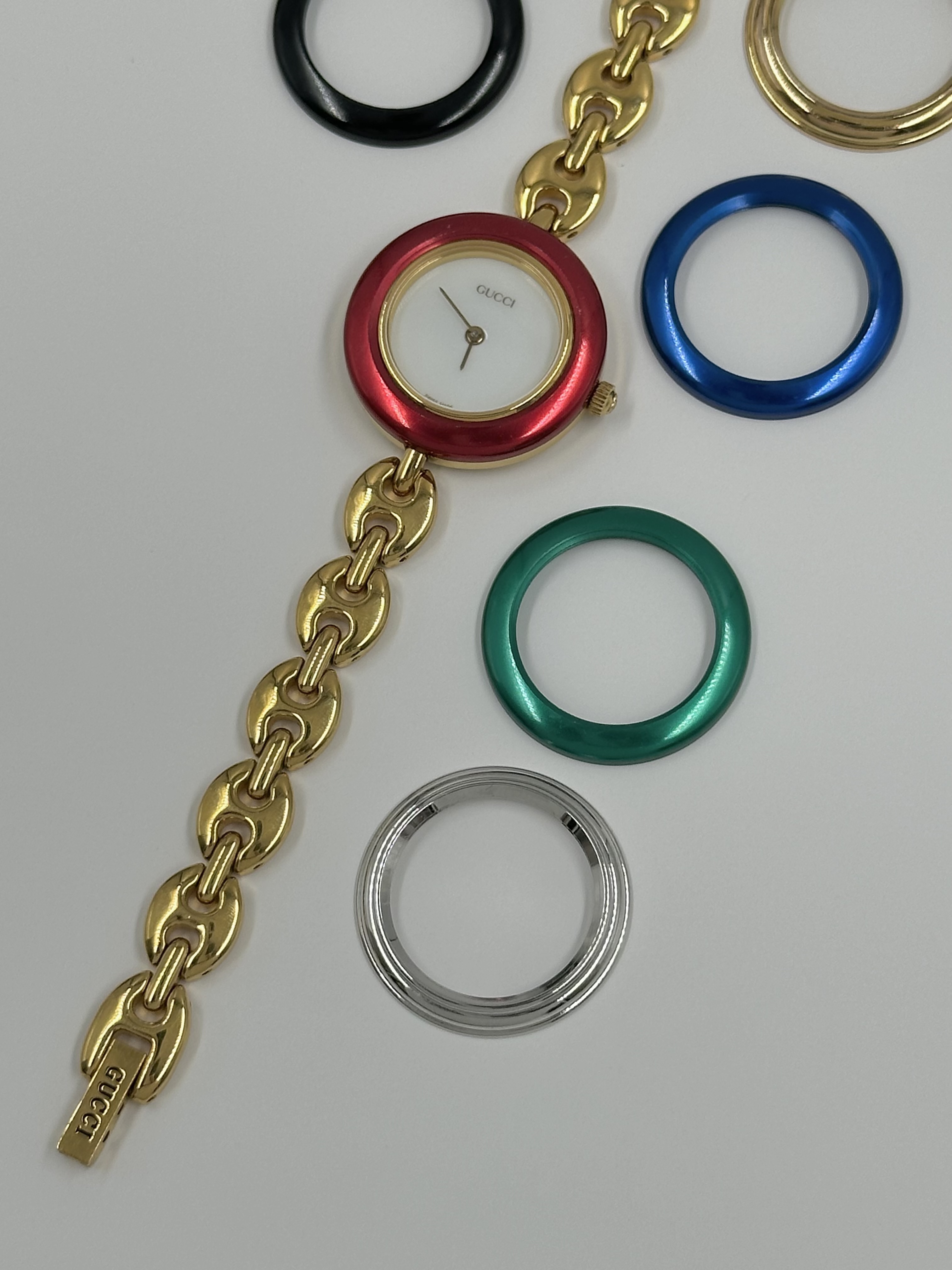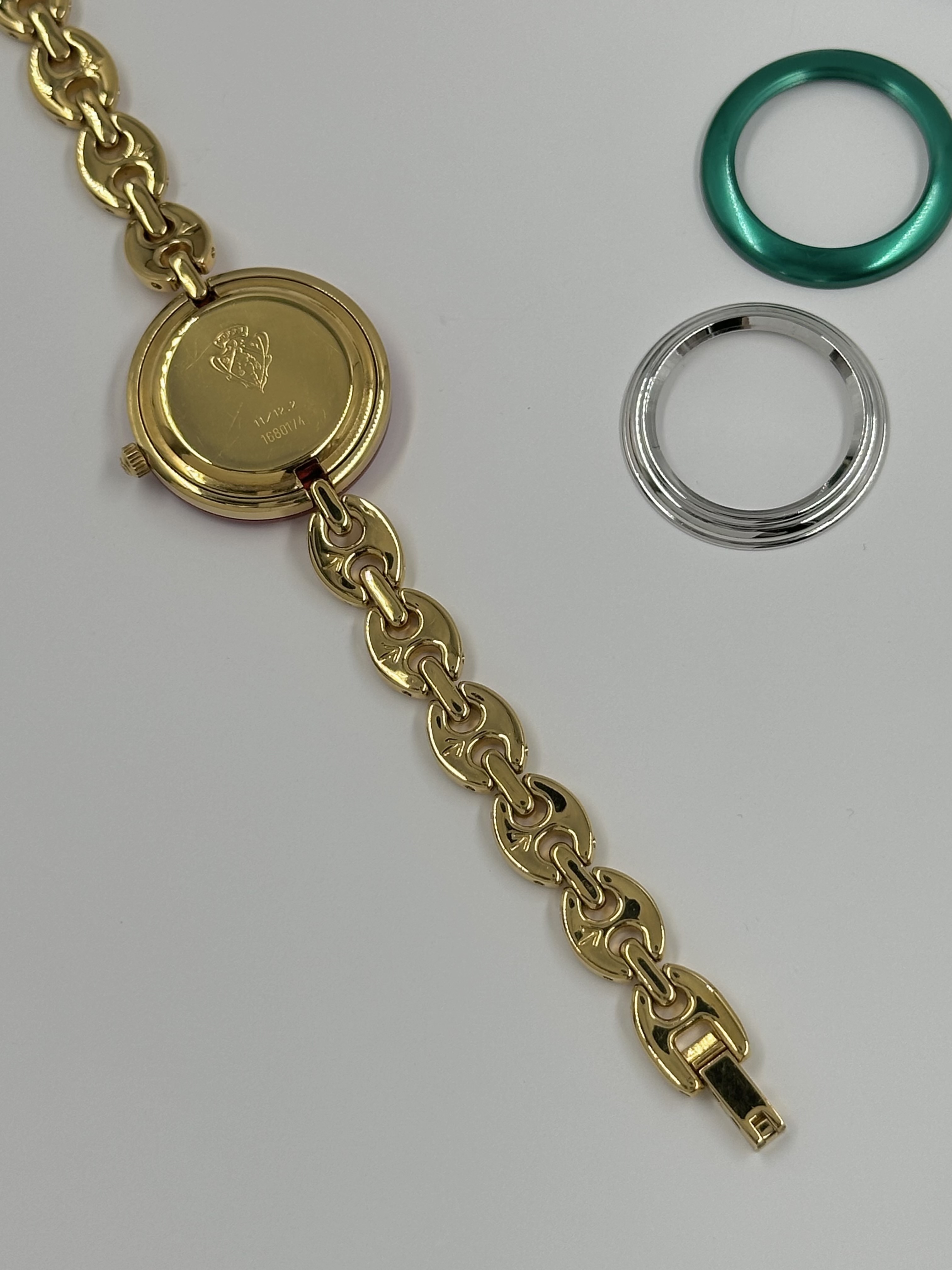 Присутствуют сходы покрытия на красном кольце, небольшое потемнение на золотом. Чёрное кольцо - пластик , остальные - металл.
