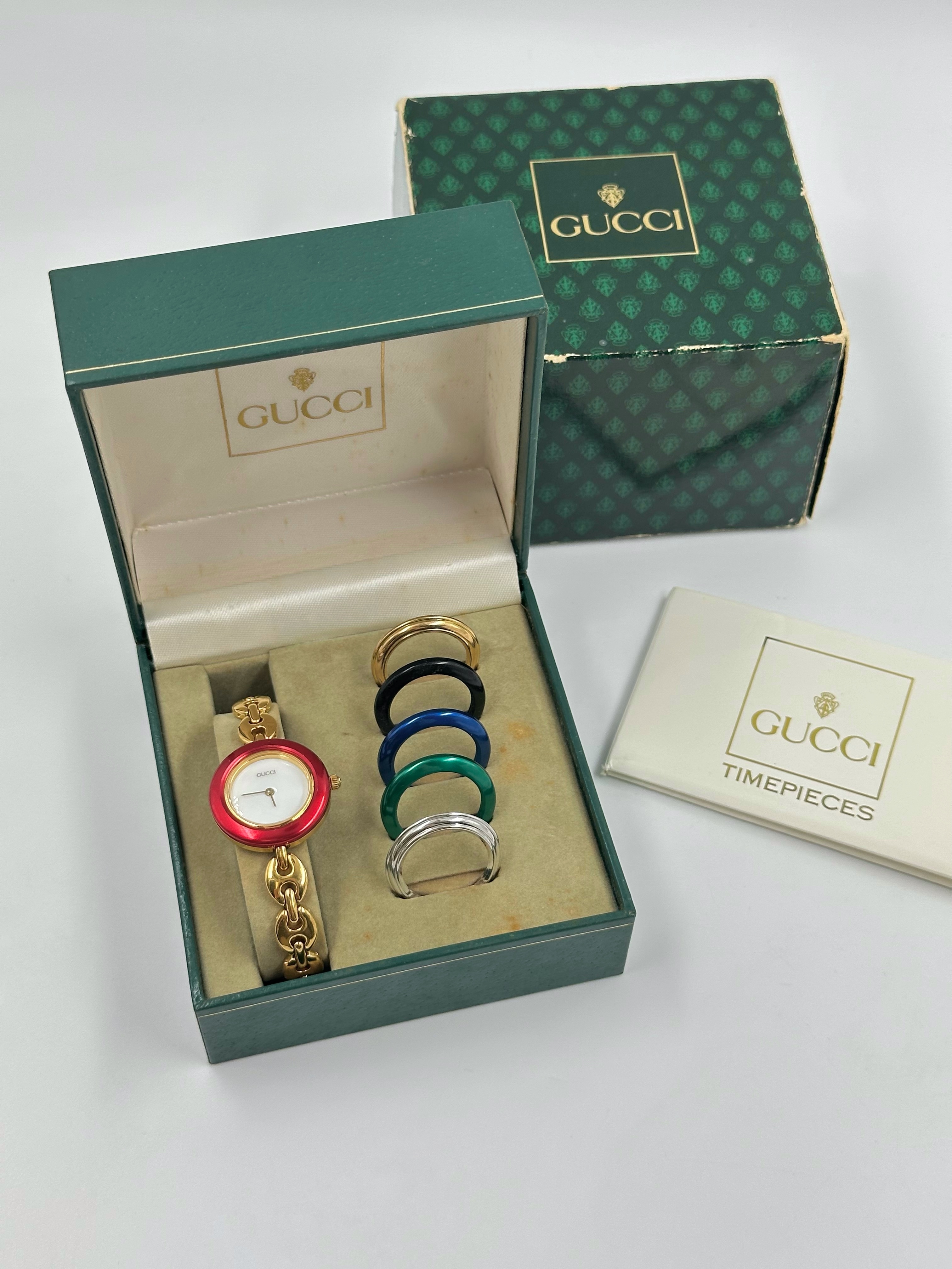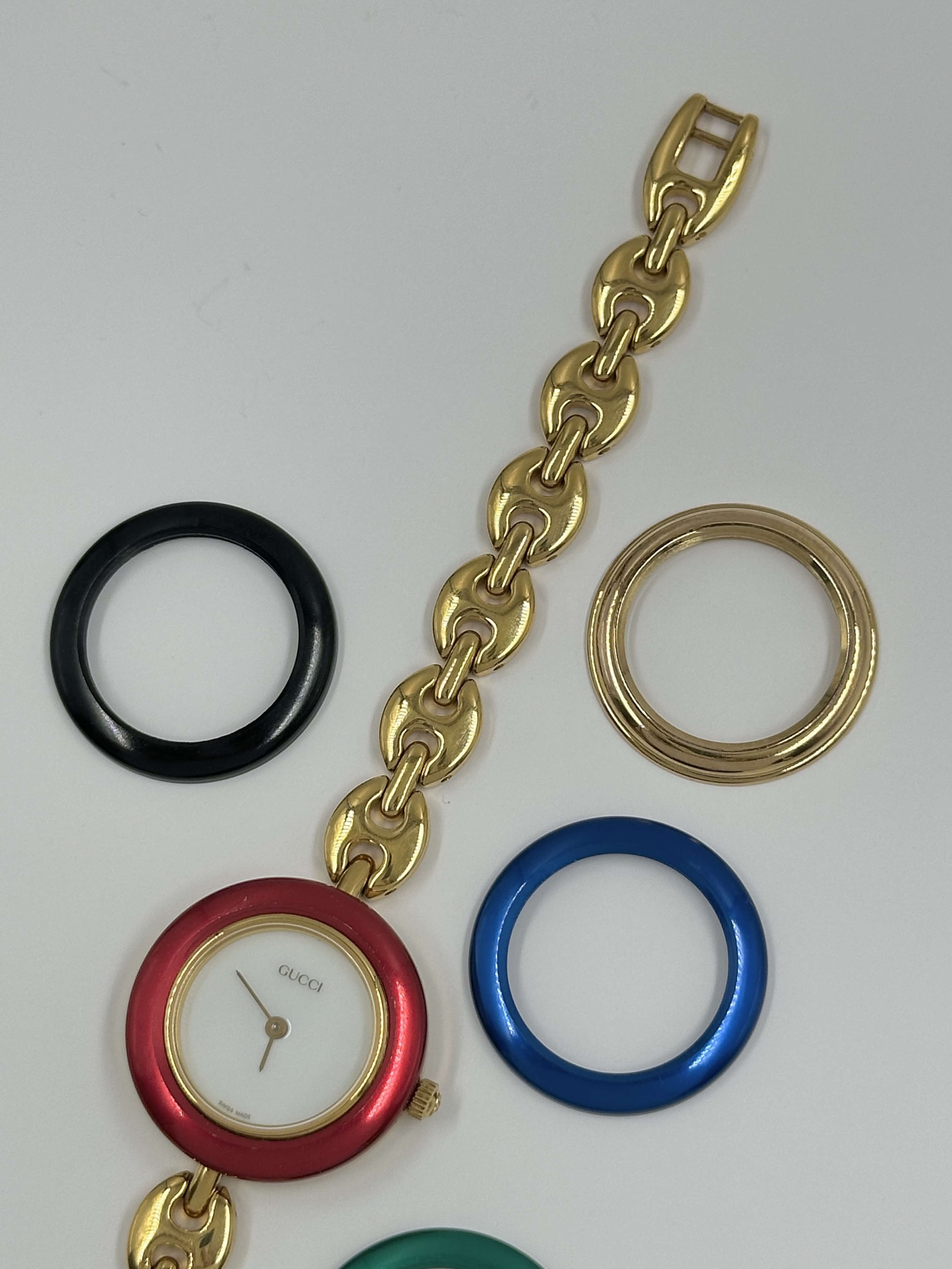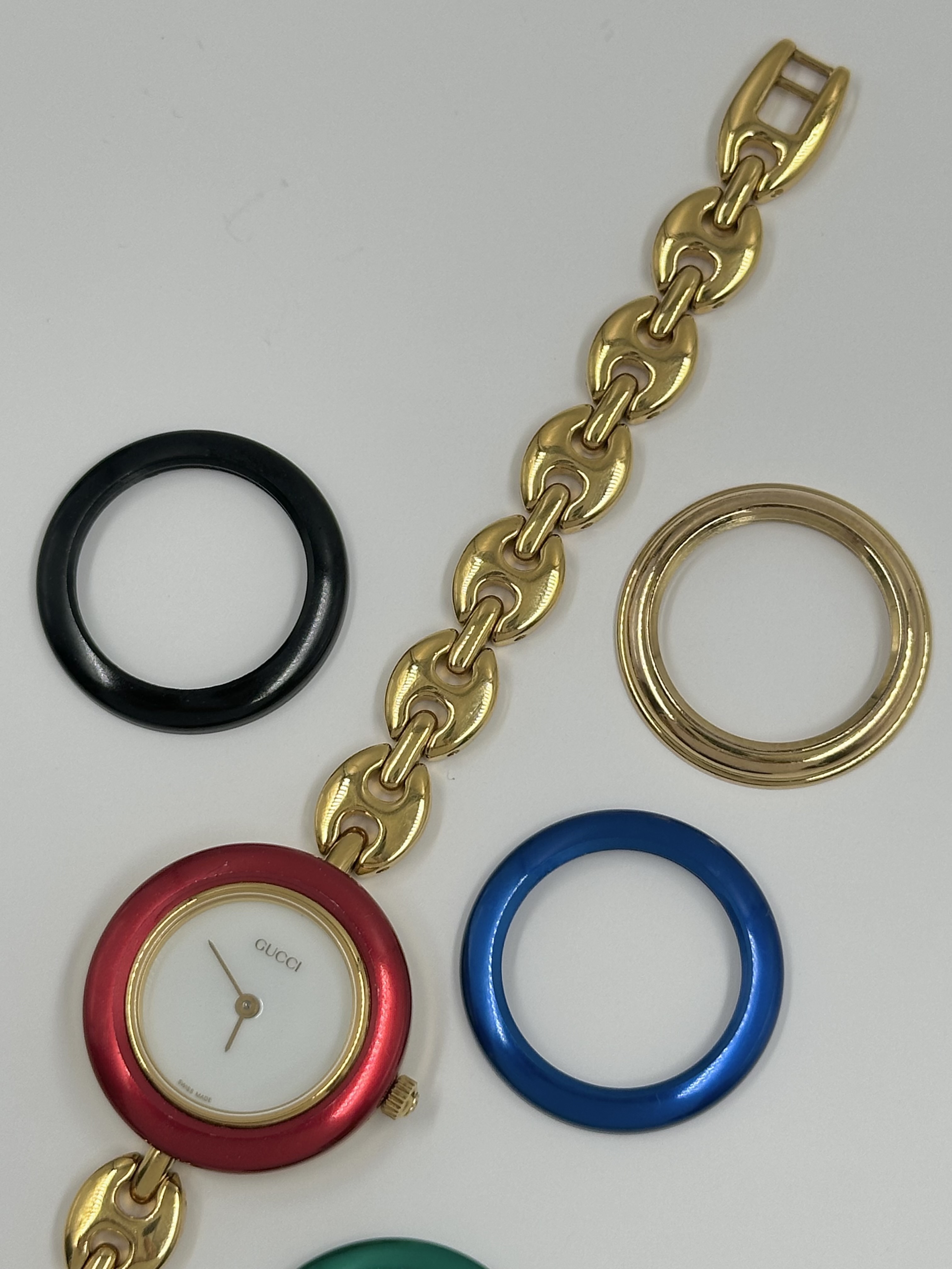 Присутствуют сходы покрытия на красном кольце, небольшое потемнение на золотом. Чёрное кольцо - пластик , остальные - металл.
