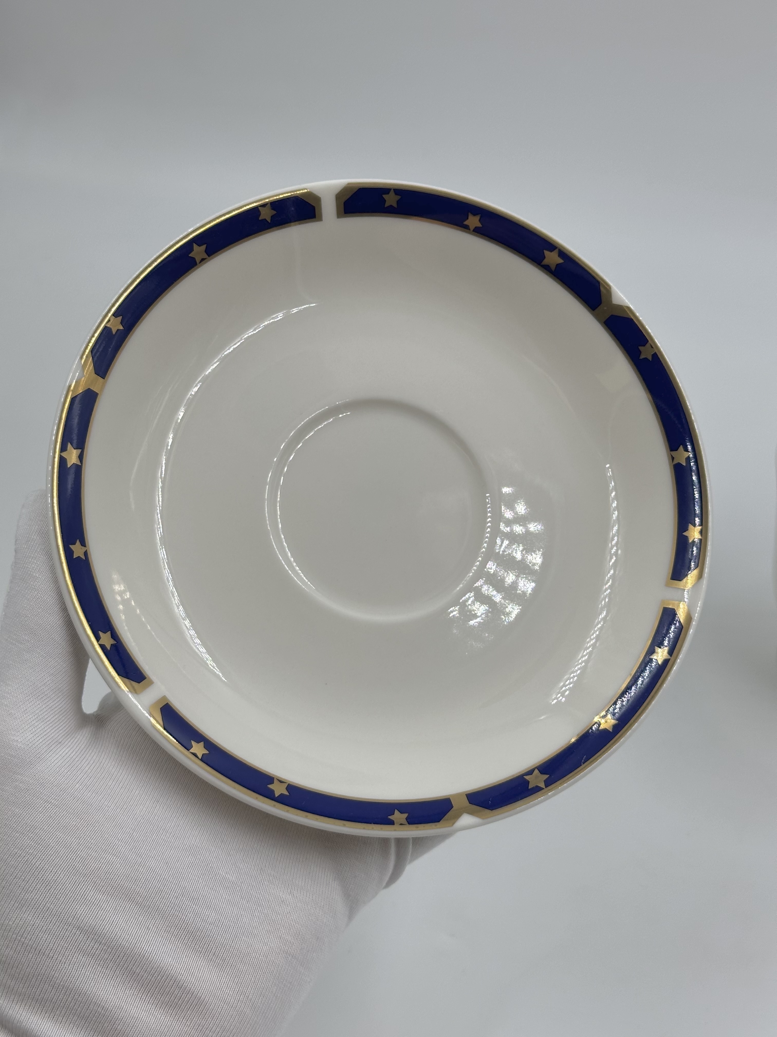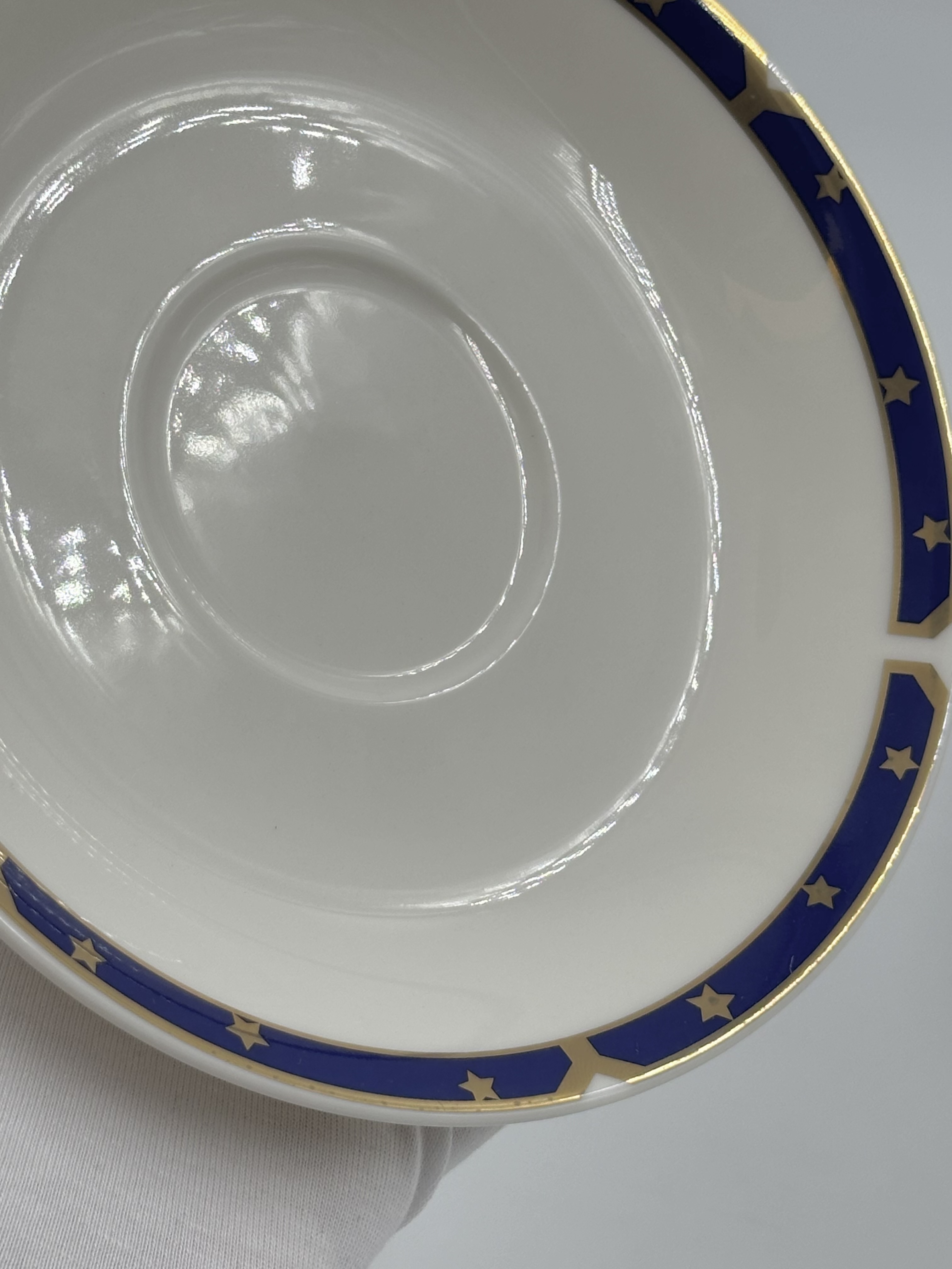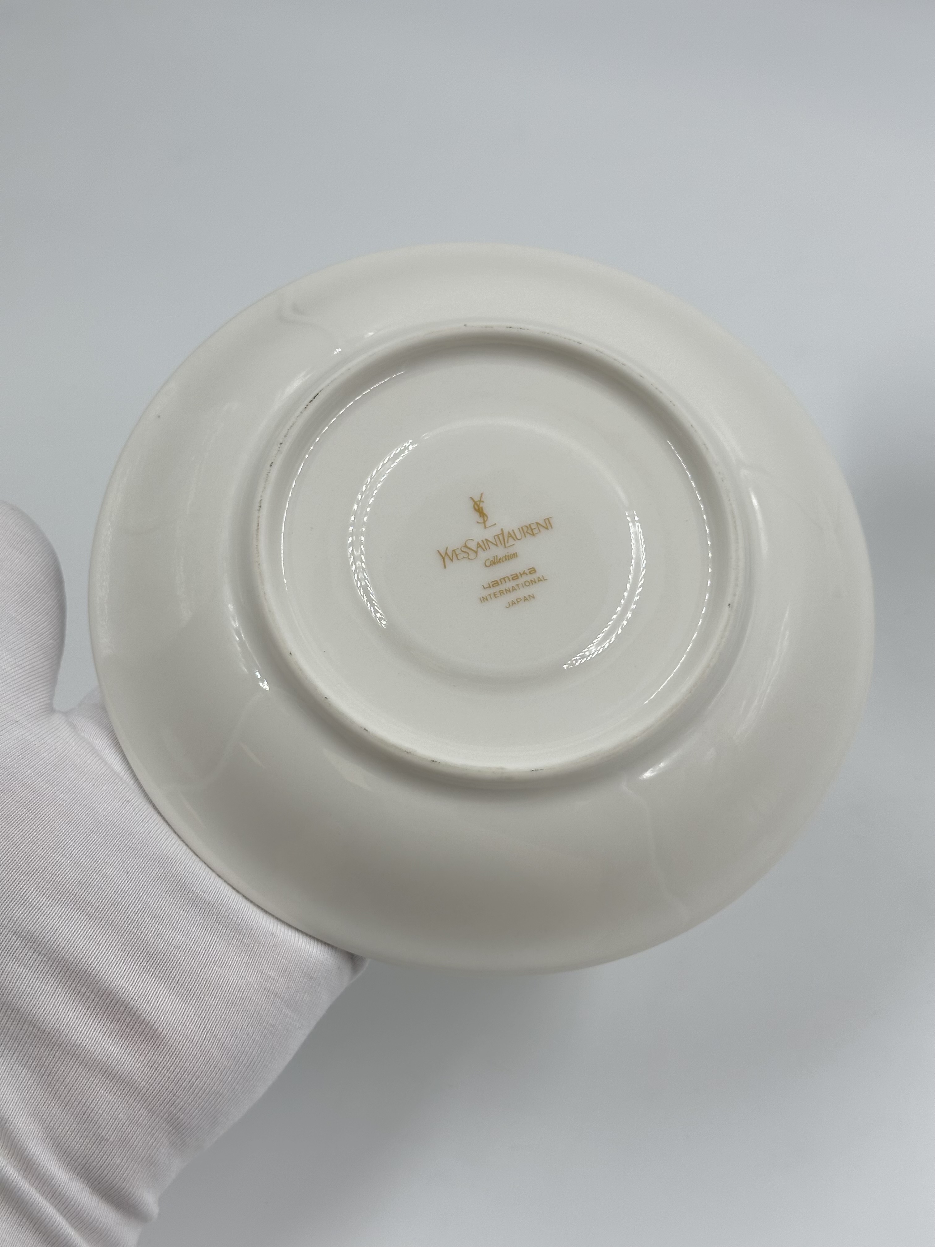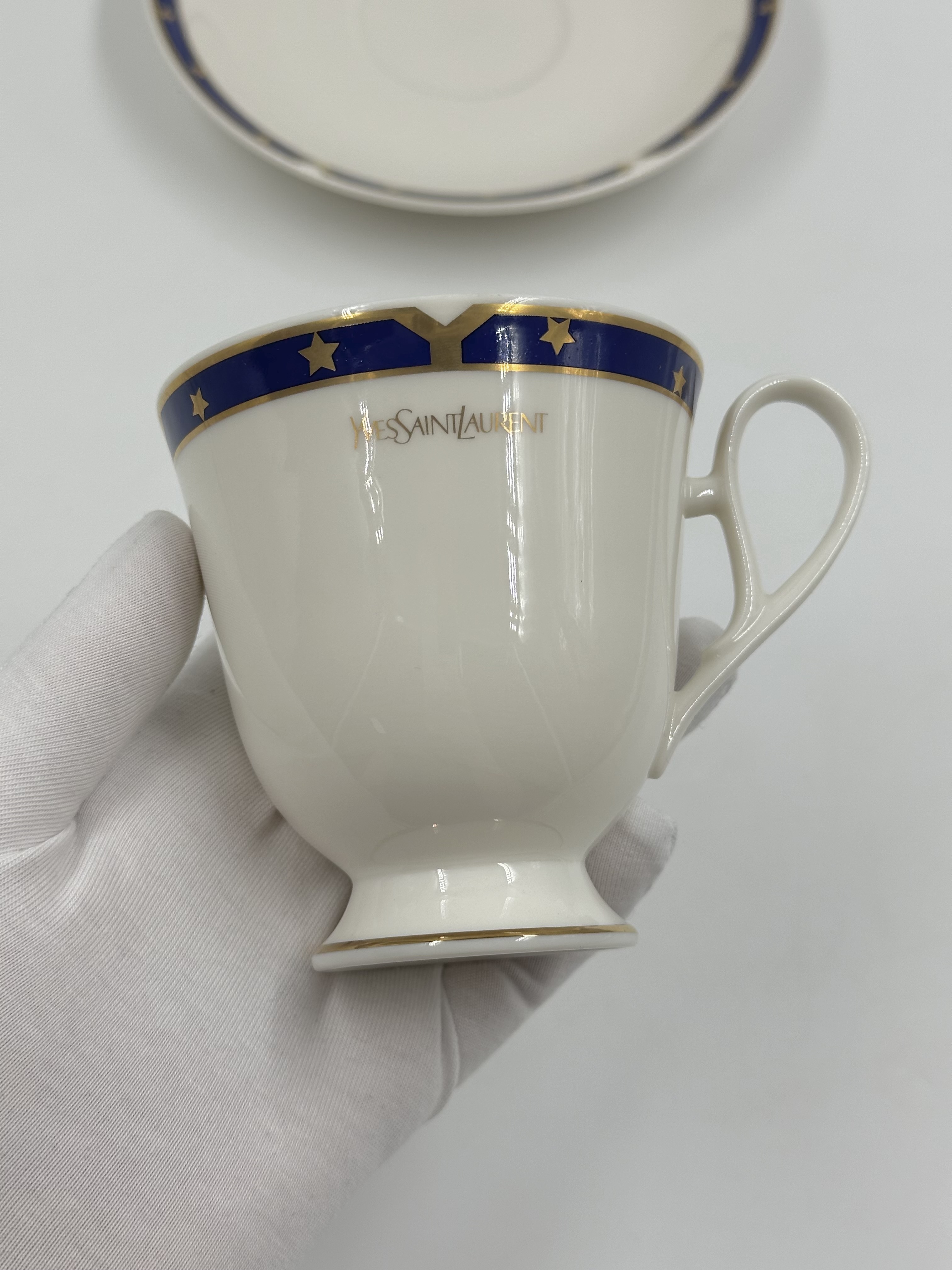 Фарфор. На чашке присутствует трещина, воду не пропускает. Диаметр блюдца 15,3см. Объём чашки 200мл.