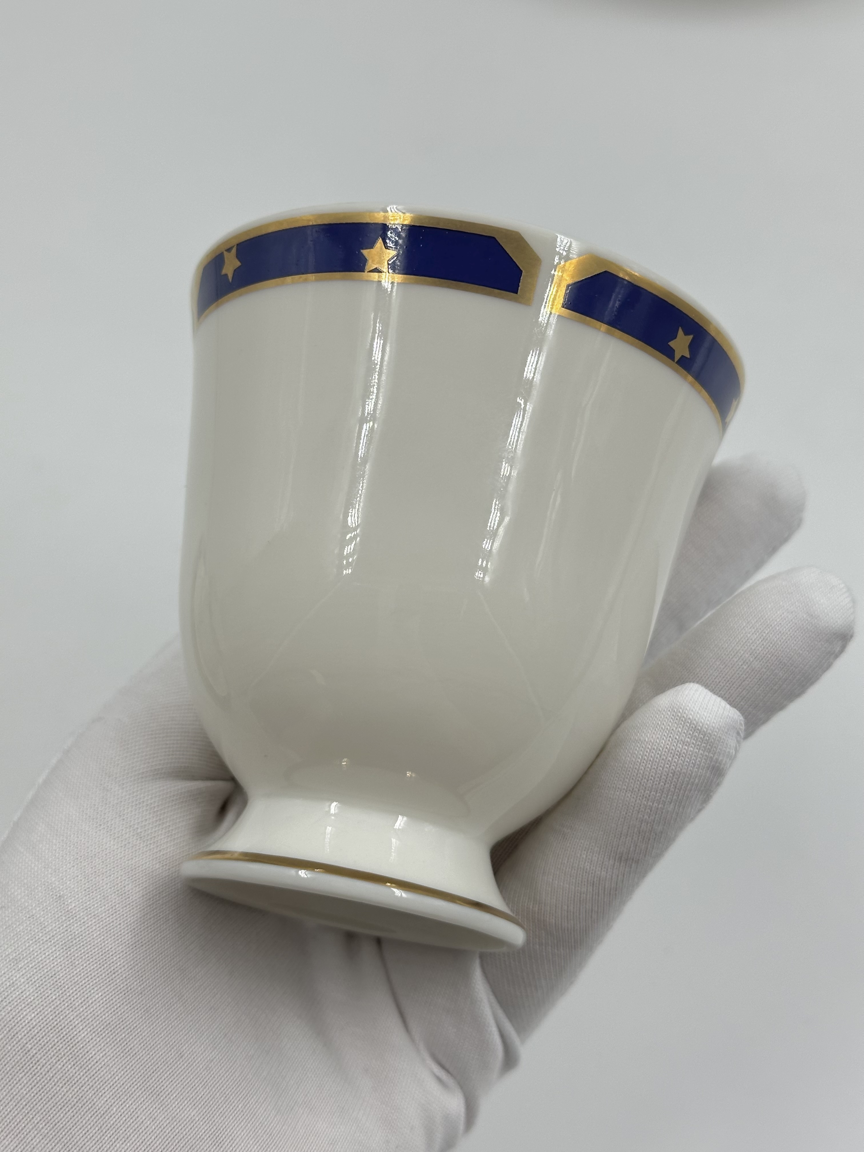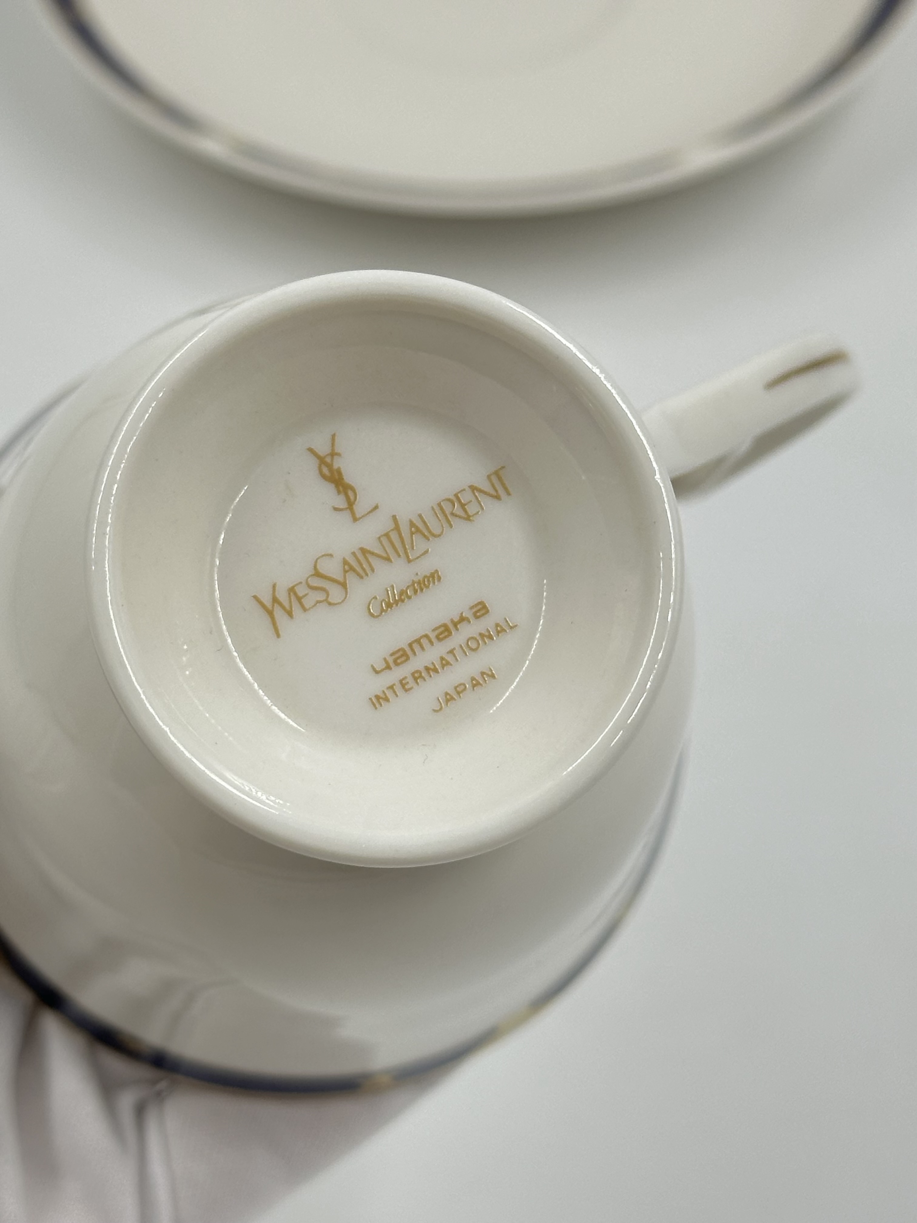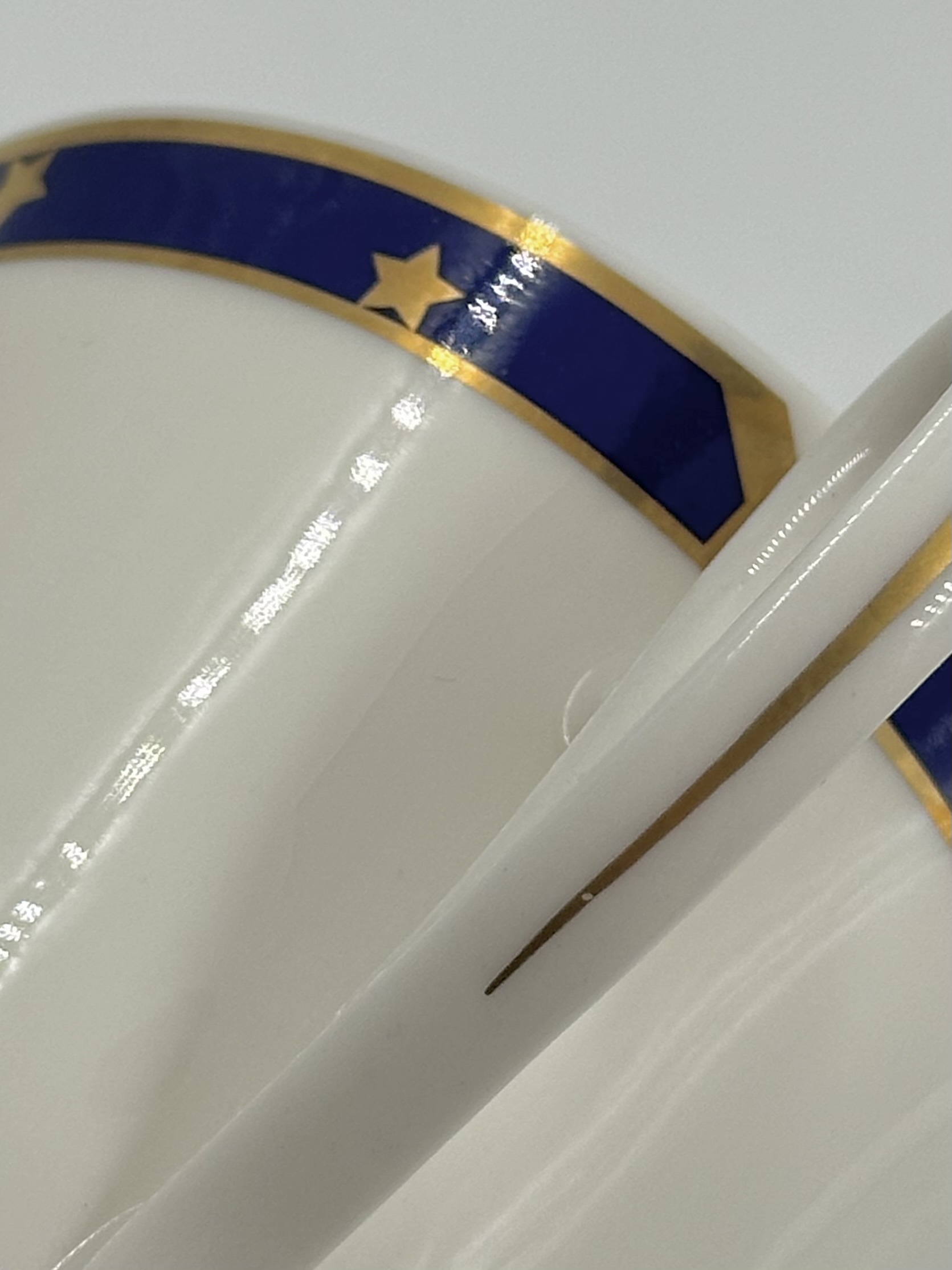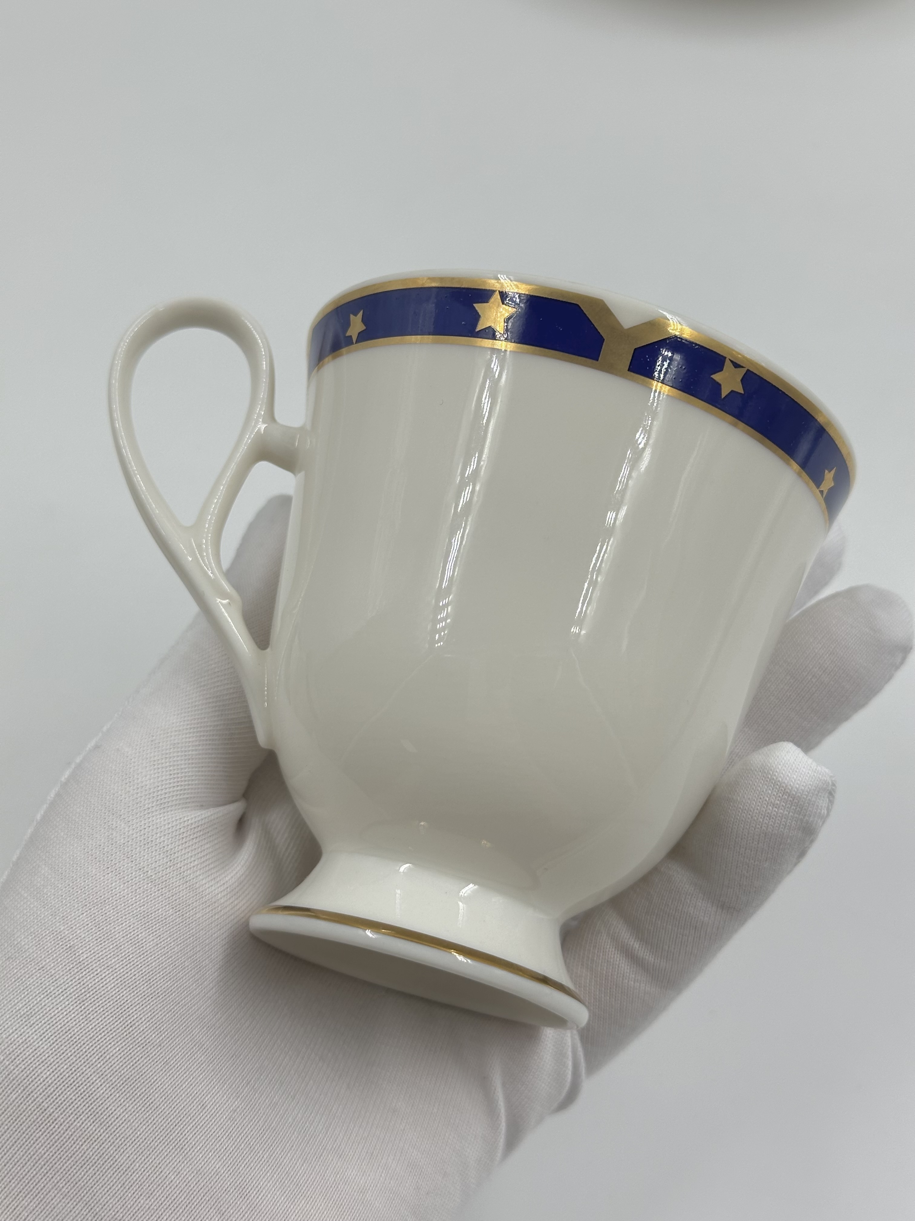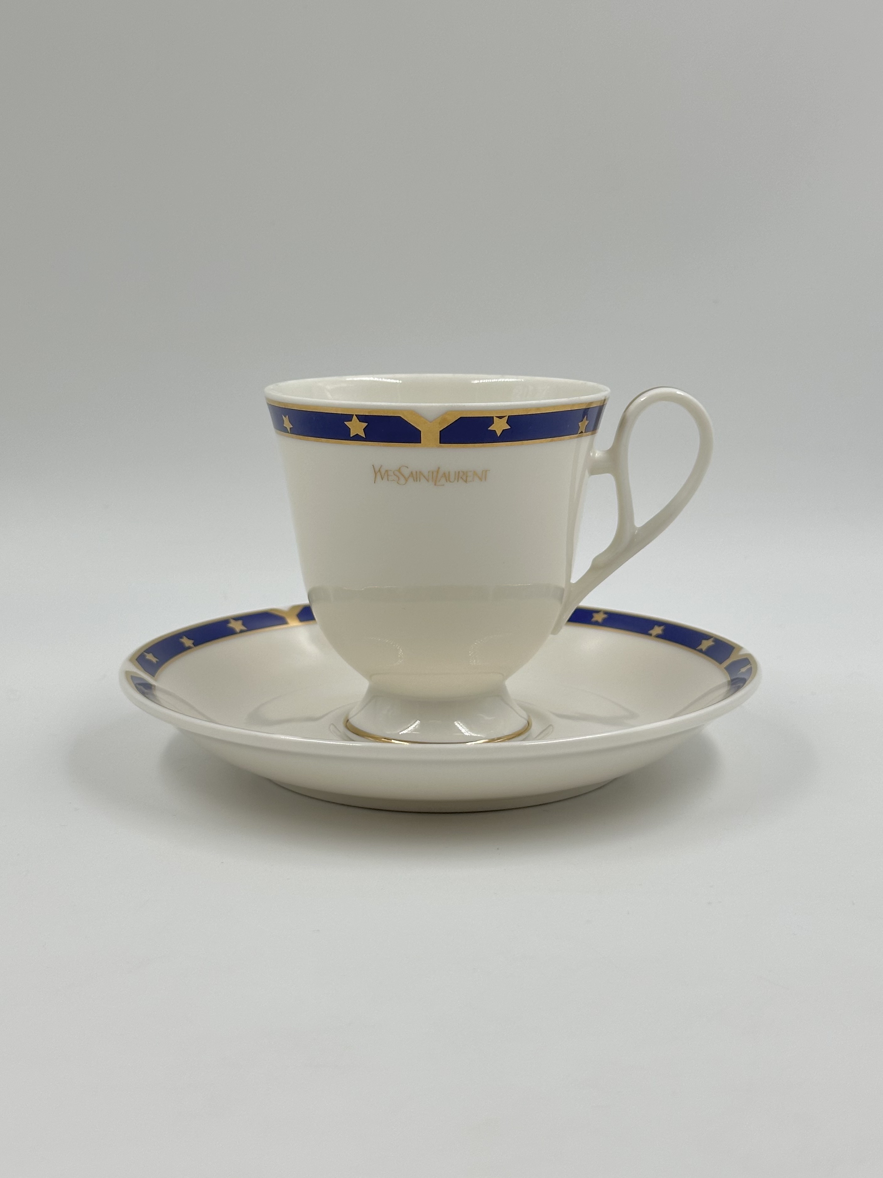 Фарфор. На чашке присутствует трещина, воду не пропускает. Диаметр блюдца 15,3см. Объём чашки 200мл.