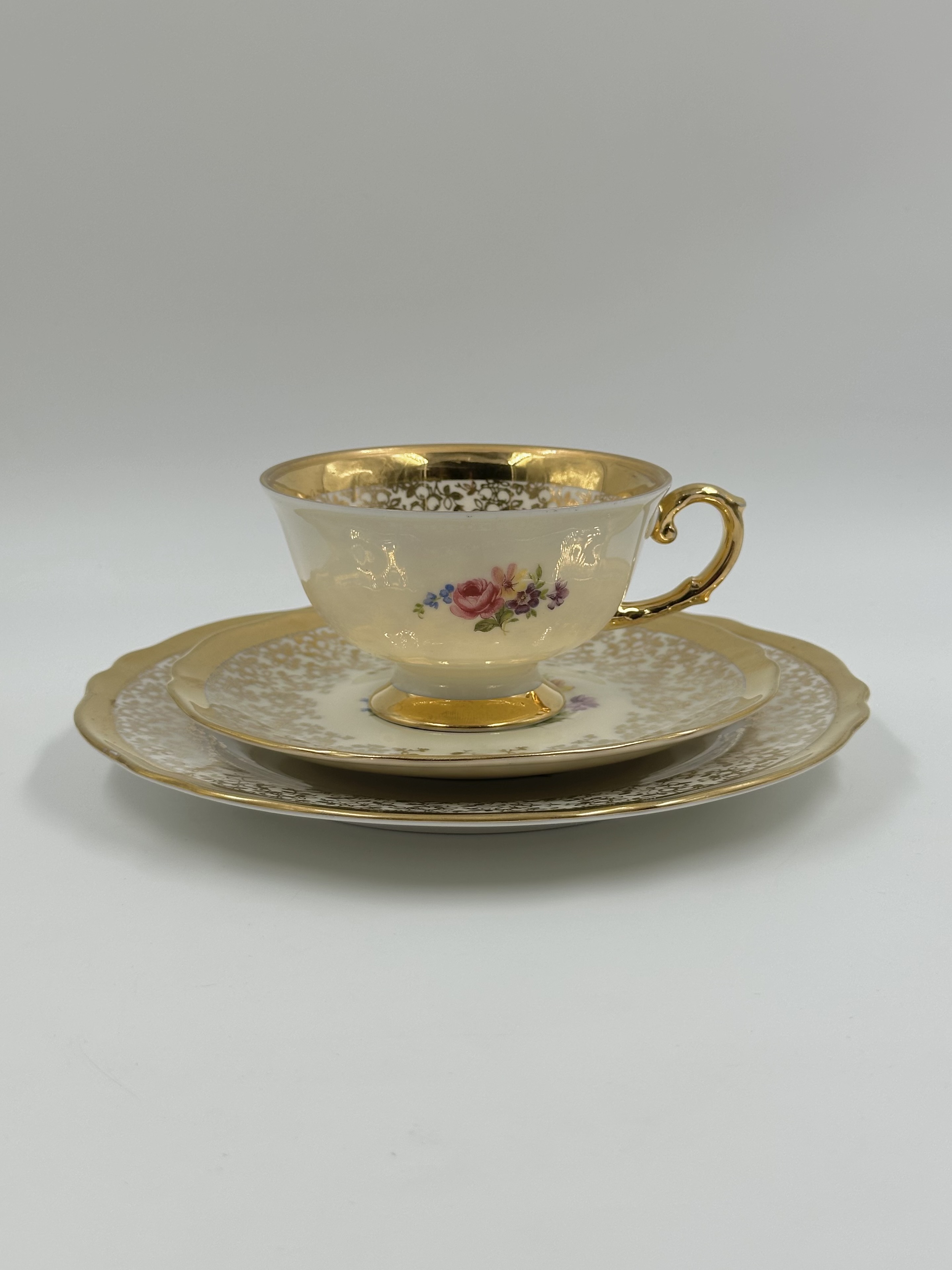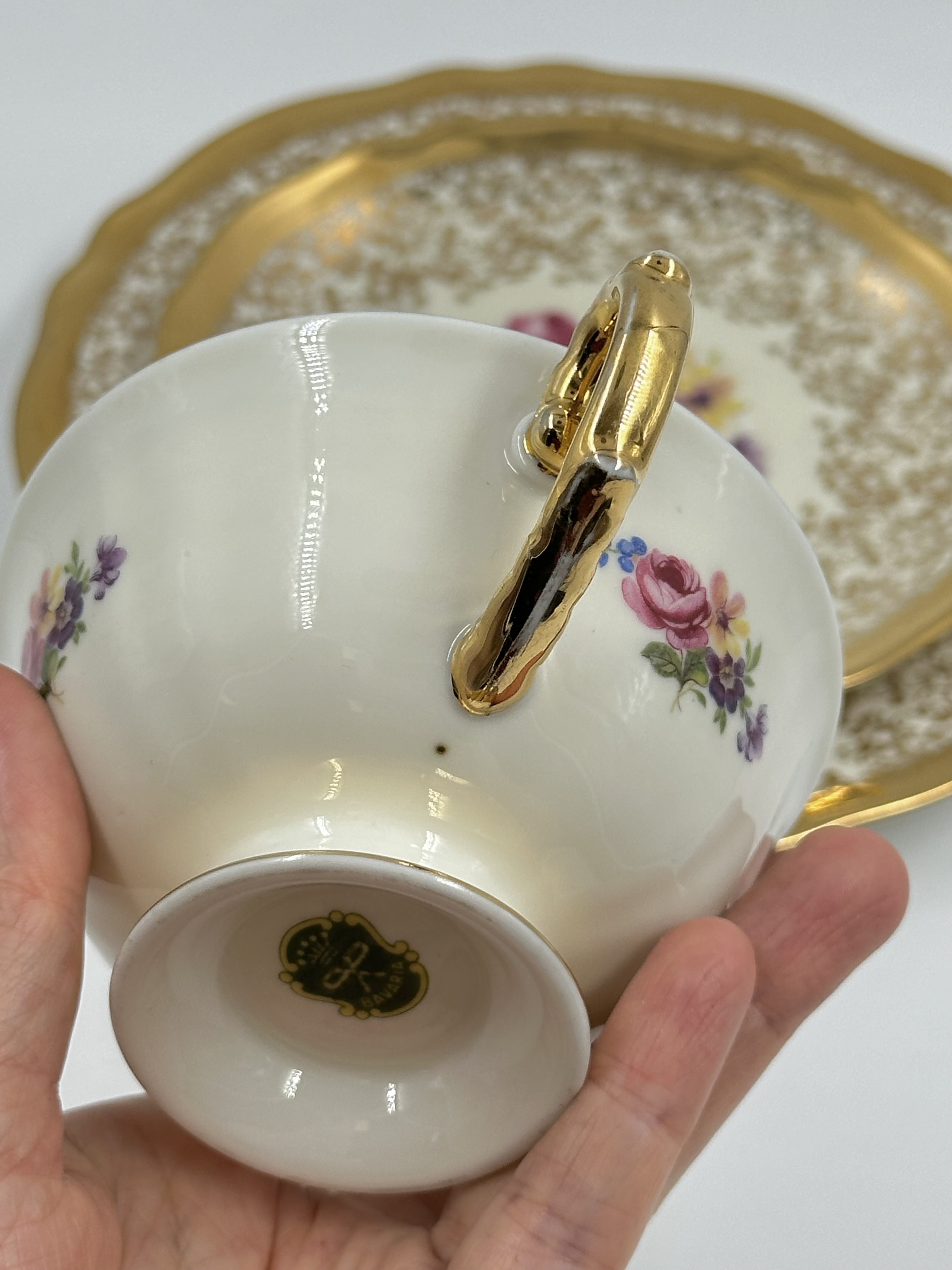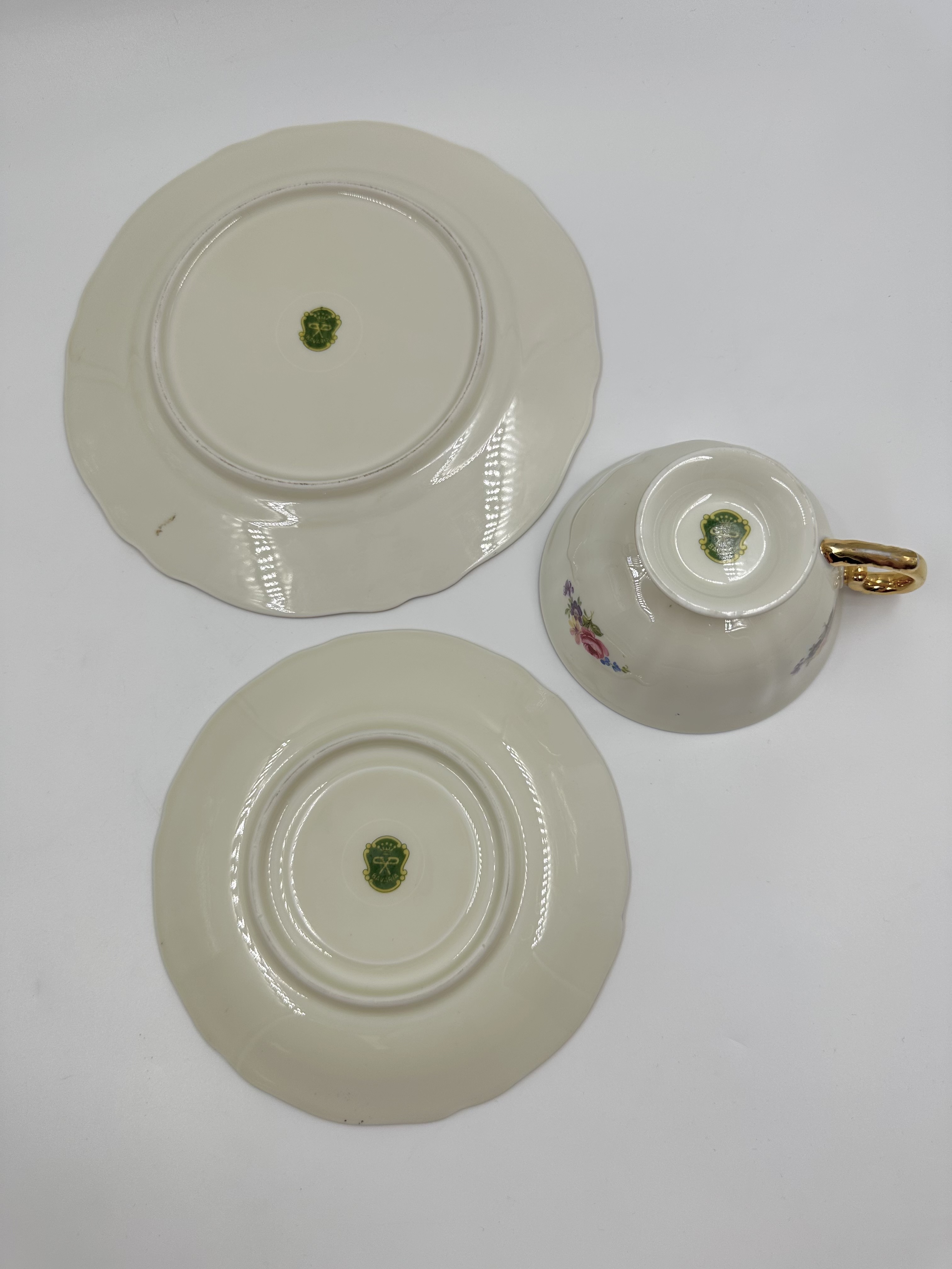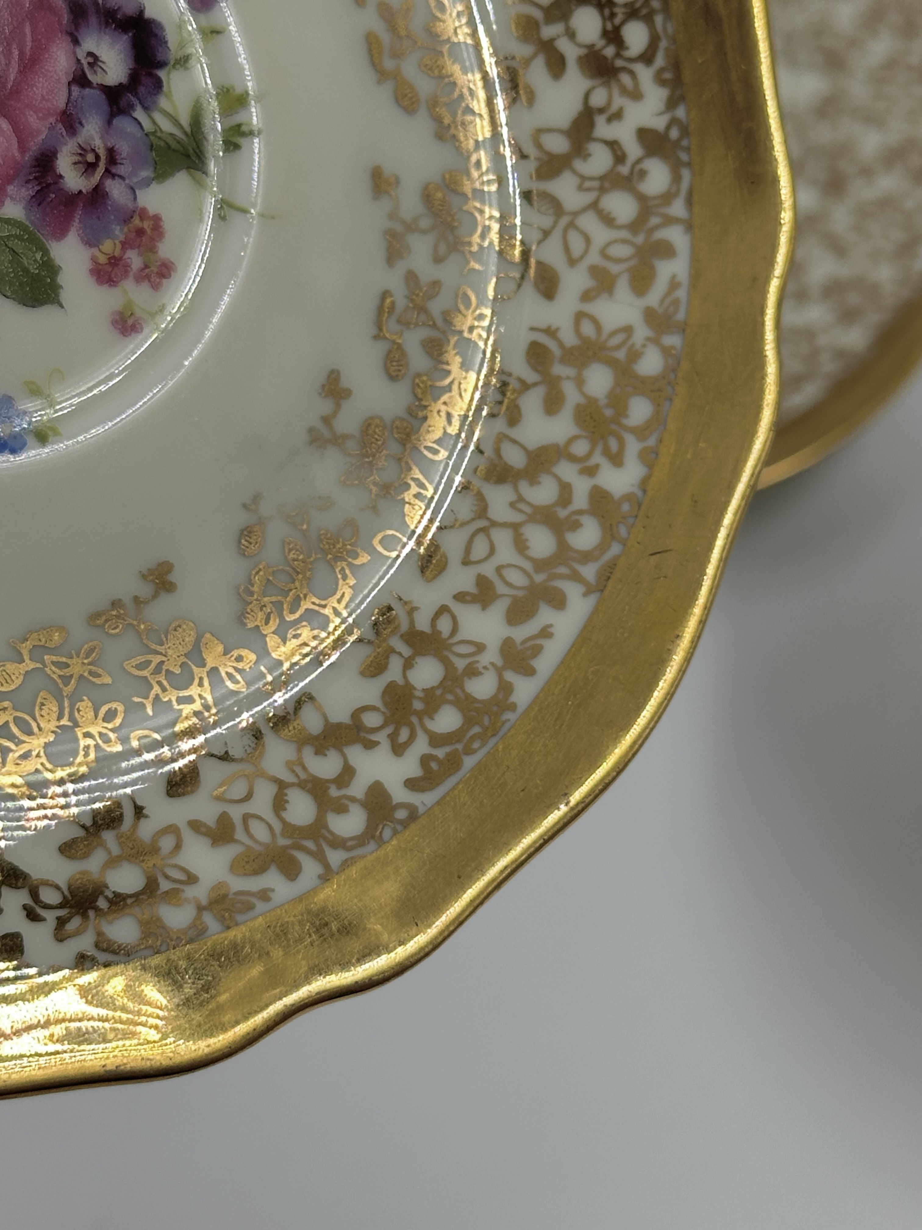 Диаметр тарелки 19,4см. Диаметр блюдца 15см. Объём чашки 175мл. Присутствуют потертости позолоты.
