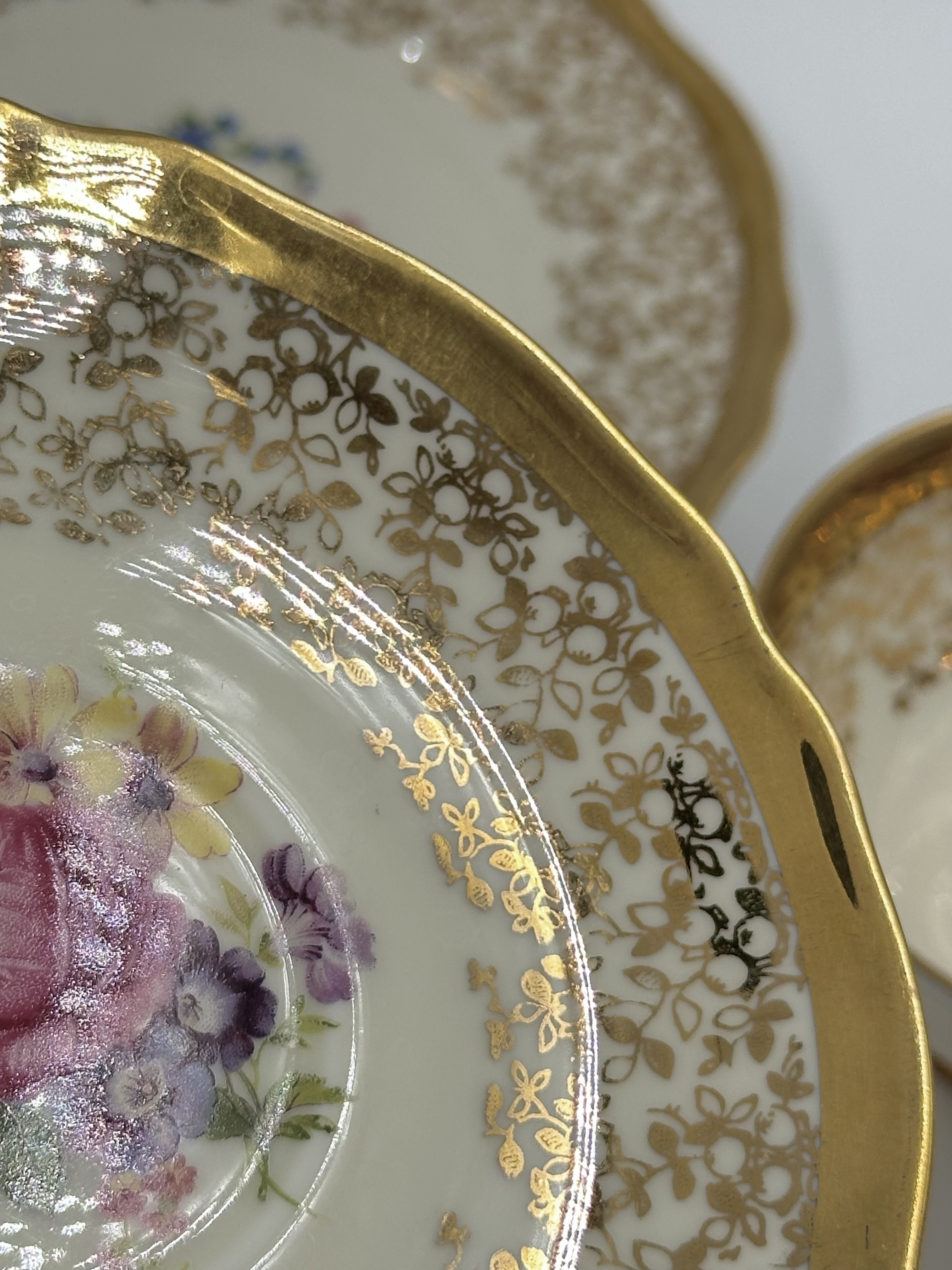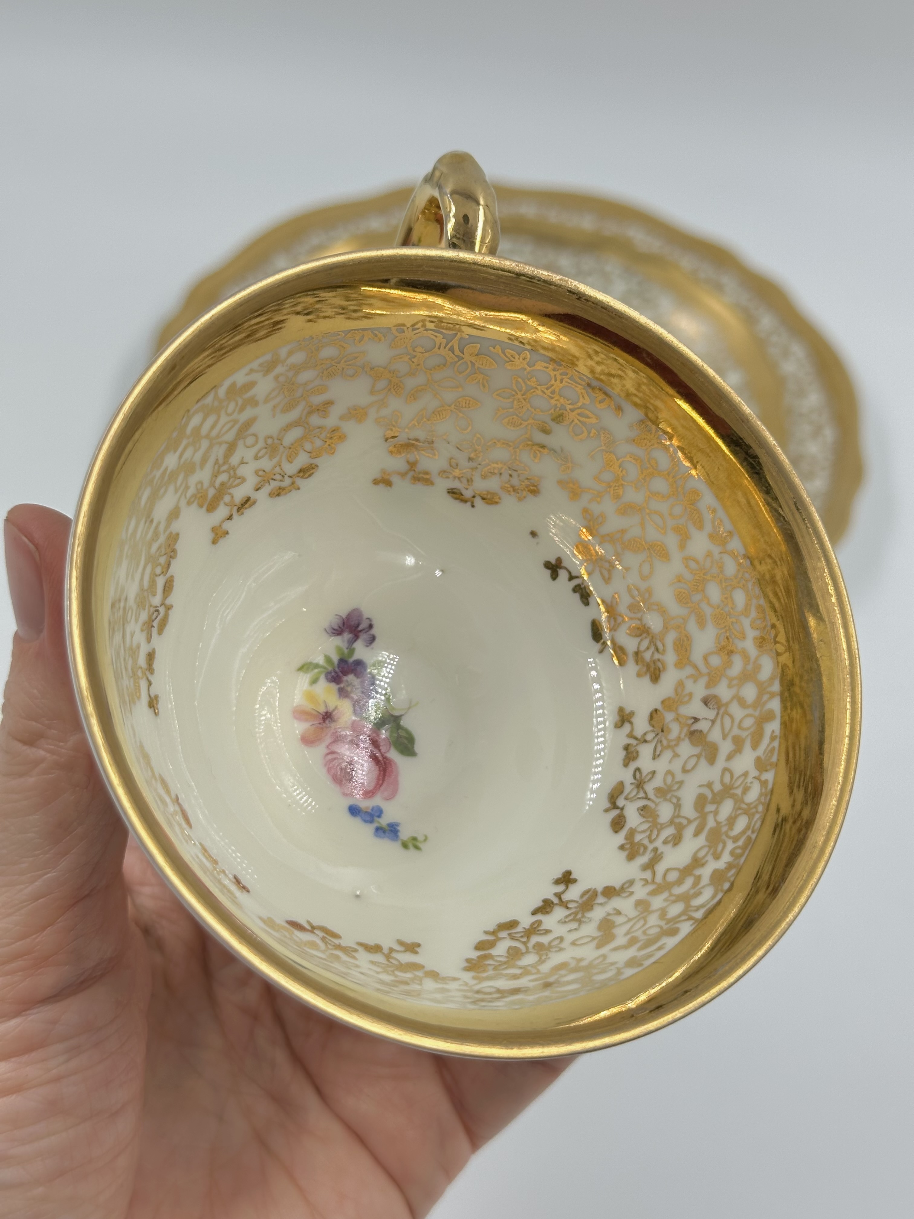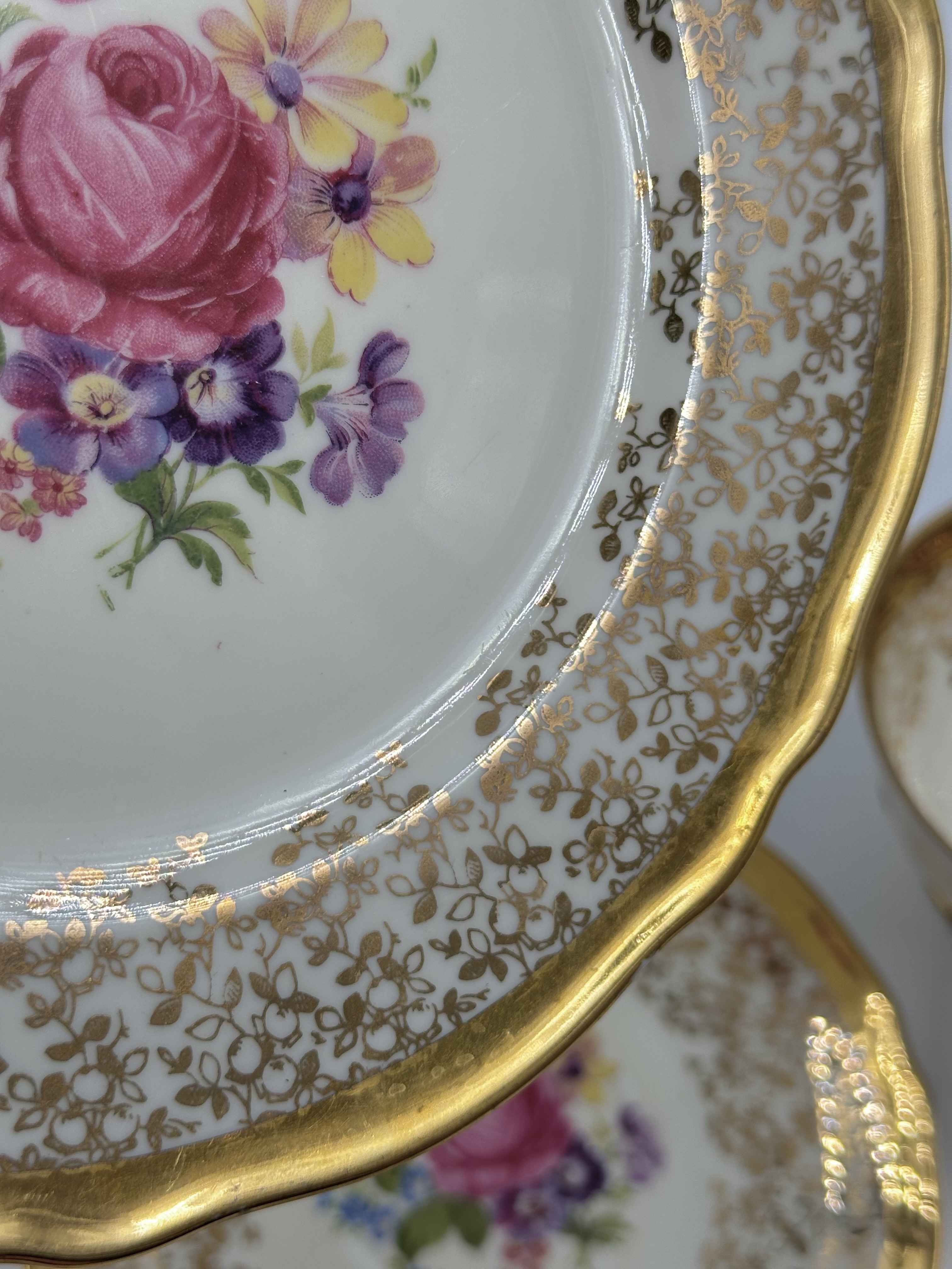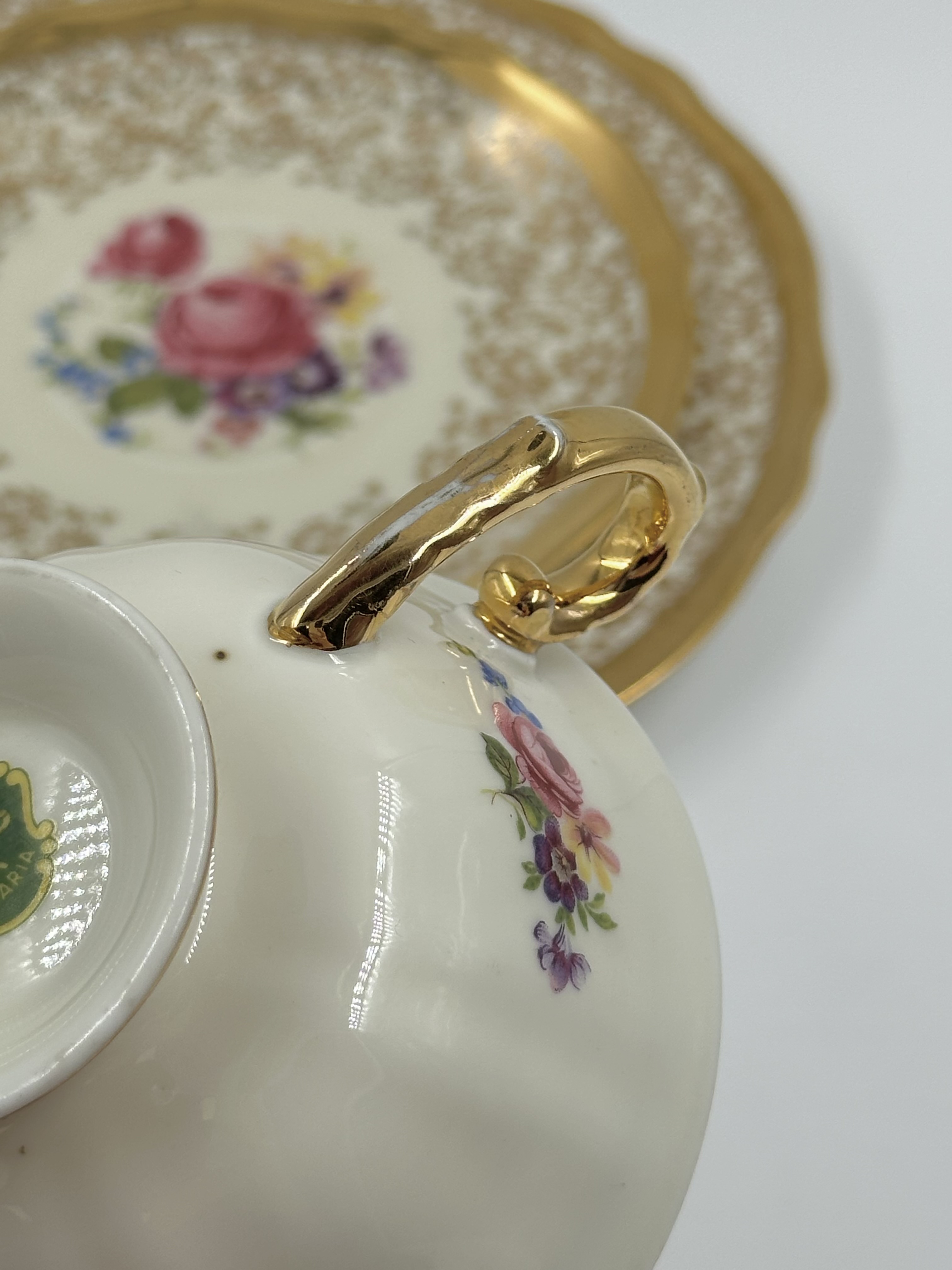 Диаметр тарелки 19,4см. Диаметр блюдца 15см. Объём чашки 175мл. Присутствуют потертости позолоты.