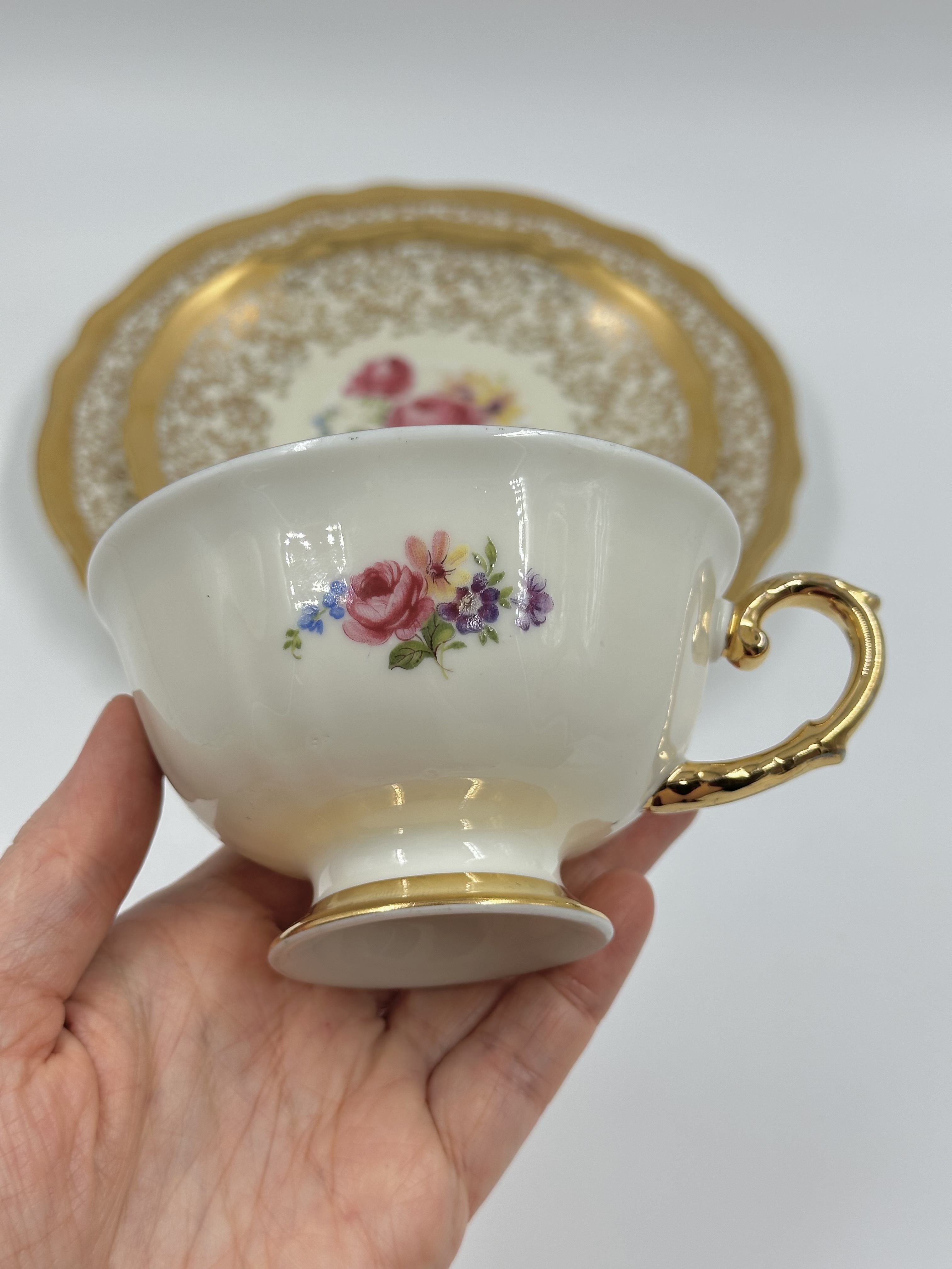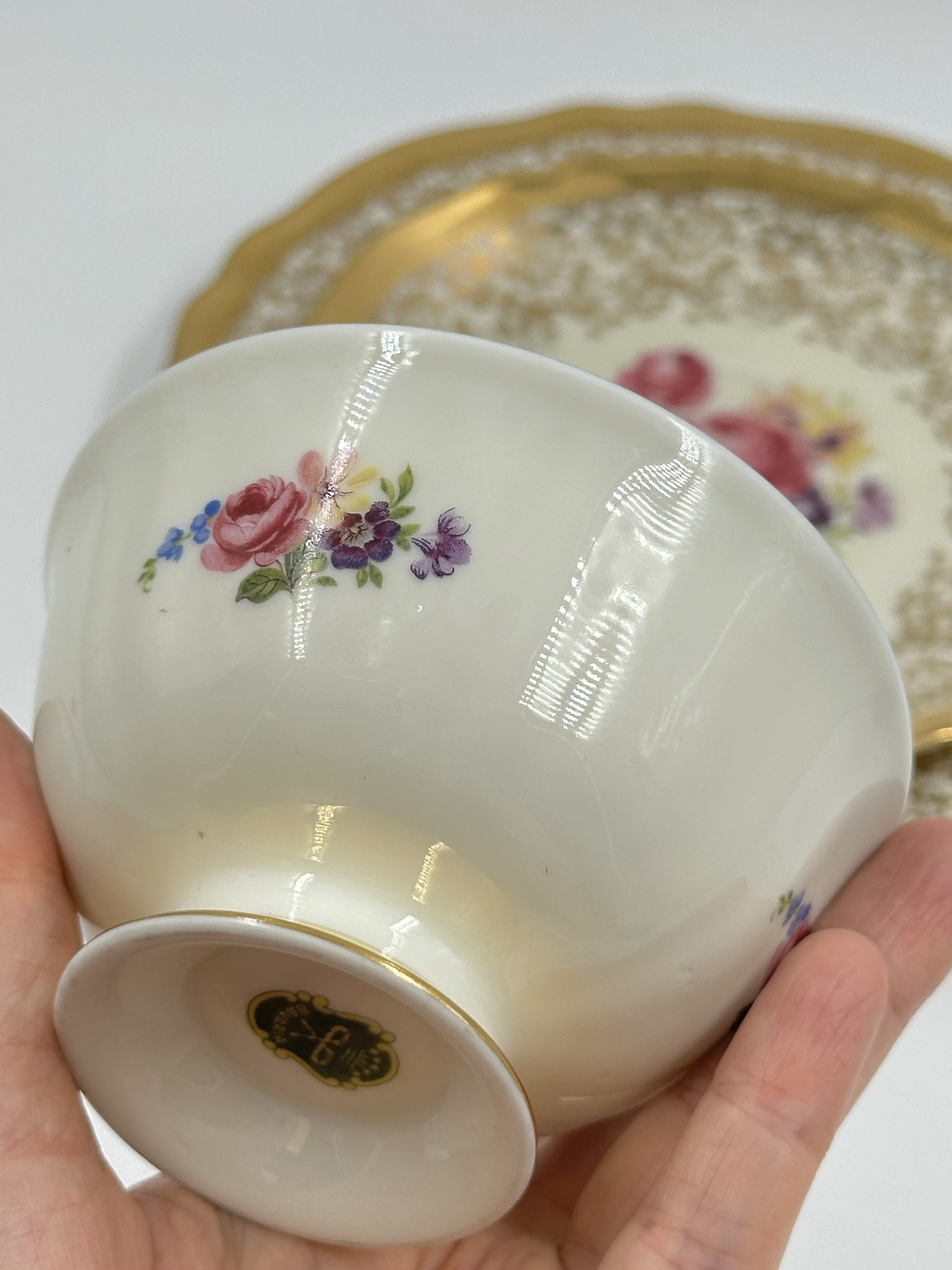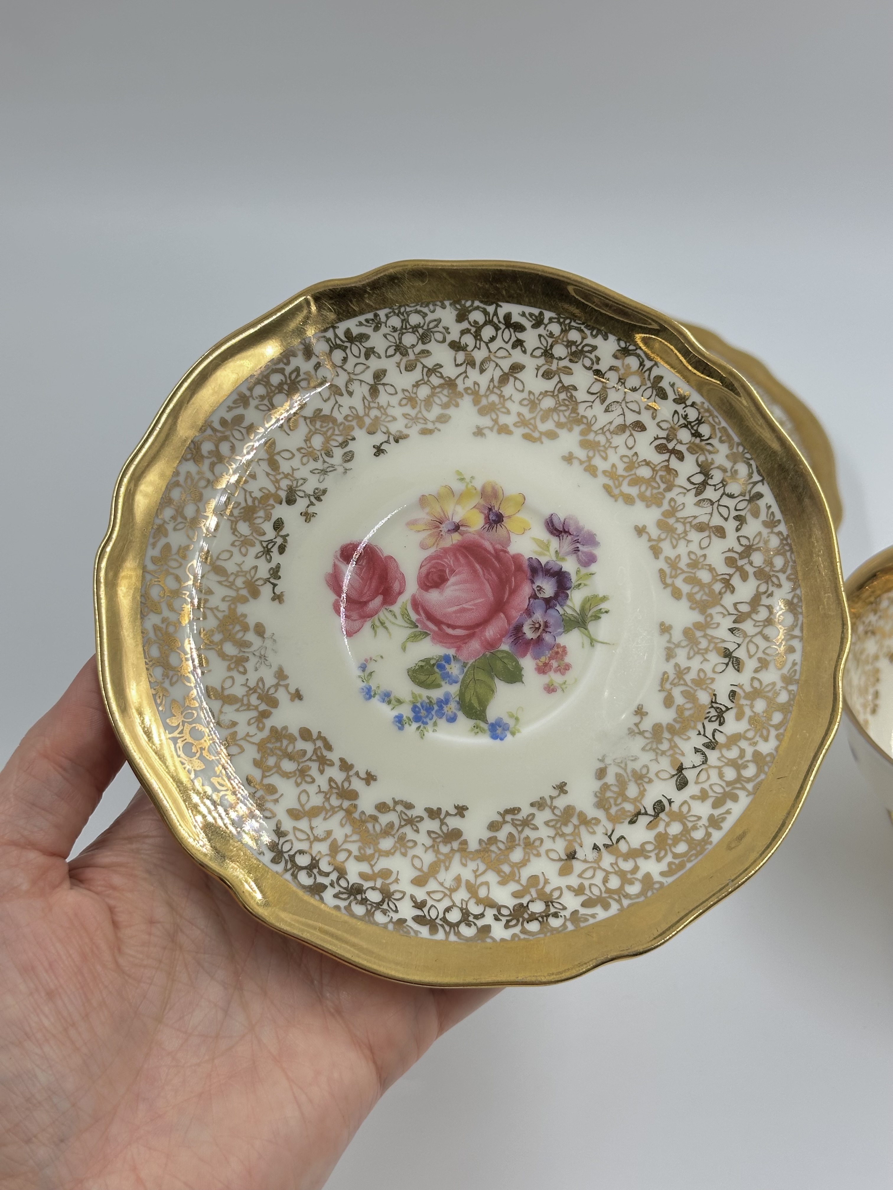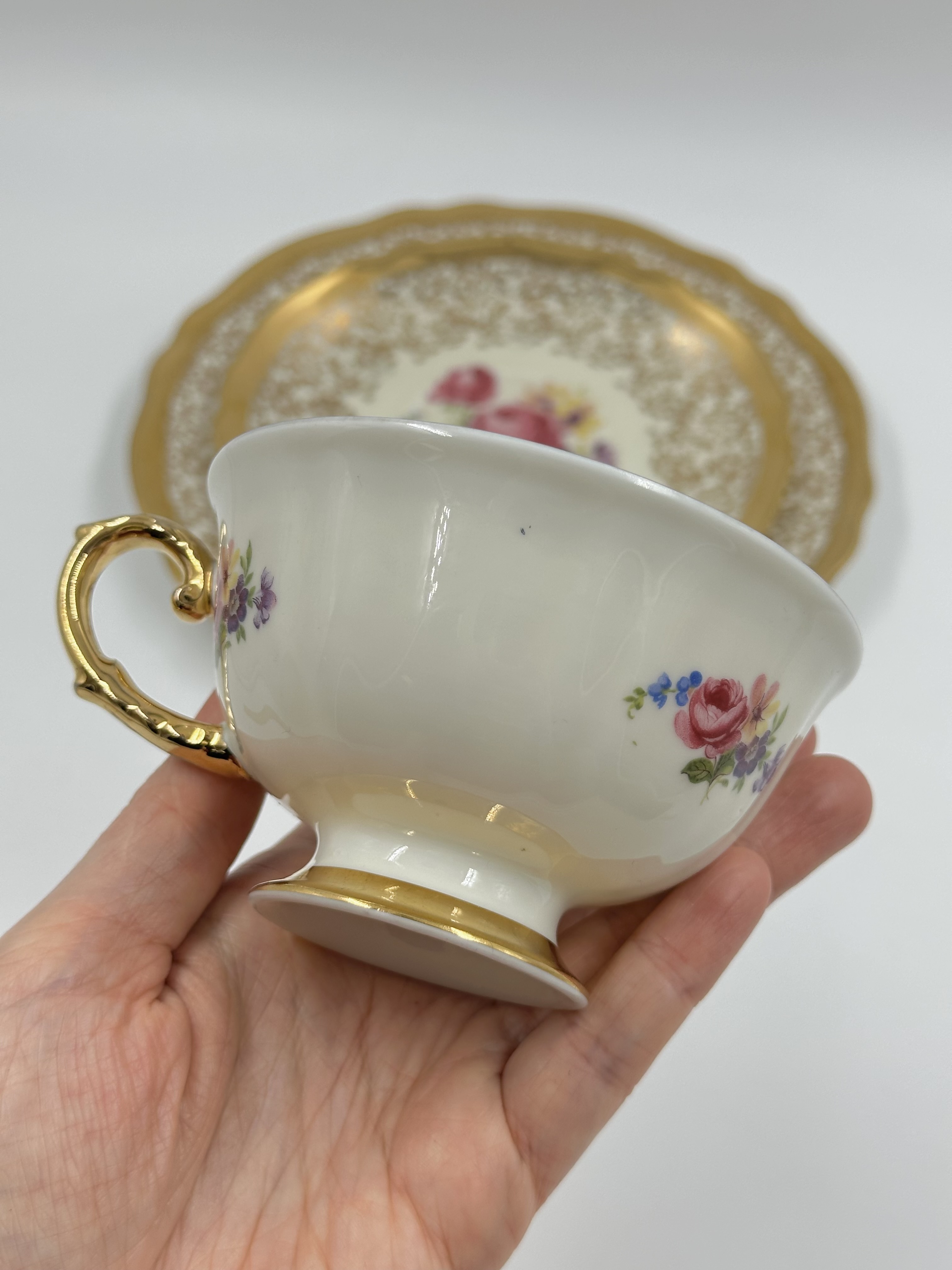 Диаметр тарелки 19,4см. Диаметр блюдца 15см. Объём чашки 175мл. Присутствуют потертости позолоты.