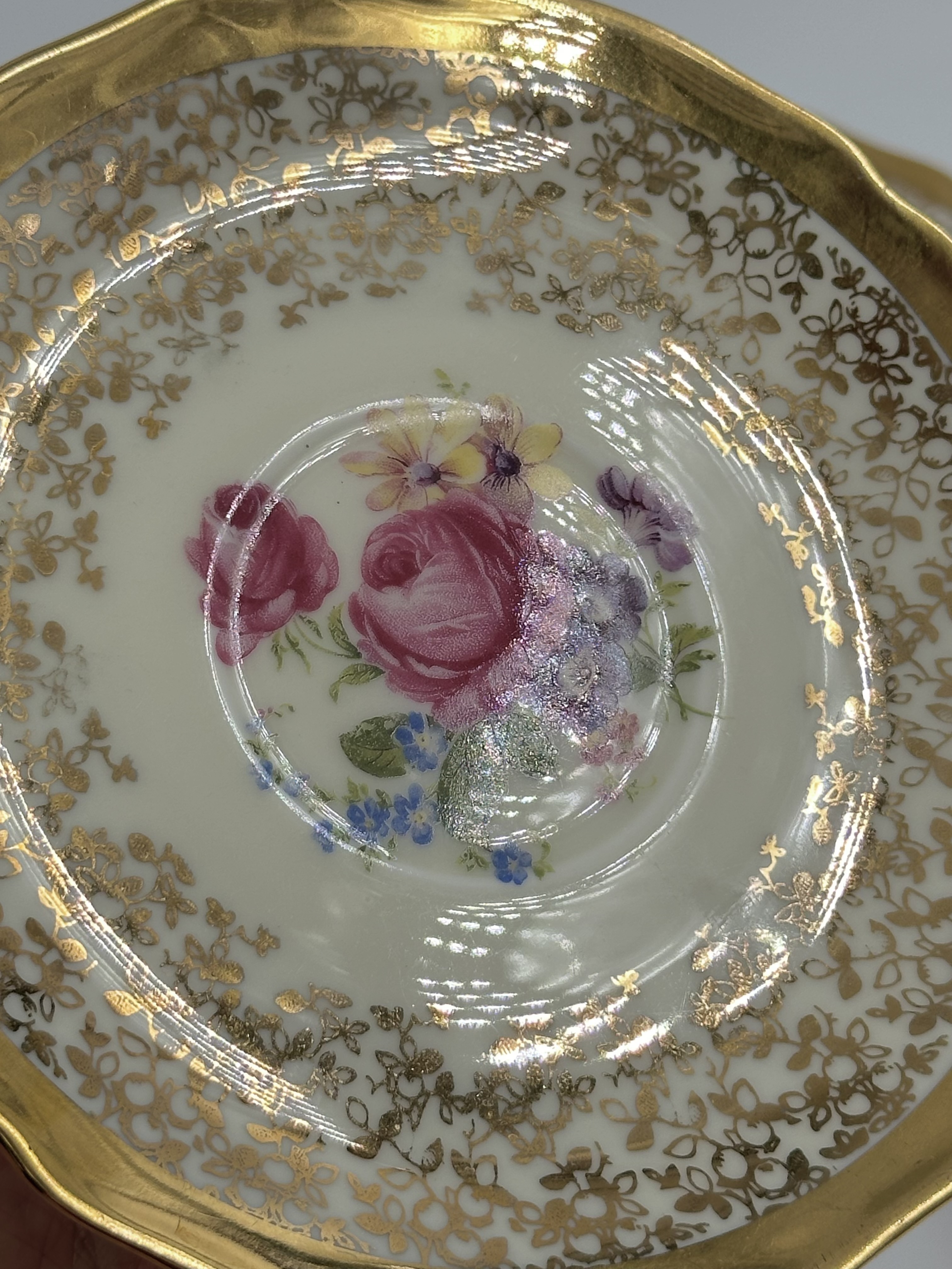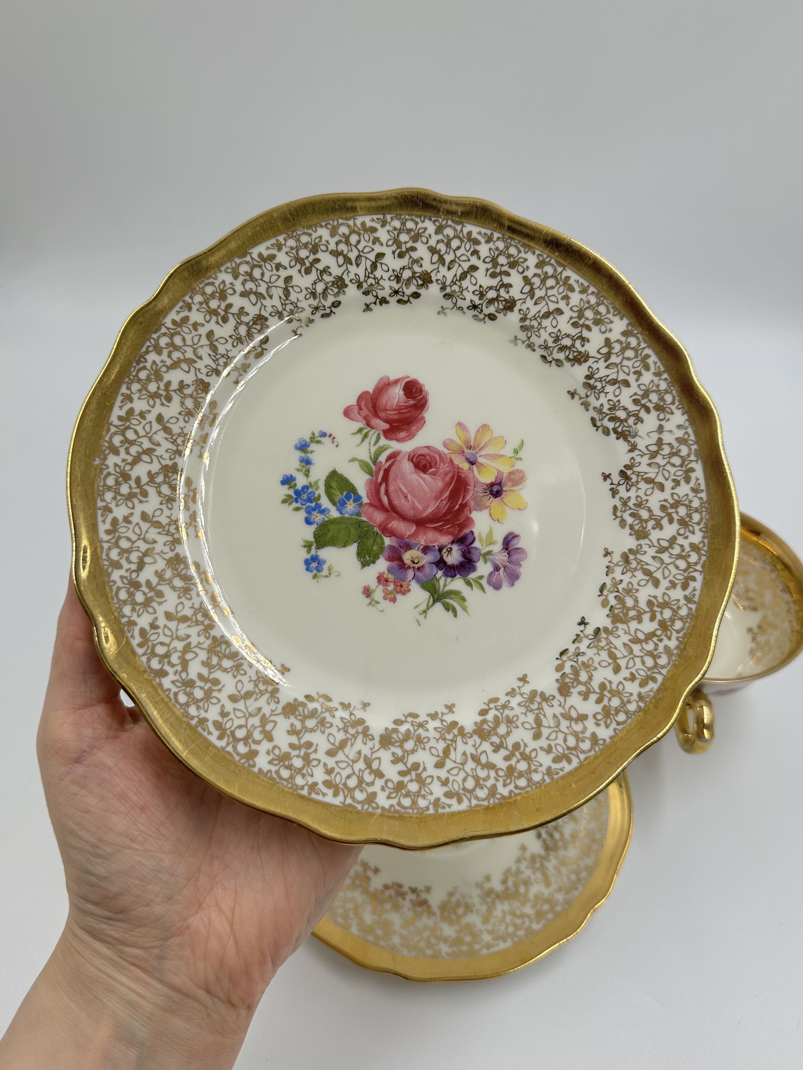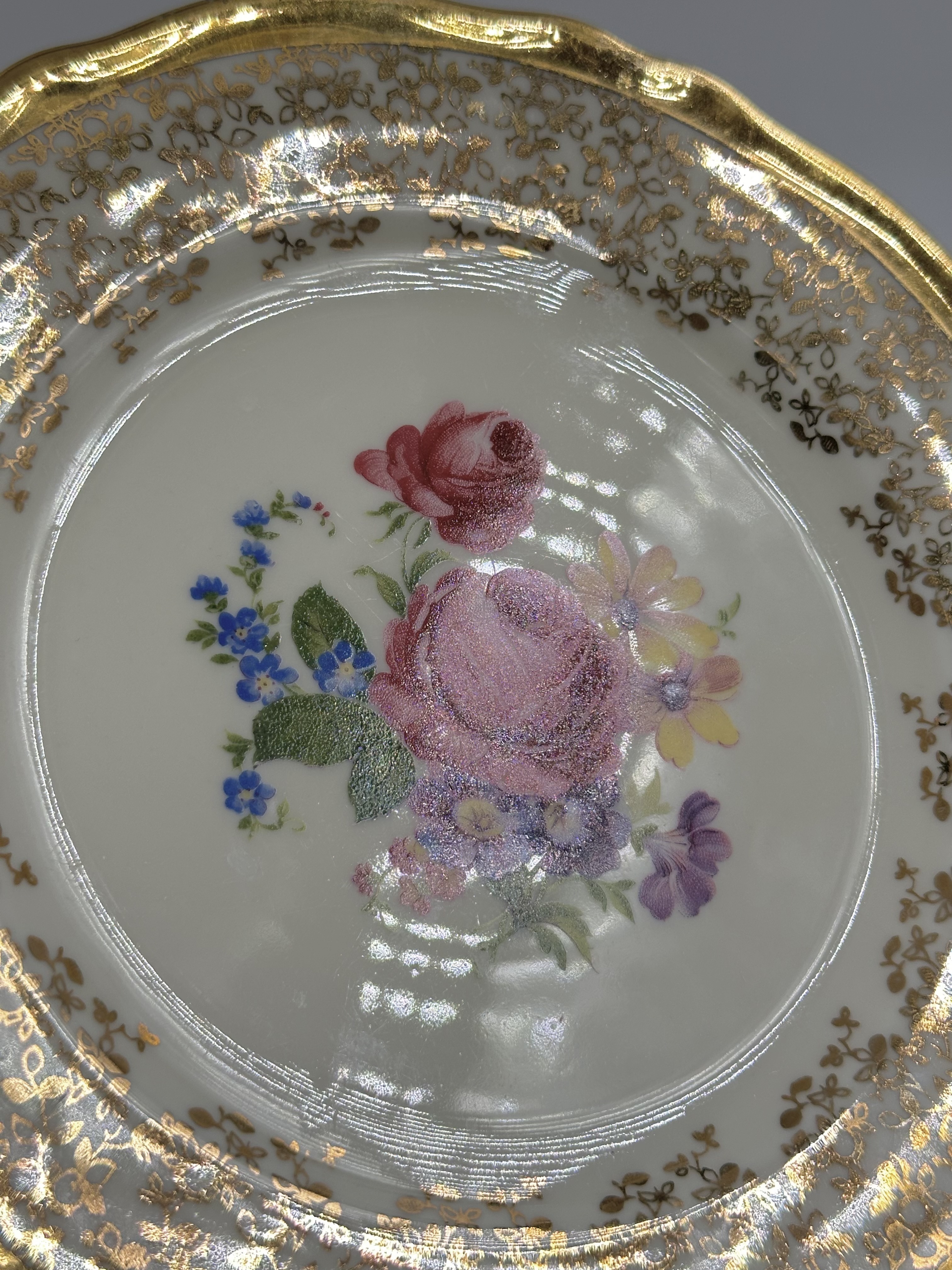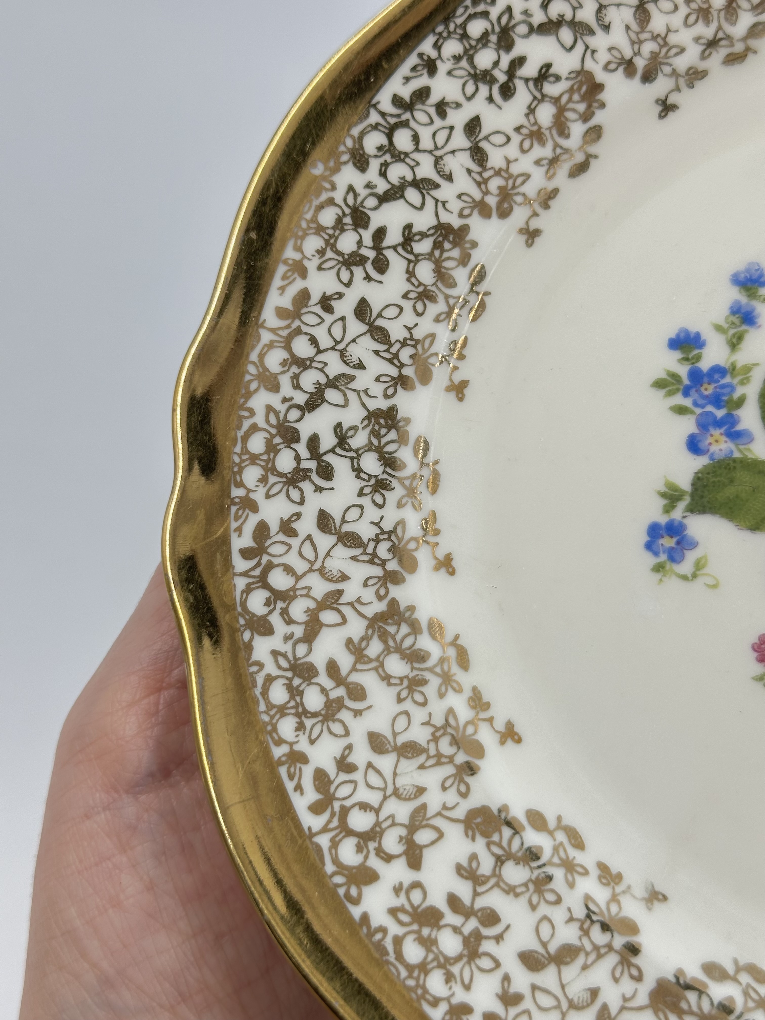 Диаметр тарелки 19,4см. Диаметр блюдца 15см. Объём чашки 175мл. Присутствуют потертости позолоты.