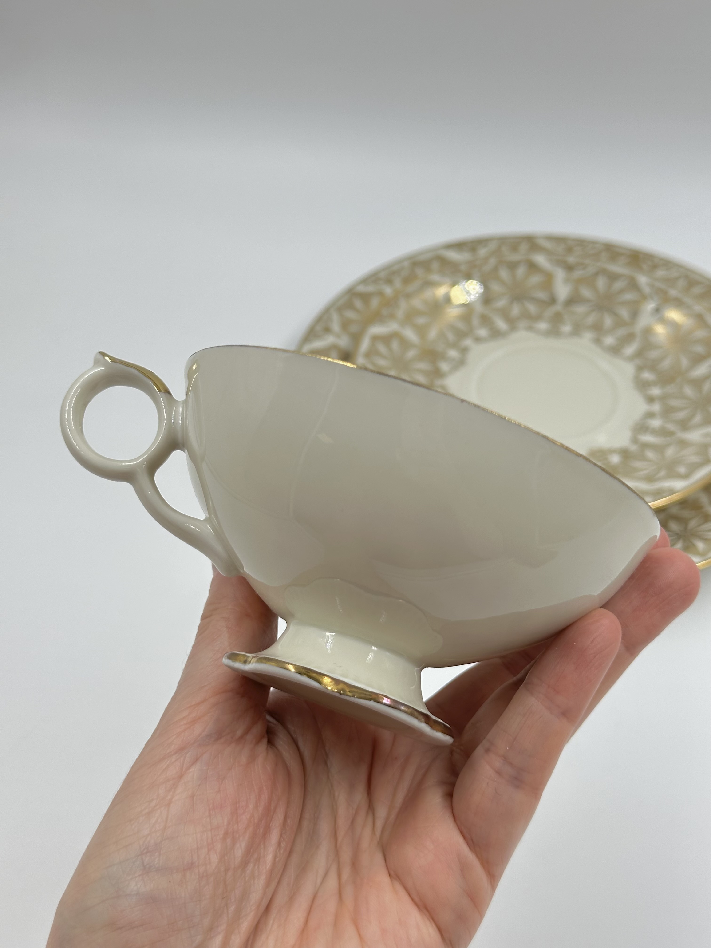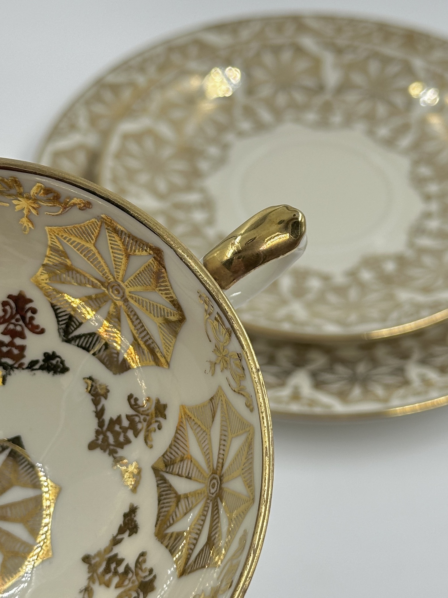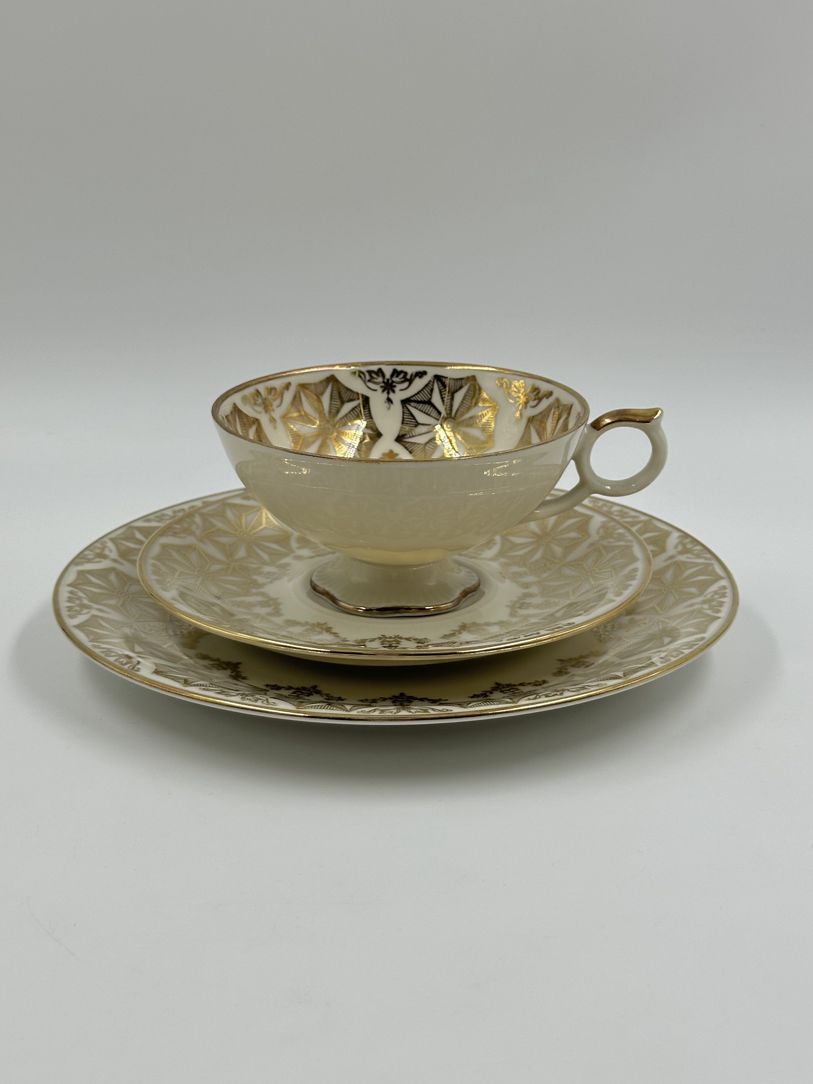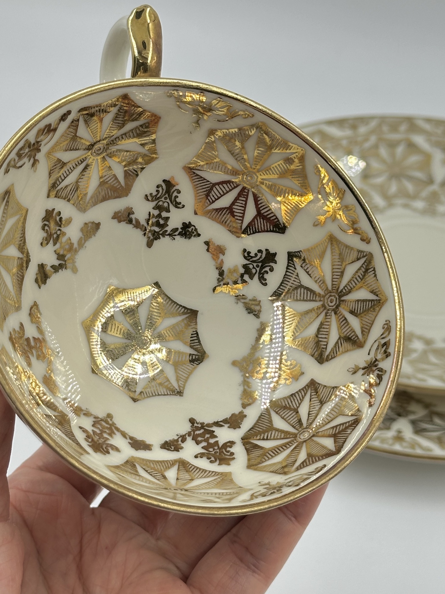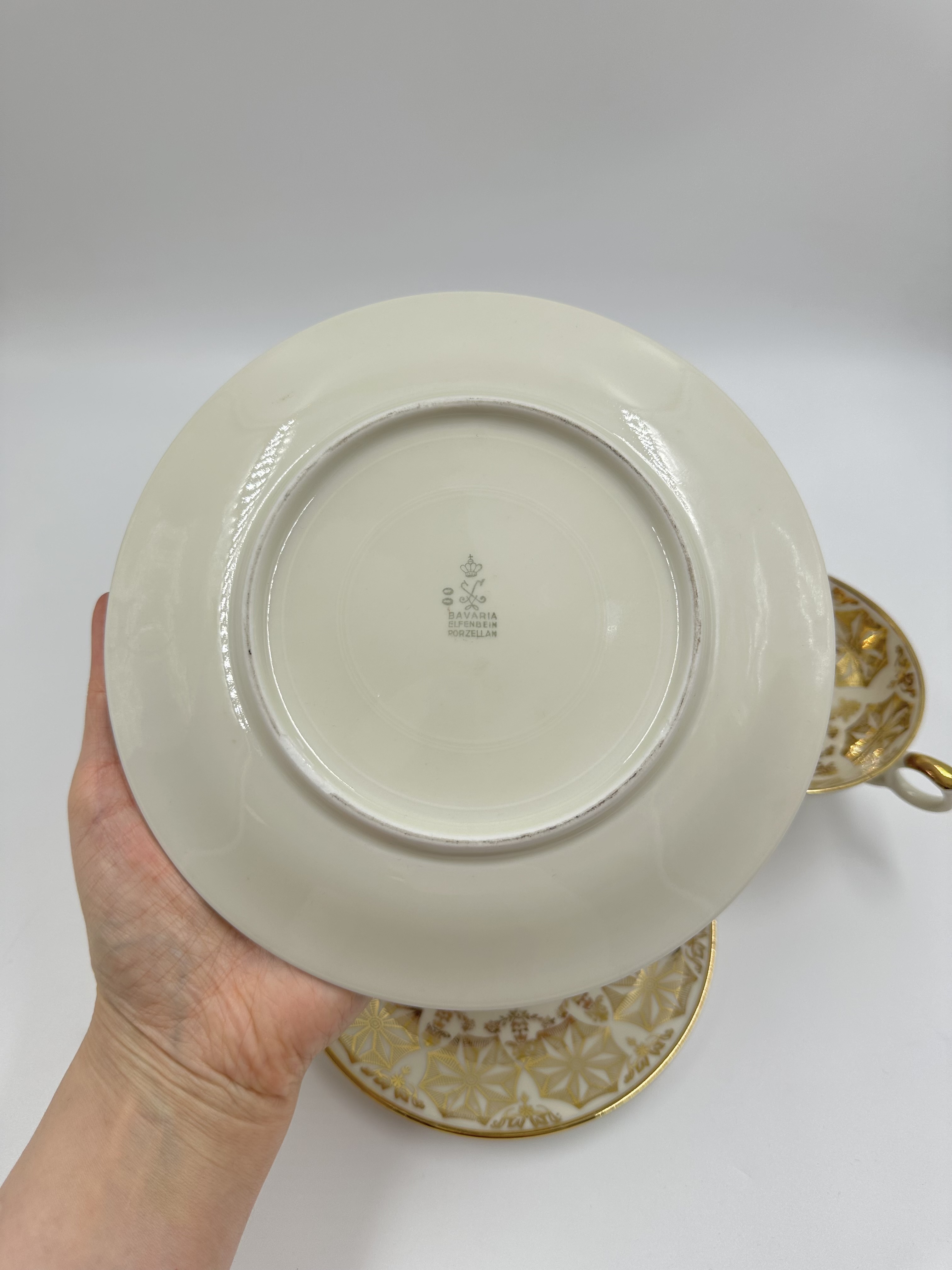 Диаметр тарелки 19,3см. Диаметр блюдца 14,6см. Объём чашки 160мл. Присутствуют небольшие потертости позолоты.