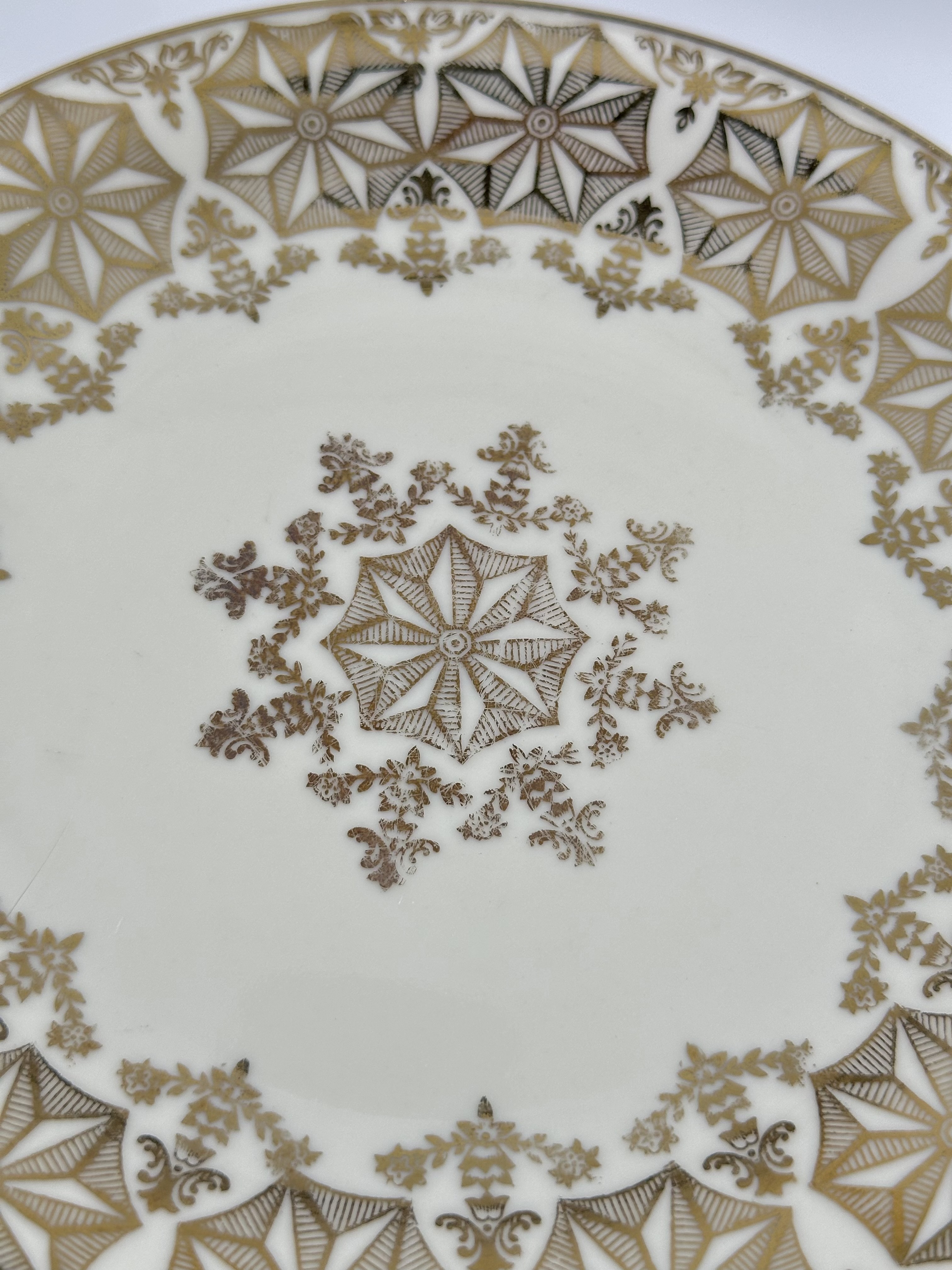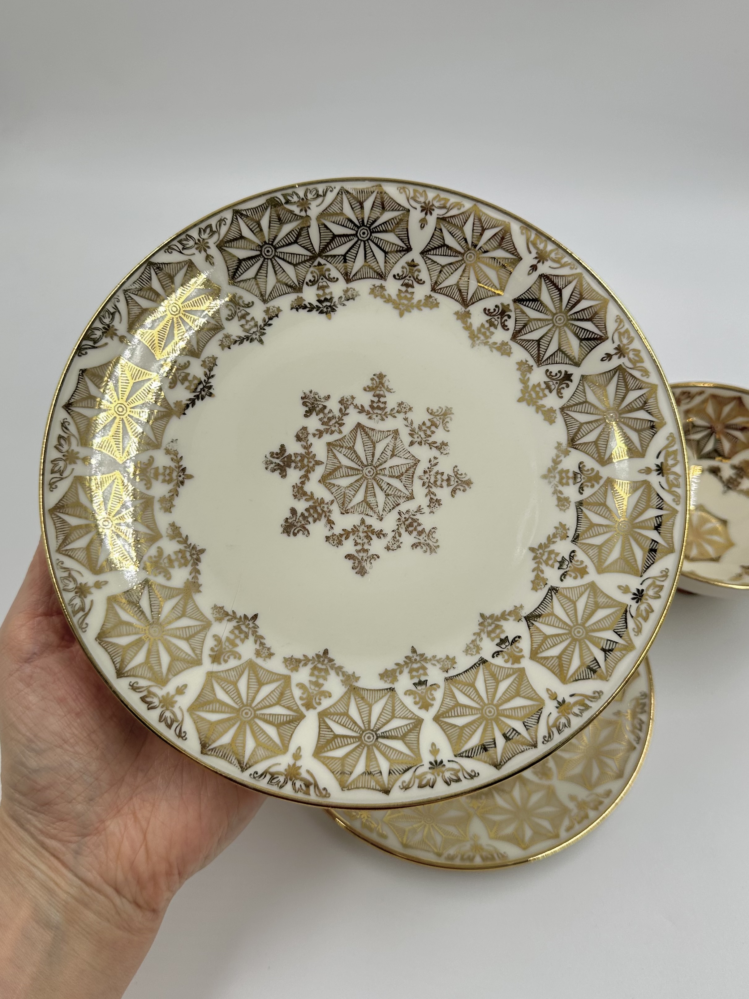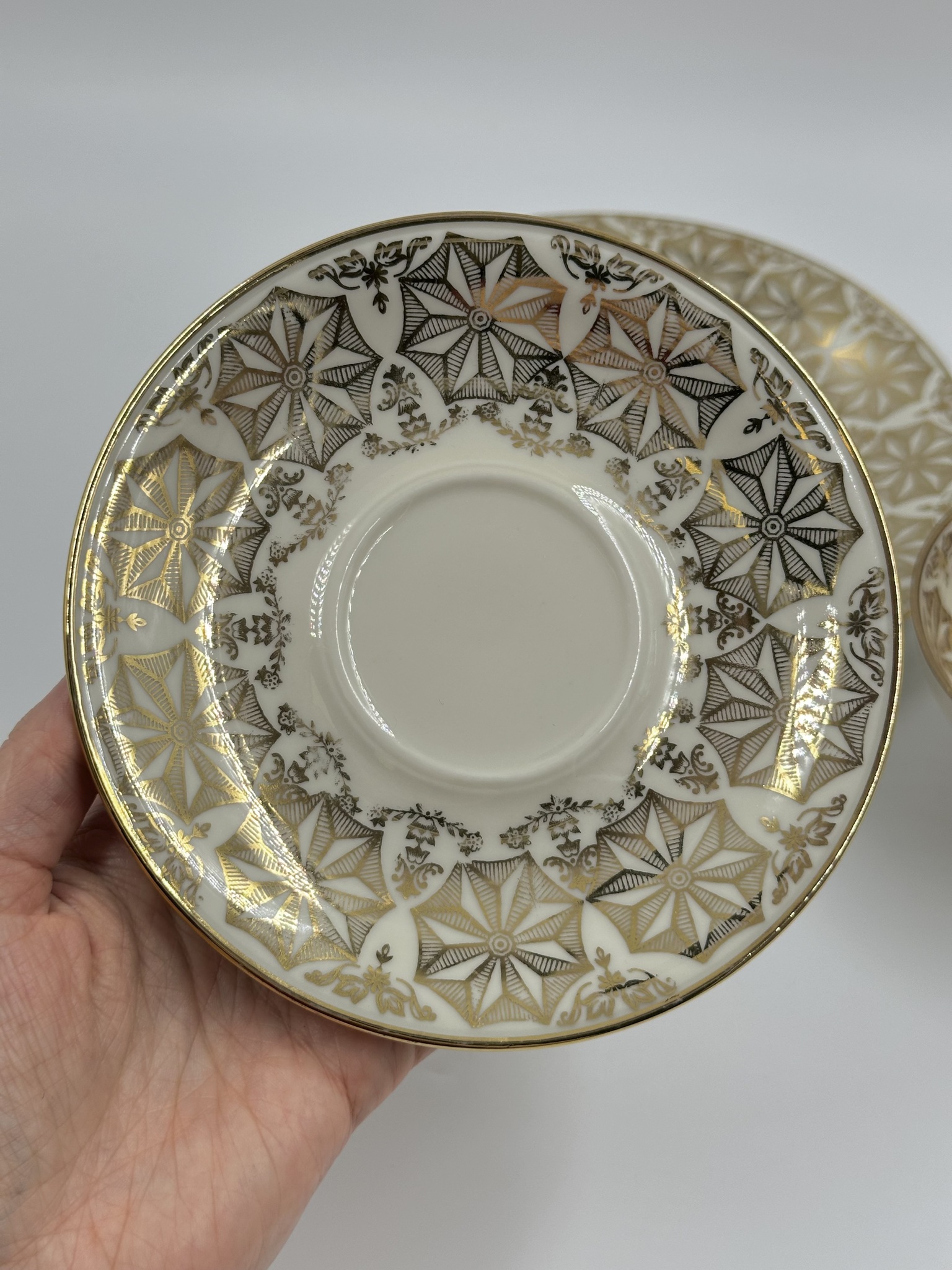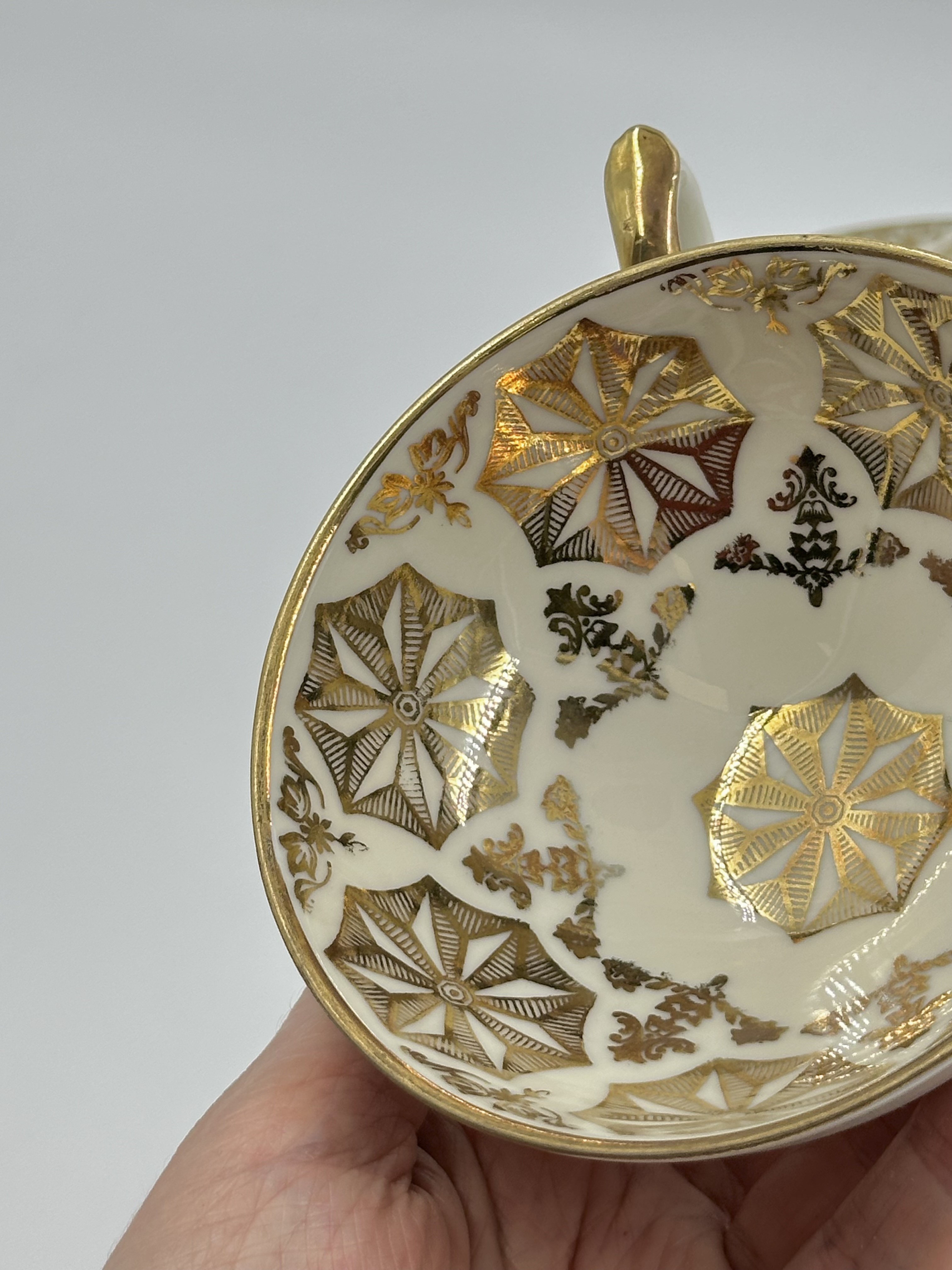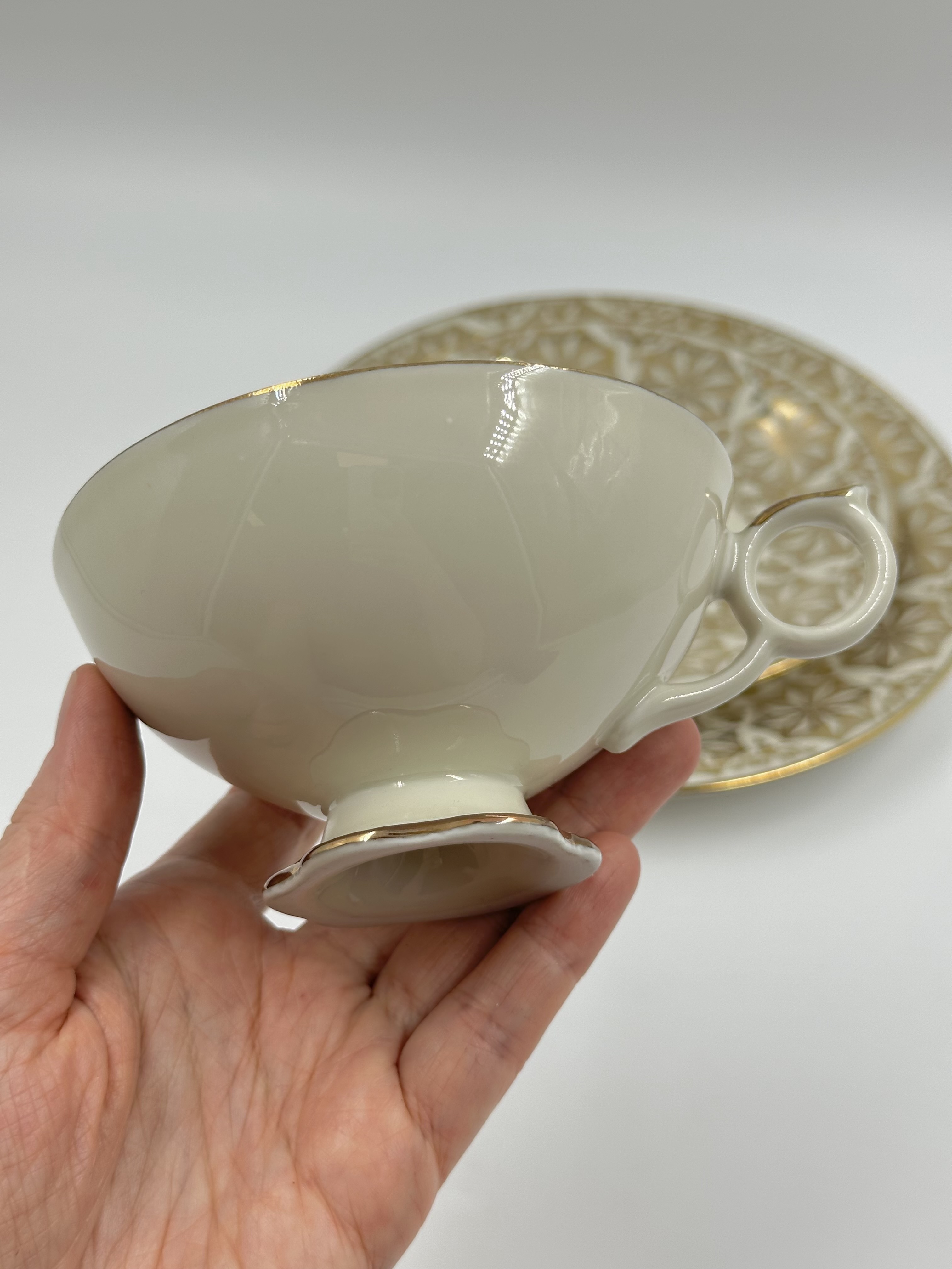 Диаметр тарелки 19,3см. Диаметр блюдца 14,6см. Объём чашки 160мл. Присутствуют небольшие потертости позолоты.