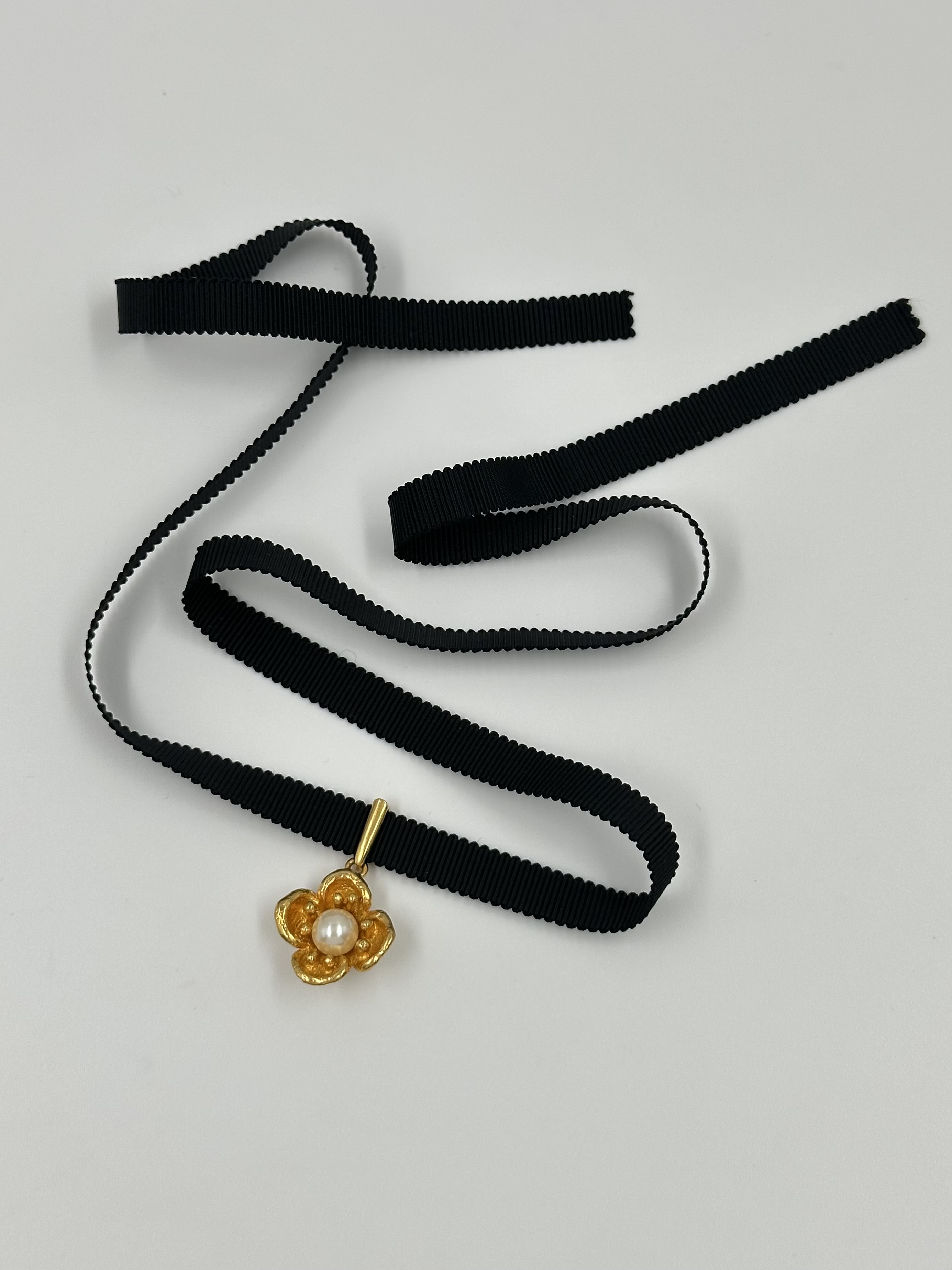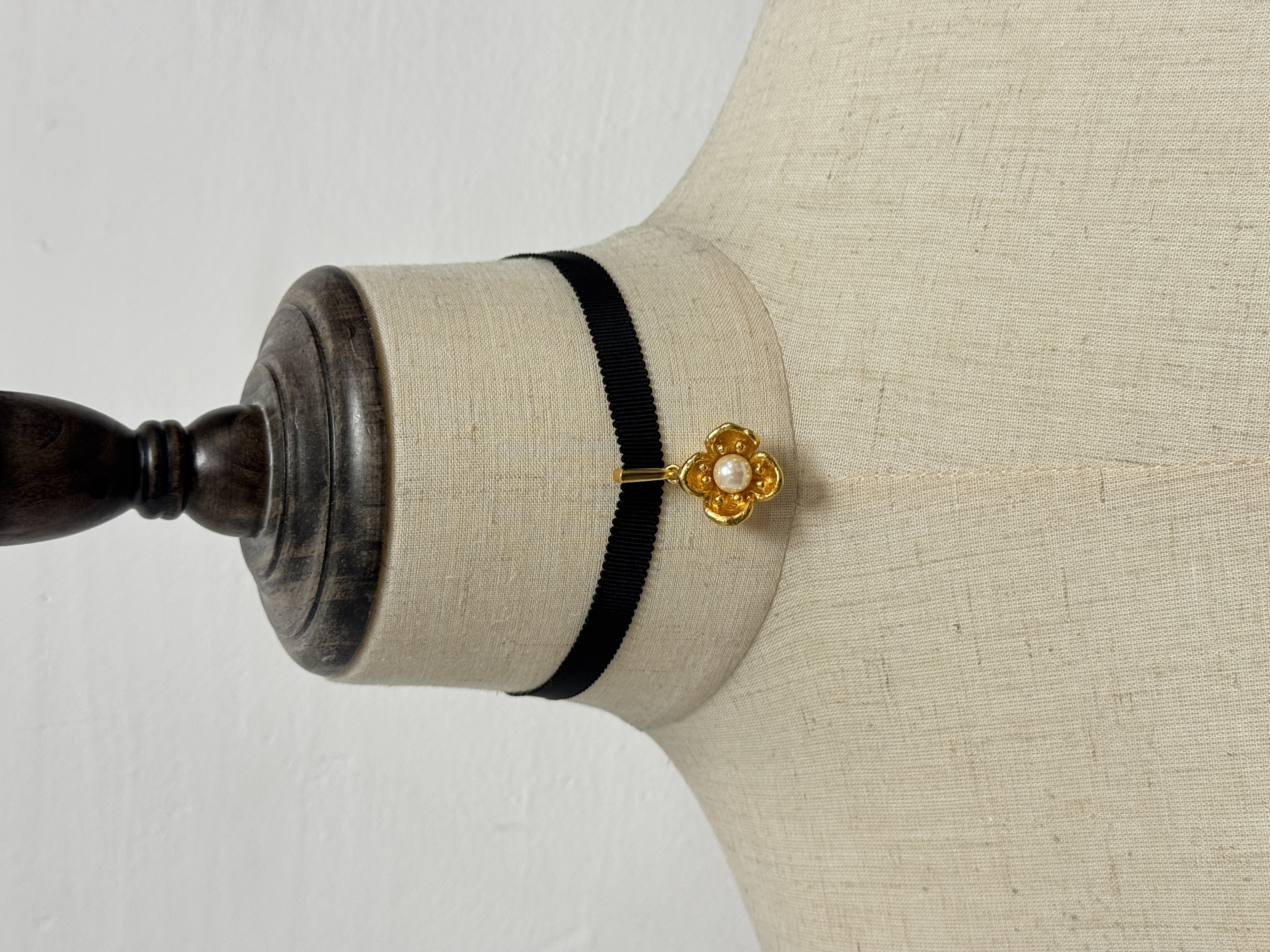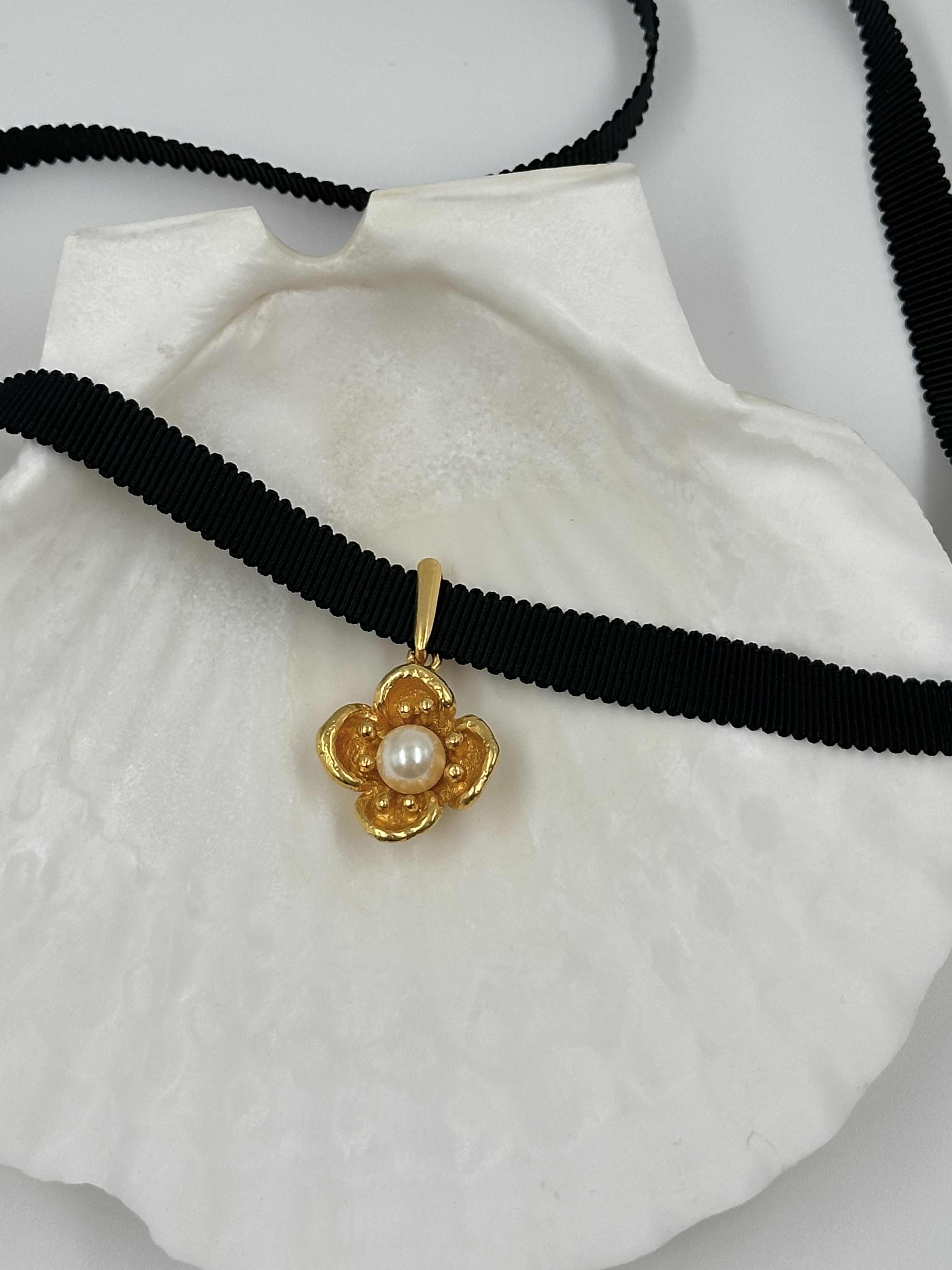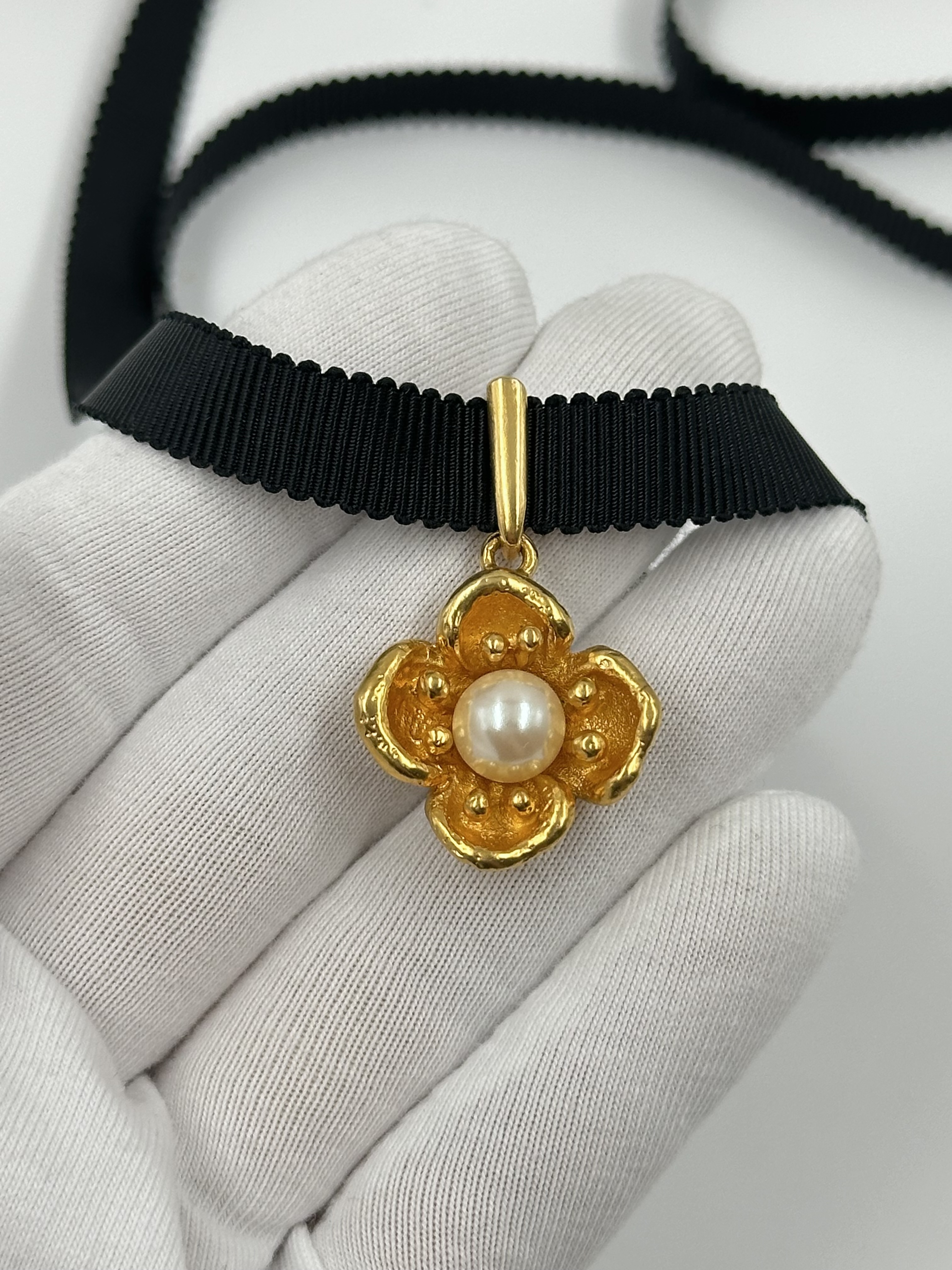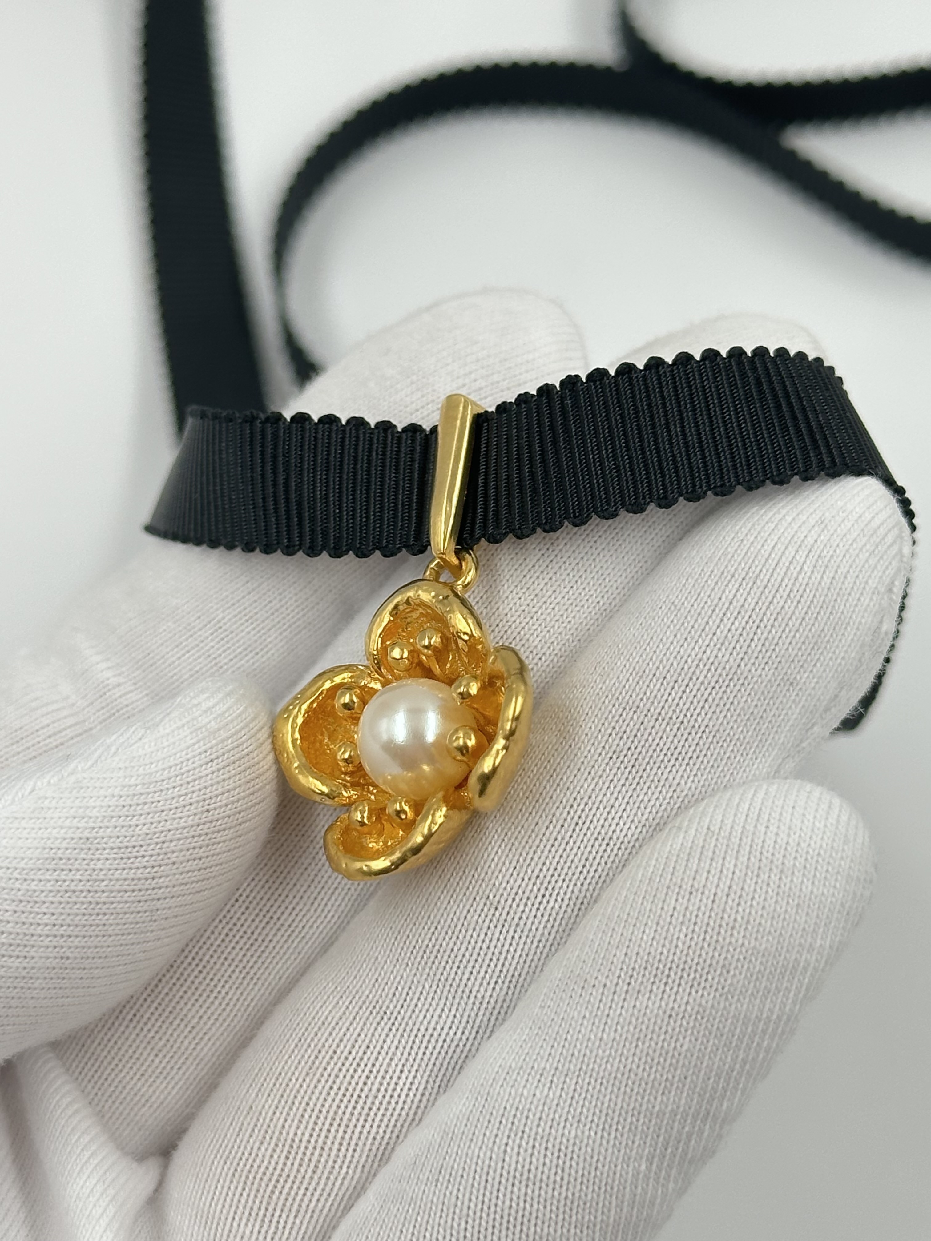 Бижутерный сплав, позолота, имитация жемчуга, текстильная лента.