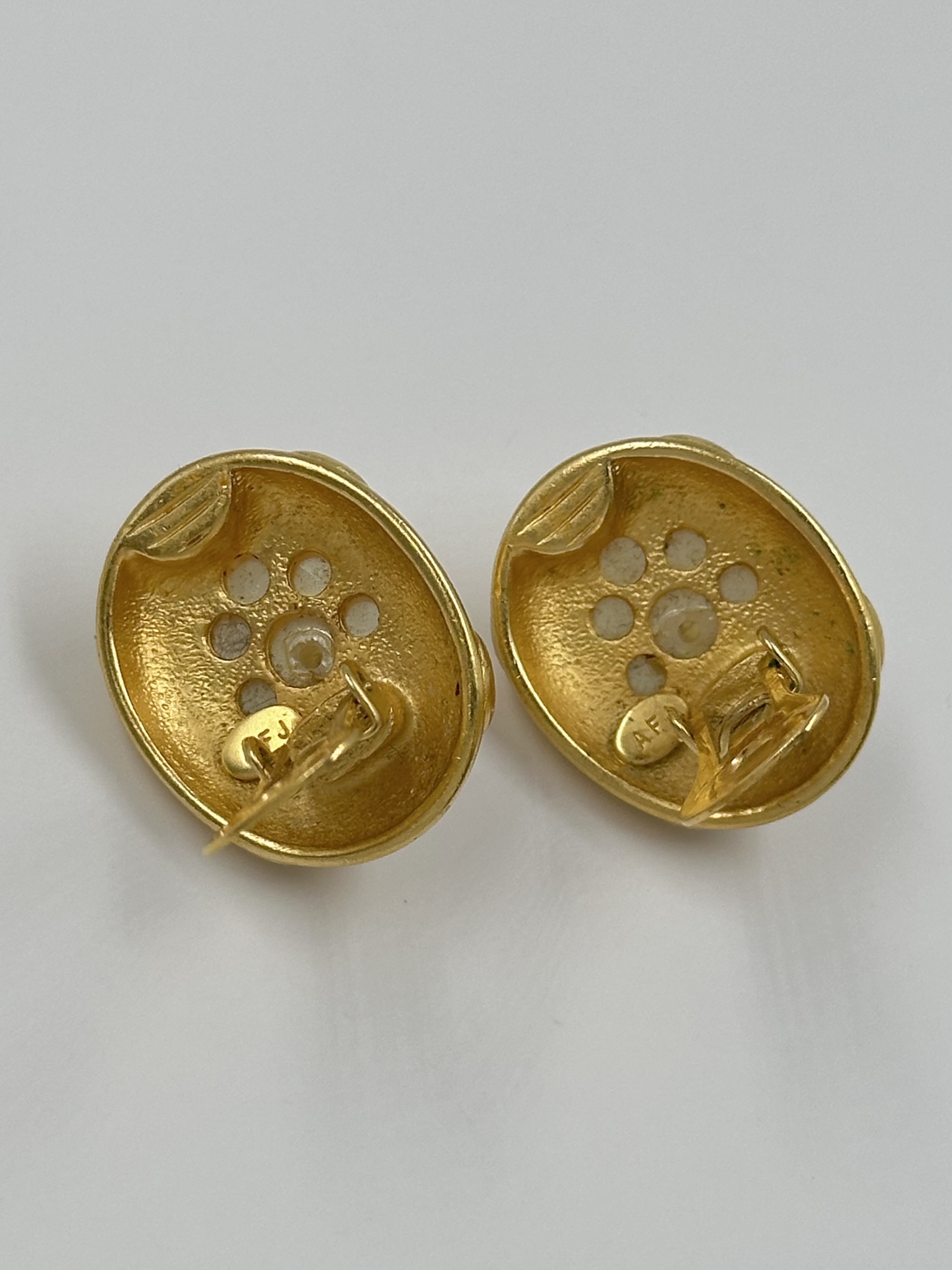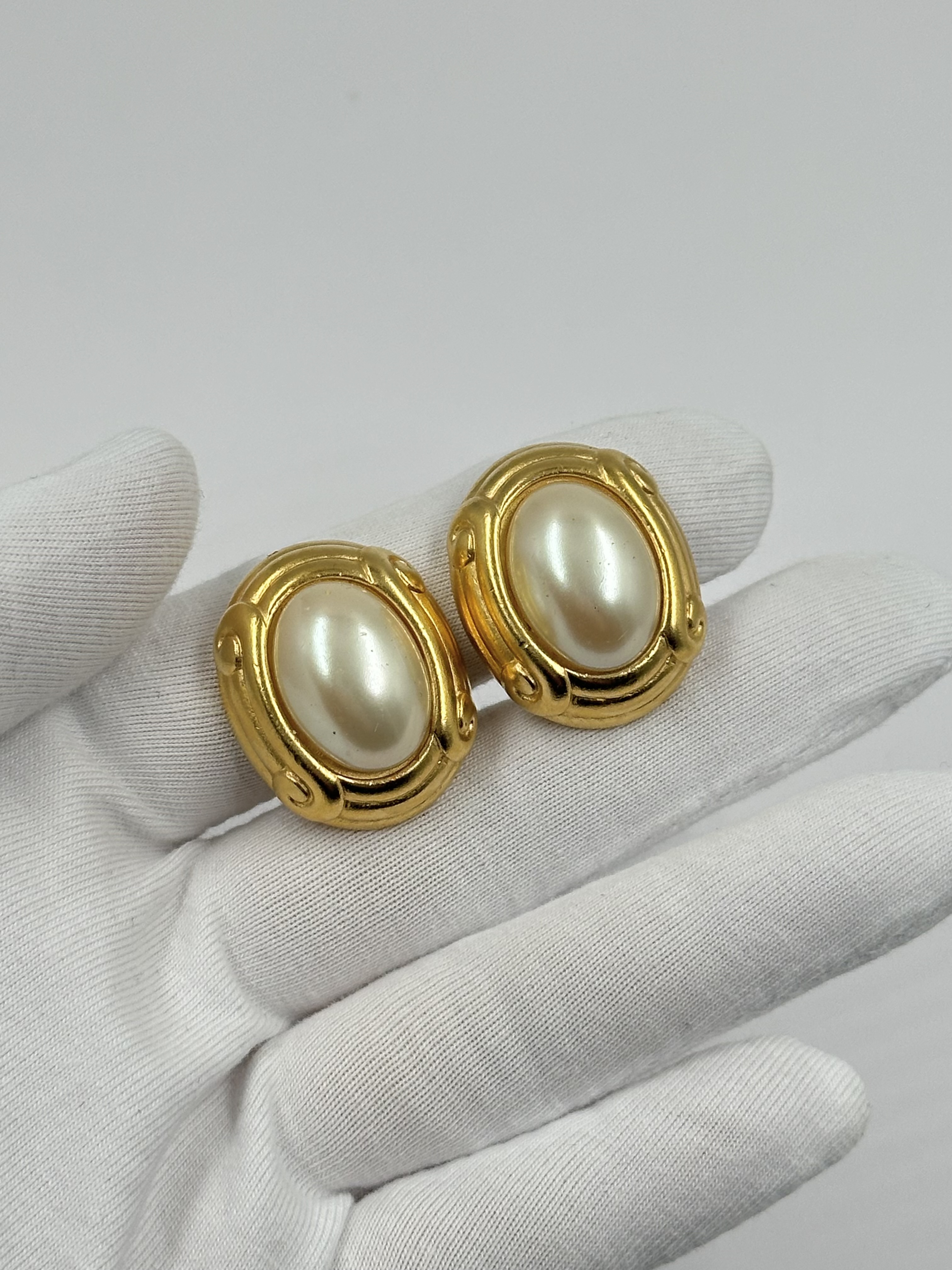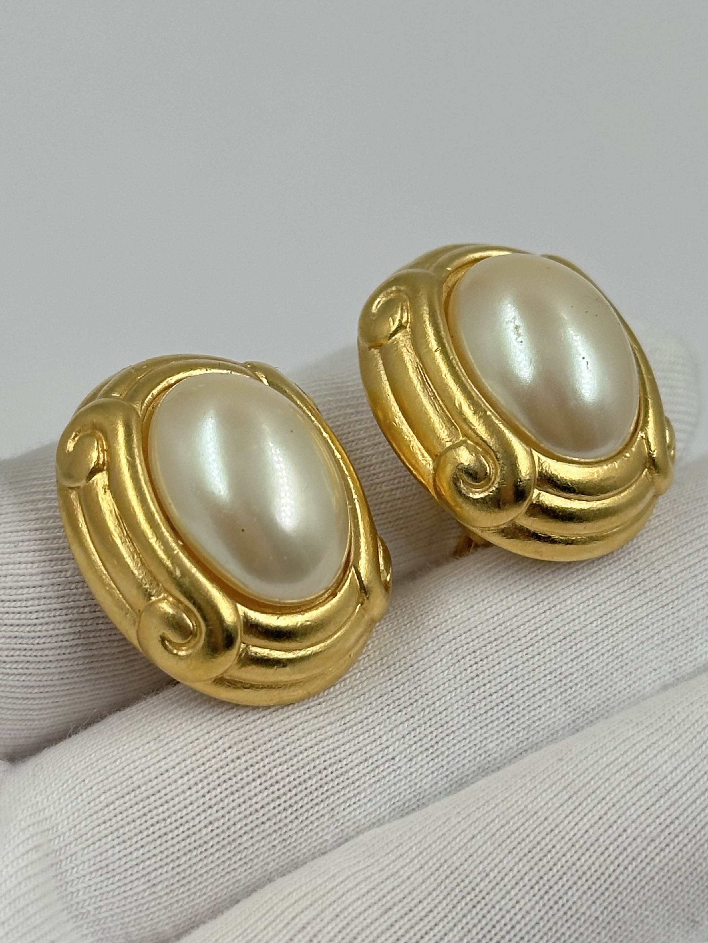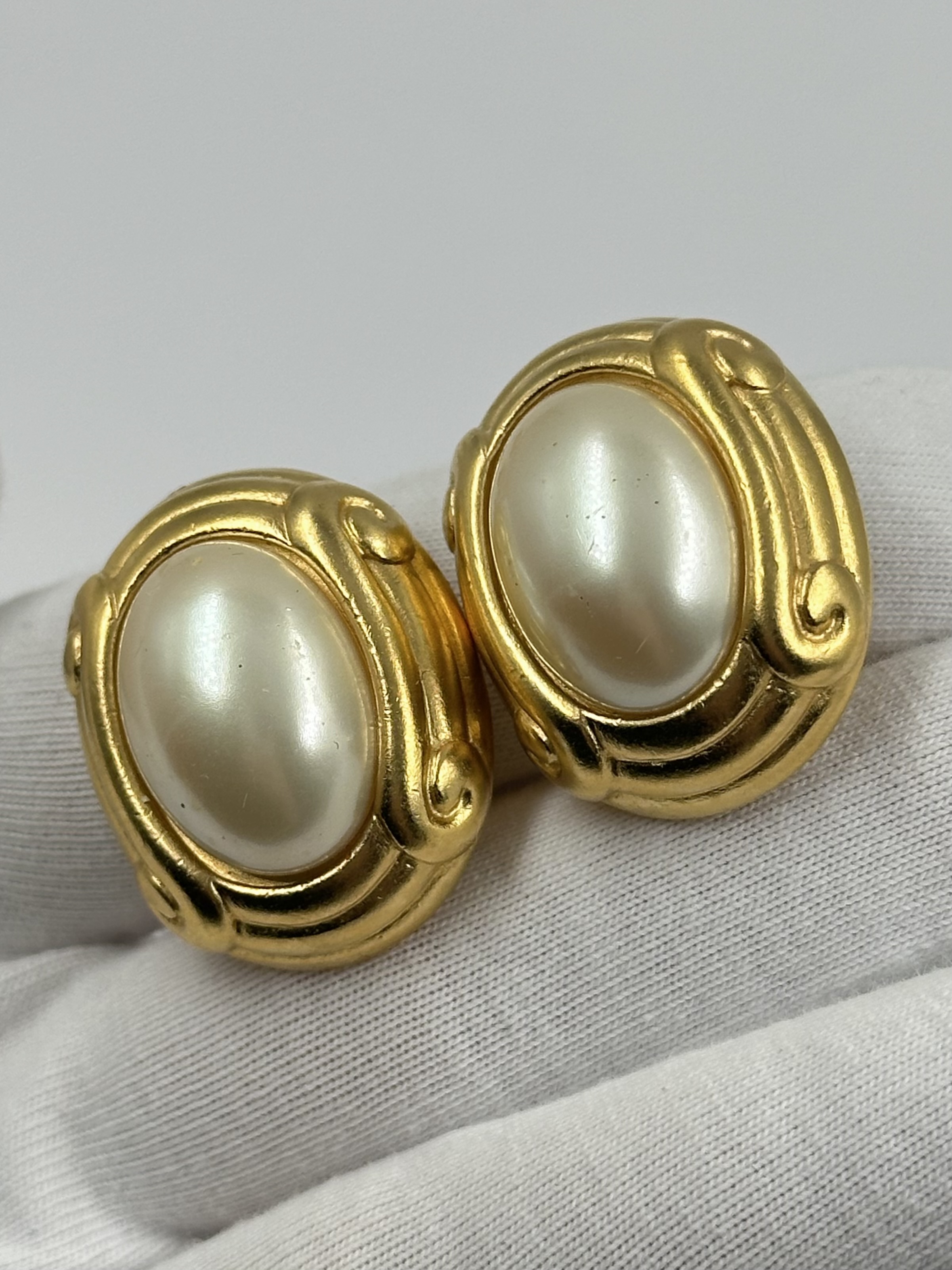 Бижутерный сплав, имитация жемчуга. На вставках небольшие царапины.