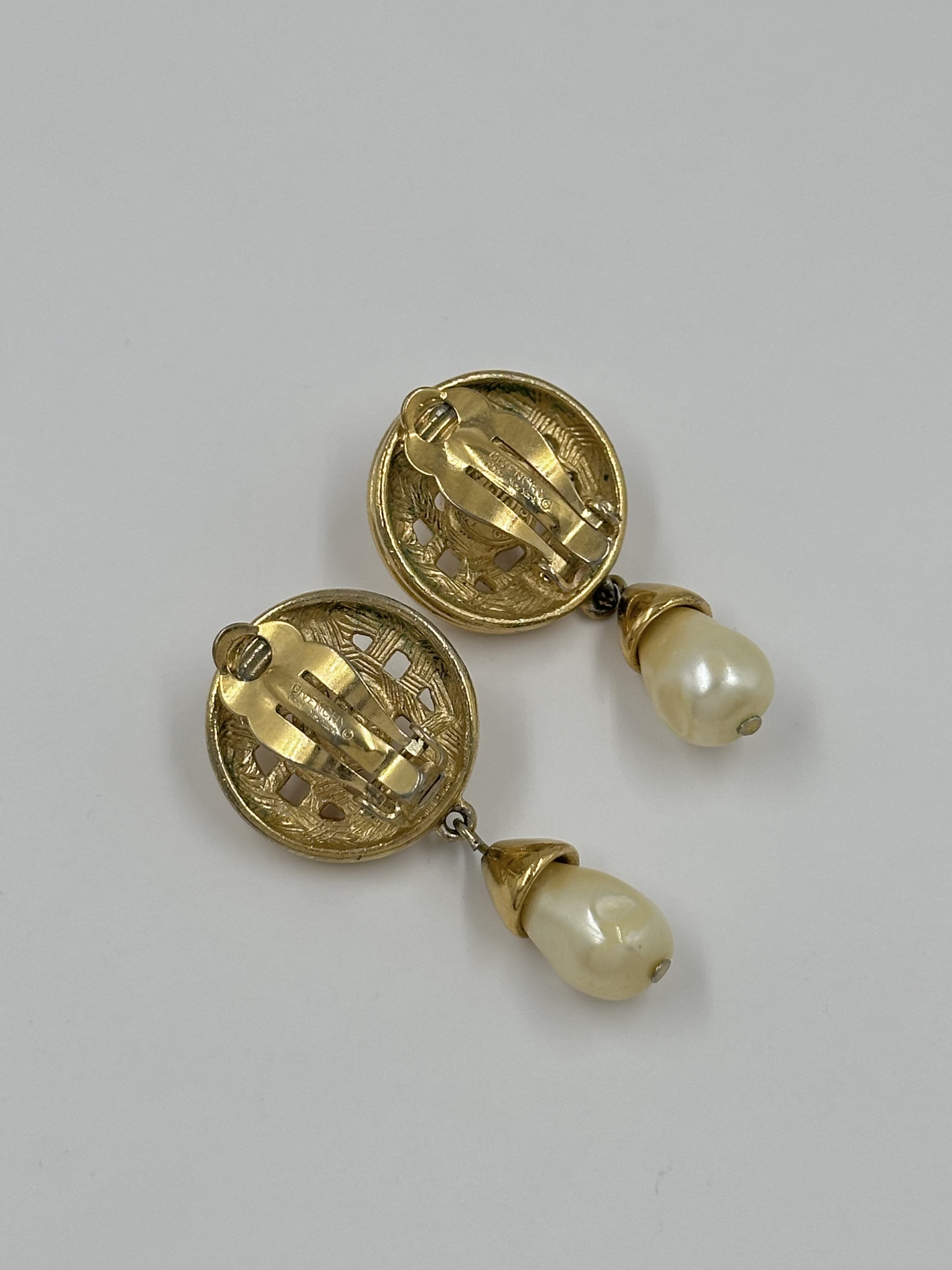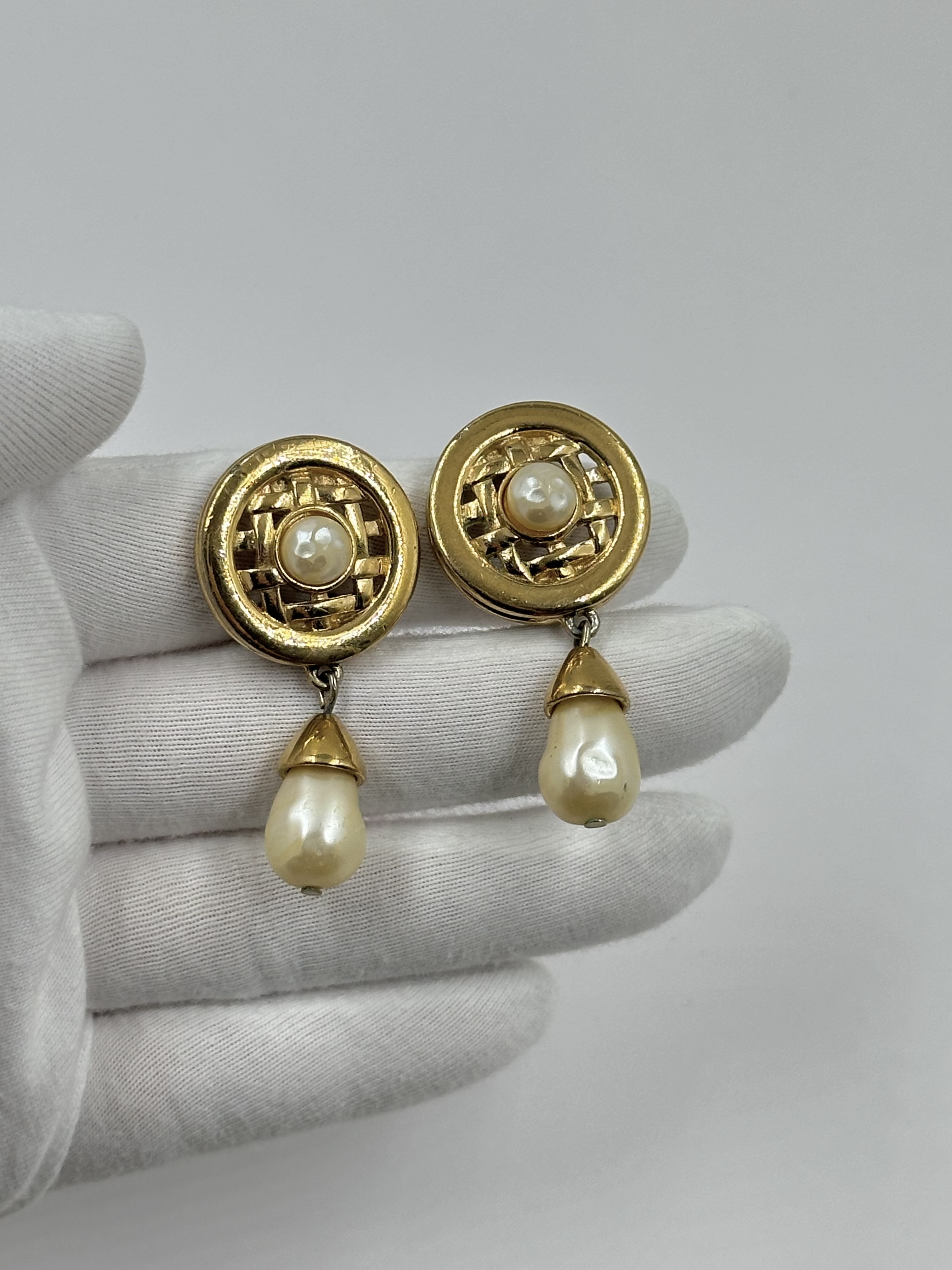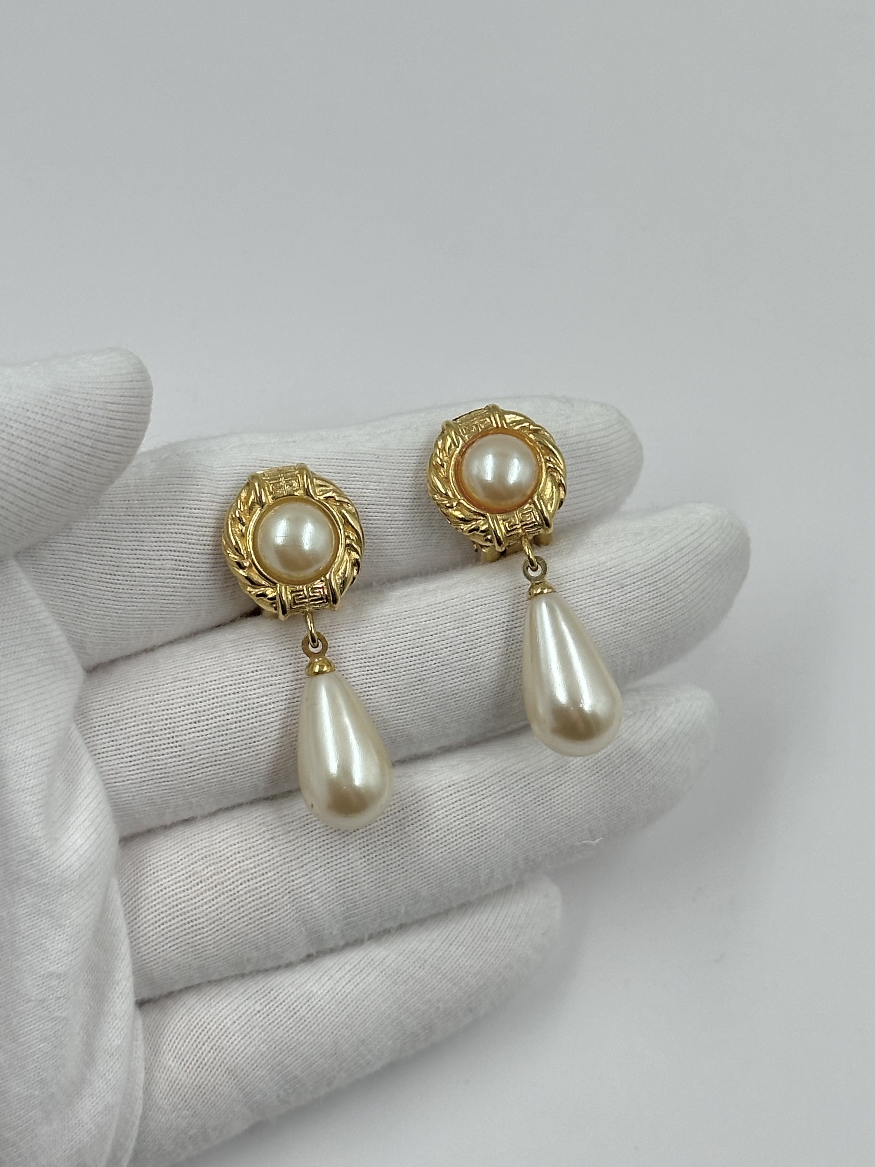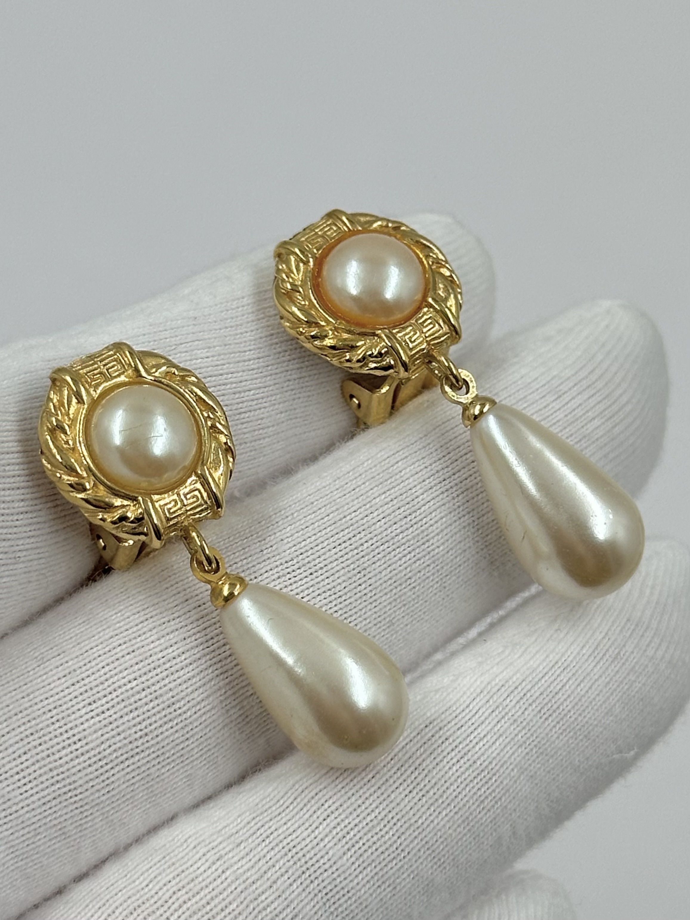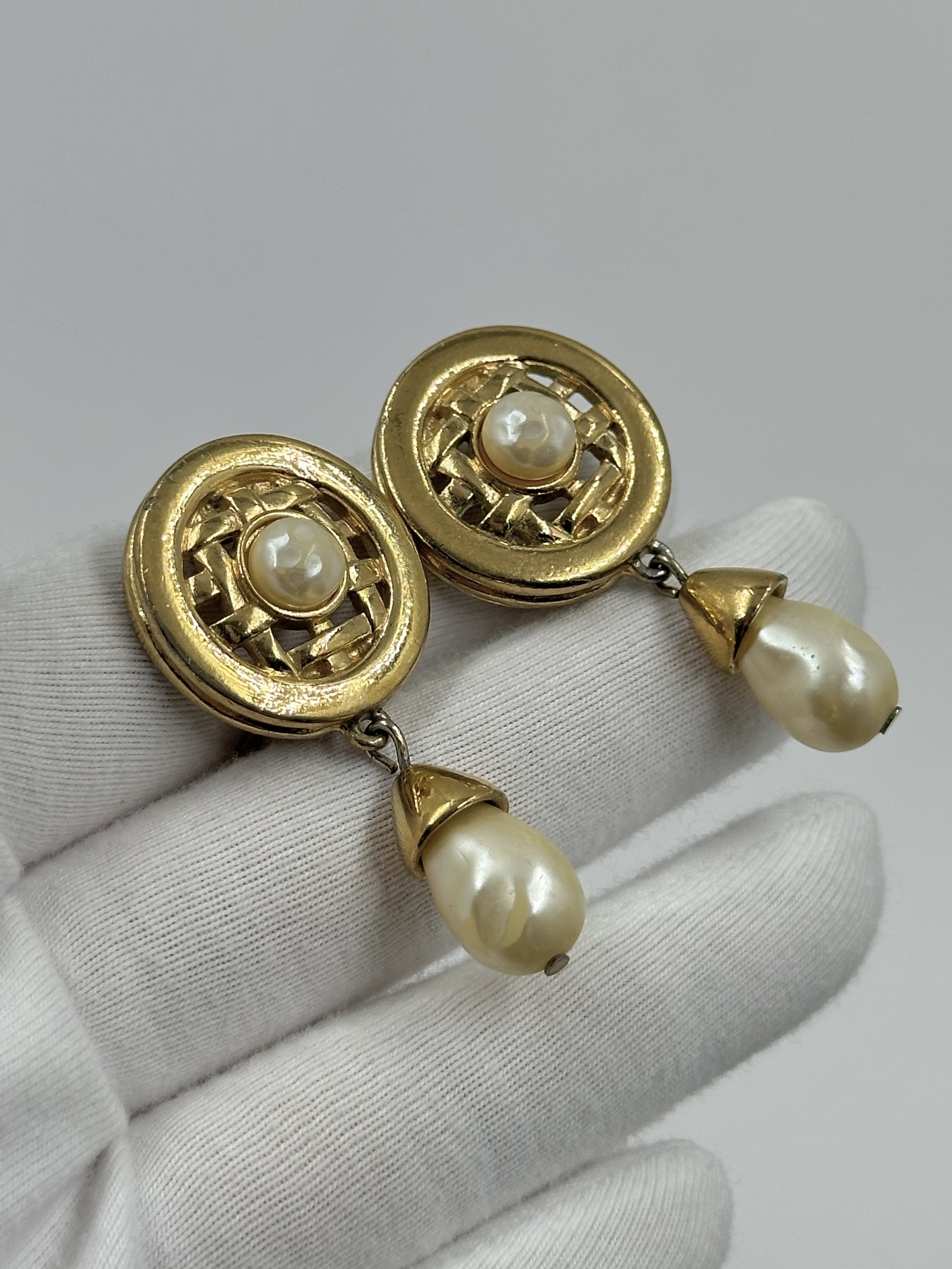 Бижутерный сплав, позолота, имитация жемчуга. Вокруг одной бусины присутствуют следы клея. Размер в длину 3,7см.