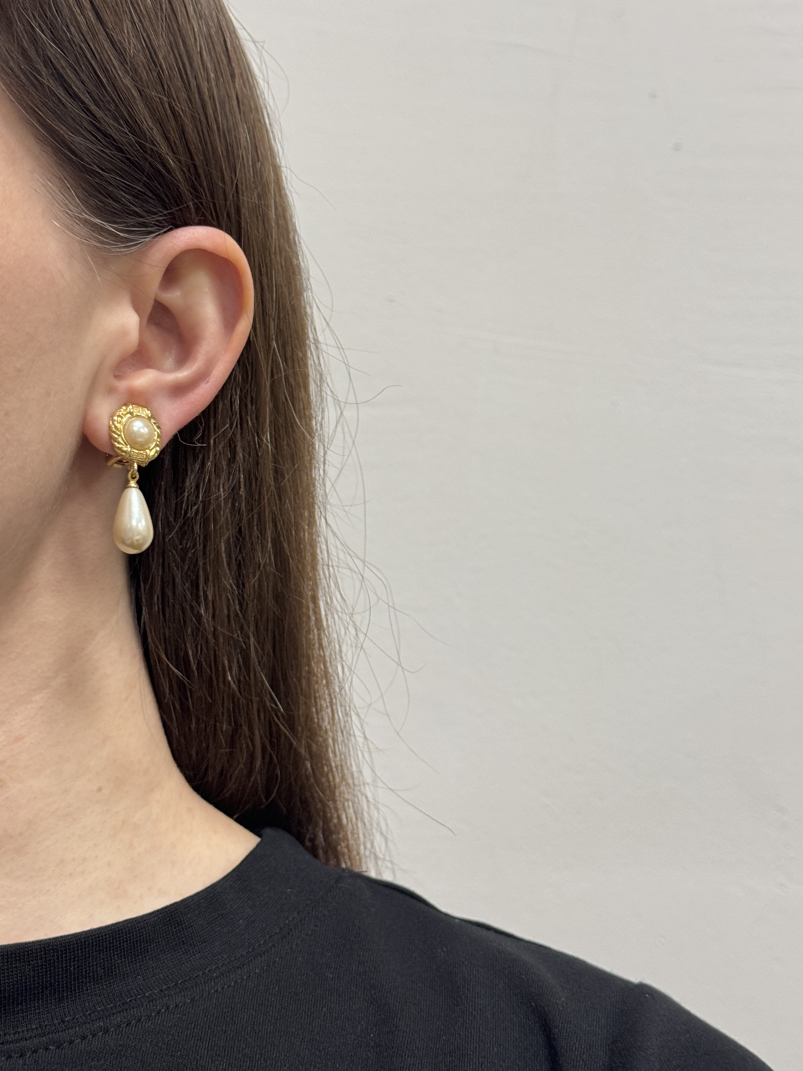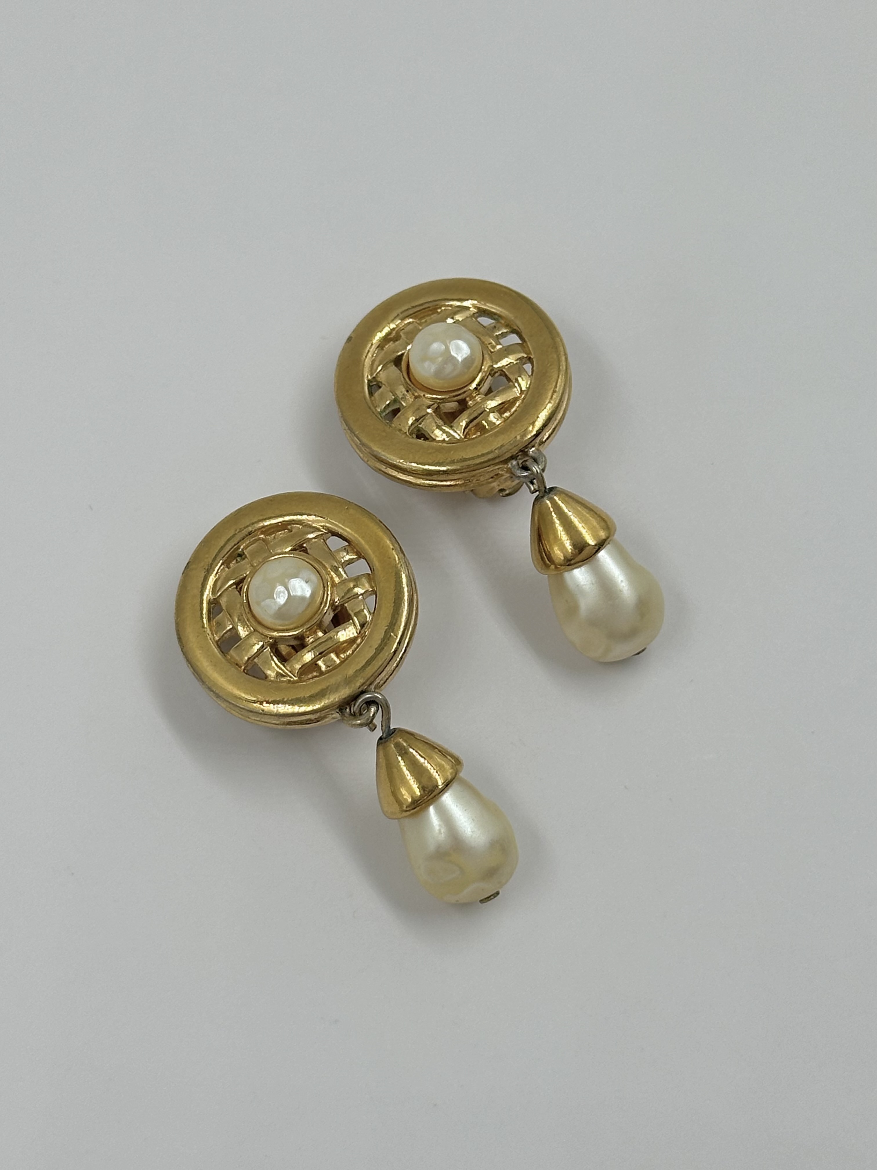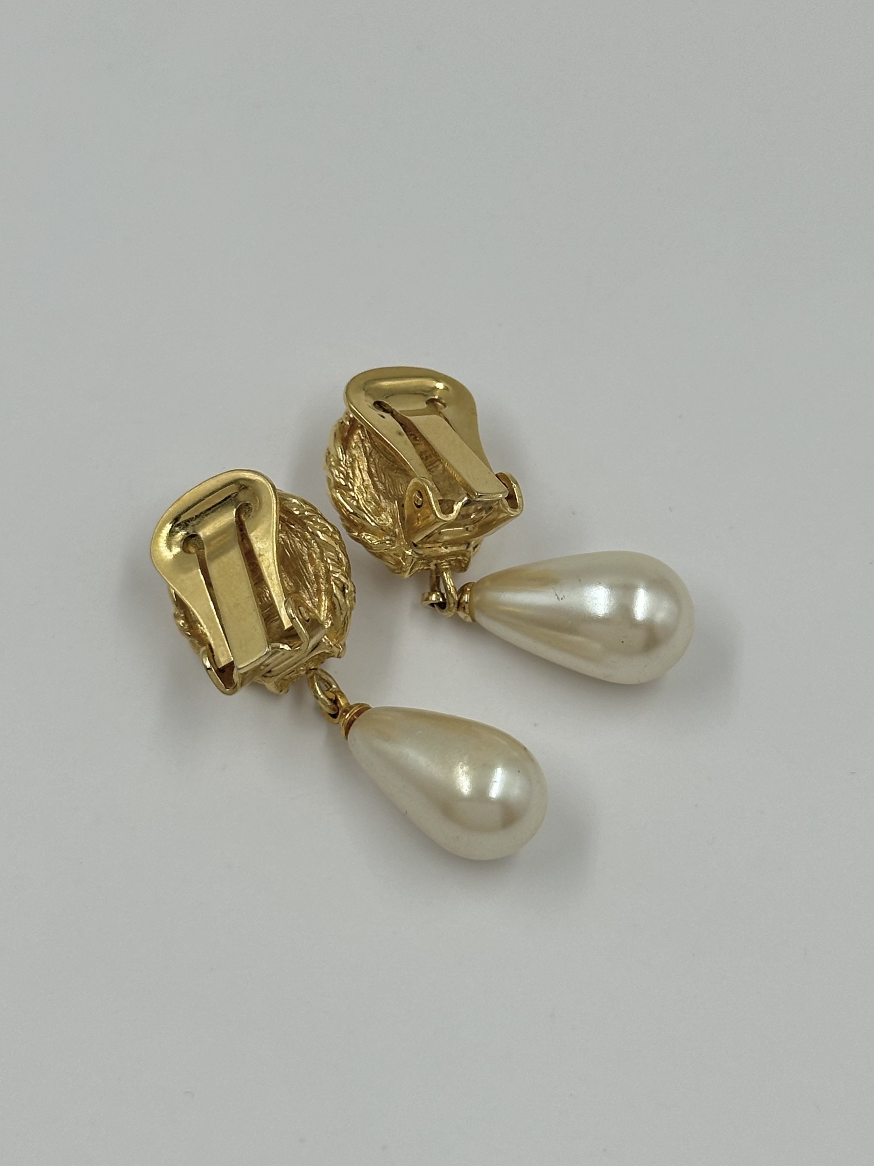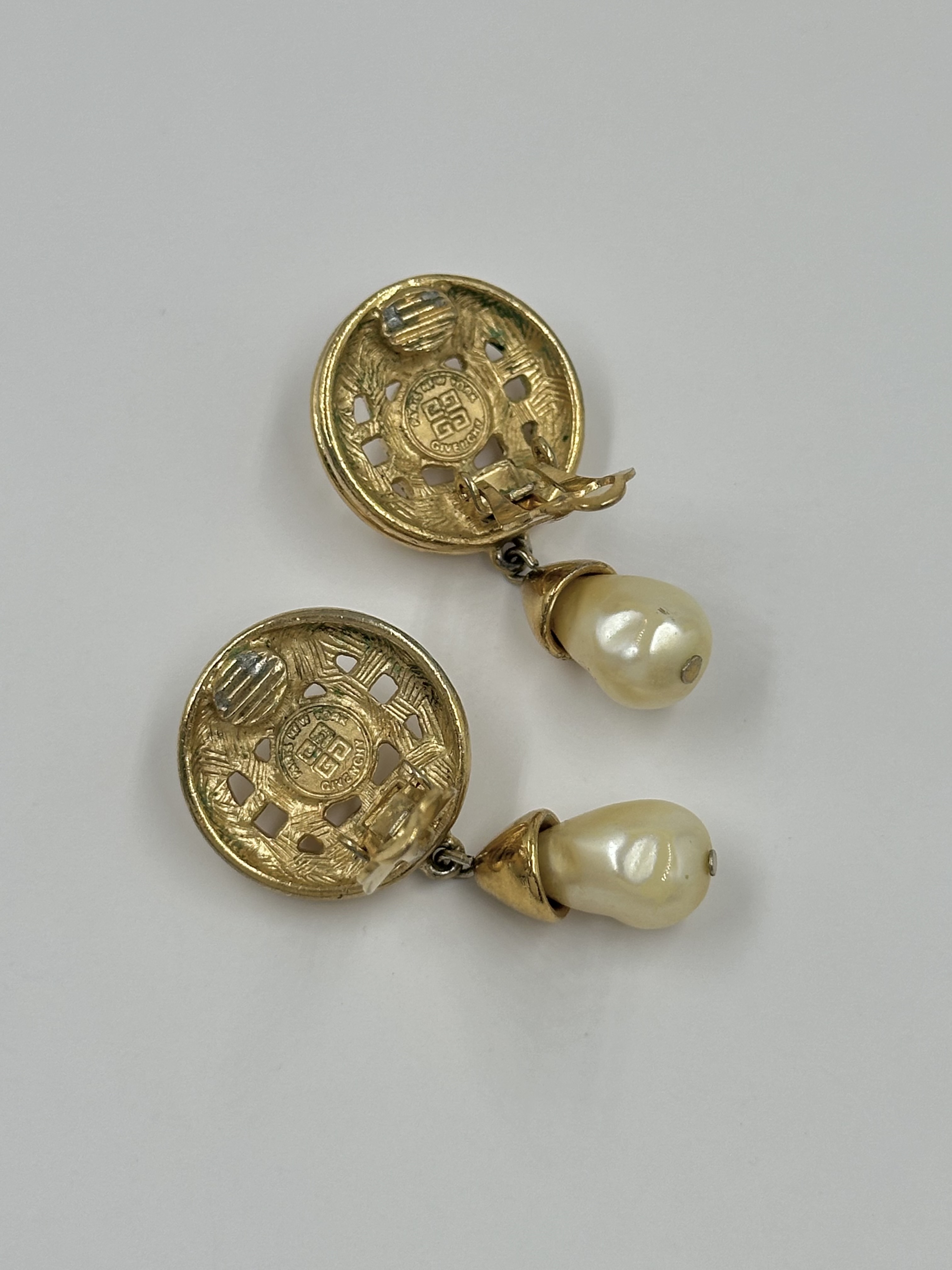 Бижутерный сплав, позолота, имитация жемчуга. Вокруг одной бусины присутствуют следы клея. Размер в длину 3,7см.
