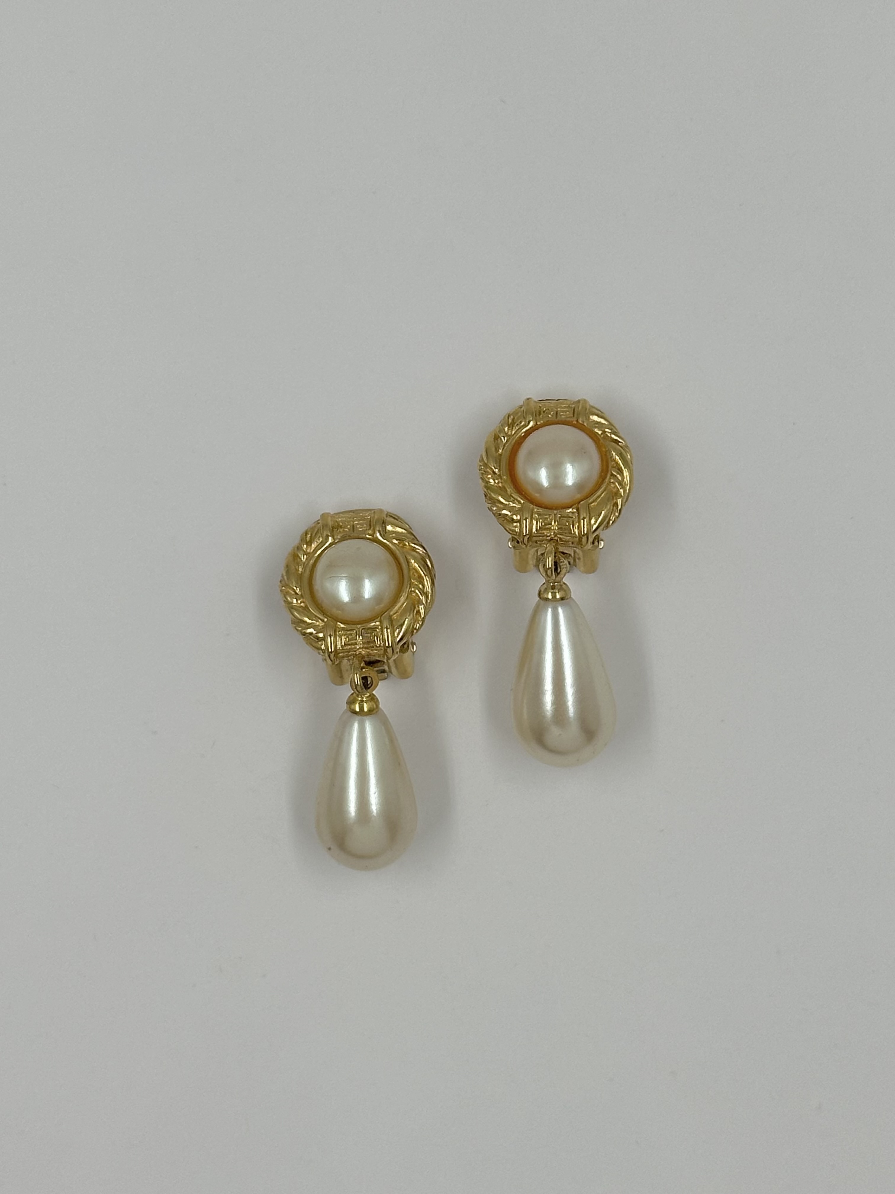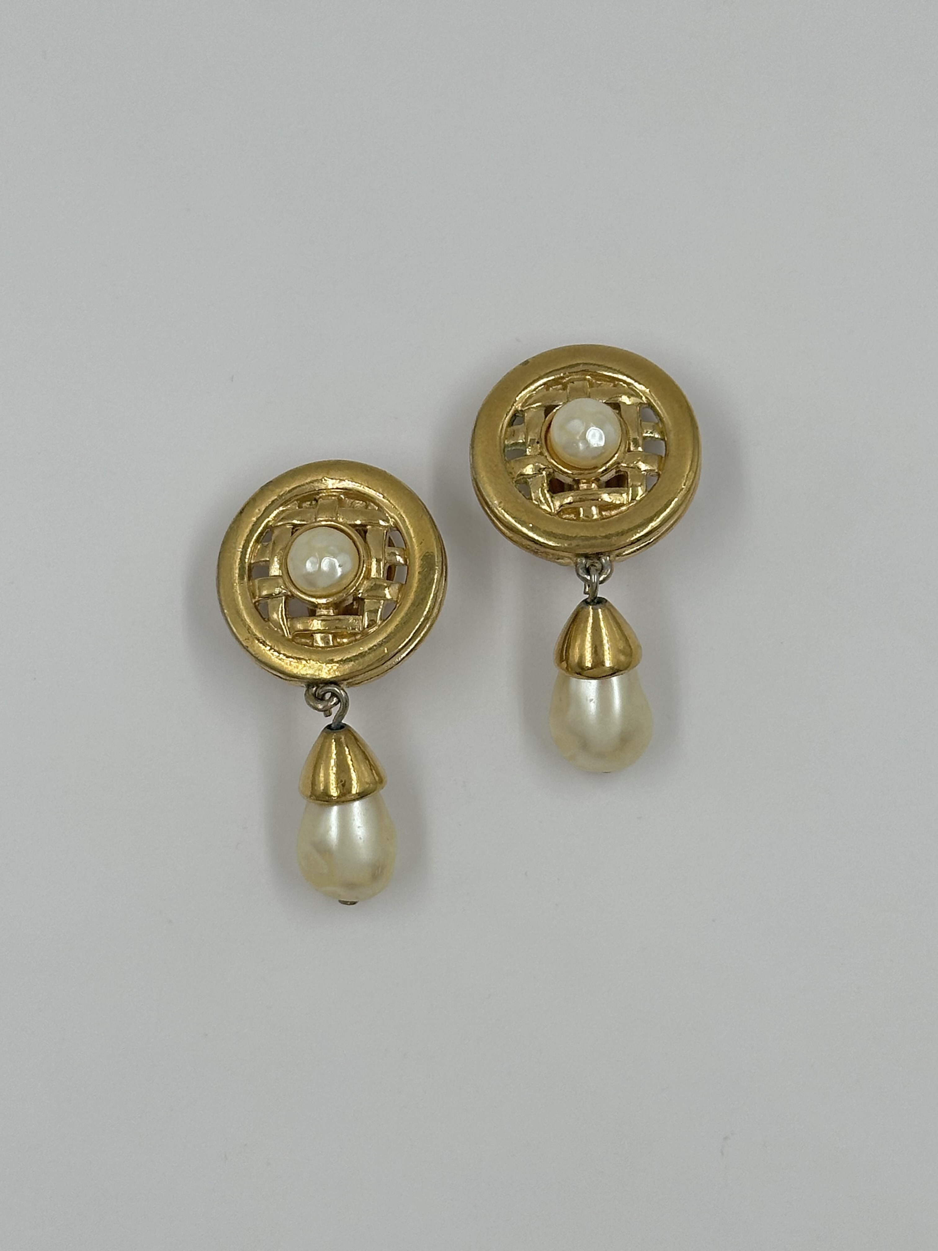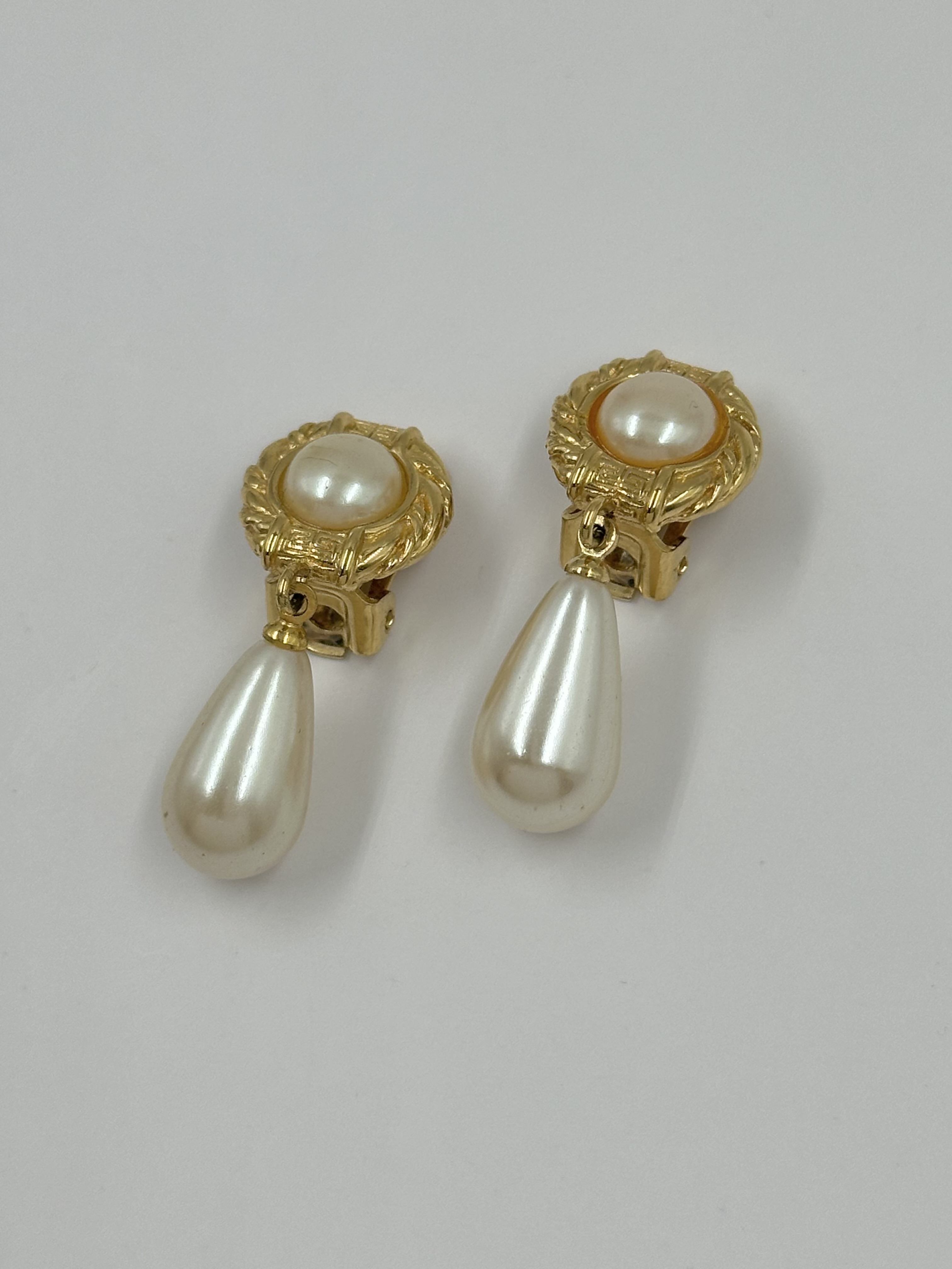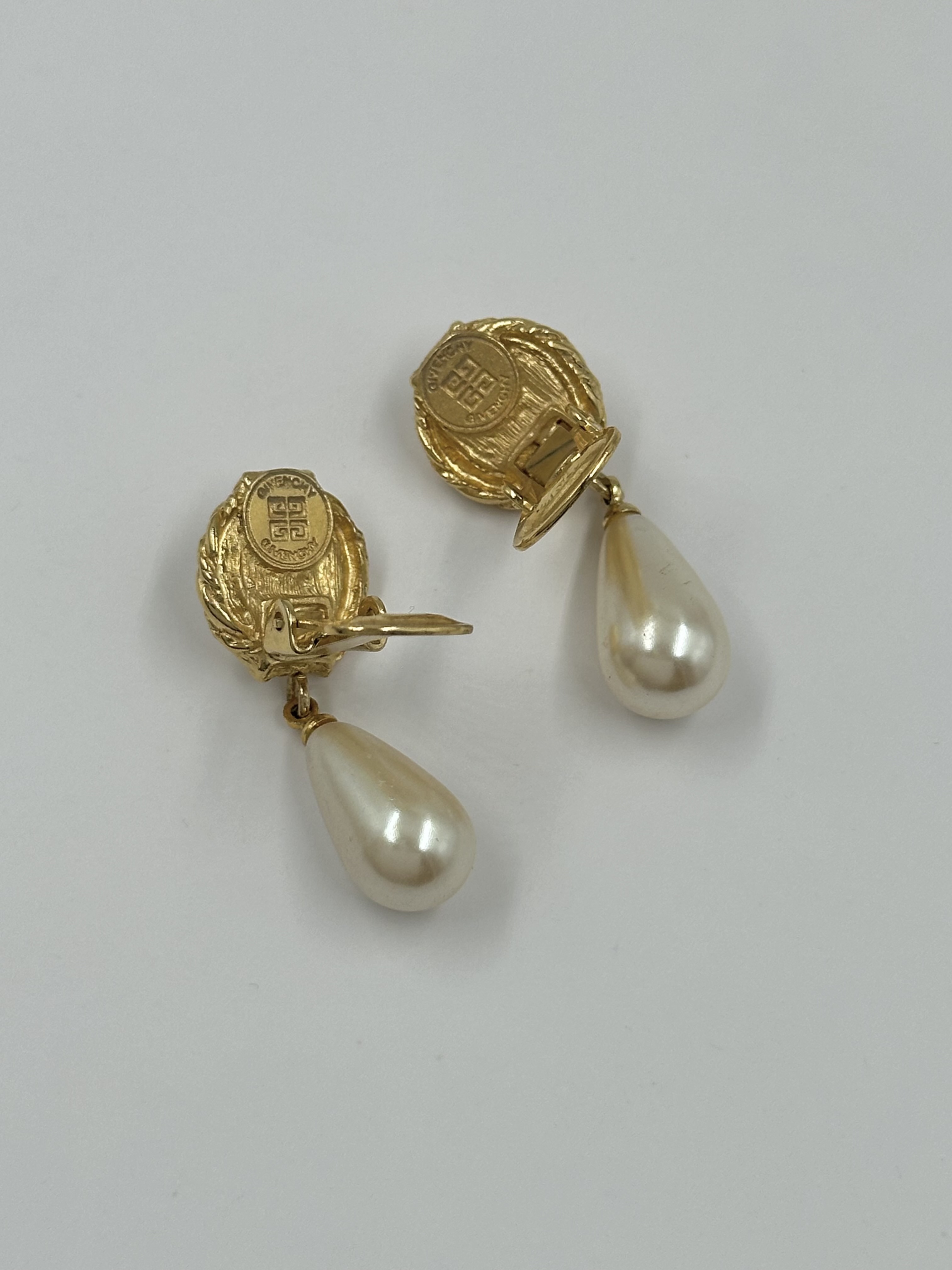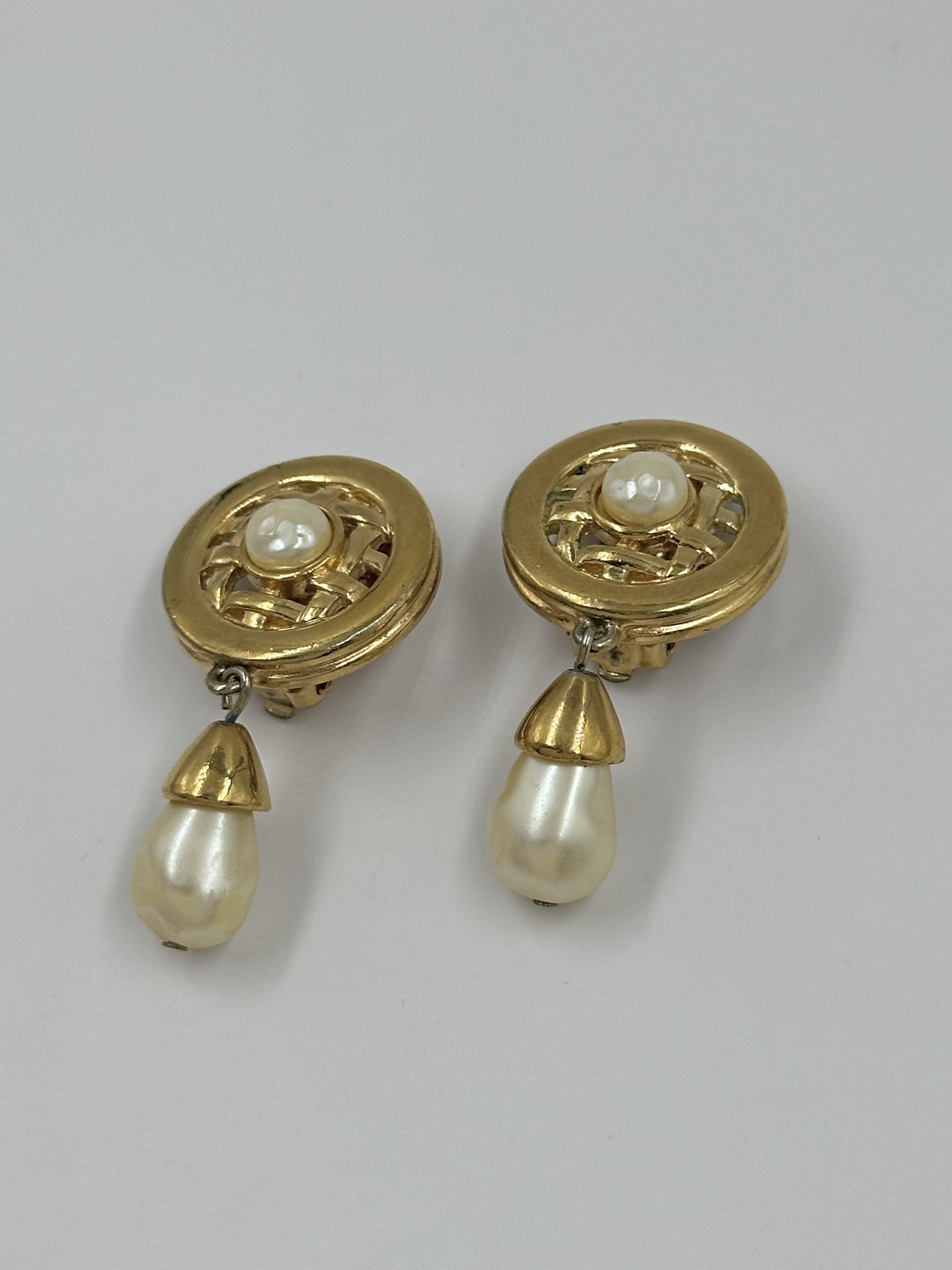 Бижутерный сплав, позолота, имитация жемчуга. Вокруг одной бусины присутствуют следы клея. Размер в длину 3,7см.