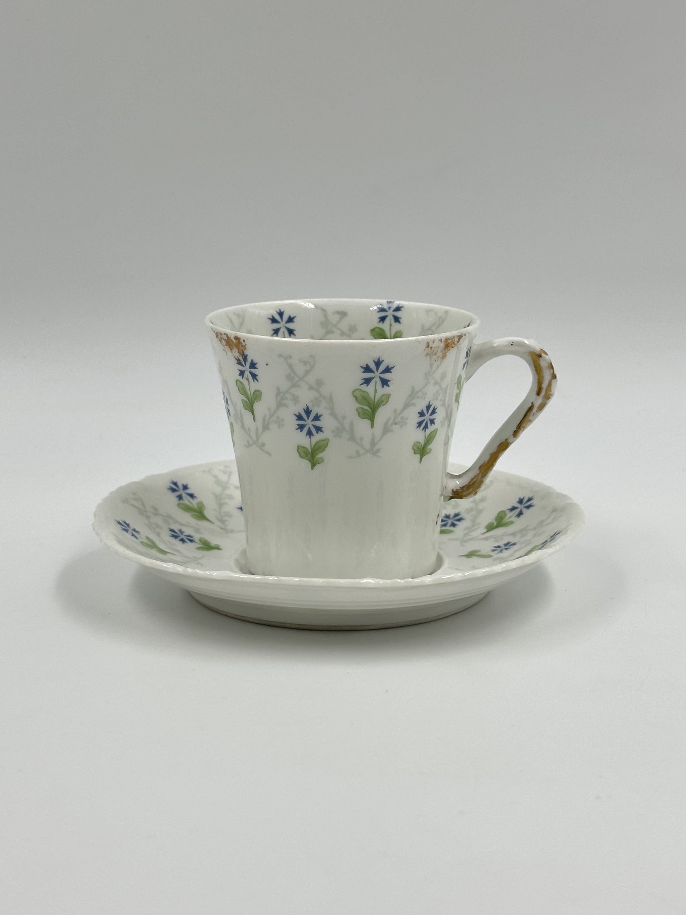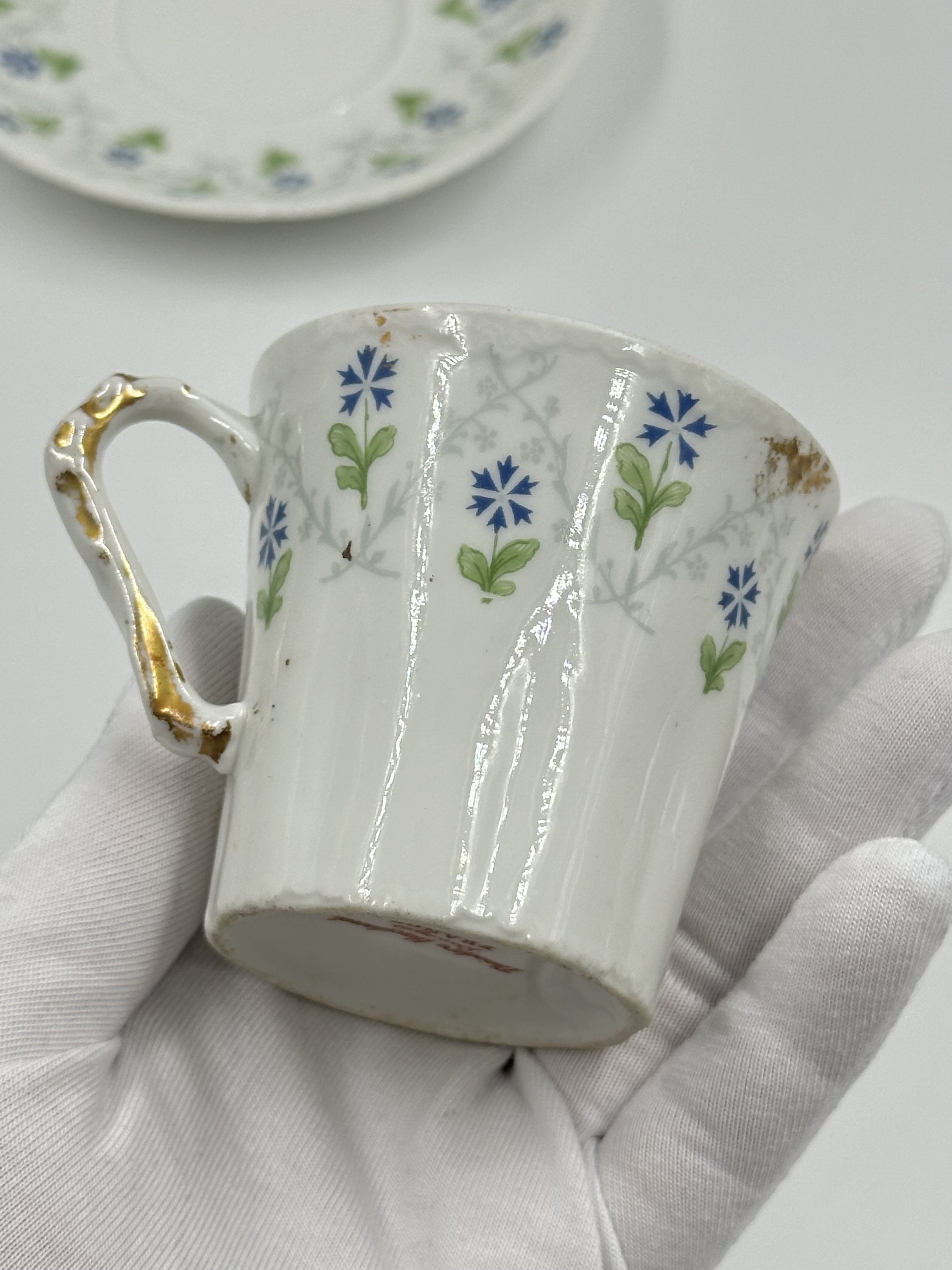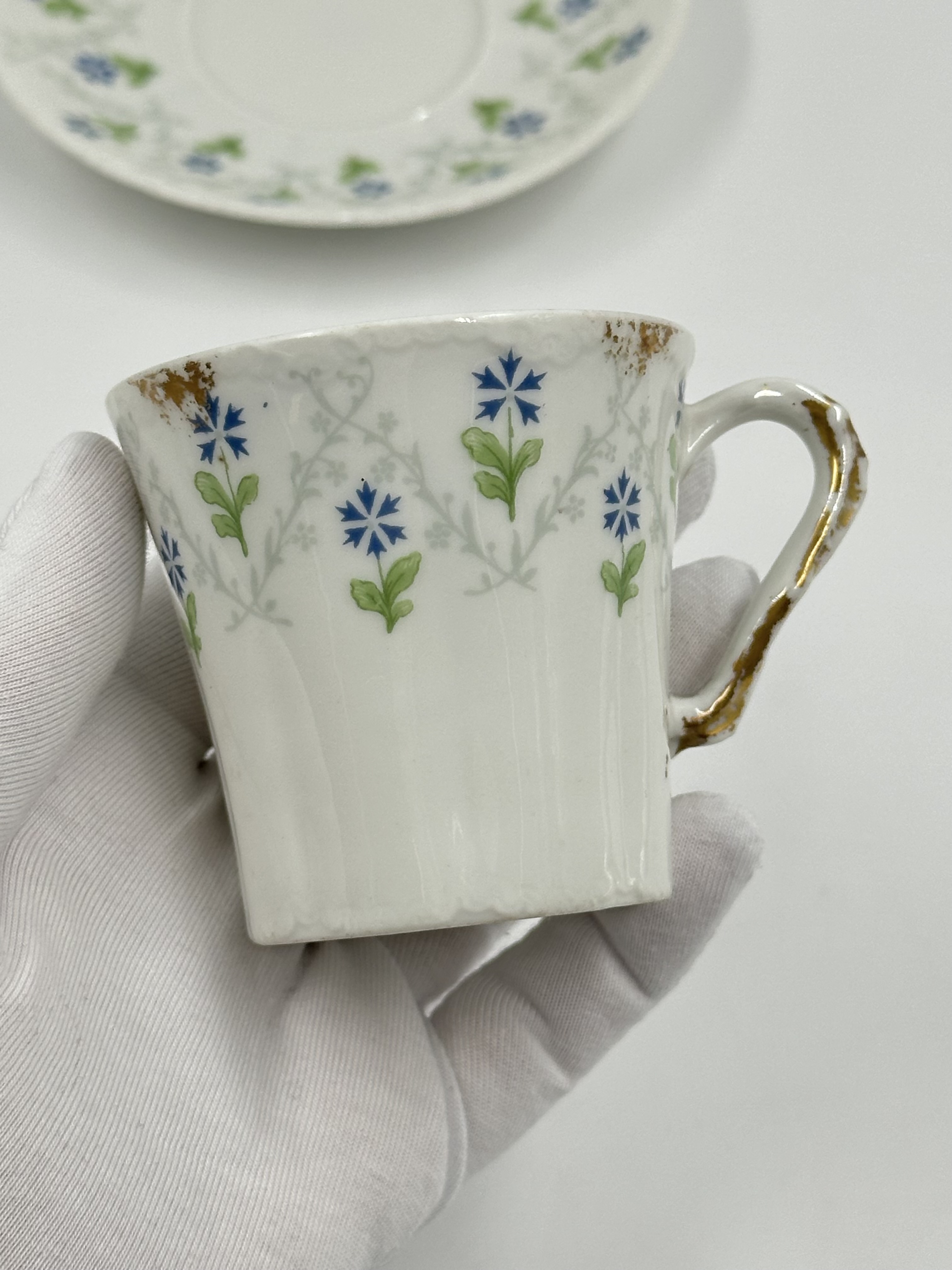 Фарфор. Присутствуют небольшие потертости позолоты. Диаметр блюдца 11,7см, объём чашки 100 мл. 1900е годы.