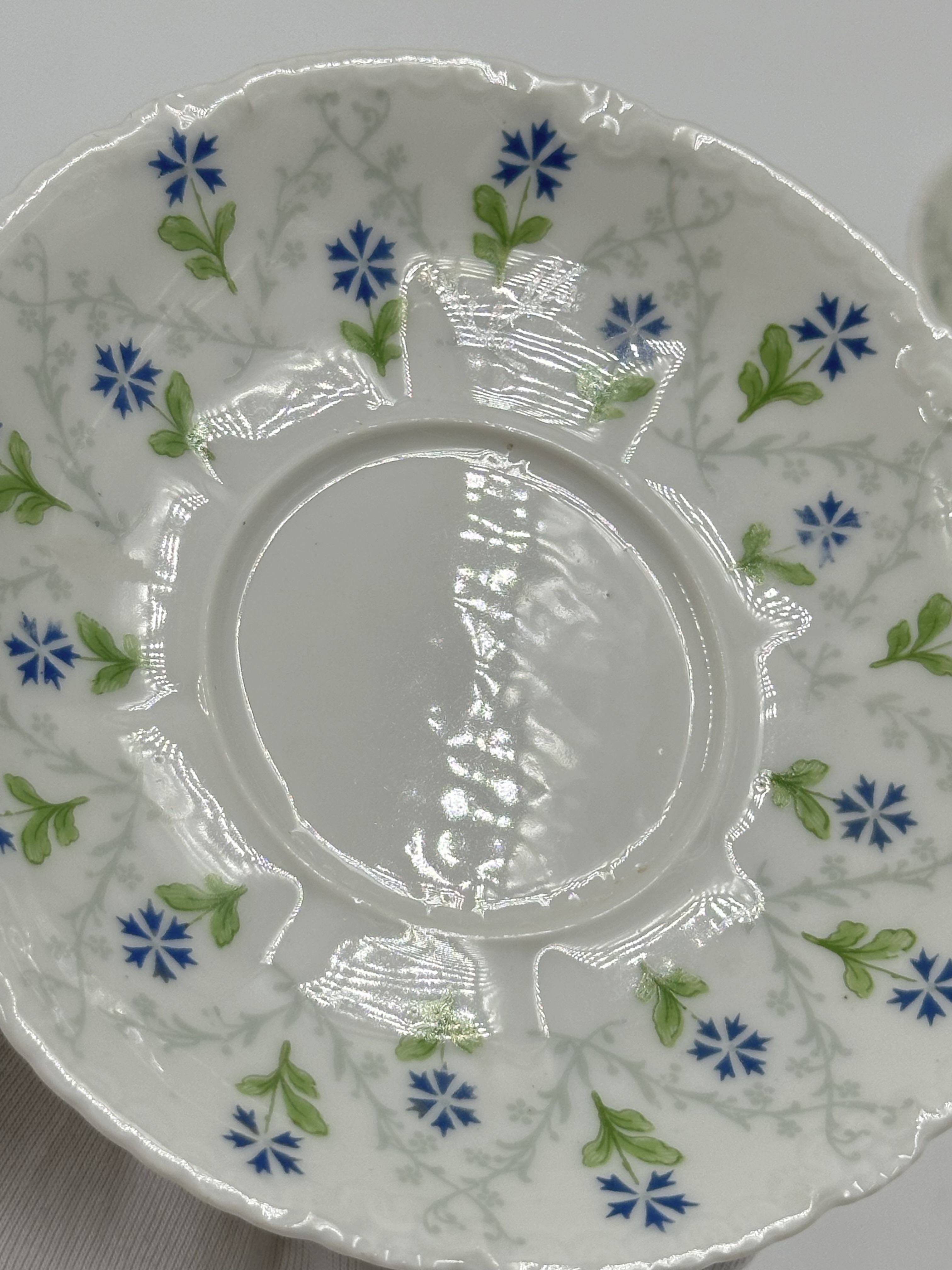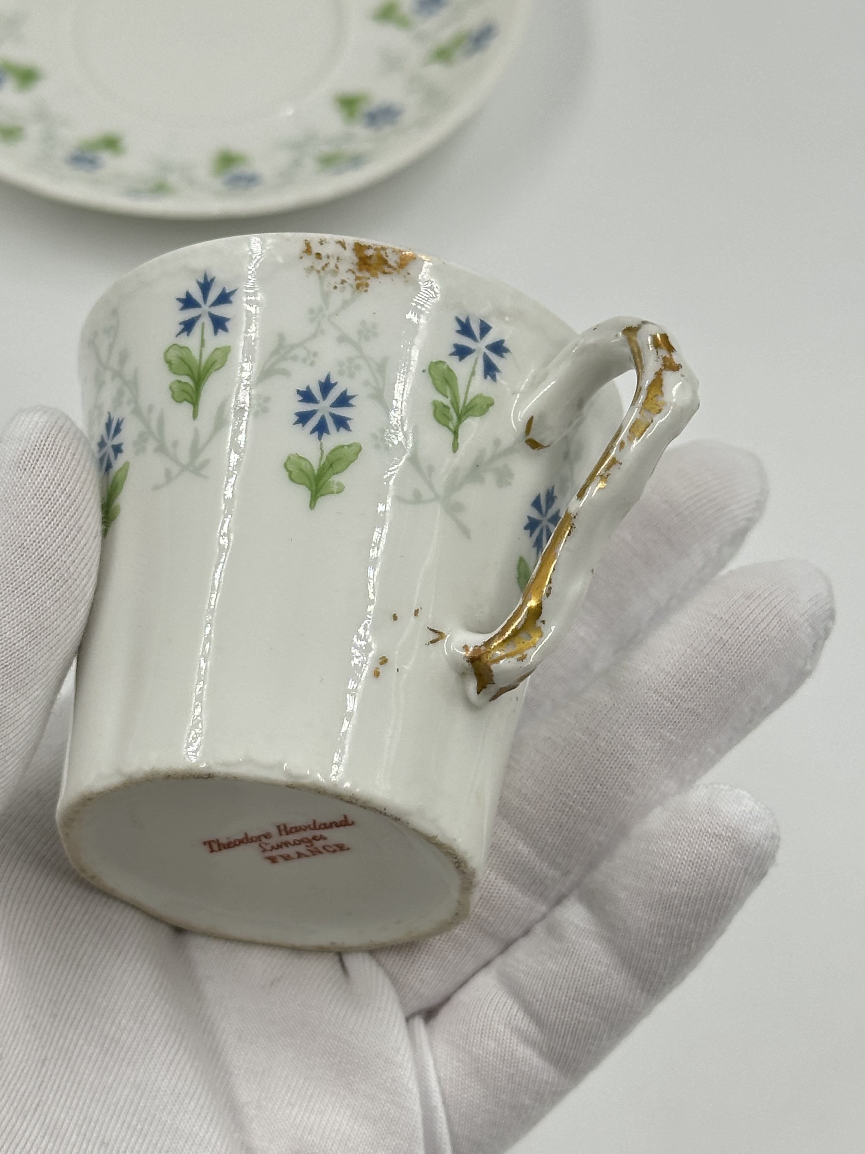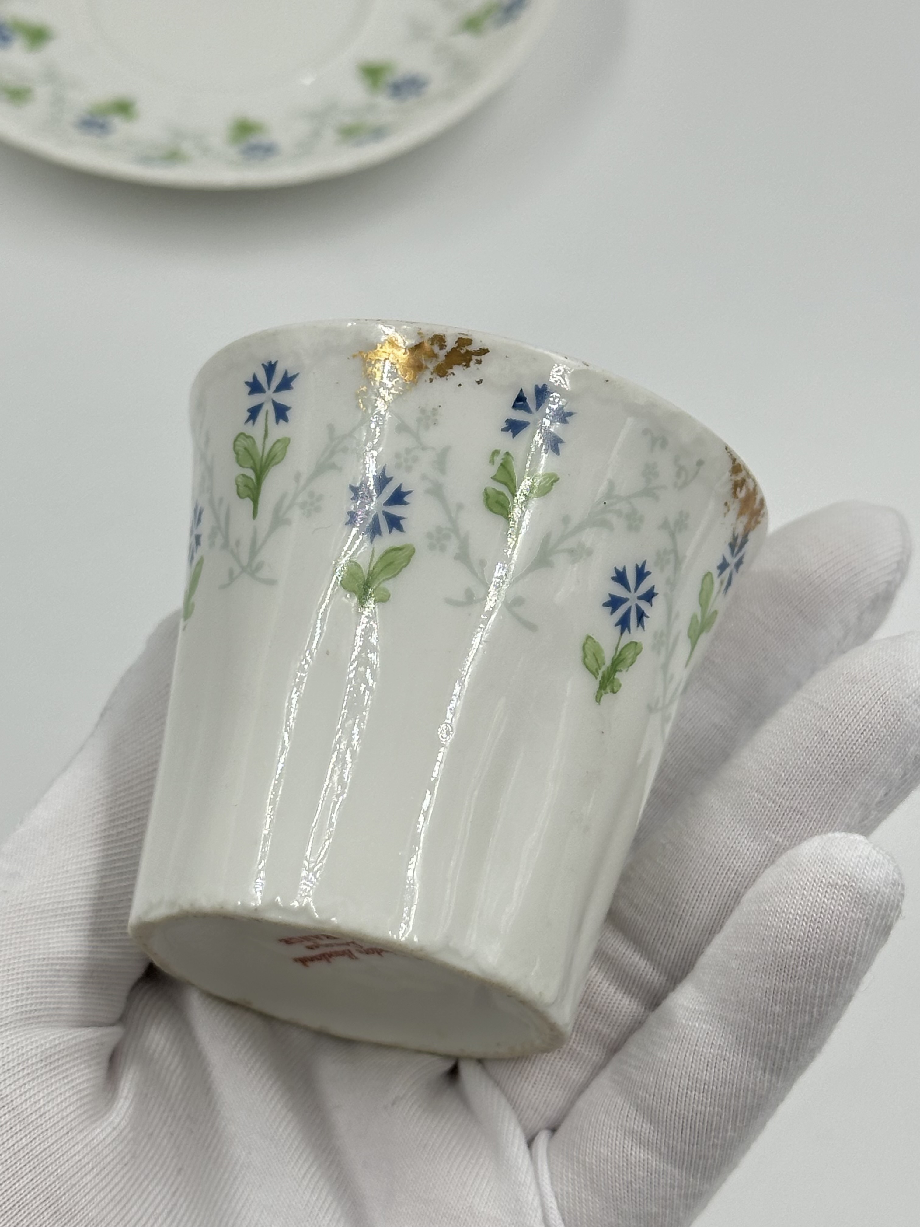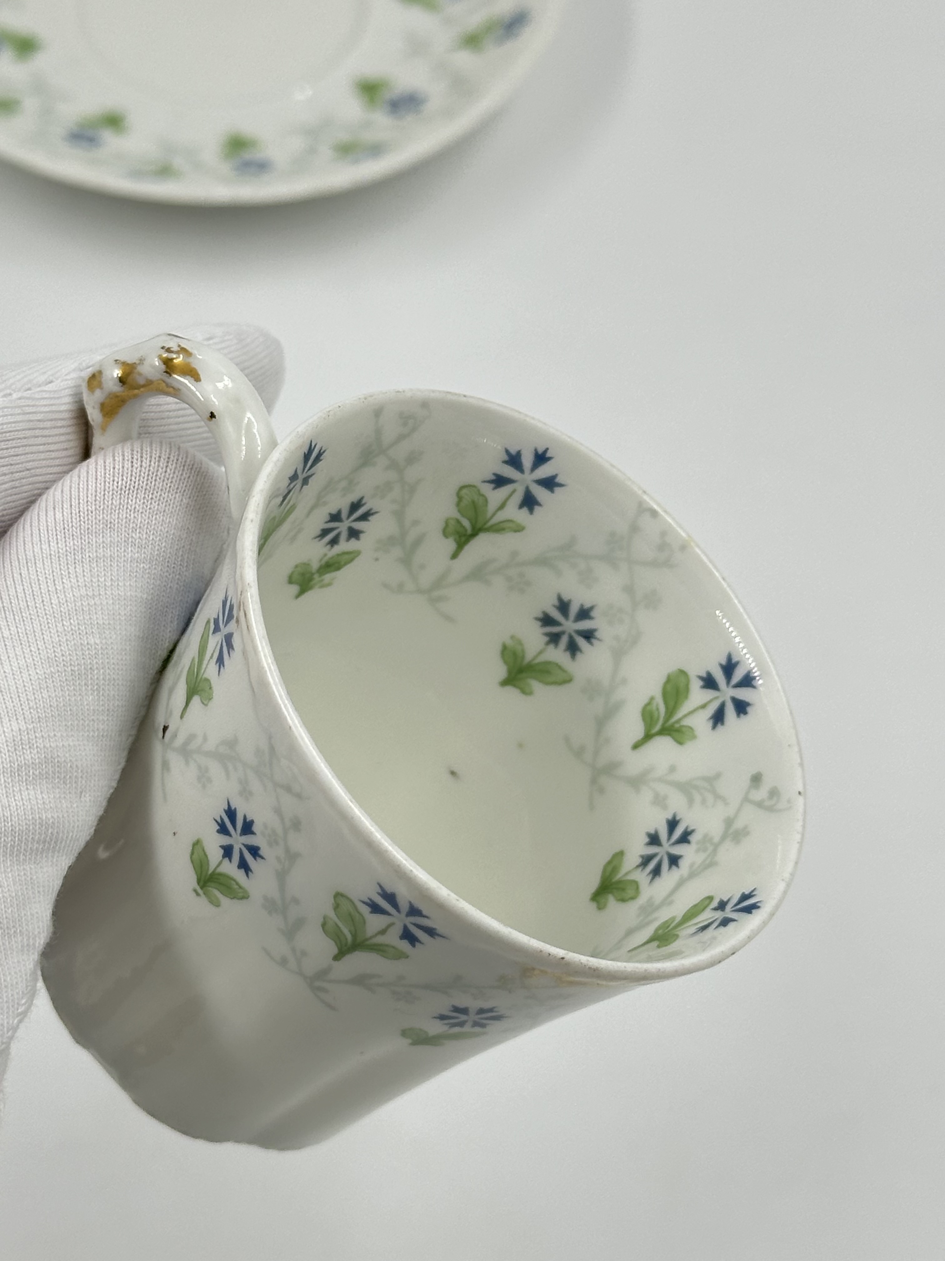 Фарфор. Присутствуют небольшие потертости позолоты. Диаметр блюдца 11,7см, объём чашки 100 мл. 1900е годы.