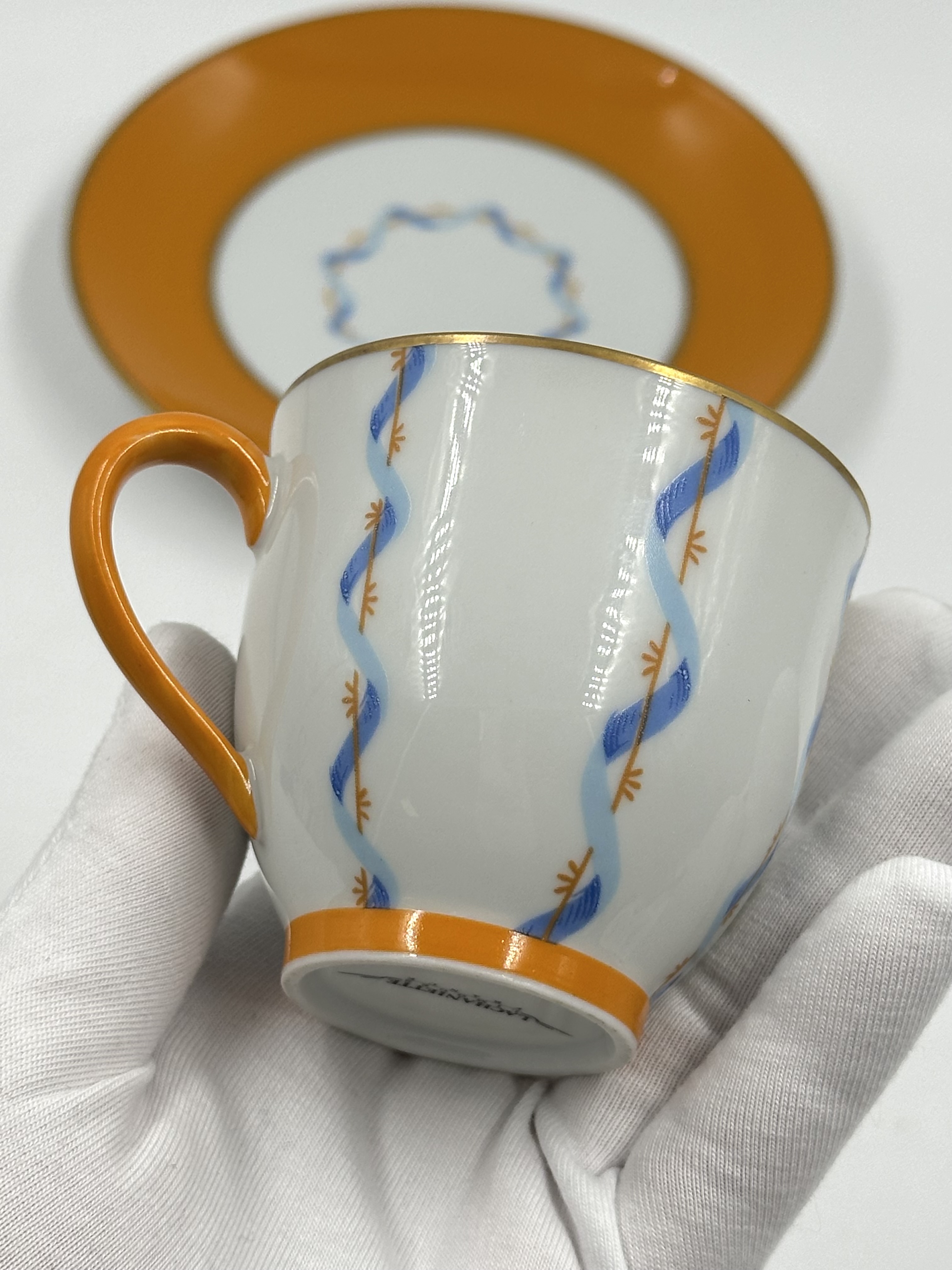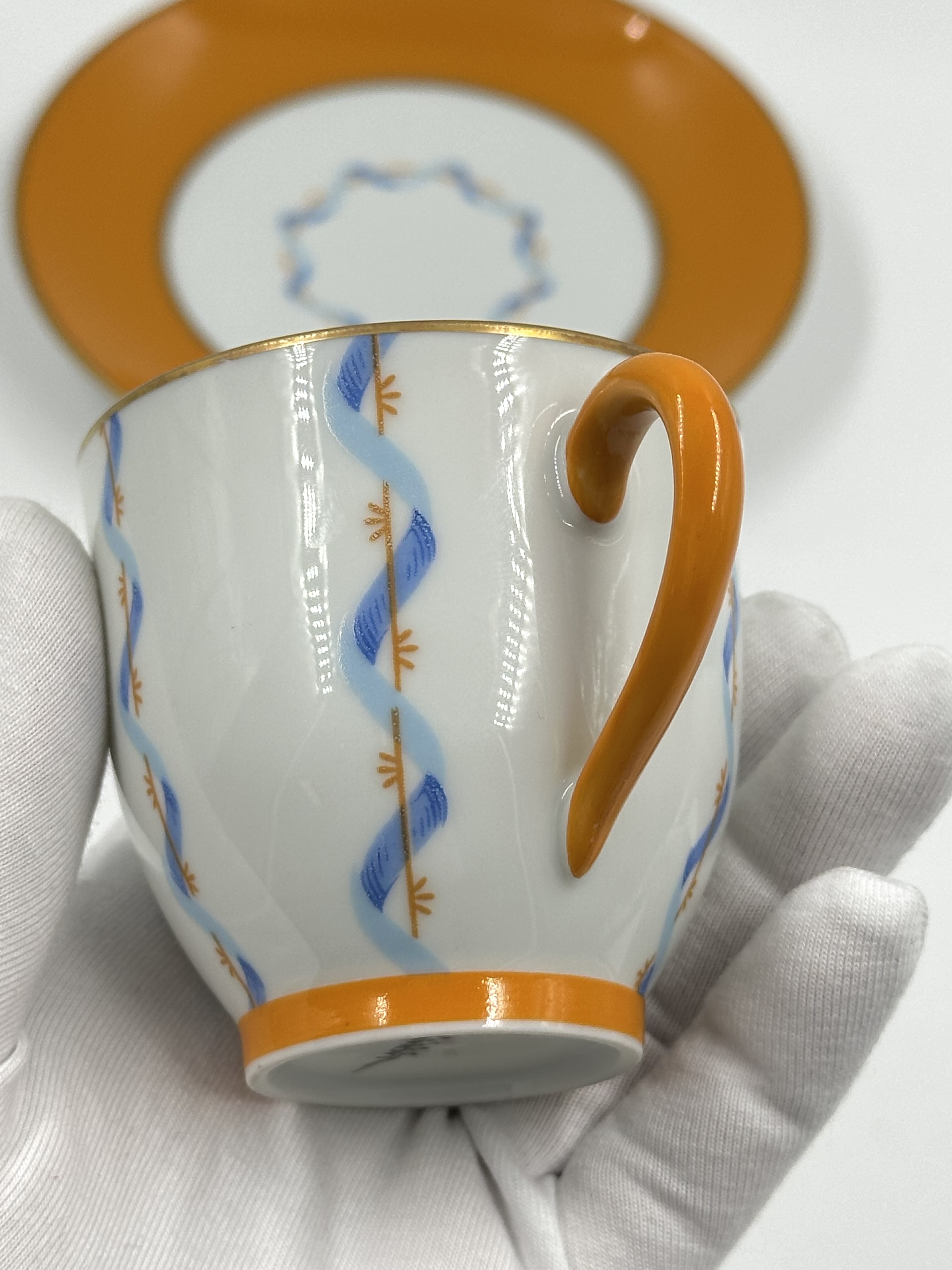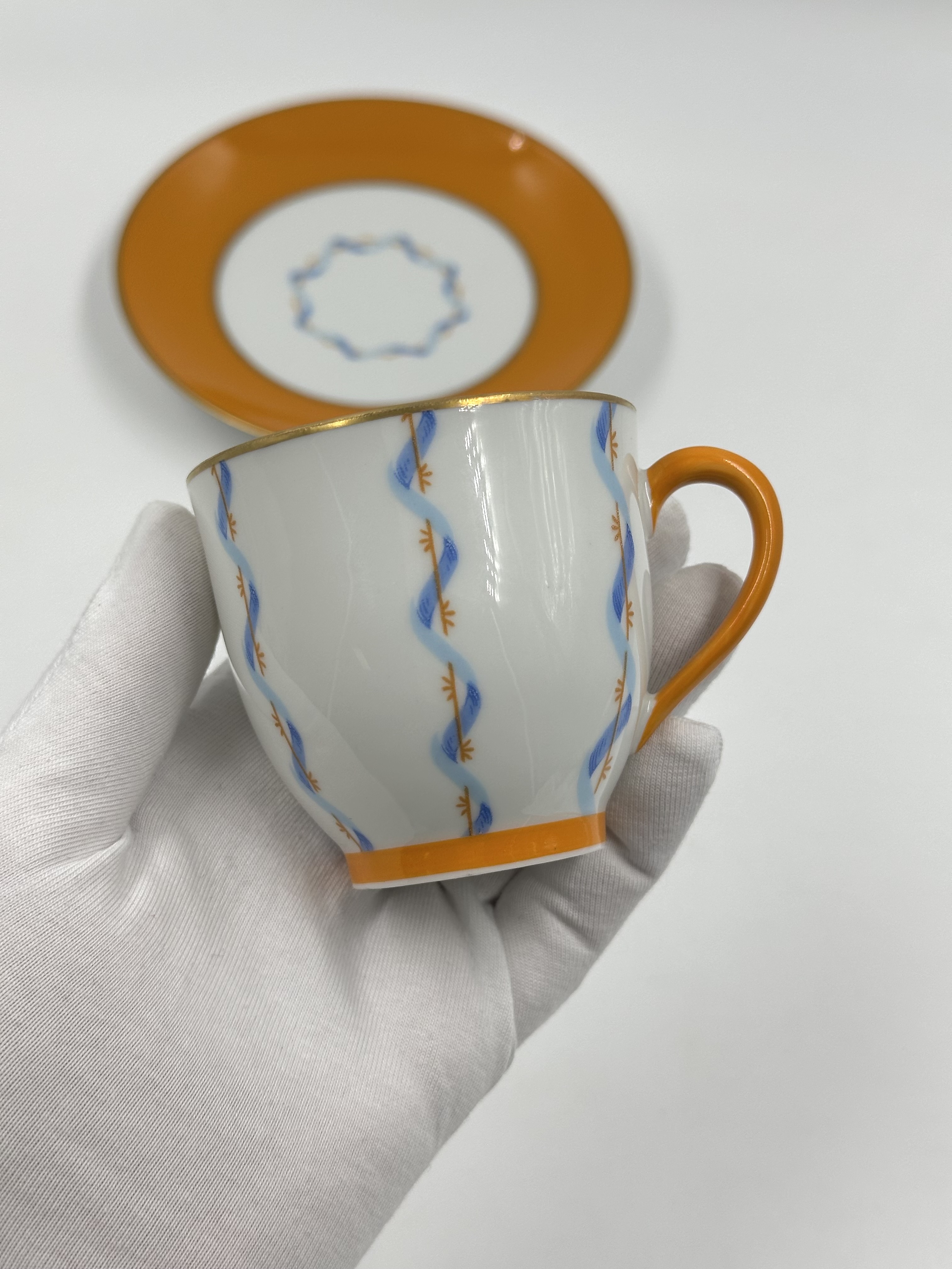 Фарфор, деколь. Диаметр блюдца 13,3см. Объём чашки 120мл.