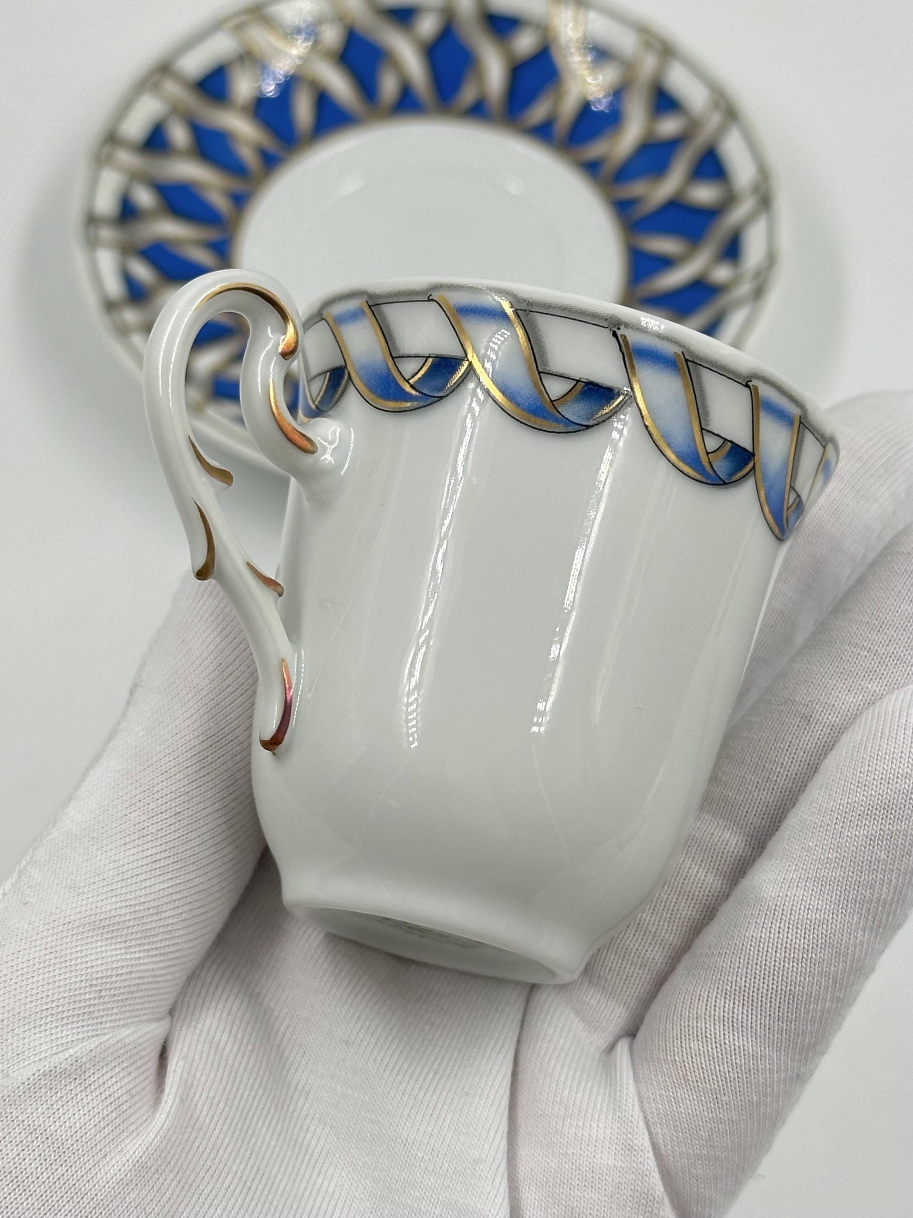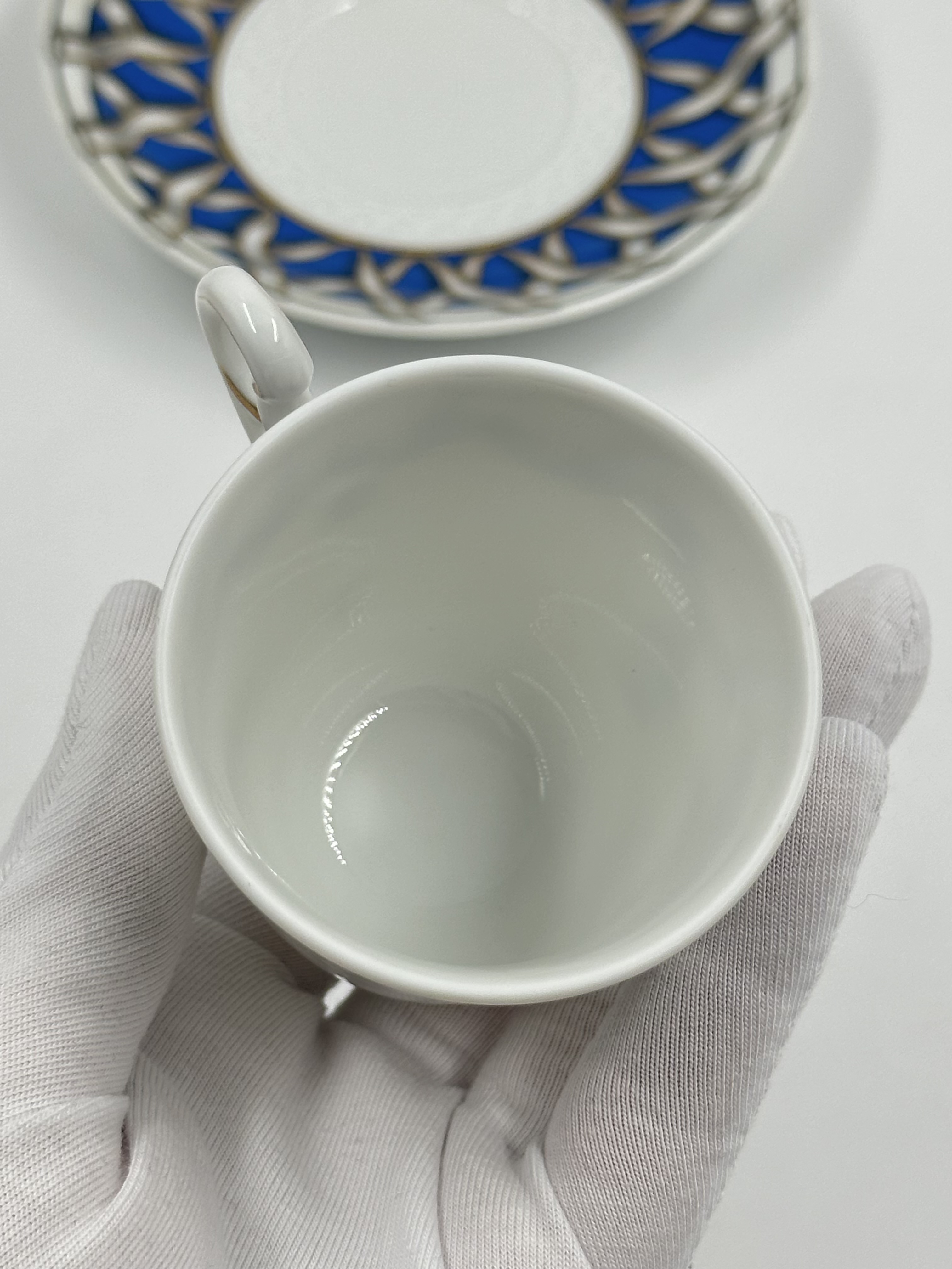 Фарфор. Диаметр блюдца 11,3см, объем чашки 75мл. На ручках присутствует потемнение позолоты. В наличии несколько.