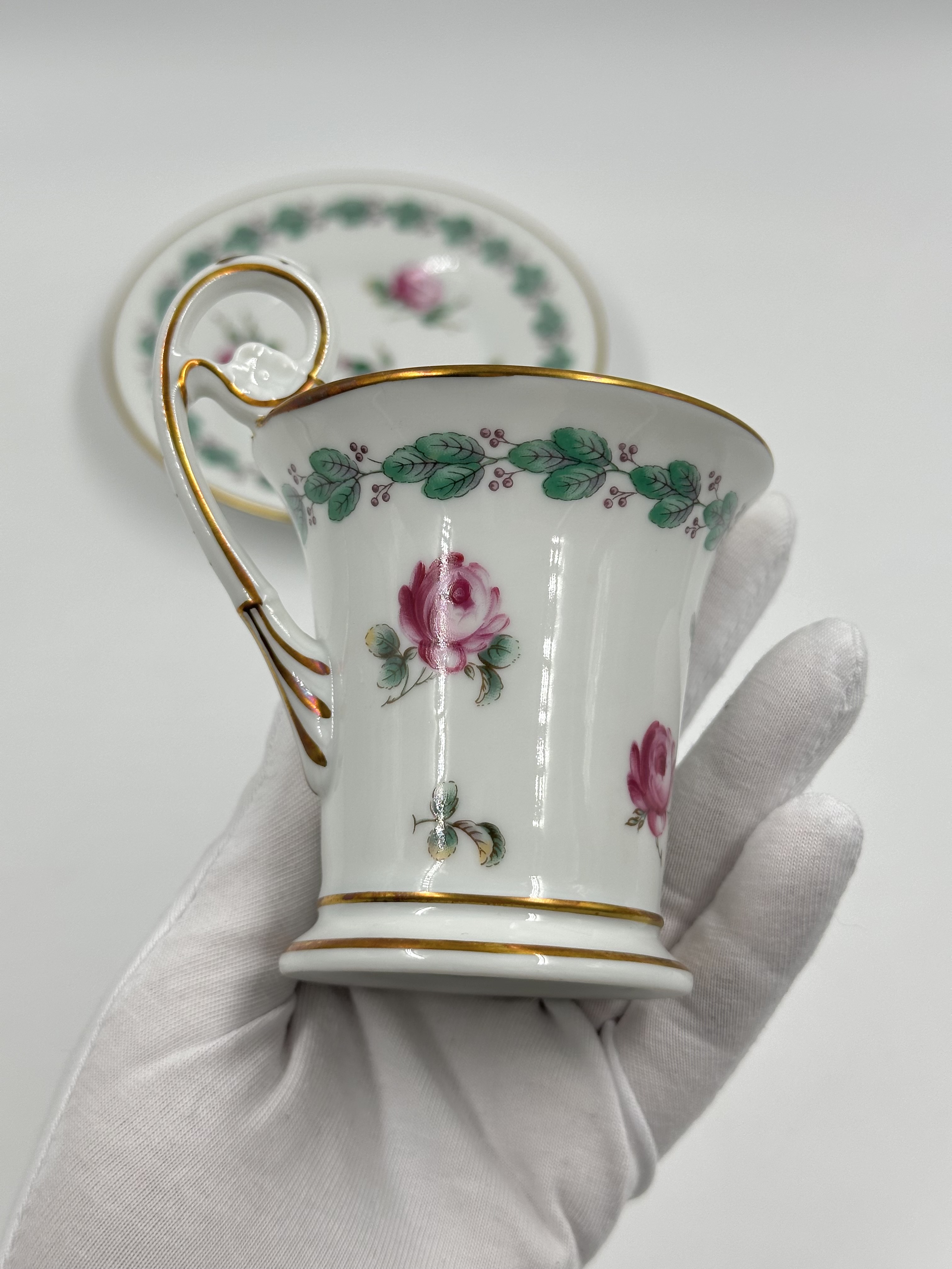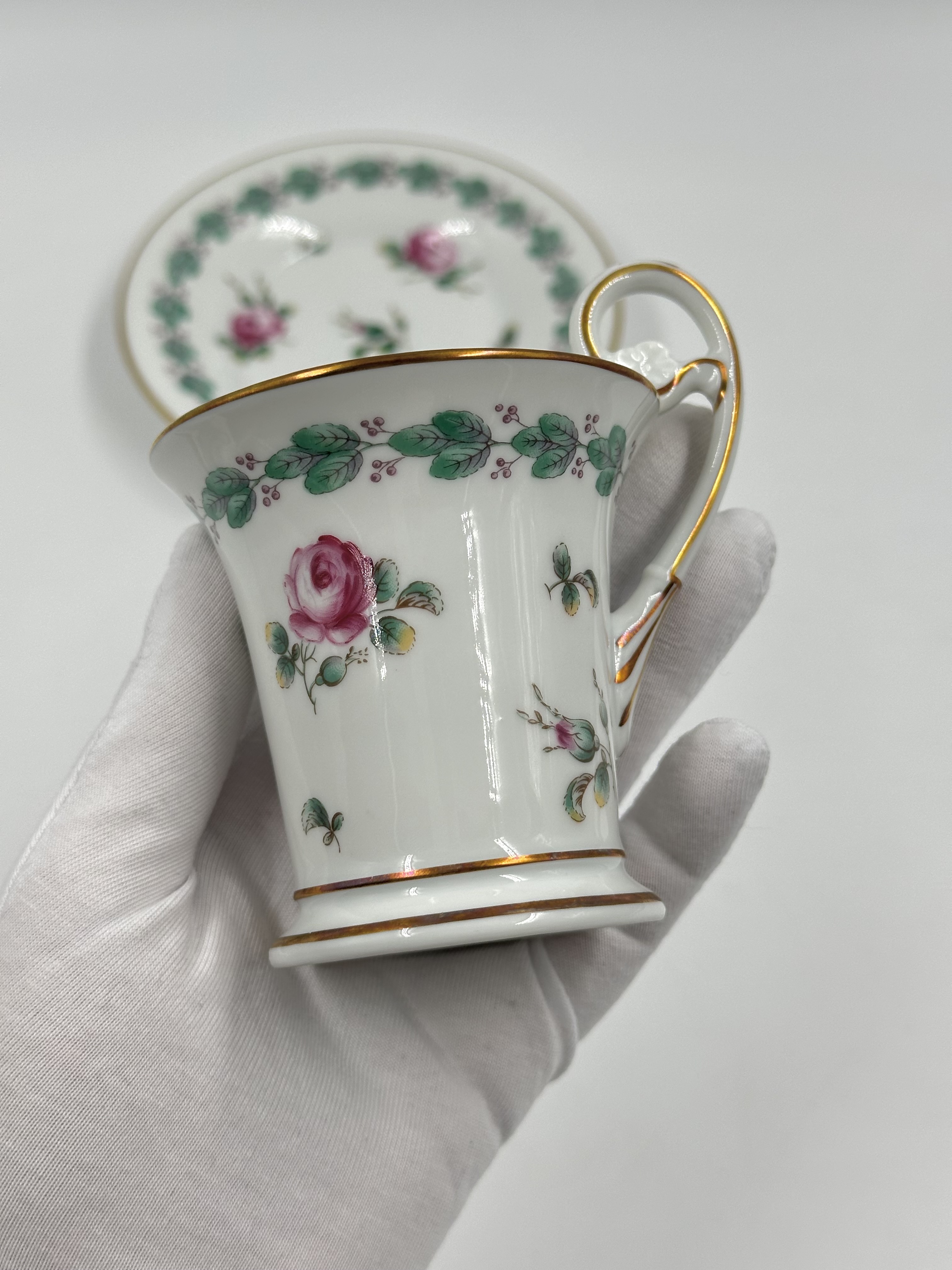 Фарфор. Диаметр блюдца 12,6см, объем чашки 100мл. На ручках присутствует потемнение позолоты. В наличии несколько.