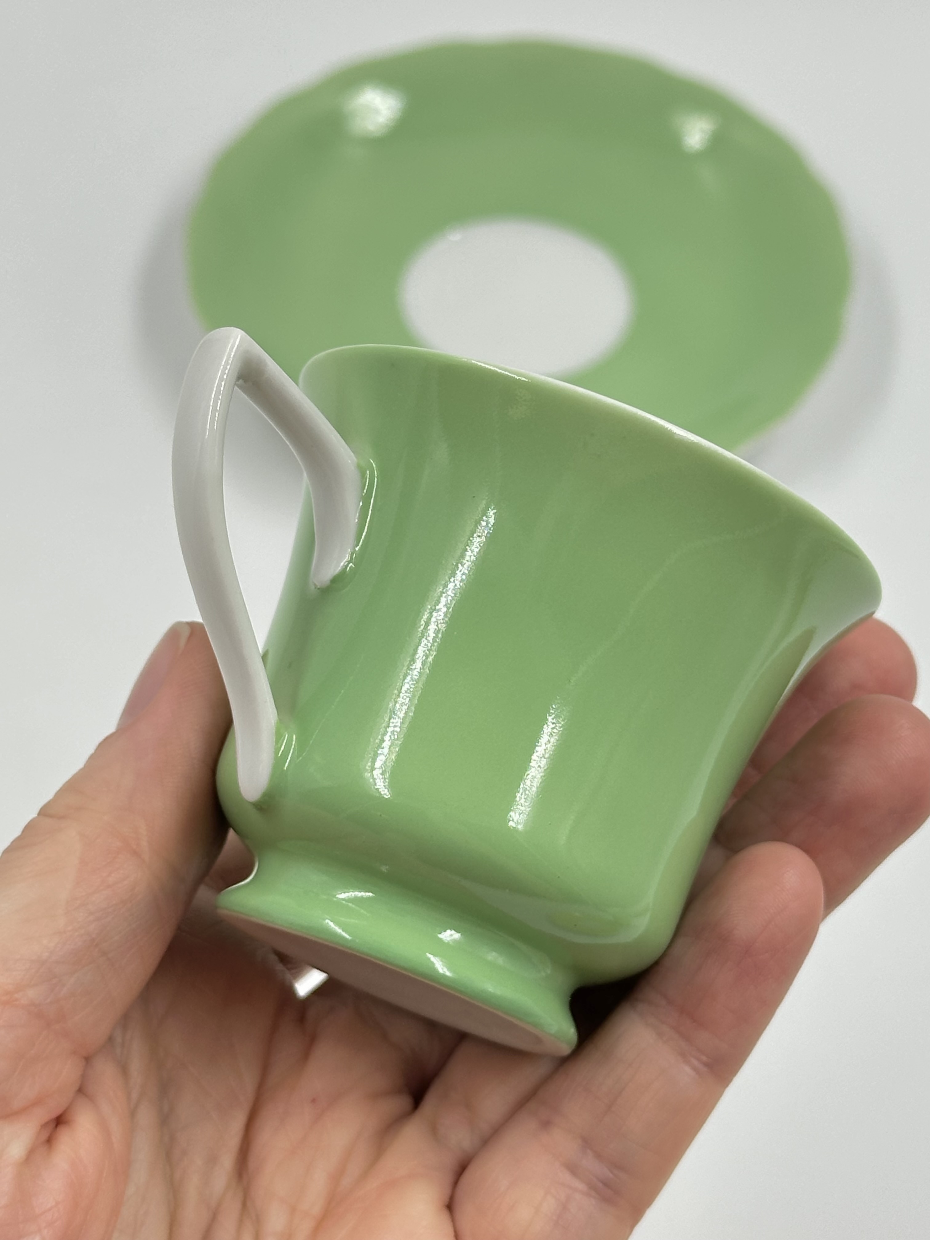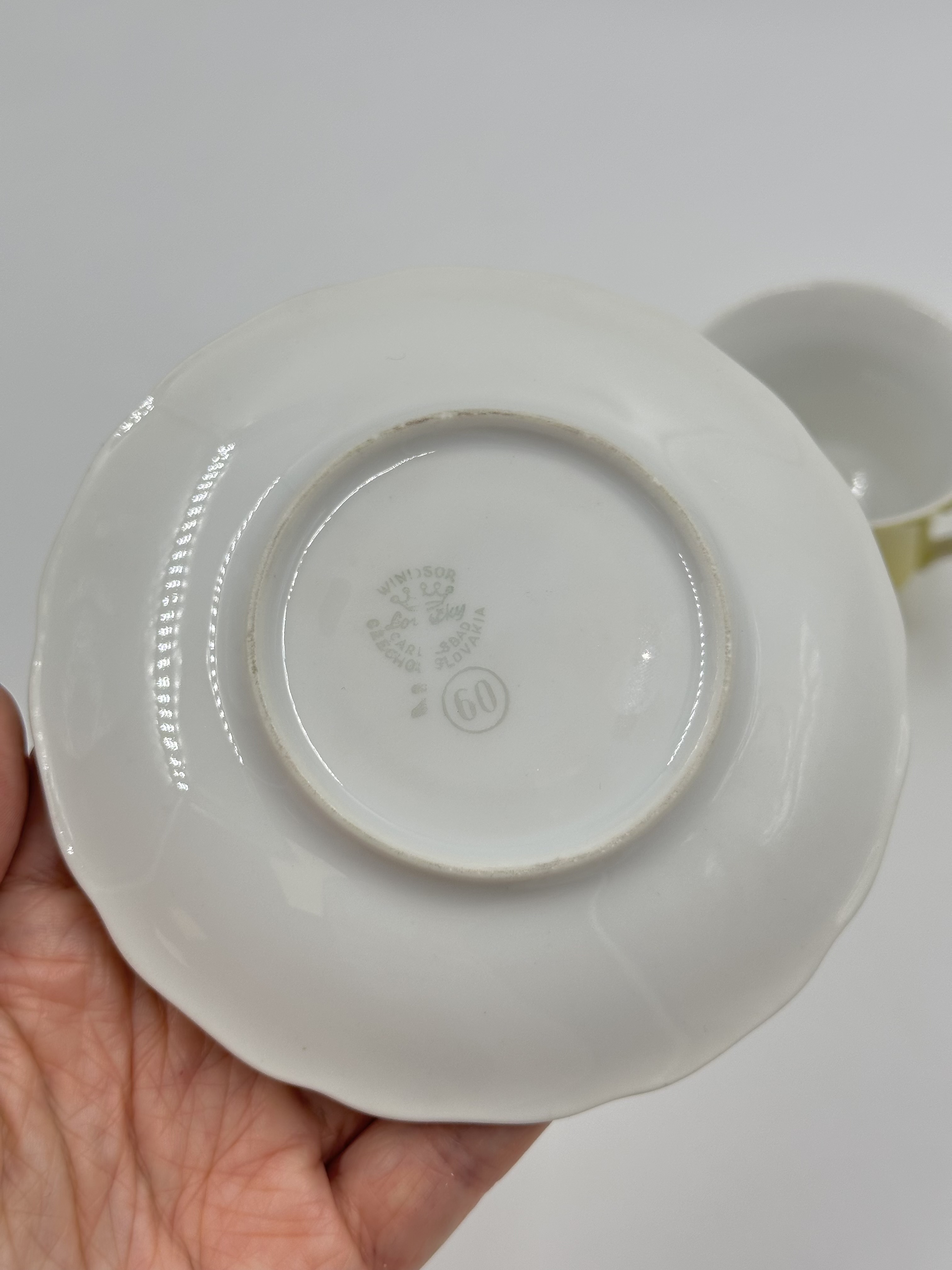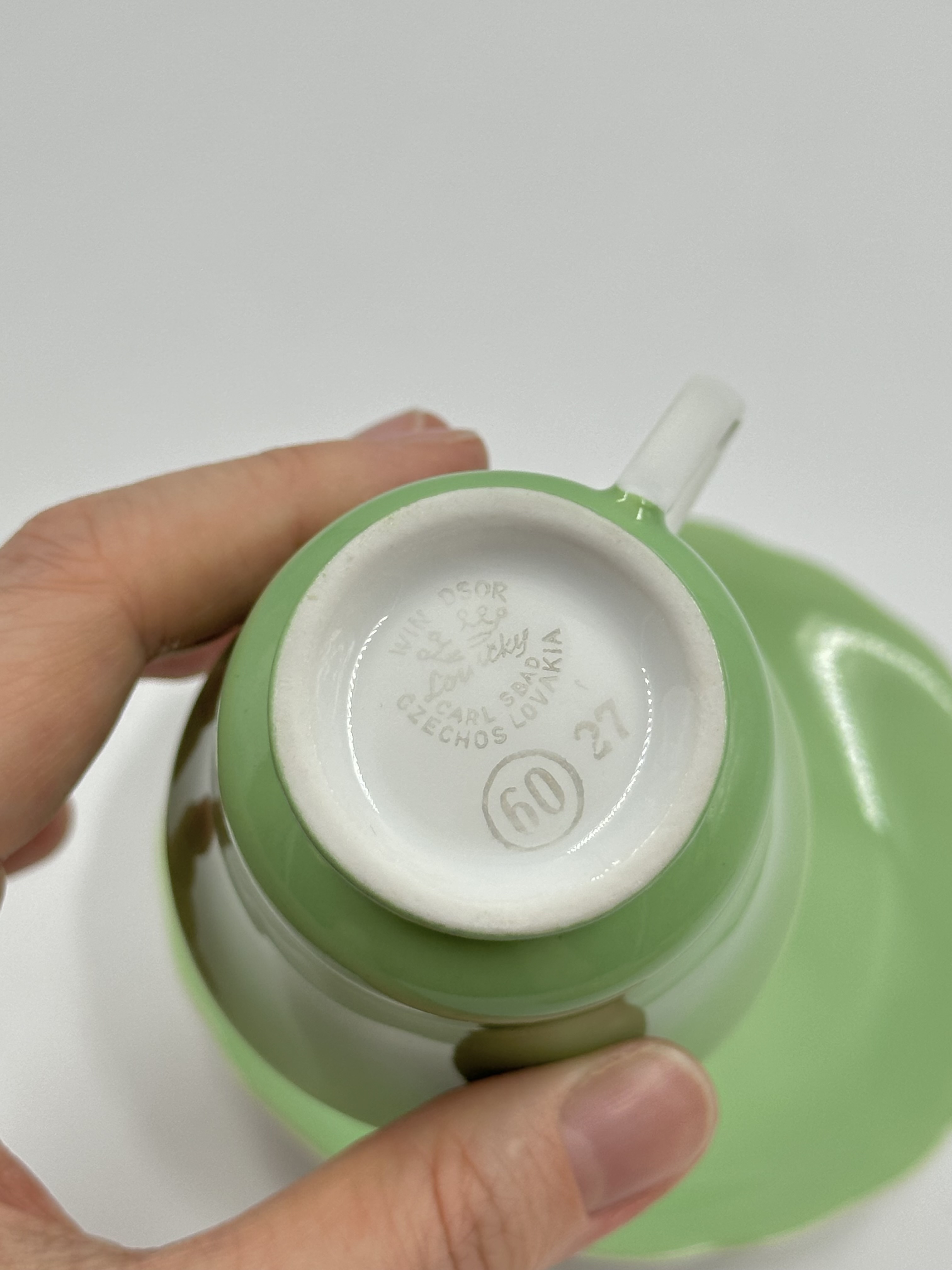 На дне чашки производственный дефект - частично отсутствует глазурь. Диаметр блюдца 11,5см, объём чашки 75мл. Чехословакия.