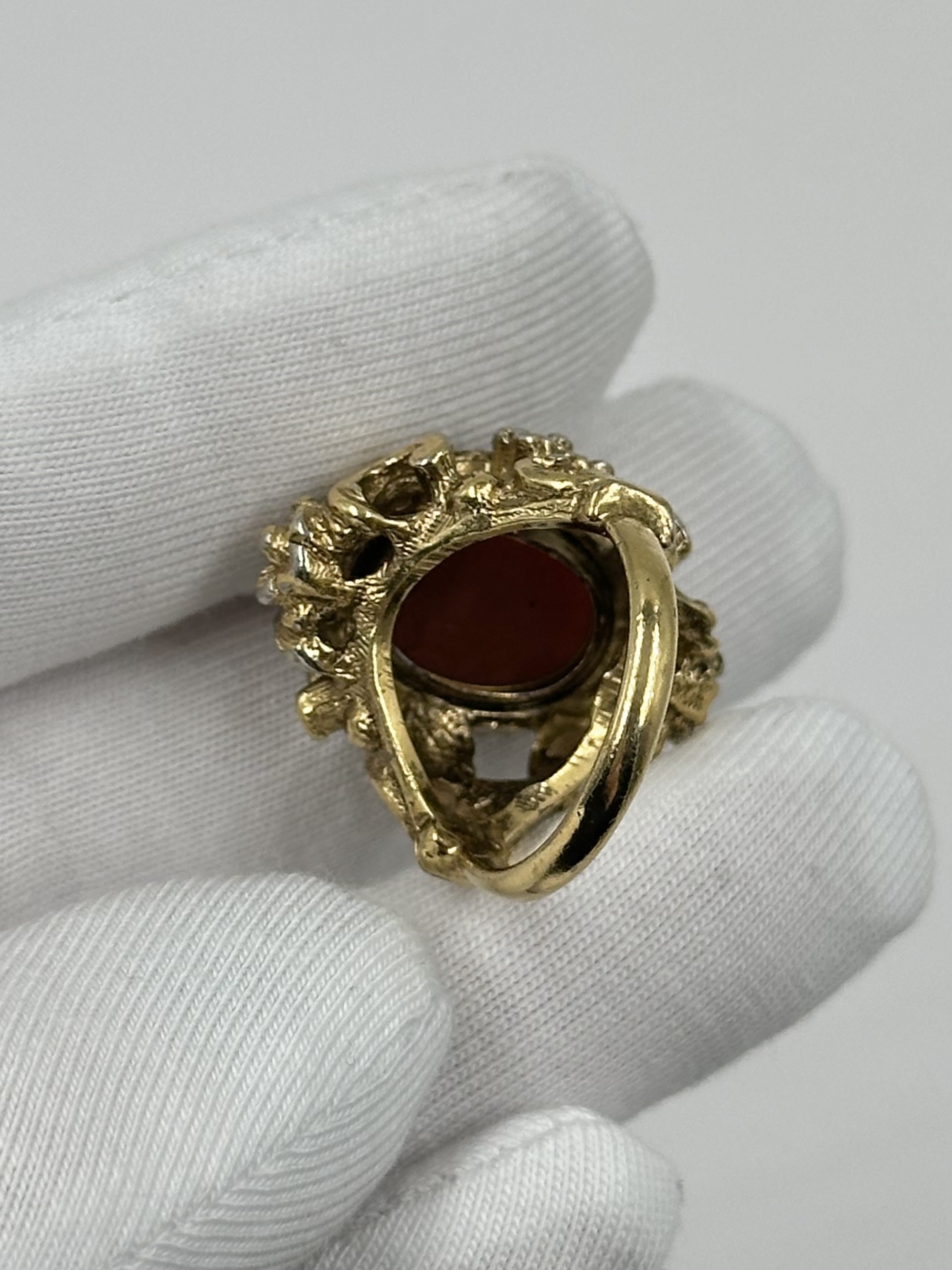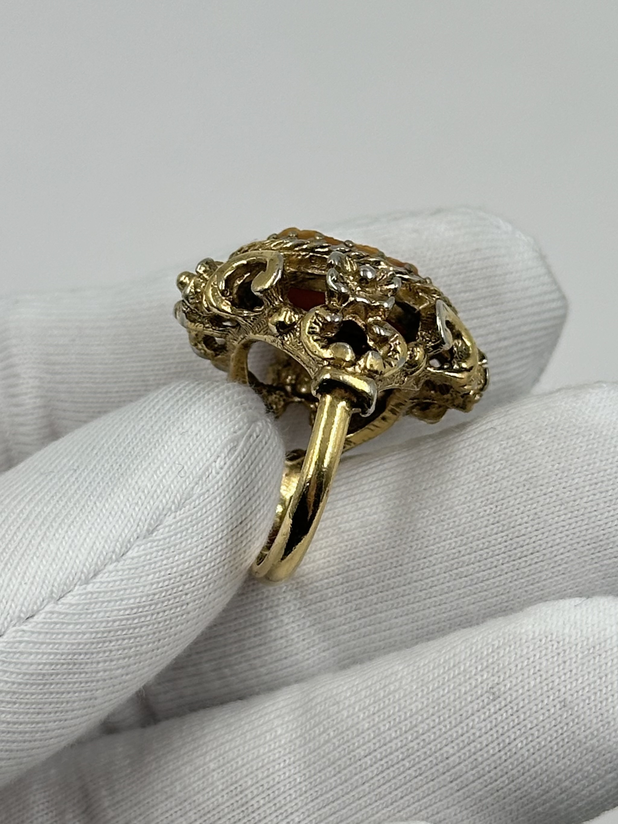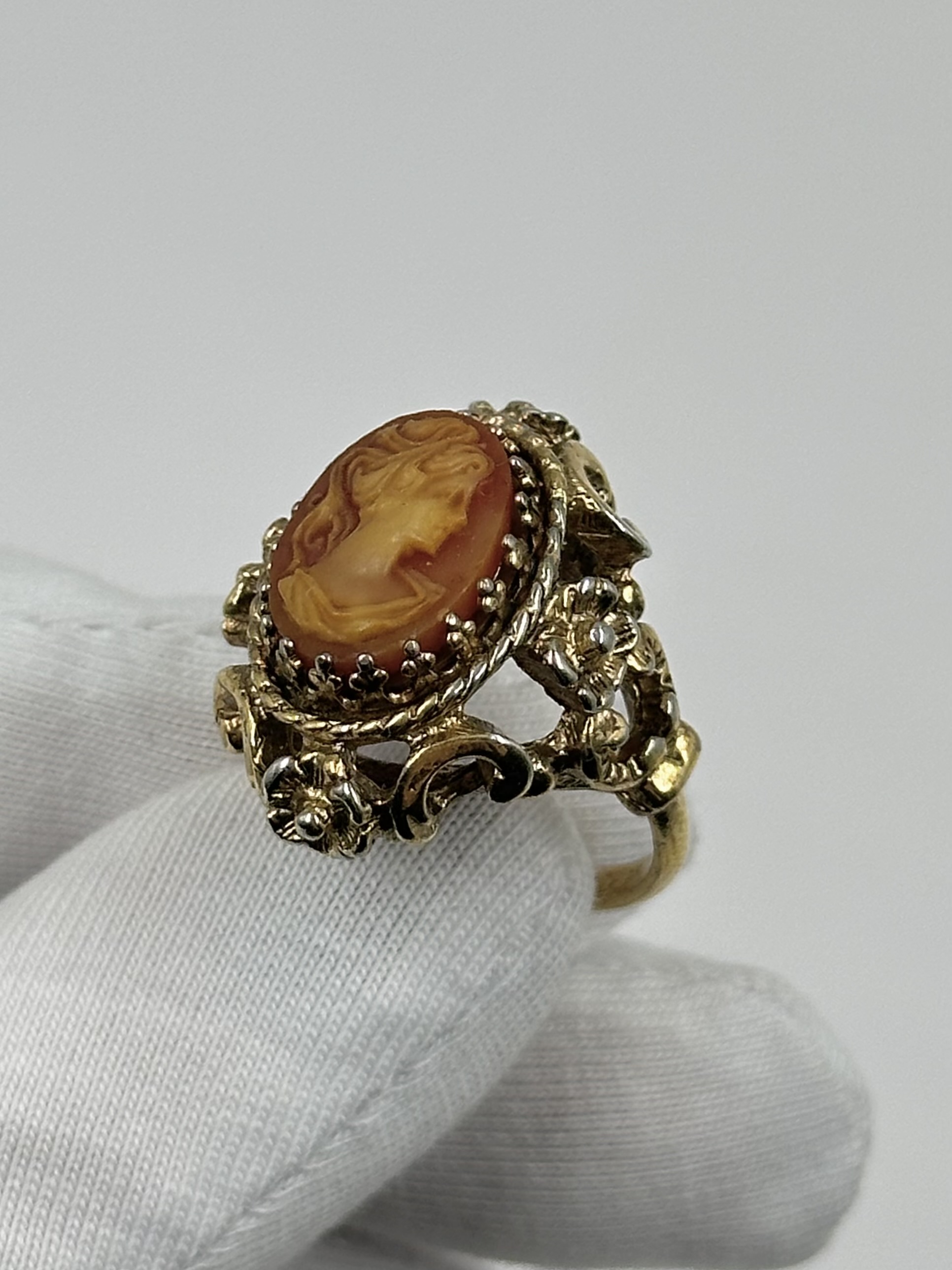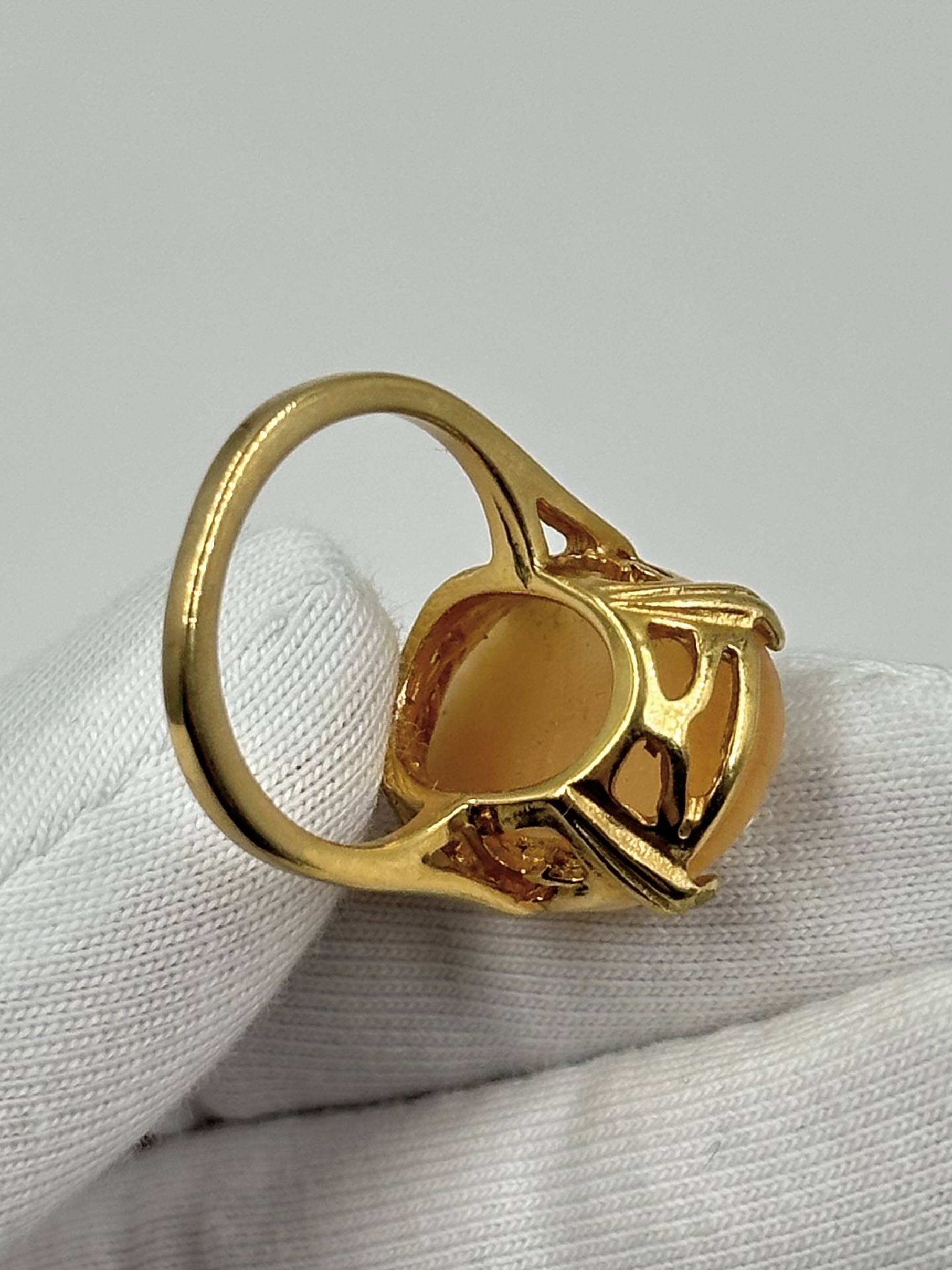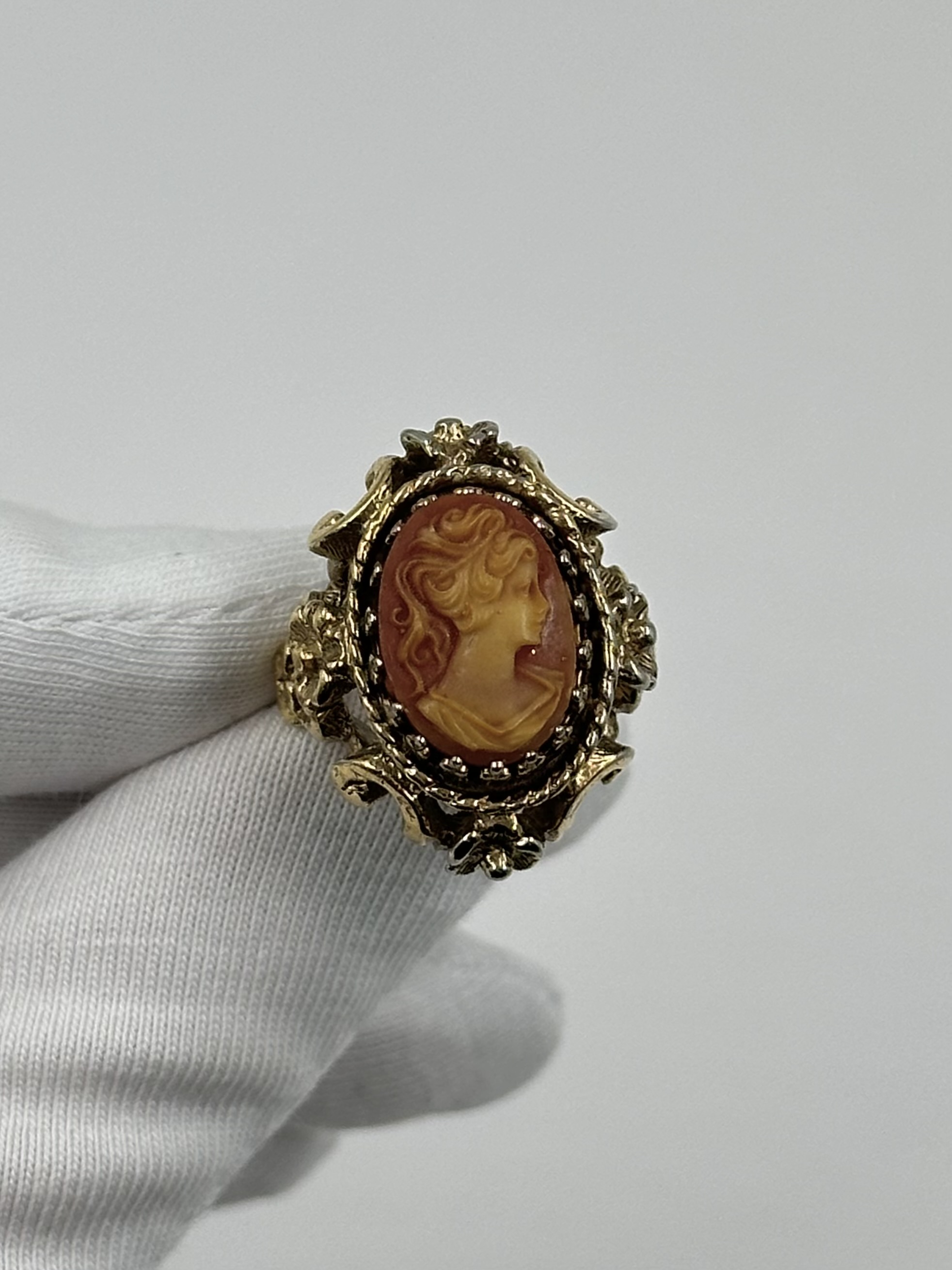 Бижутерный сплав, позолота, пластик. Присутствуют потертости покрытия. Размер 16