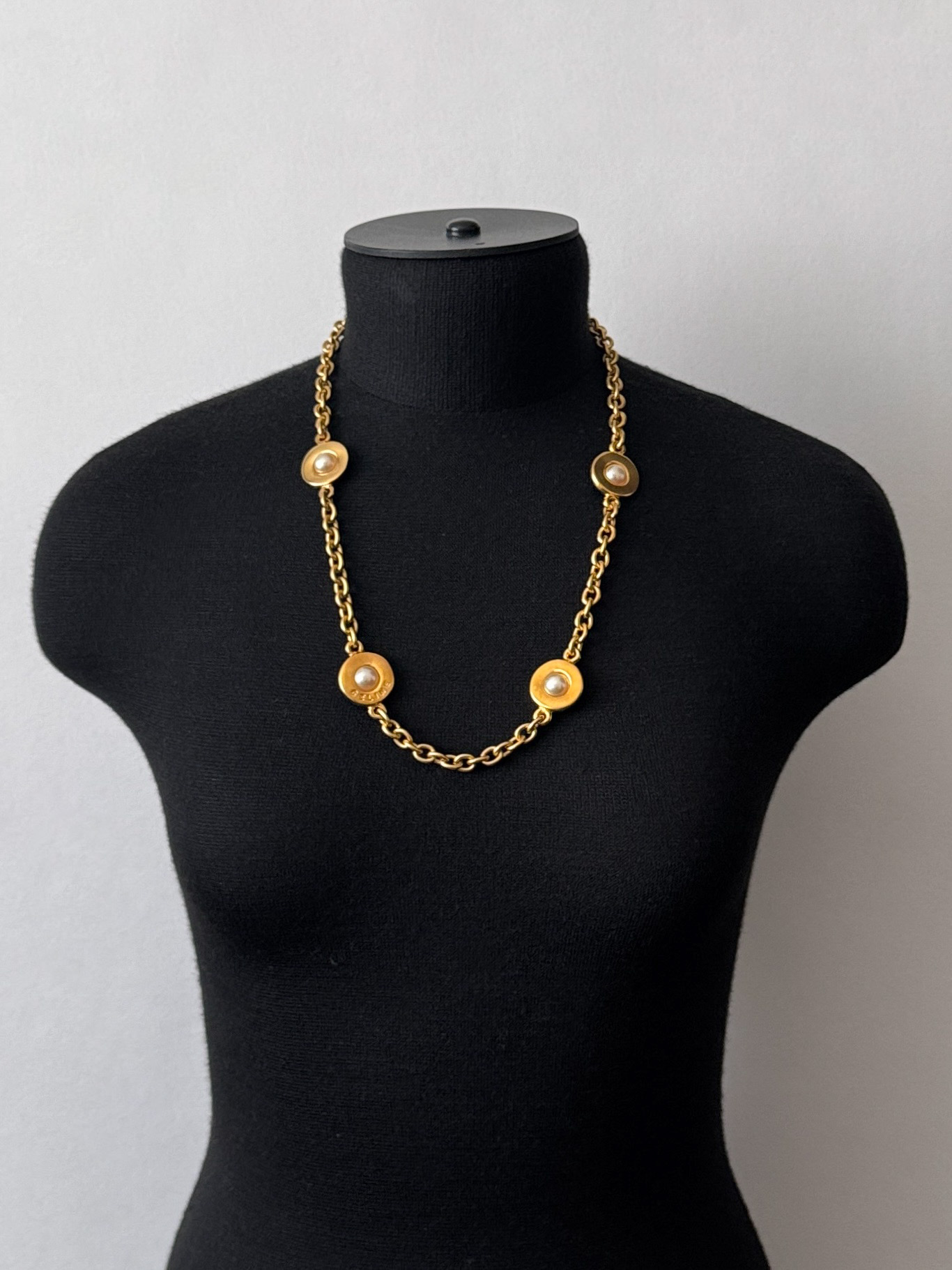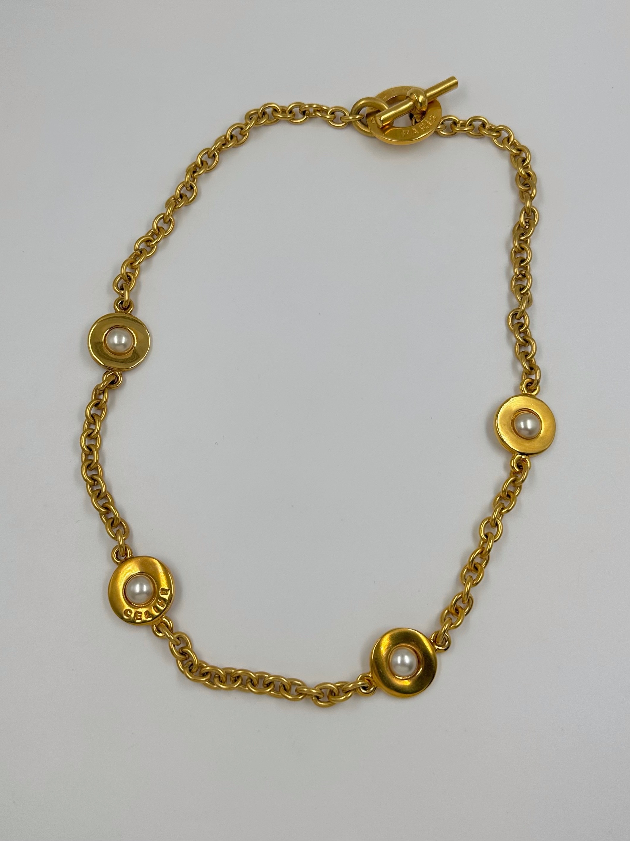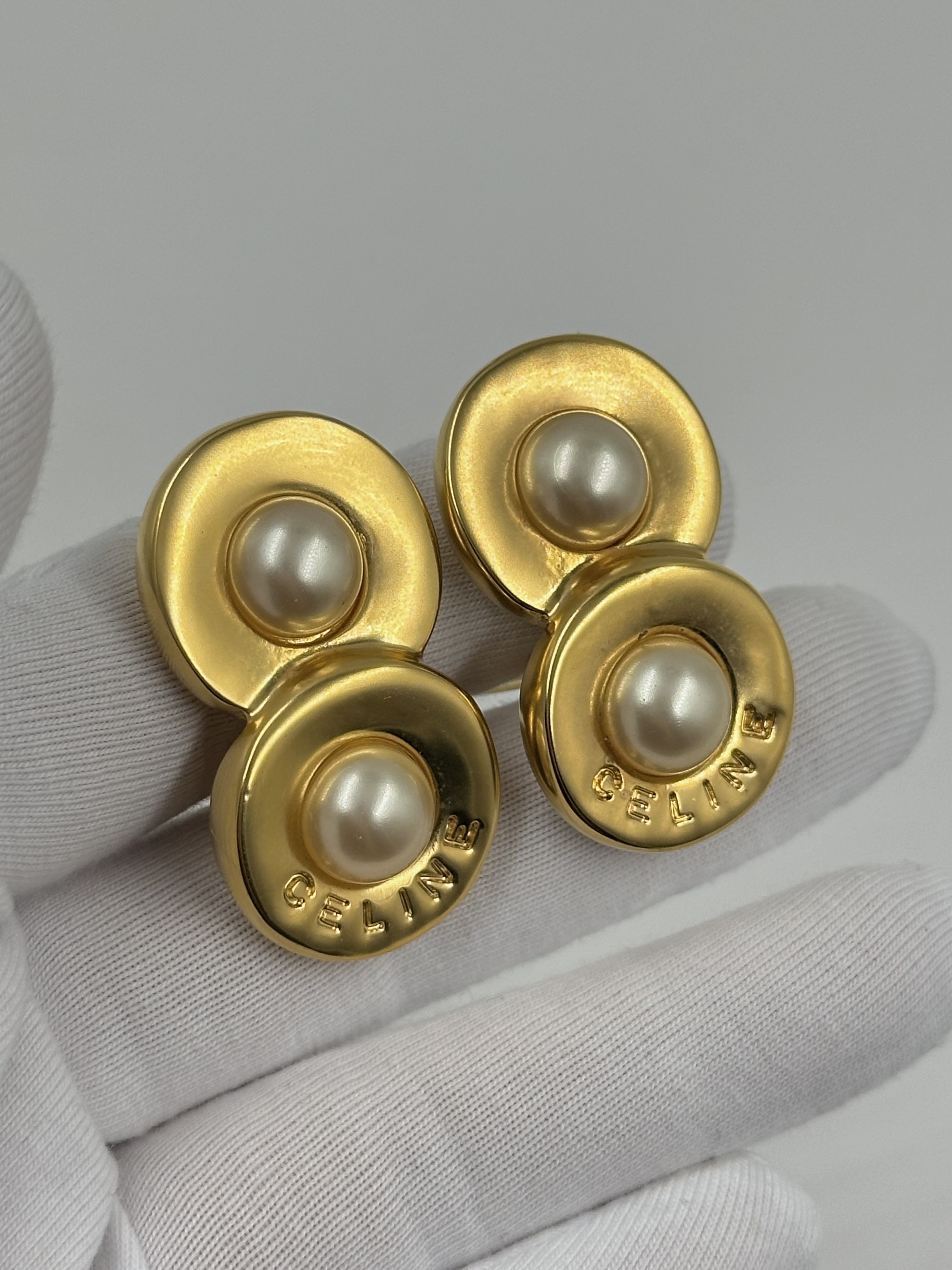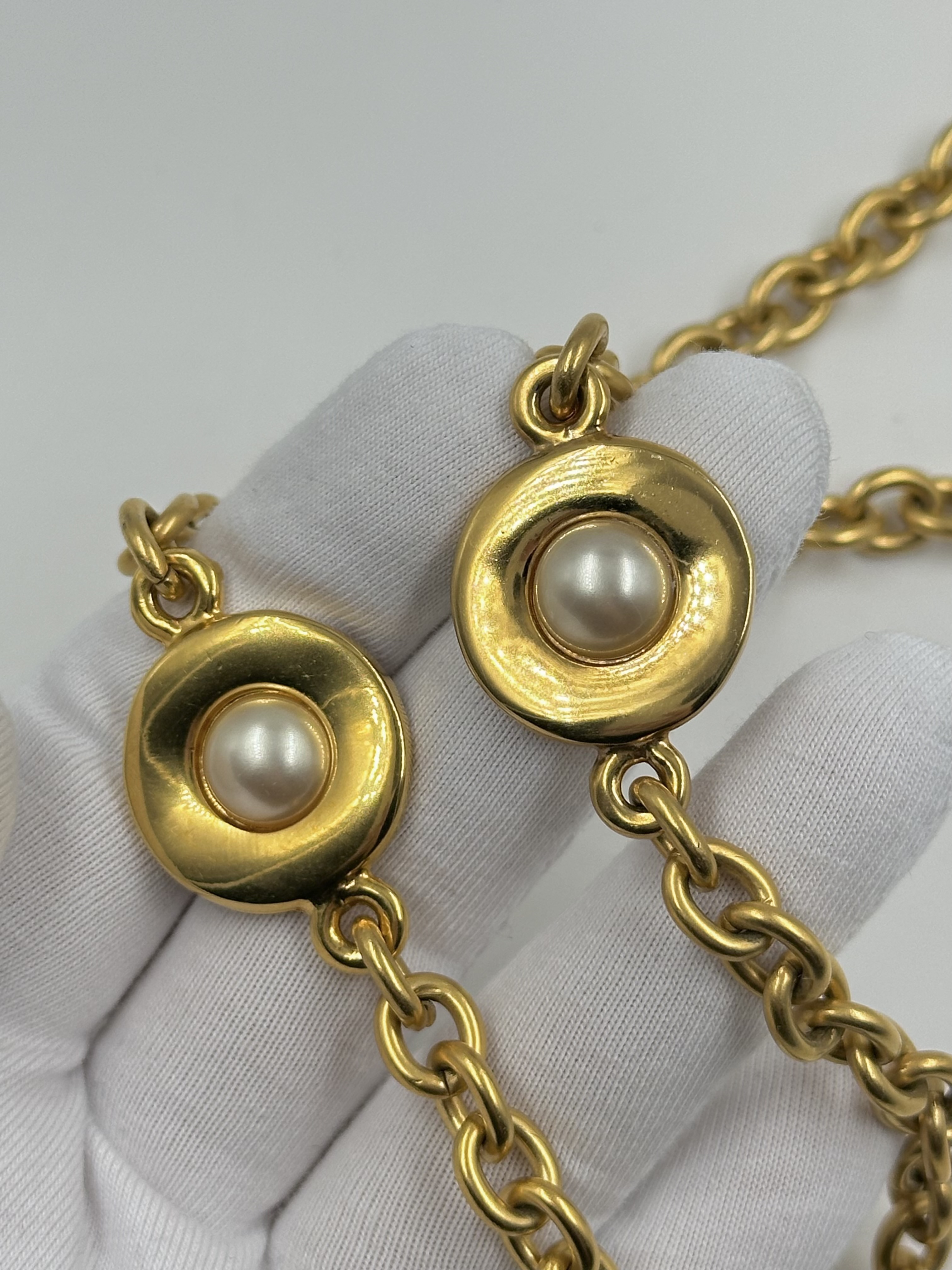 Бижутерный сплав, позолота, имитация жемчуга. Местами присутствуют царапины.