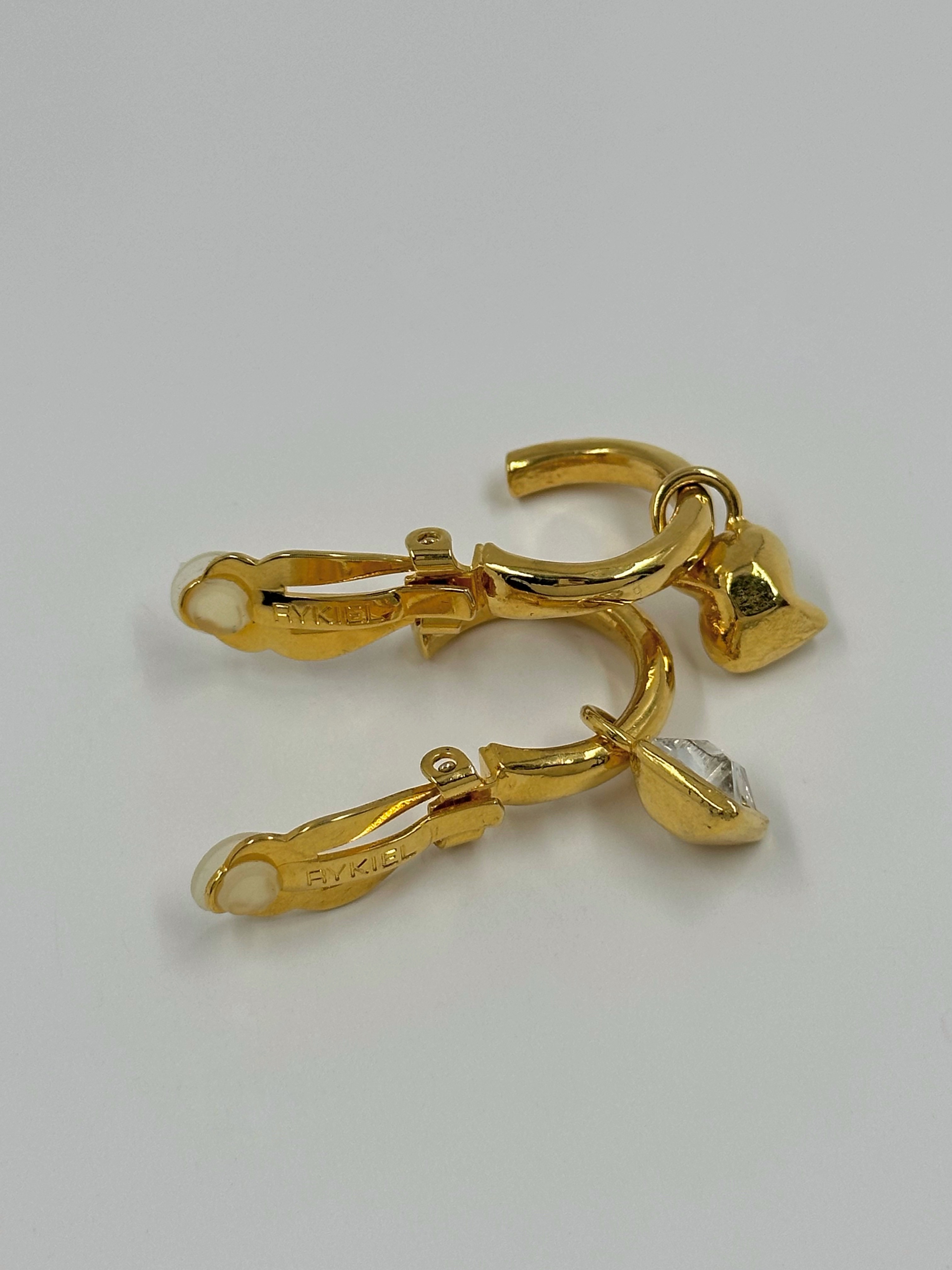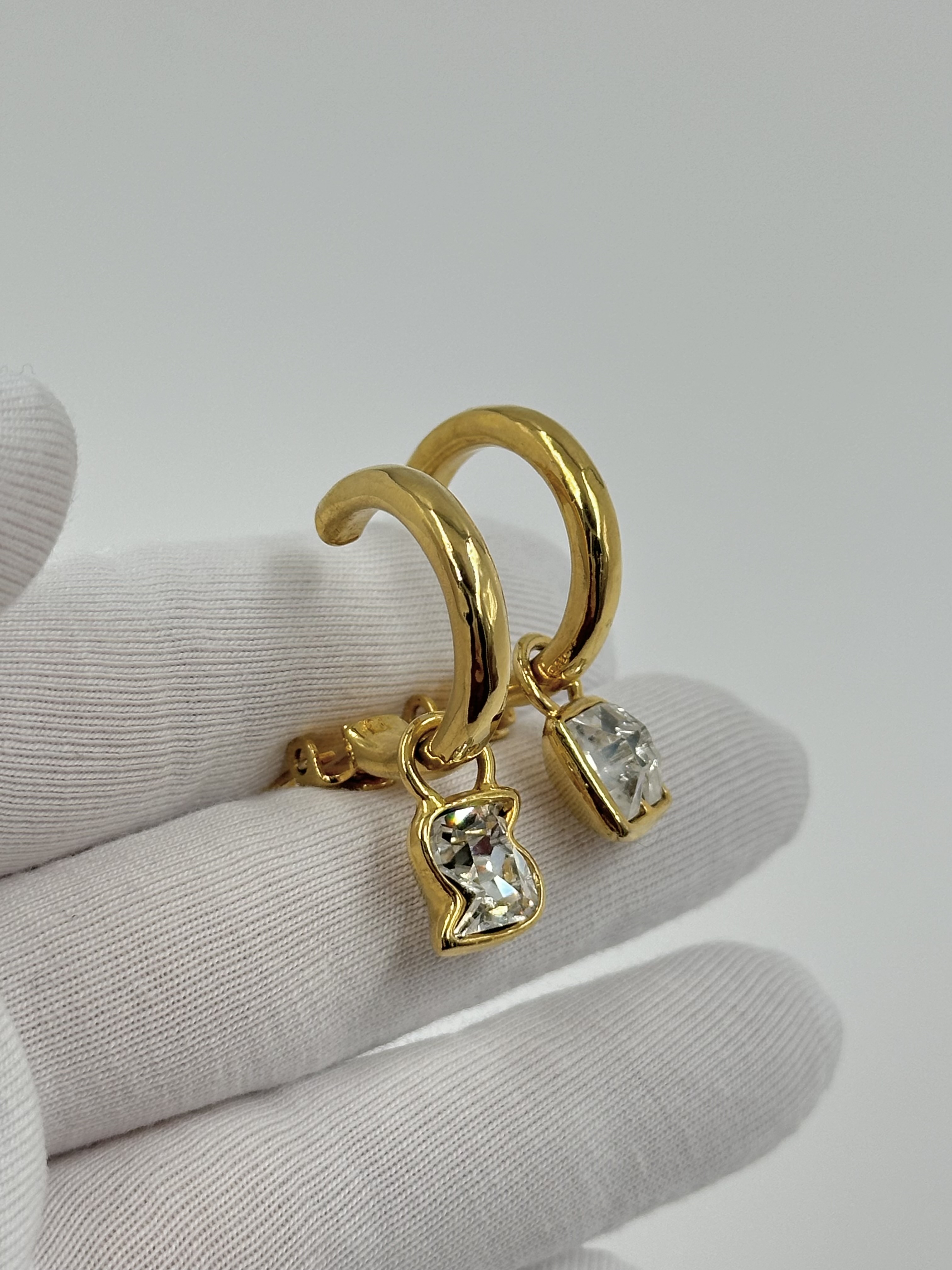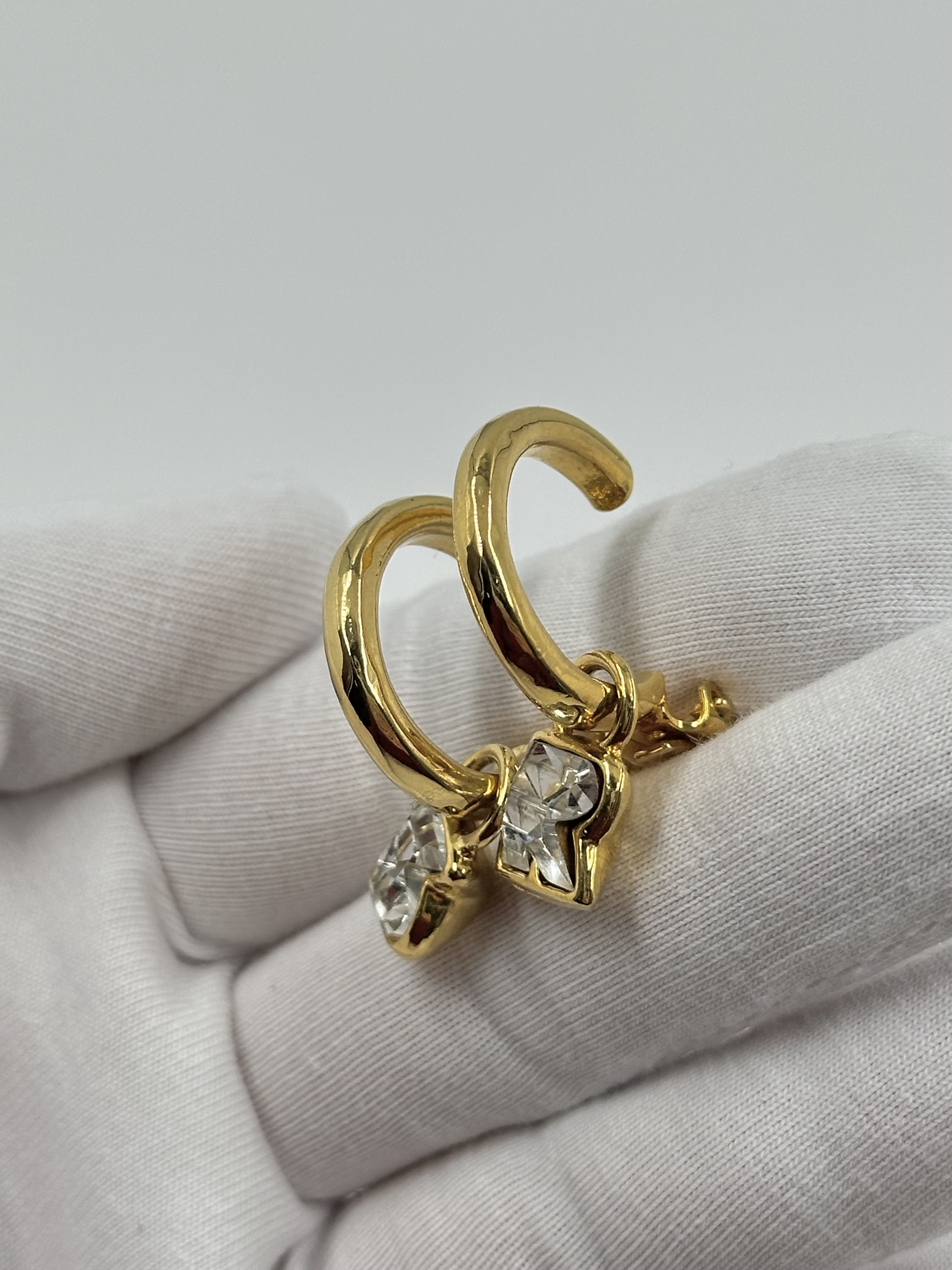 Комплект из трех предметов: клипсы-траснформеры, браслет, кулон на цепи из бижутерного сплава с позолотой с кристаллами. Присутствуют потертости позолоты на кулоне и браслете. Длина браслета 19,5-20,5см. Длина цепи 37-39,5см. Длина клипс с подвесками 3,2см, диаметр колец 2,2см.