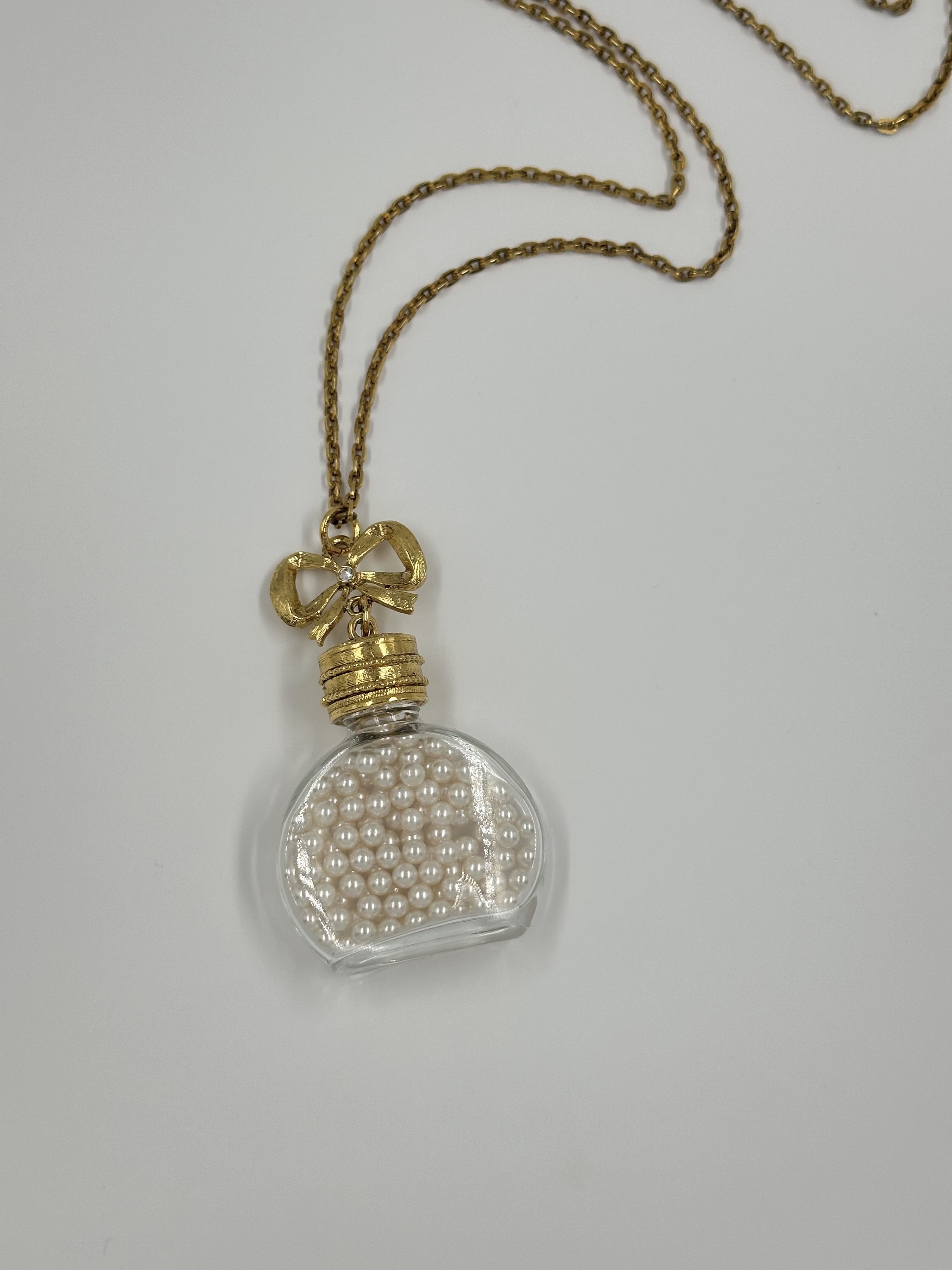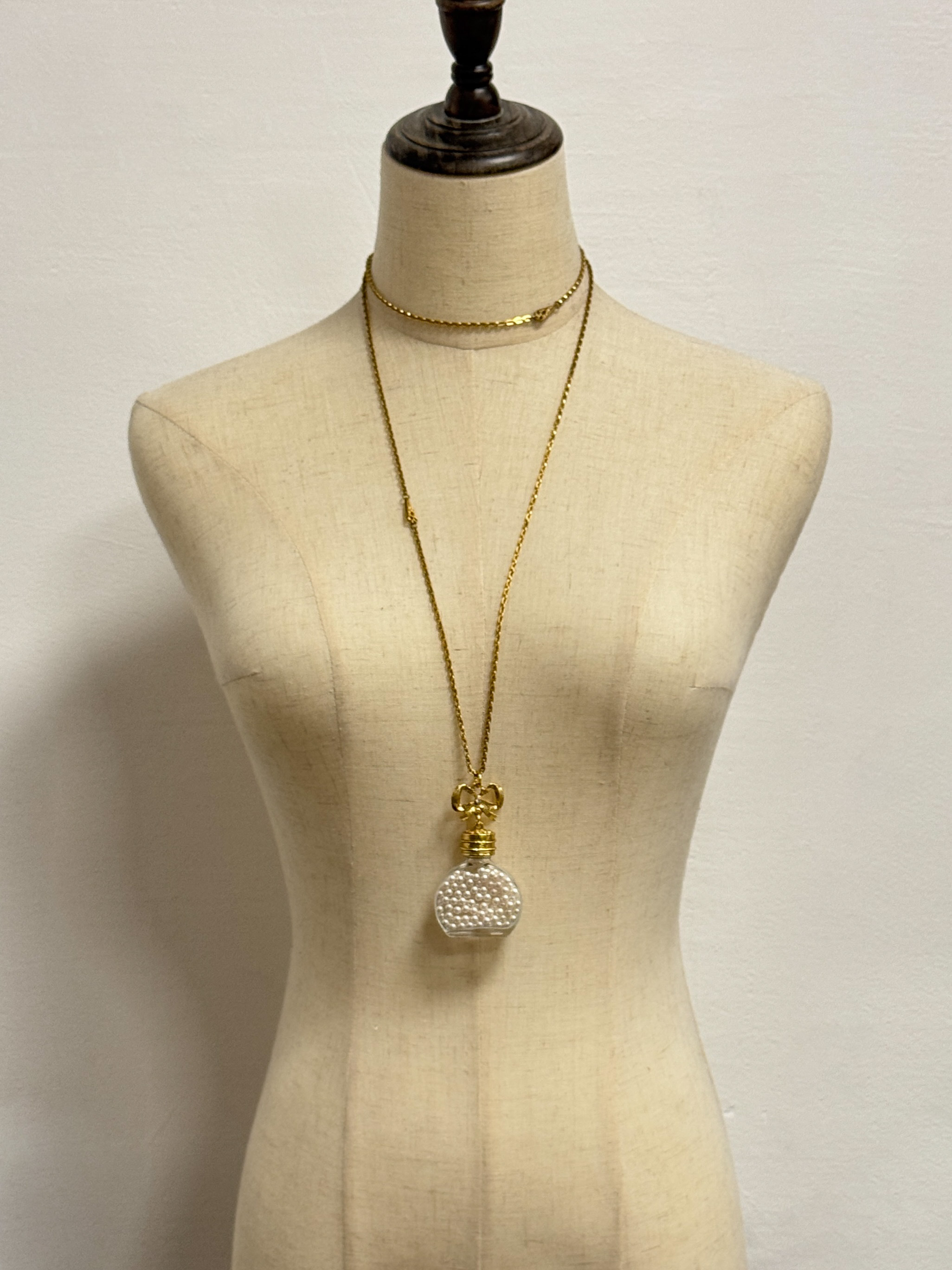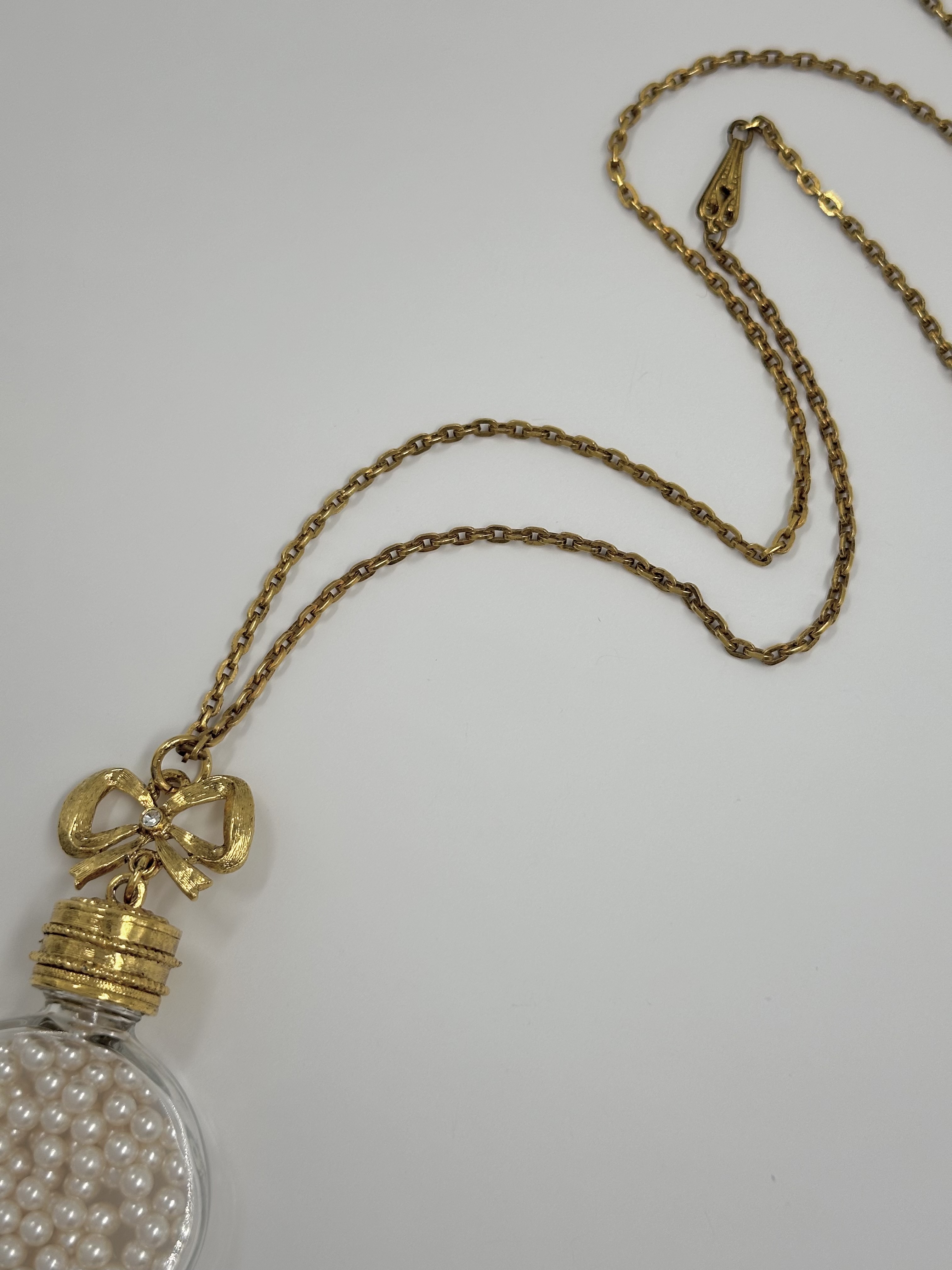 Бижутерный сплав, имитация жемчуга. Размер кулона 4,3 х 8см. Длина цепи 112см. На цепи небольшие потемнения.