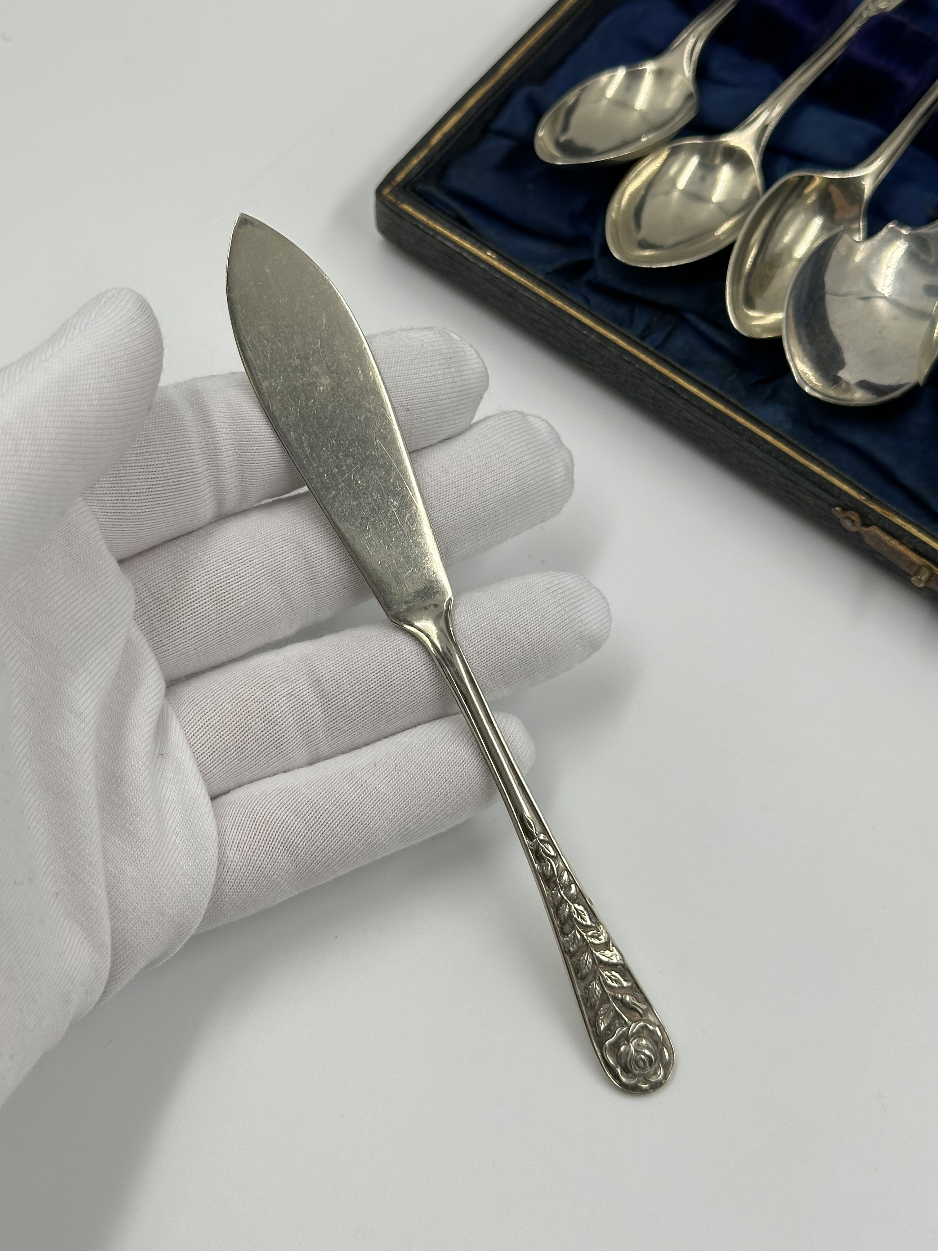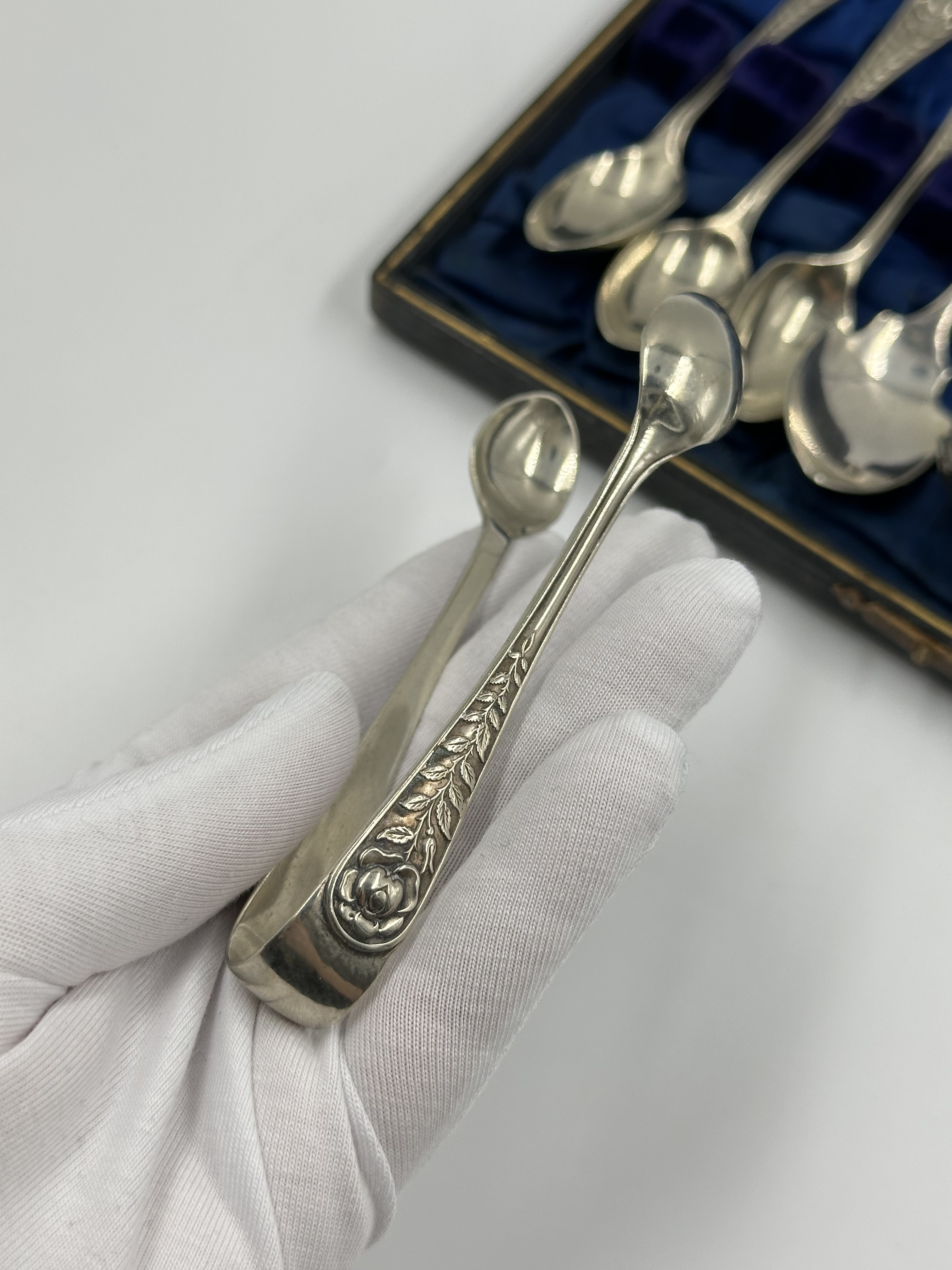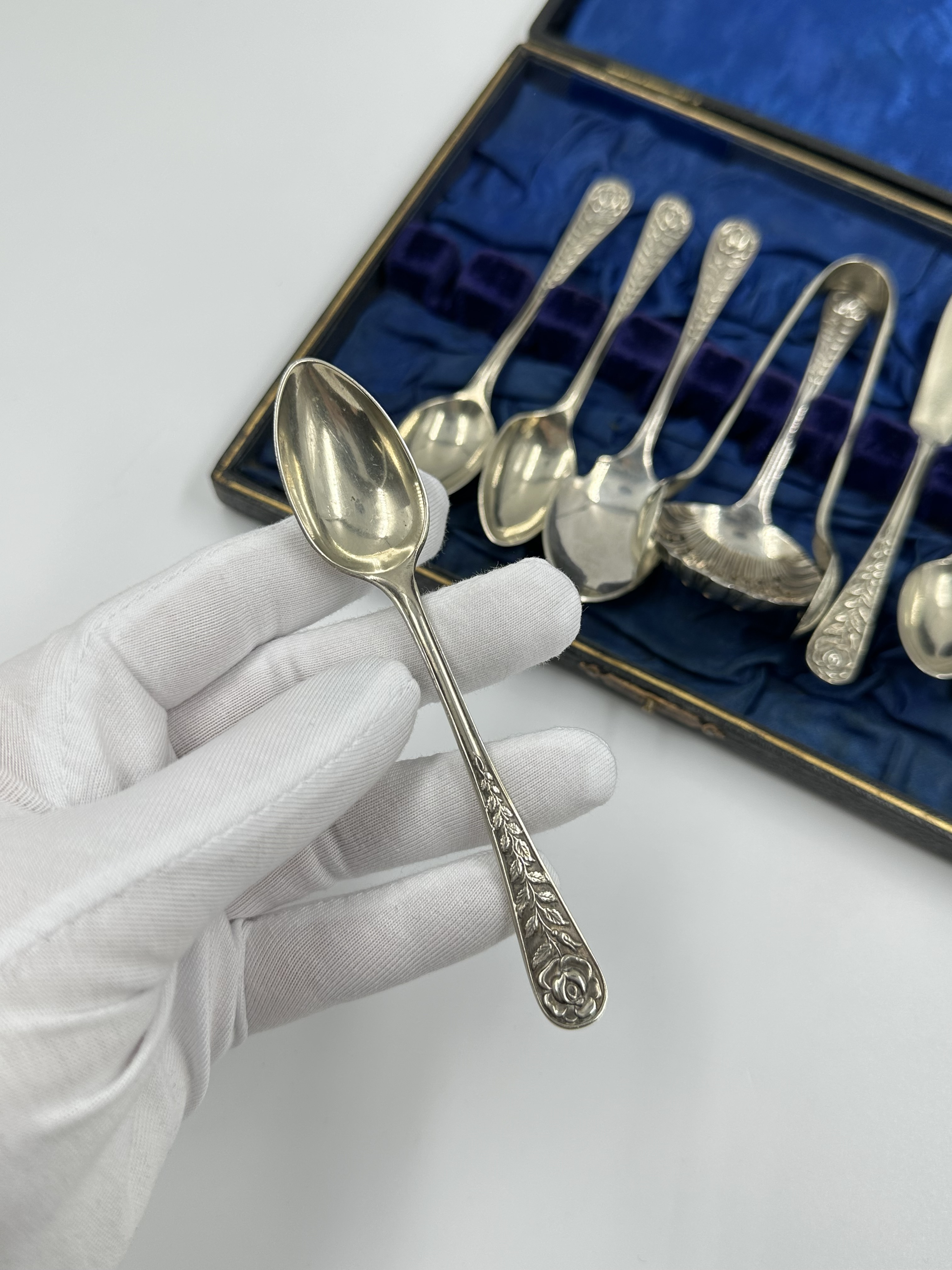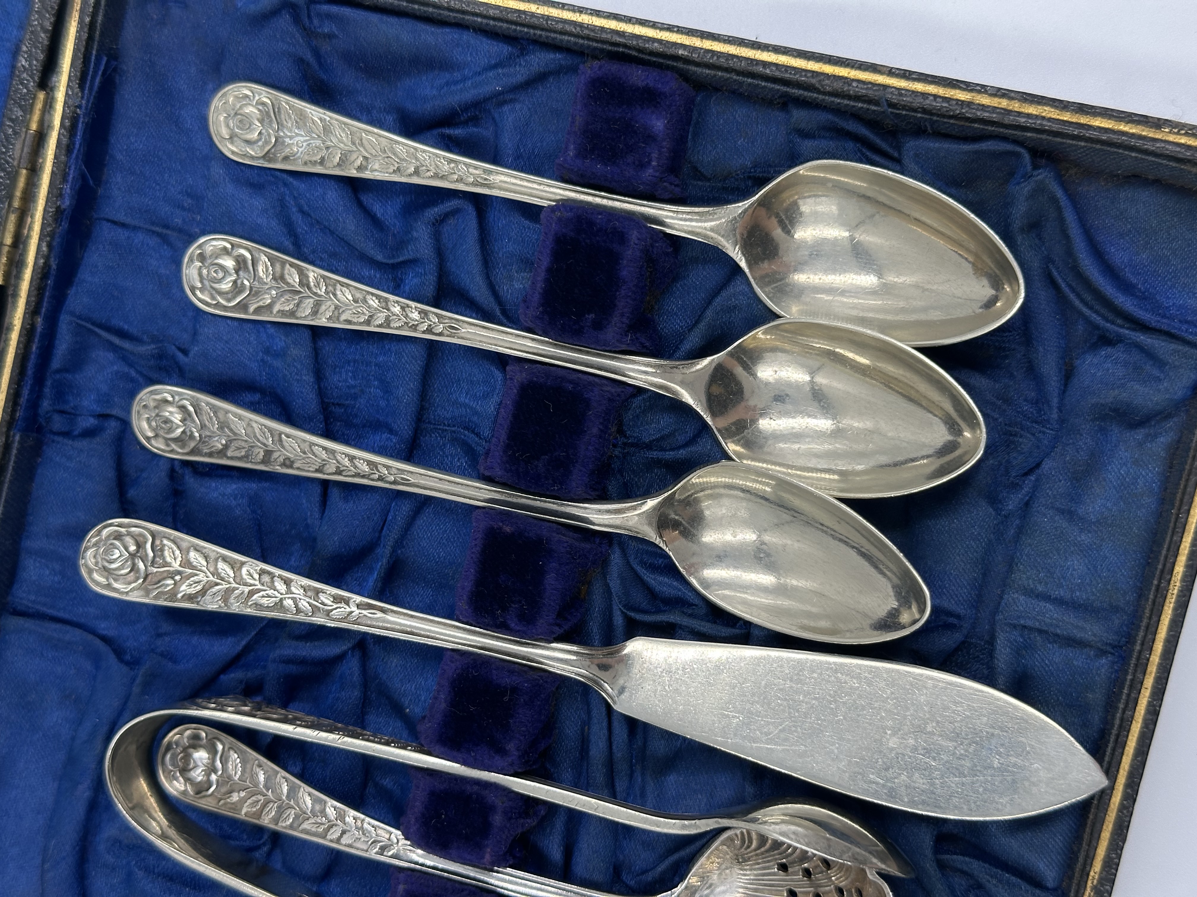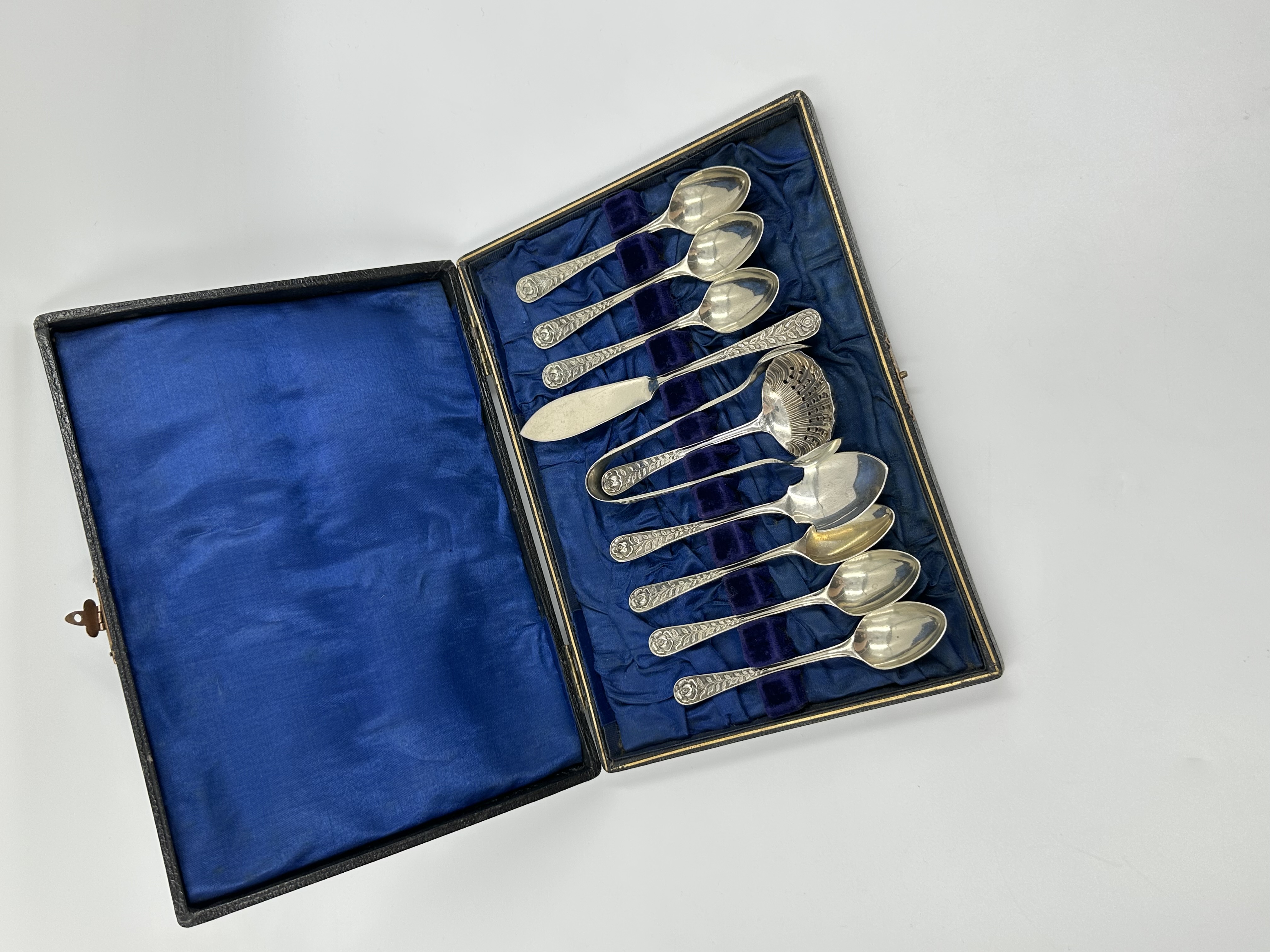 Набор из кофейных ложек, ложки для джема, ложки-ситечка, щипцов для сахара и ножа для масла. Длина чайной ложки 11,3см. Длина ножа 13,5см. Присутствуют небольшие следы времени. Серебрение. Англия.