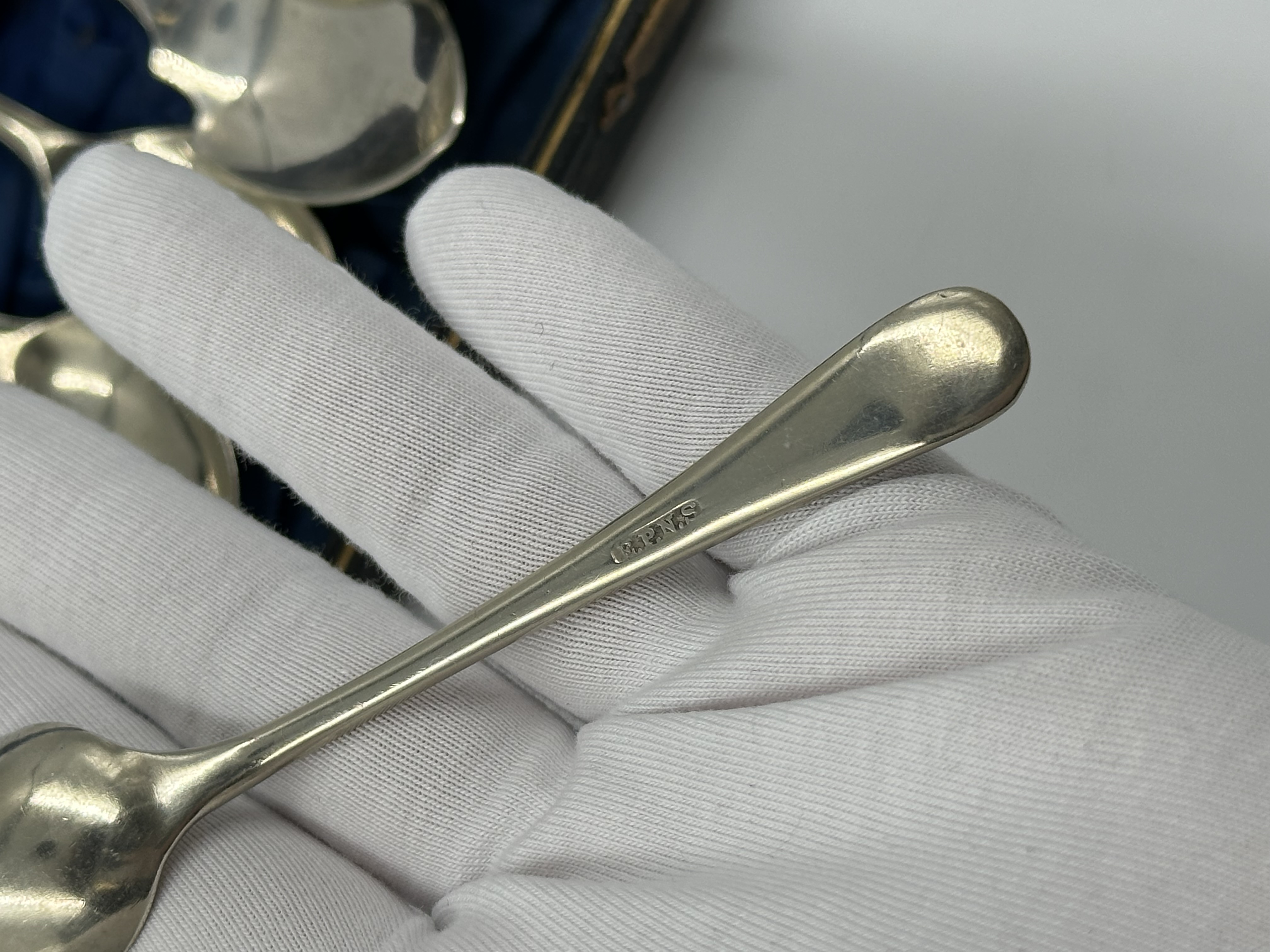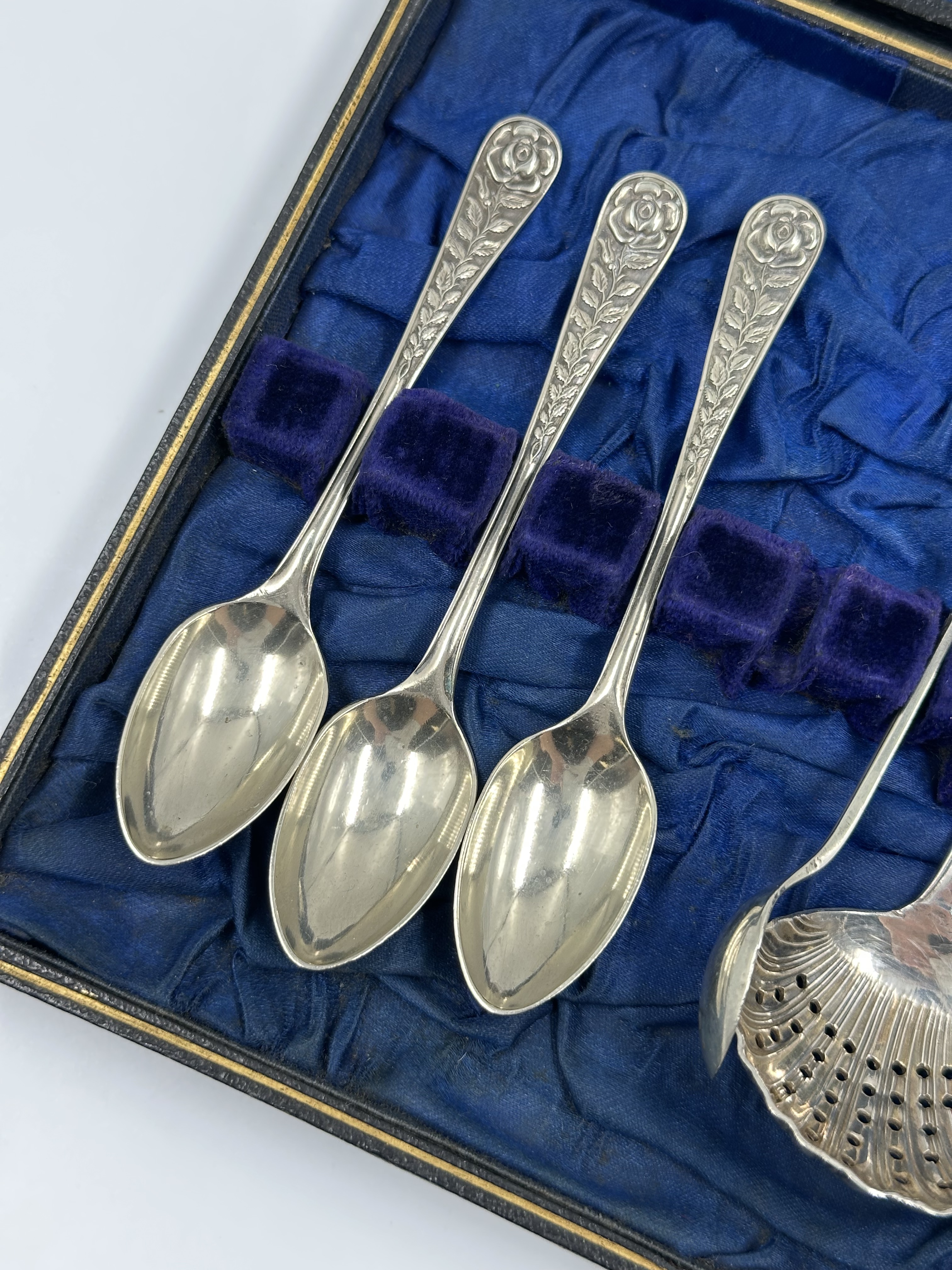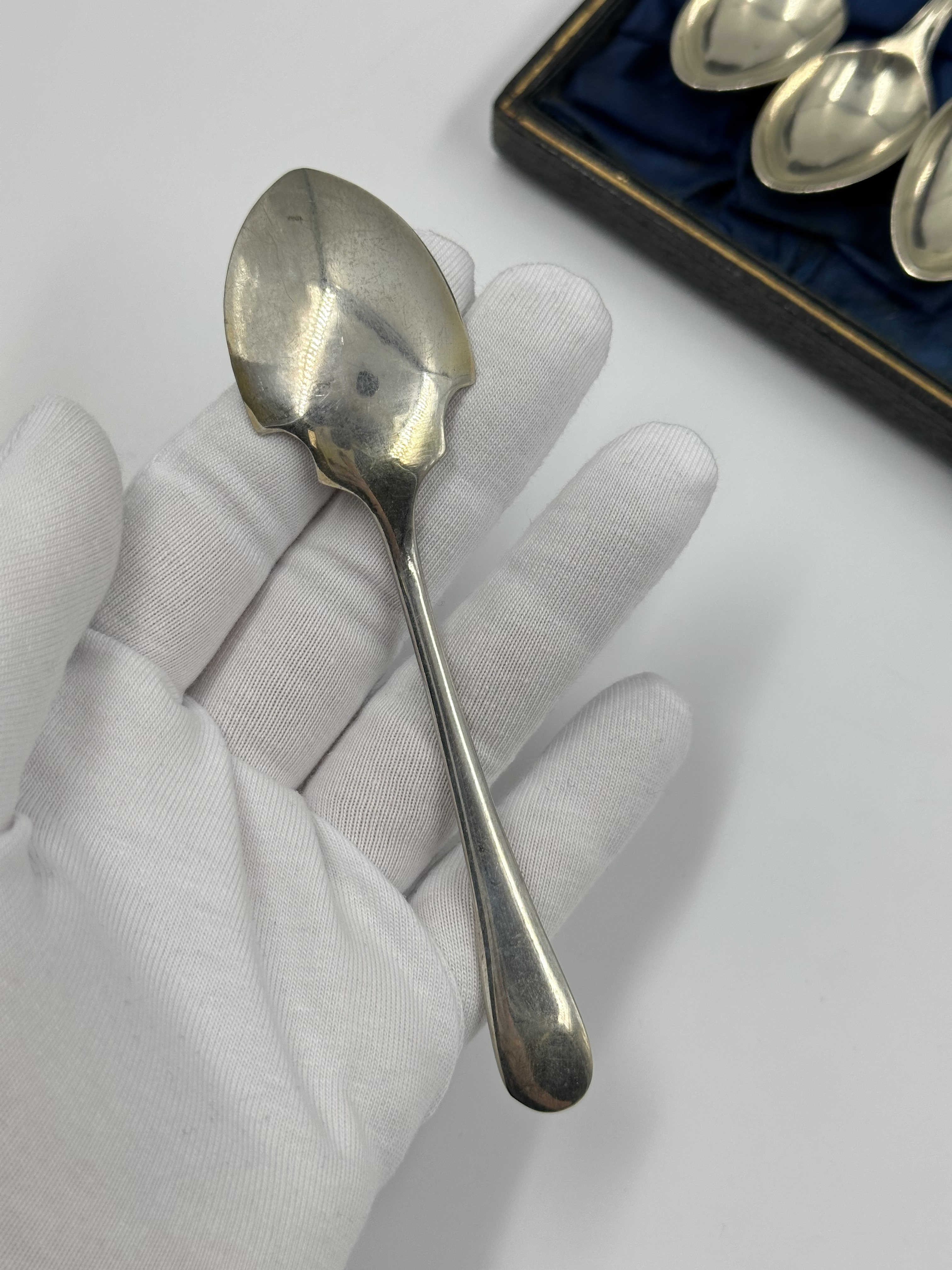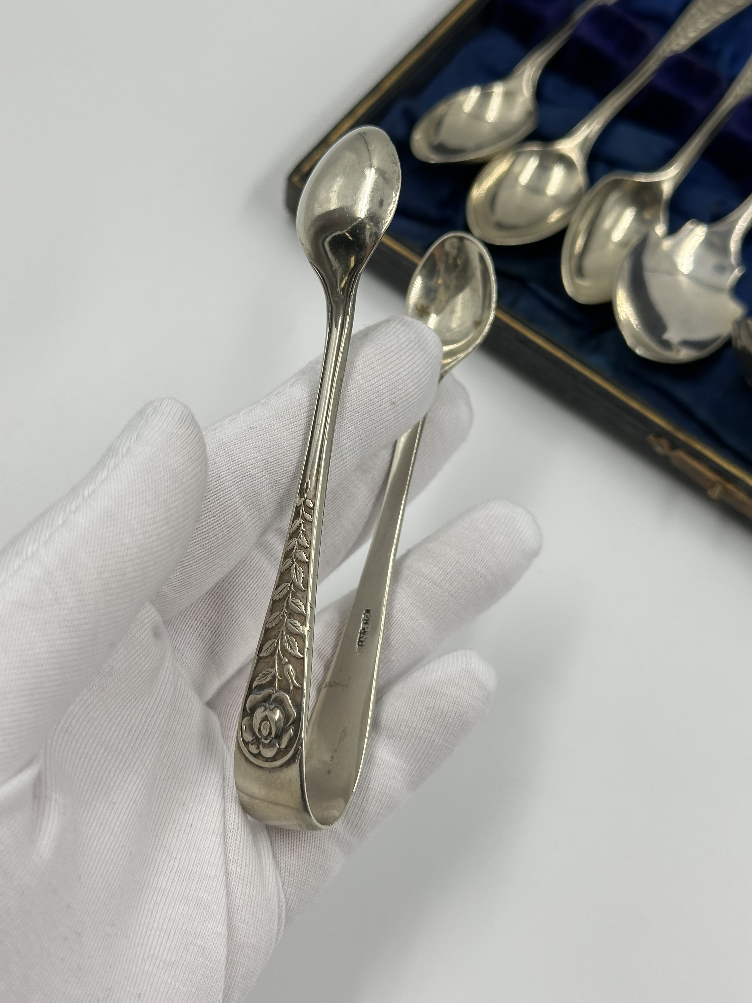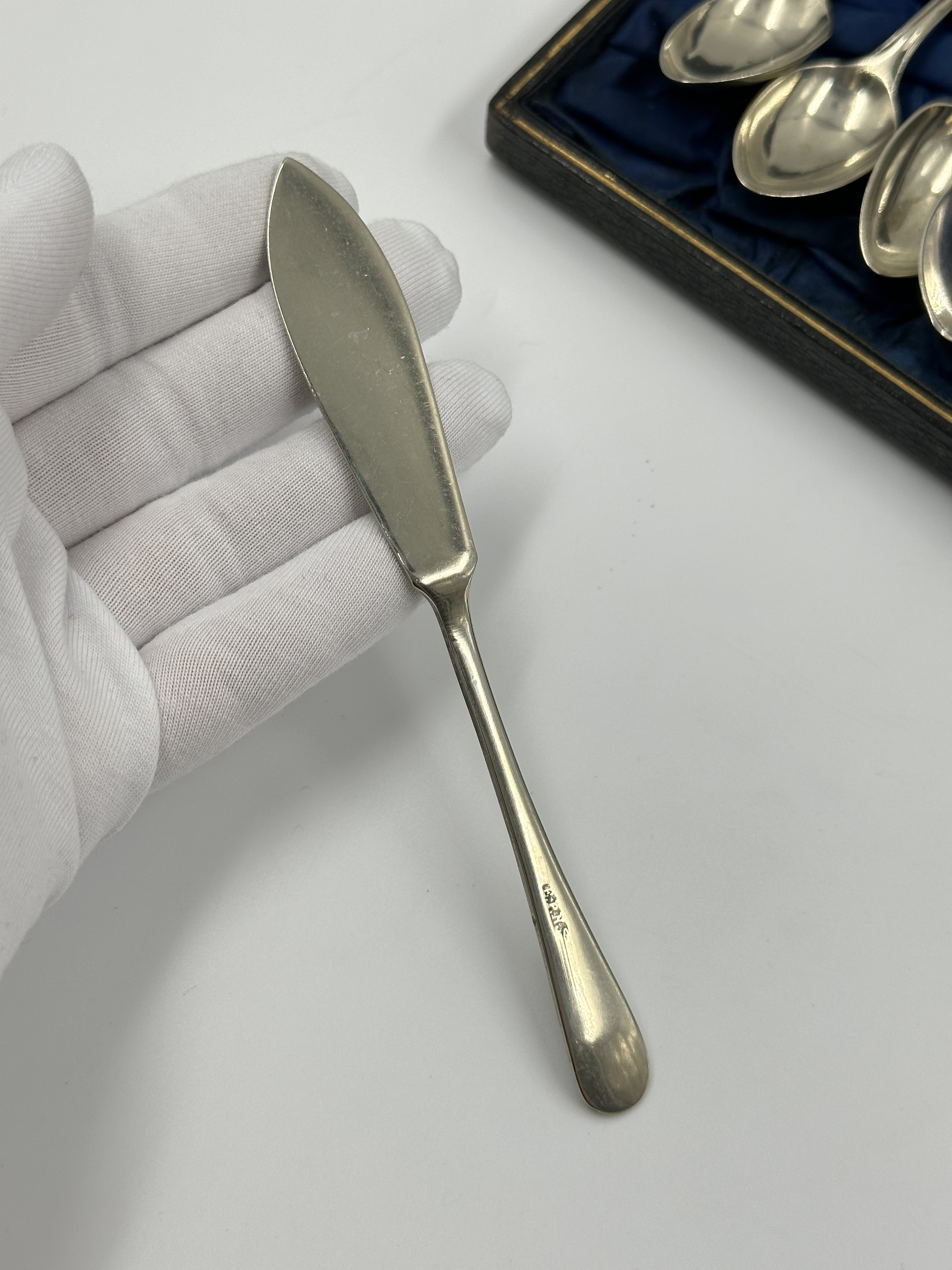 Набор из кофейных ложек, ложки для джема, ложки-ситечка, щипцов для сахара и ножа для масла. Длина чайной ложки 11,3см. Длина ножа 13,5см. Присутствуют небольшие следы времени. Серебрение. Англия.