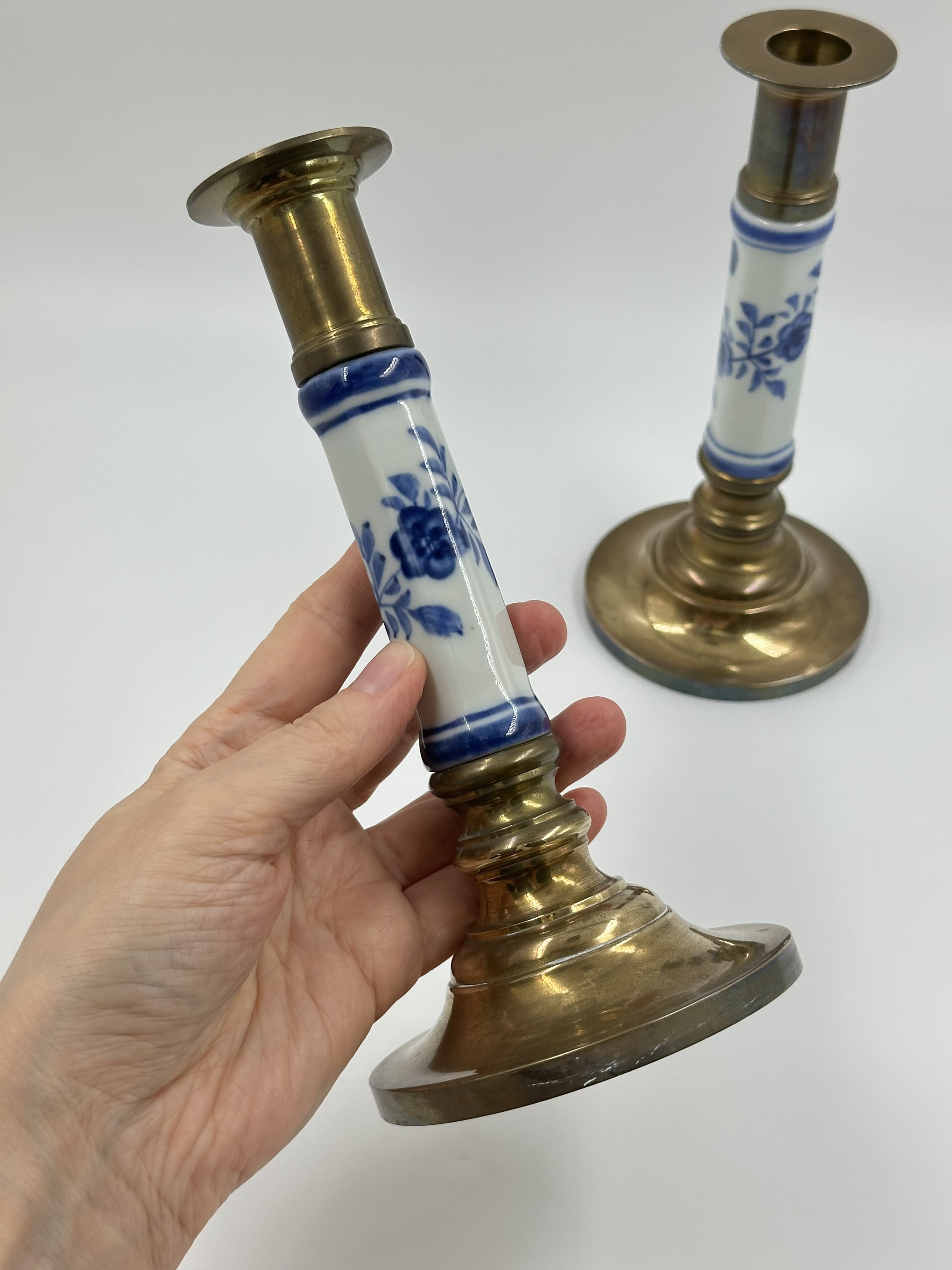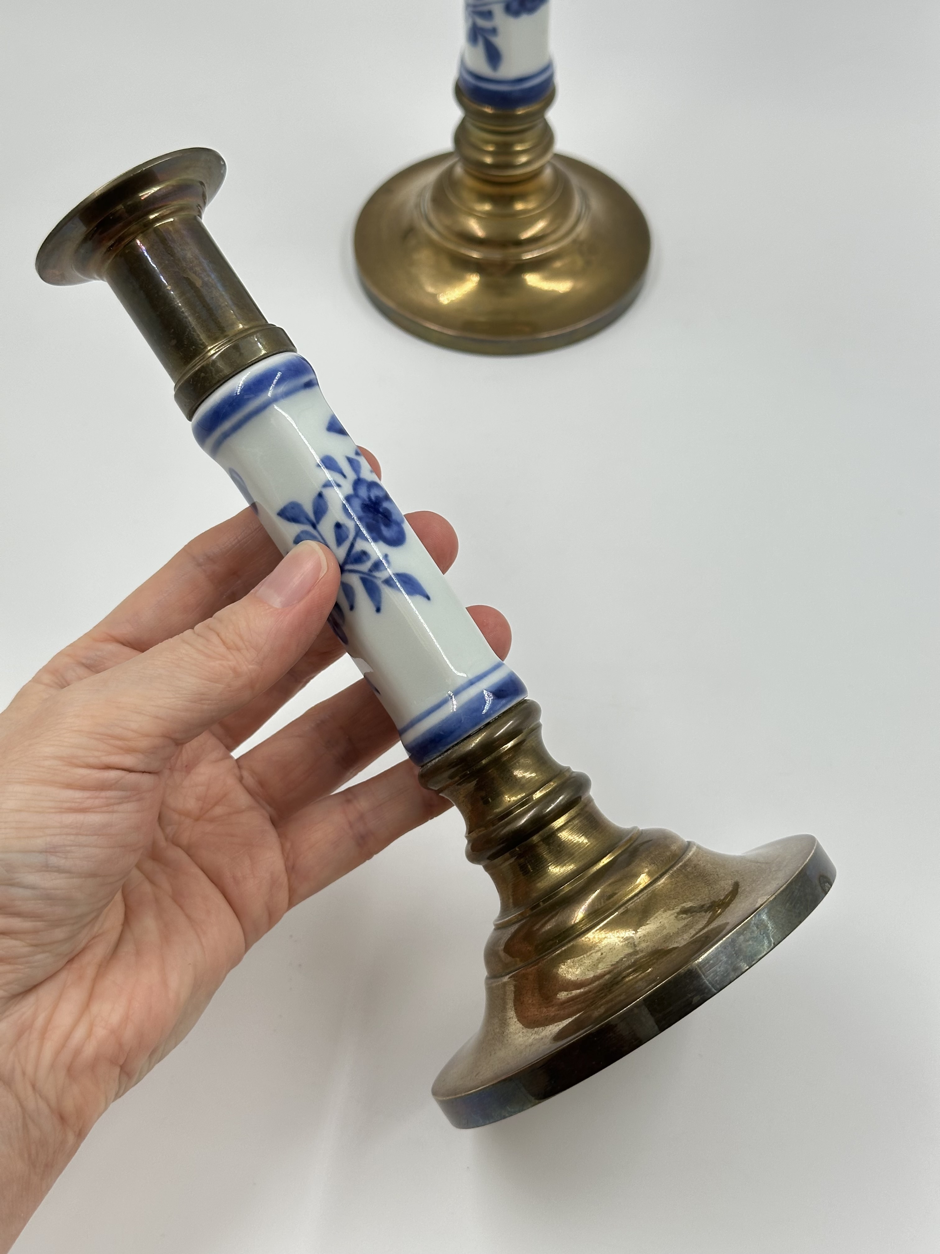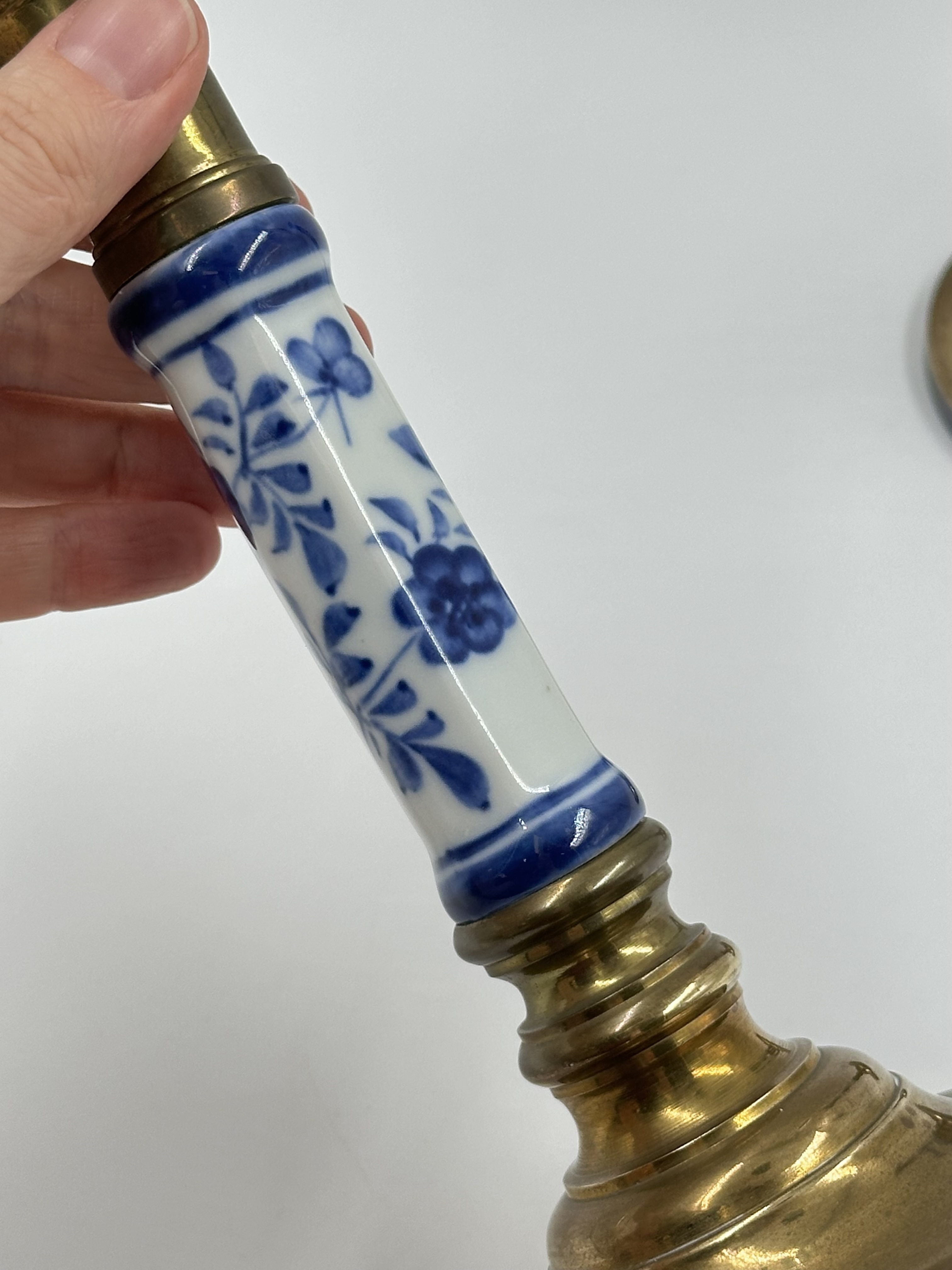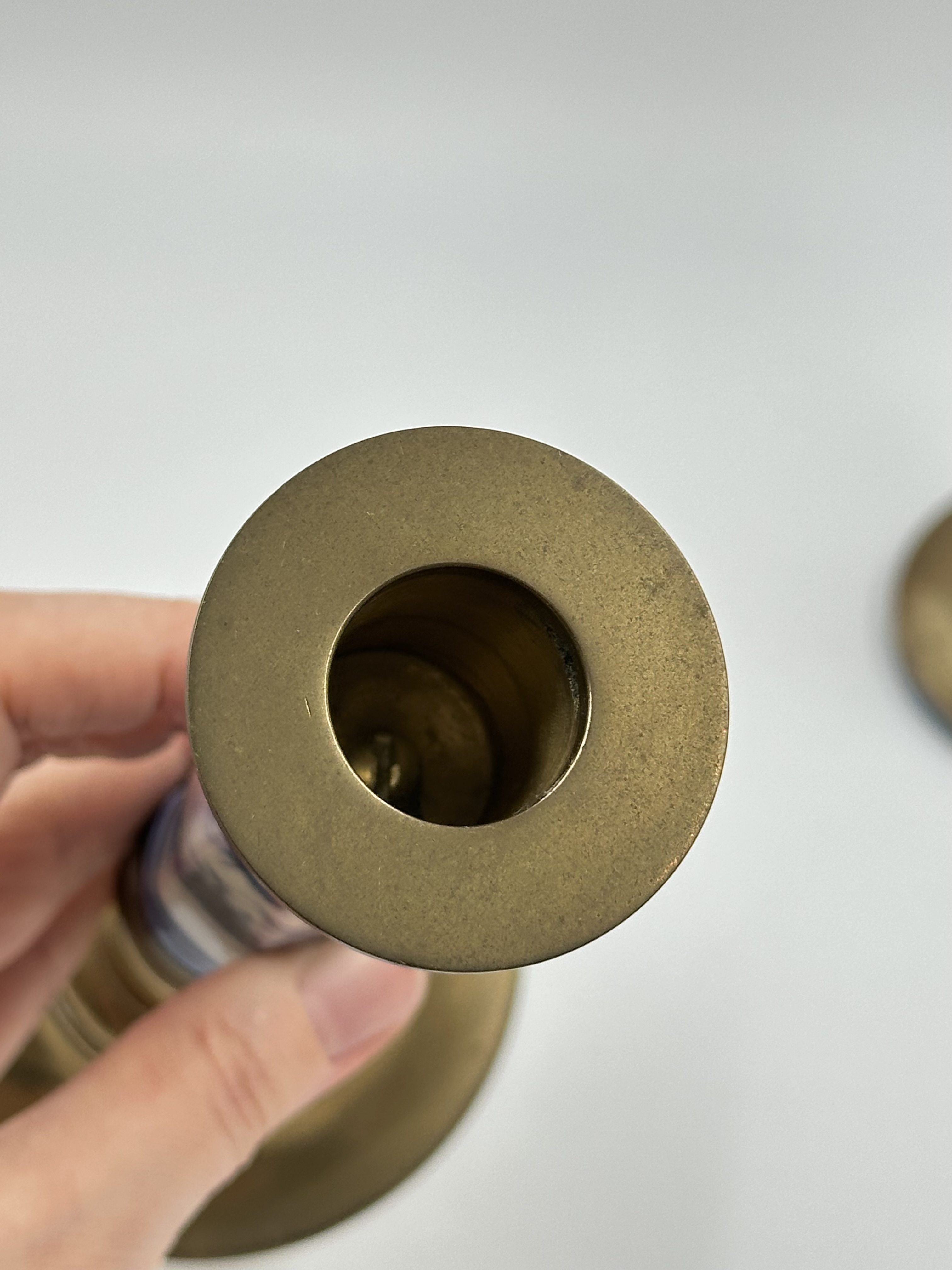Латунь, керамика. Присутствуют следы времени, потемнения. Высота 18,8 см и 19см.