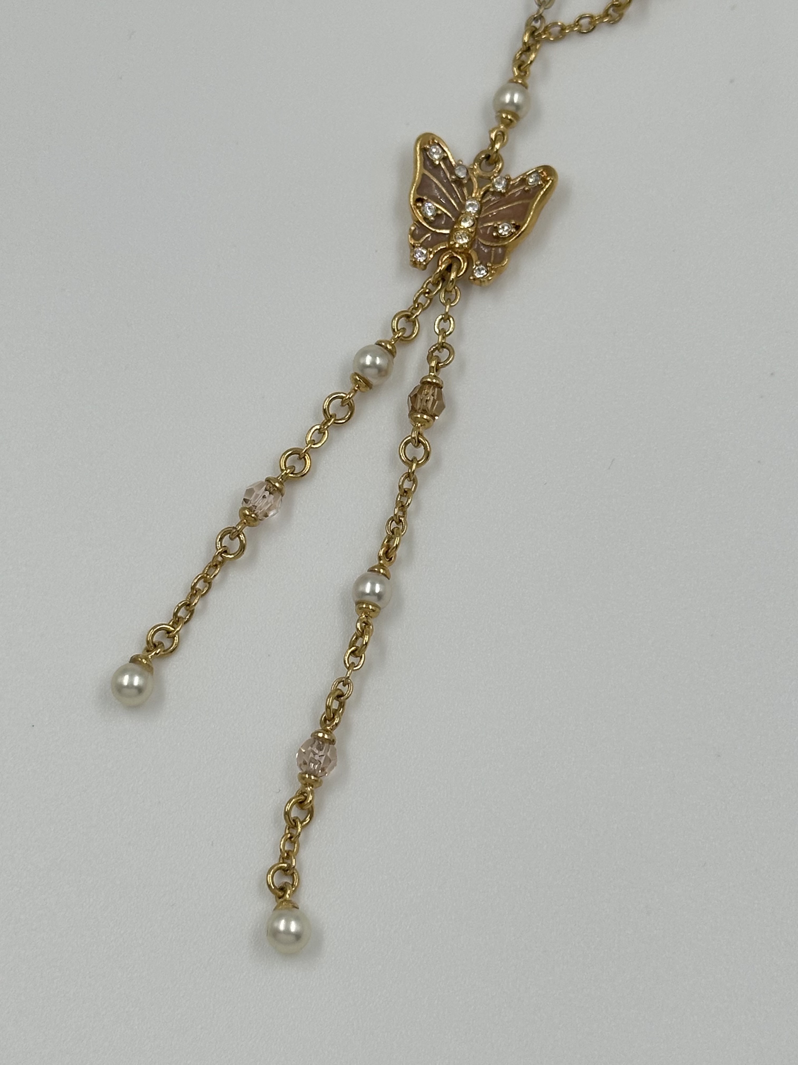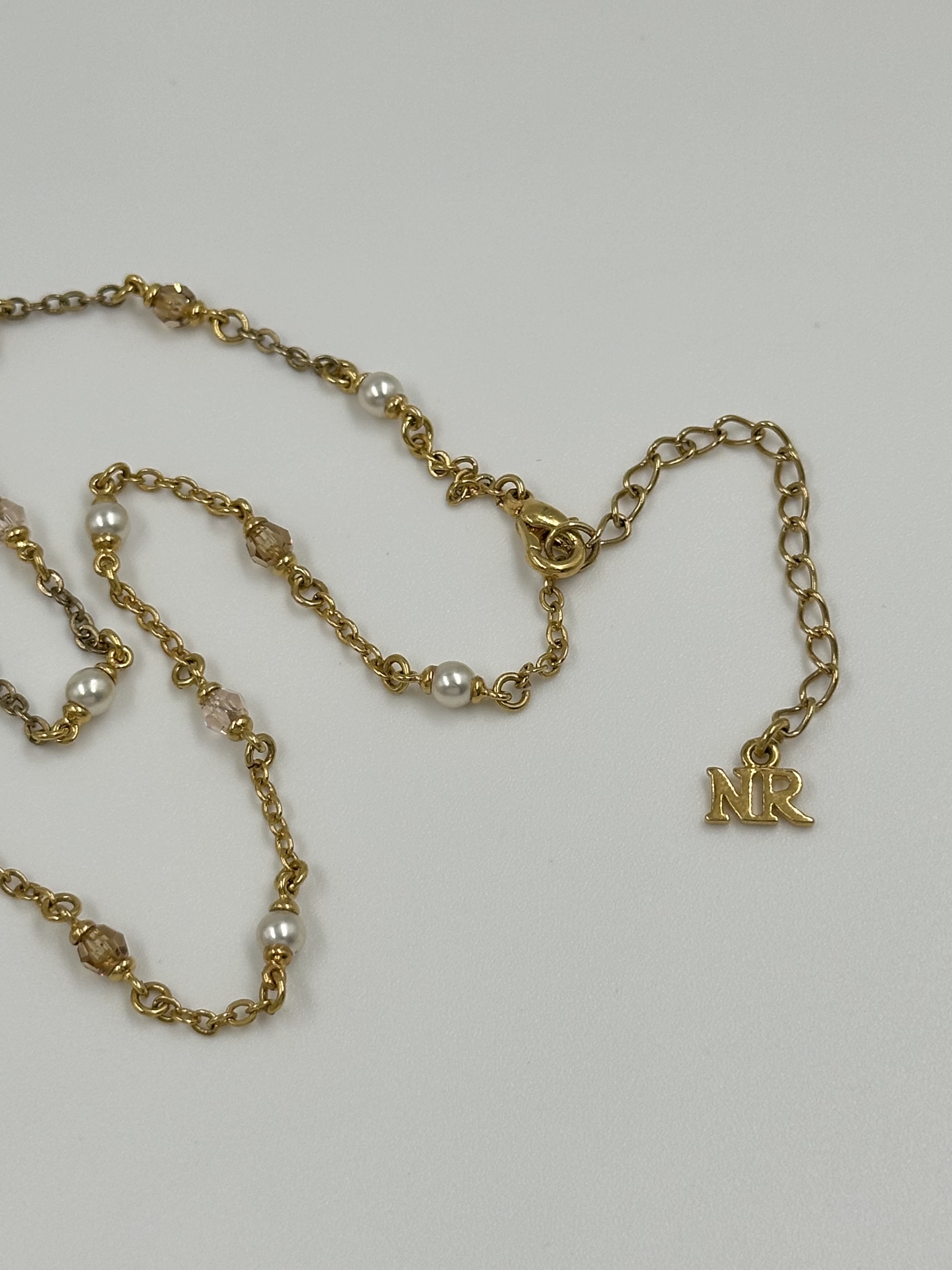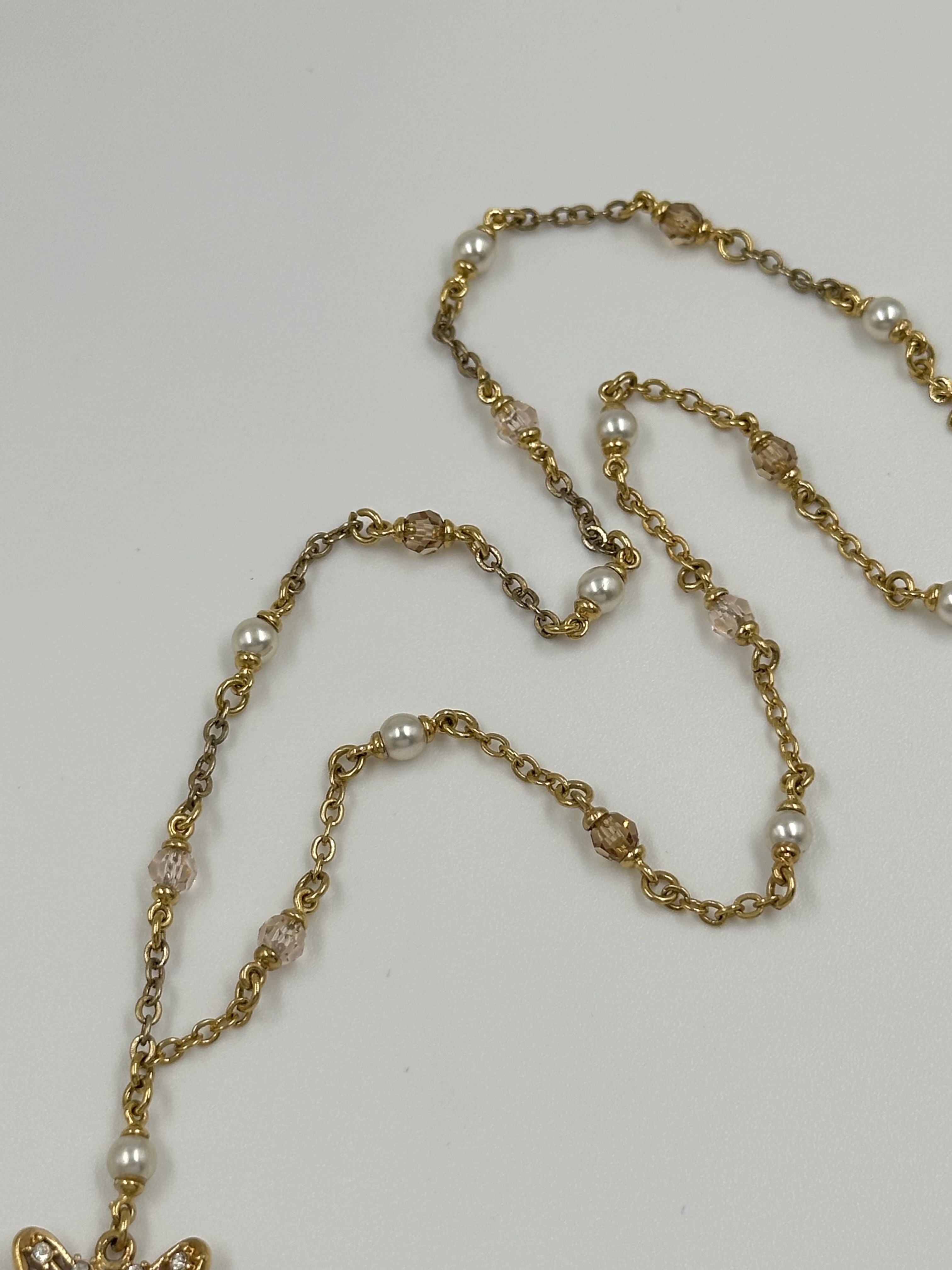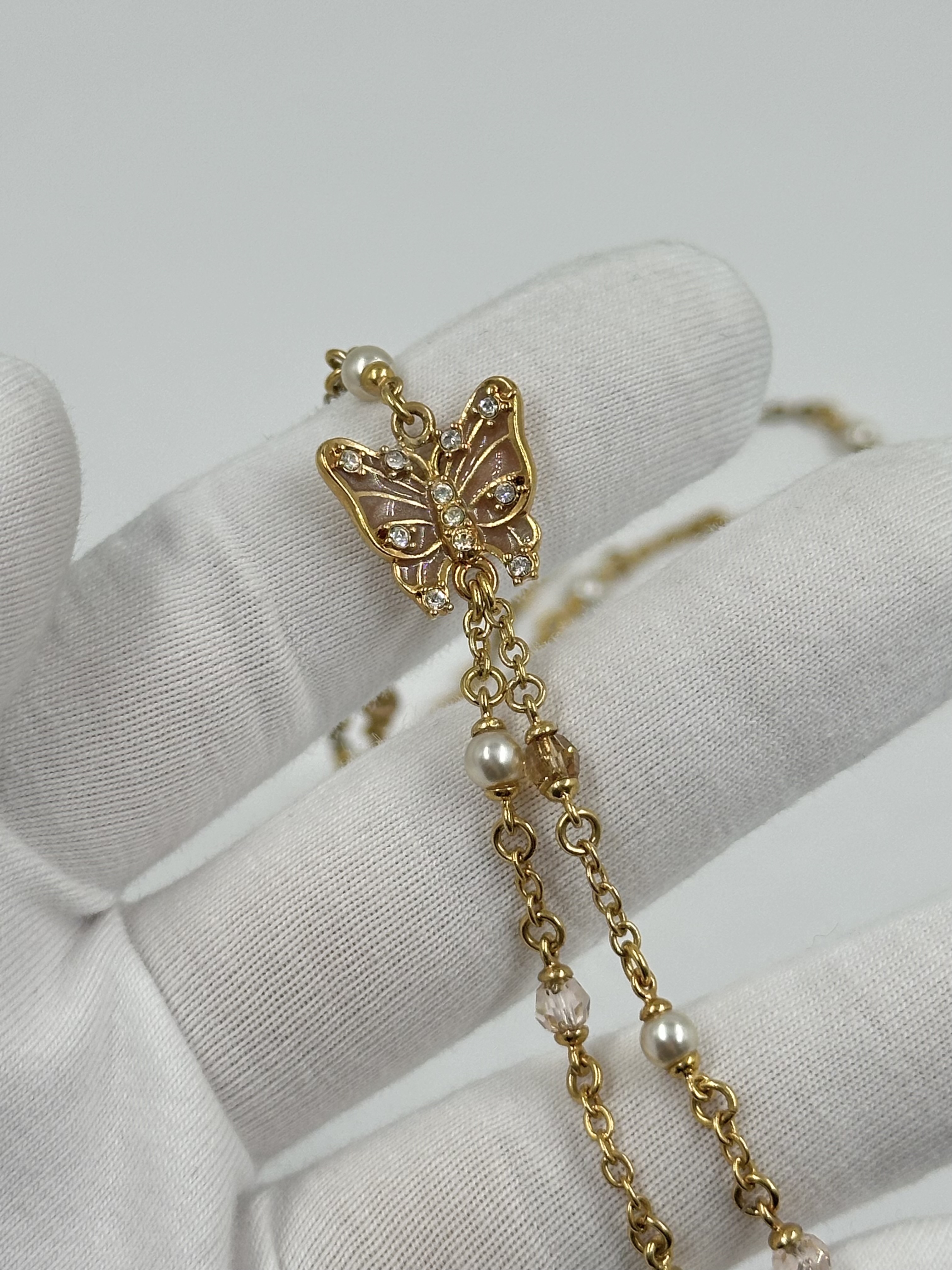 Бижутерный сплав, имитация жемчуга, эмаль, кристаллы. На звеньях местами присутствуют потертости покрытия.