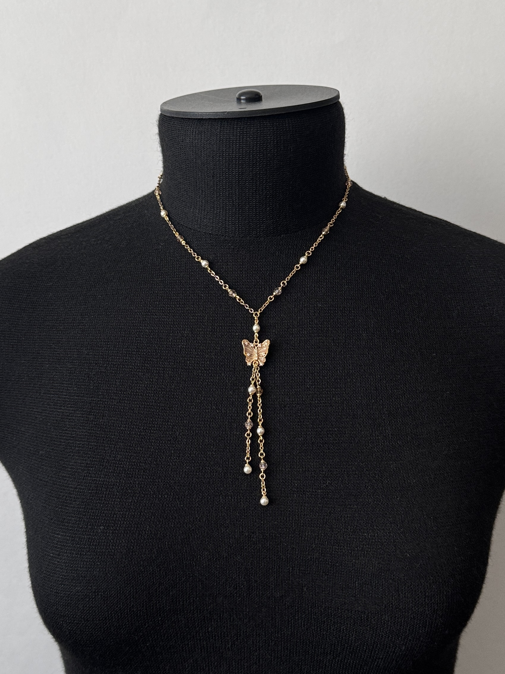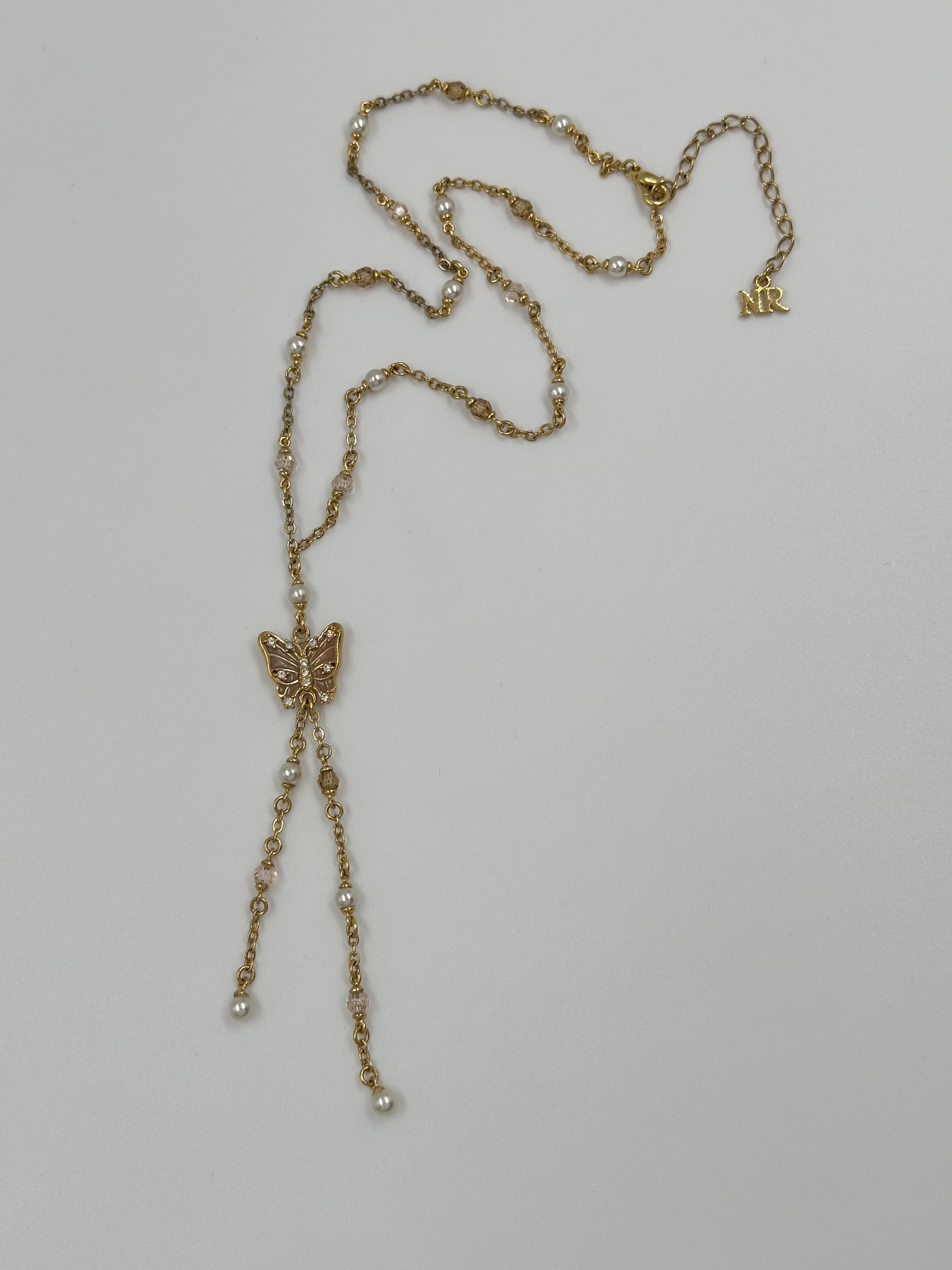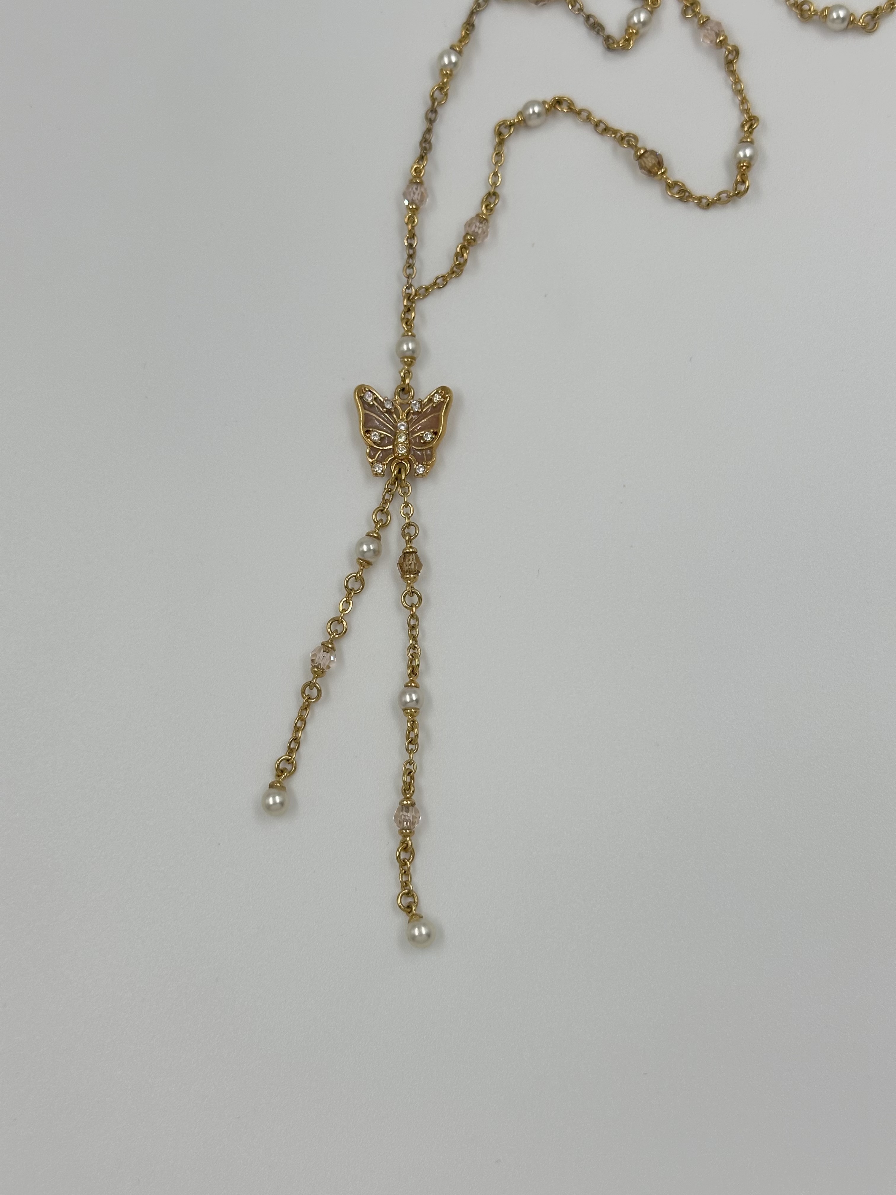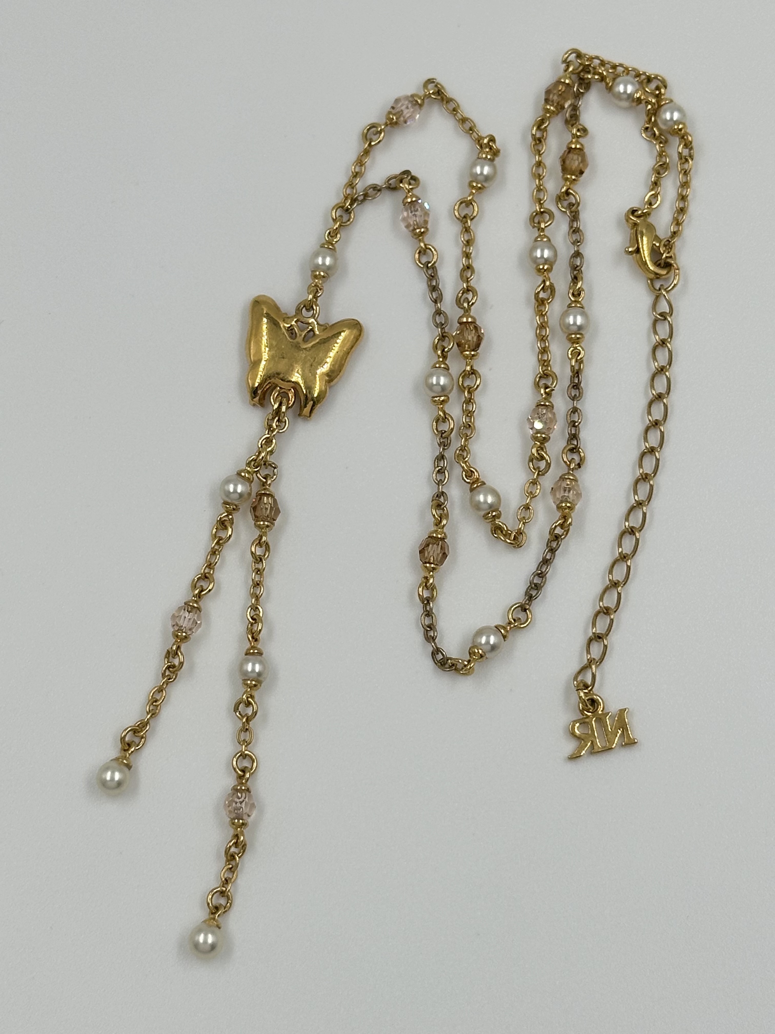 Бижутерный сплав, имитация жемчуга, эмаль, кристаллы. На звеньях местами присутствуют потертости покрытия.